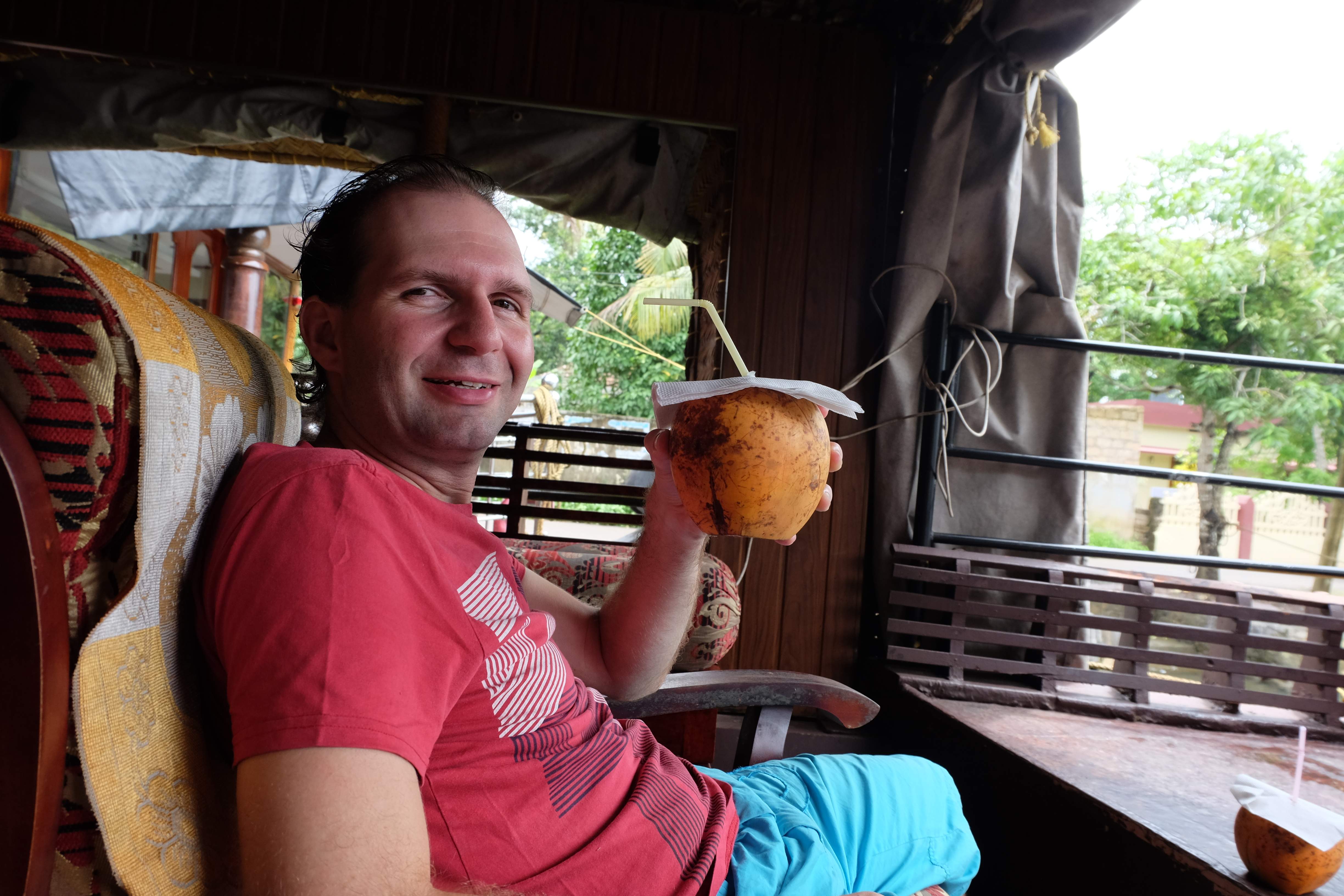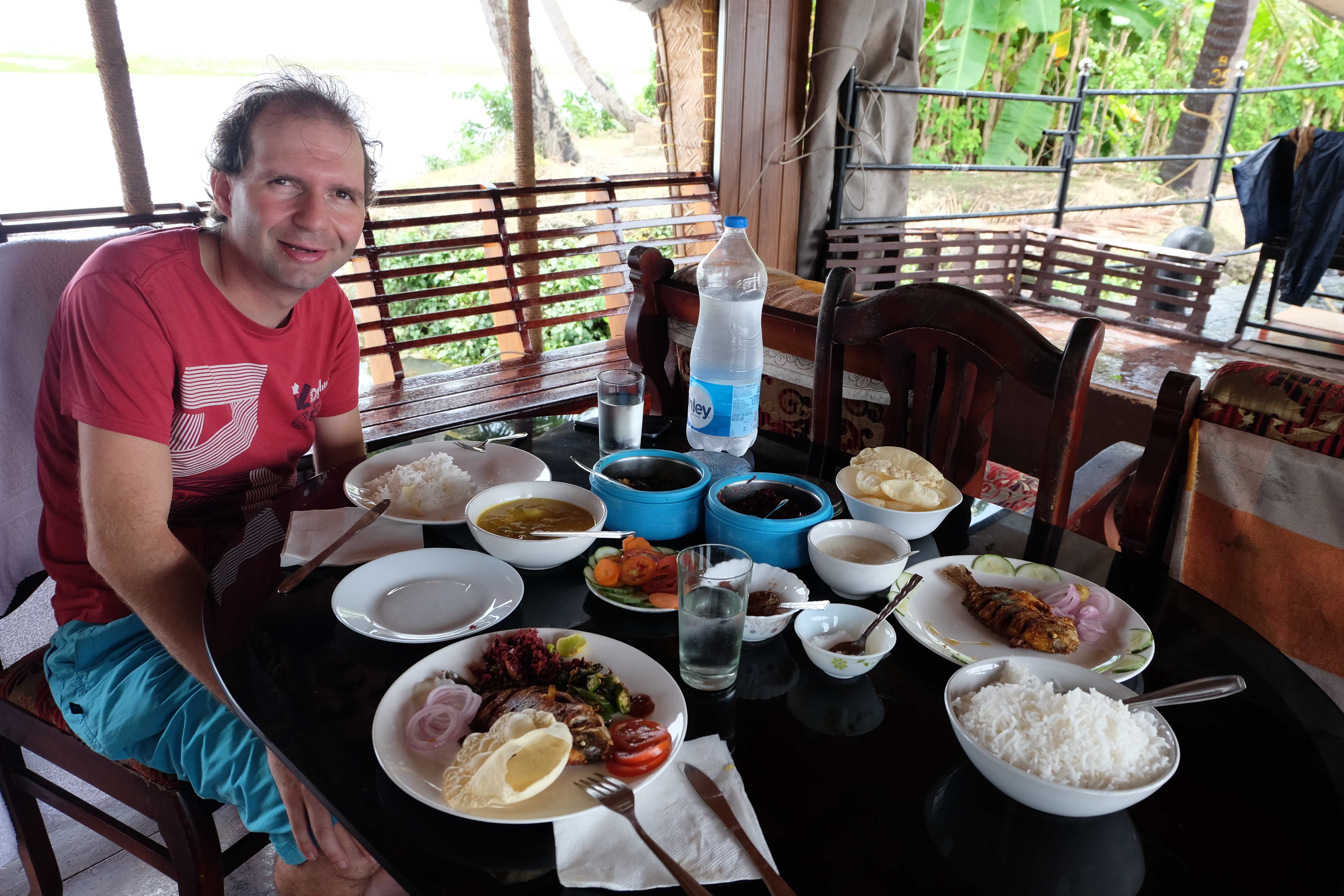Beim Erstellen des Indien-Reiseplans ergab es sich zufälligerweise so, dass genau an Rafi’s Geburtstag ein Tag mit Übernachtung auf einem Bootshaus vorgesehen war. Also sollte es noch einmaliger werden! Totmüde nach der fast durchgemachten Nacht im äusserst bequemen Zug kamen wir irgendwann gegen den Mittag auf dem Bootshaus an. Hier durften wir endlich entspannen und mal 24 Stunden lang nichts machen… einfach sitzen, liegen, essen und atmen…. 🙂