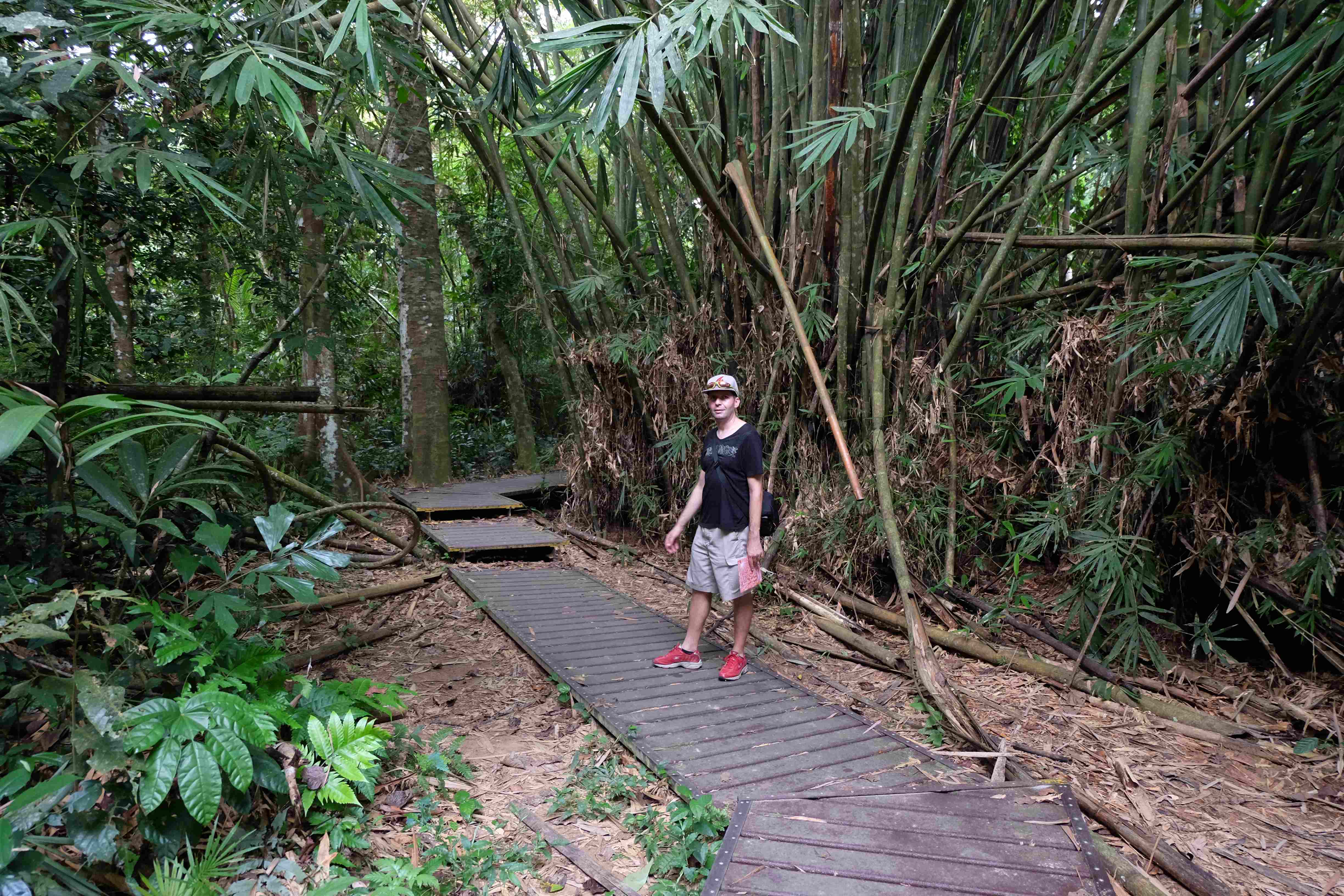 Dupa aceste activitati tipice pentru un „homo touristicus“ am decis insa ca noi de fapt vrem sa facem pe „homo Rambo” si sa cunoastem partea dura, hardcore a junglei, sa patrundem de-a dreptul in ea pana in adancuri si sa petrecem innoptam acolo cu toate boarfele (respectiv cort si mancare). Ce traseu mai potrivit pentru un asemenea proiect decat cel mai inalt varf al peninsulei: Gunung Tahan care are altitudinea ridicola de 2183m. O plimbare … si un pic de gust de jungla (ne-am zis noi ca doi idioti in sinea noastra!) Foarte siguri pe noi si constienti de forma noastra fizica si de rezistenta noastra am ras pe seama tuturor agentiilor si organizatorilor de trasee care le ofereau acest traseu de 110 km turistilor in 7 zile si care reactionau foarte indignati si surprinsi la dorinta noastra de a-l parcurge in doar 5 zile. „Astia in mod sigur nu au fost niciodata pe un munte” ne-am gandit noi… sunt doar 2000m amarati, haideti odata! Barul de apres-ski din Saas Fee este aproape la aceeasi altitudine! 🙂 Noi venim din patria Alpilor, avem experienta la 8000m, suntem foarte sportivi, am reusit Zürich-Geneva intr-o zi cu bicicleta, Zürich-Romania in 12… pentru noi va fi floare la ureche acest traseu. De fapt nici nu am avea nevoie de ghid, ne-am decis sa il luam doar pentru ca este vorba de jungla deasa si de un traseu nu totdeauna foarte bine marcat. Bineinteles ca am gasit foarte repede un ghid suficient de nebun sa accepte propunerea noastra de a parcurge totul in 5 zile. Pentru cei si mai nebuni: o data pe an se organizeaza o cursa aici, un fel de ultra-maraton in care se poate parcurge aceasta distanta in mai putin de 24 de ore! Zis si facut: 2 homo Rambo si un ghid merg la cumparaturi – avem nevoie de provizii si de un cort. Va imaginati deja muzica de actiune din fundal si pe Silvester Stallone care isi pregateste intregul arsenal de lupta? Cam asa a aratat aceasta etapa la noi :-):
