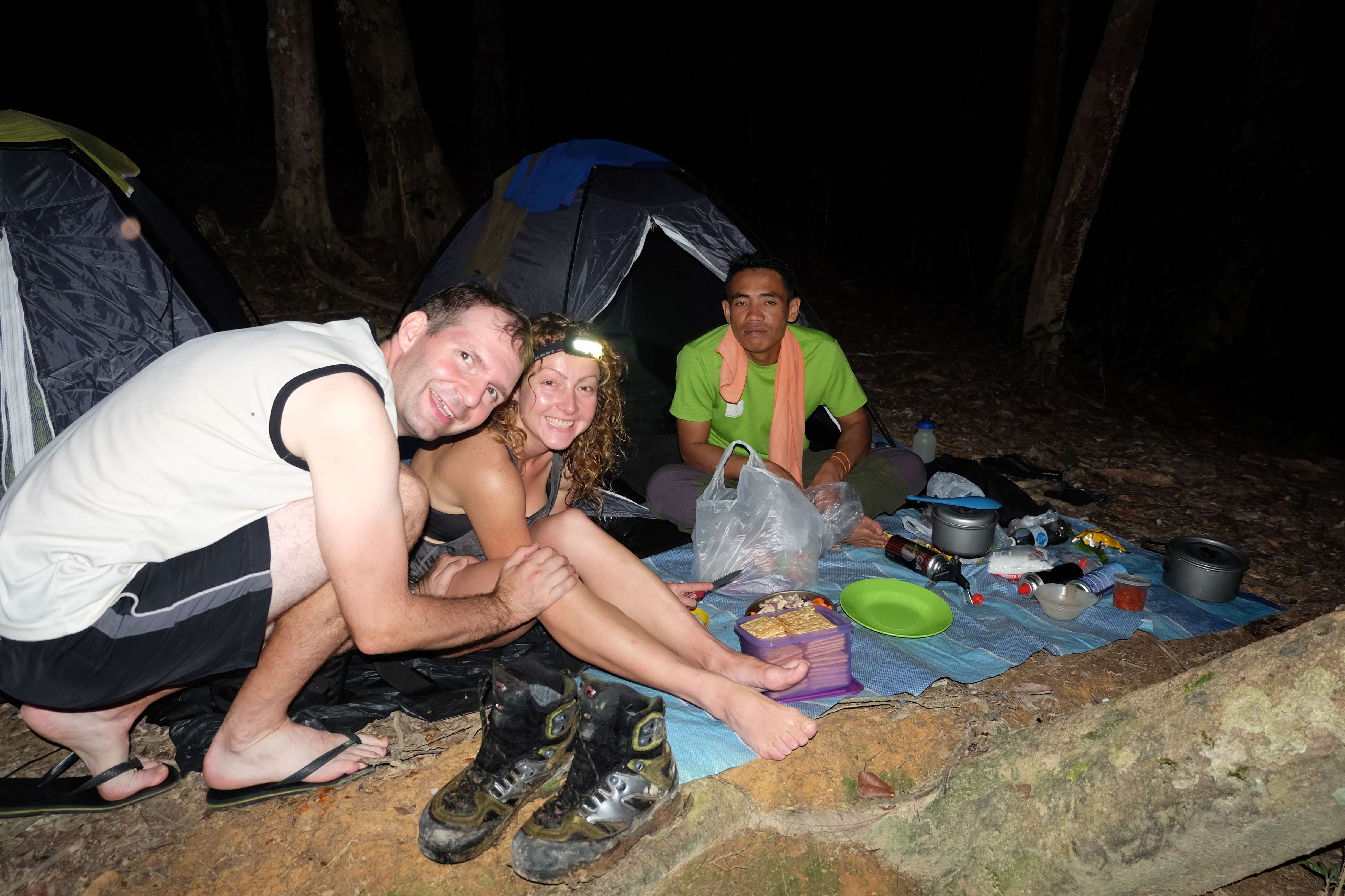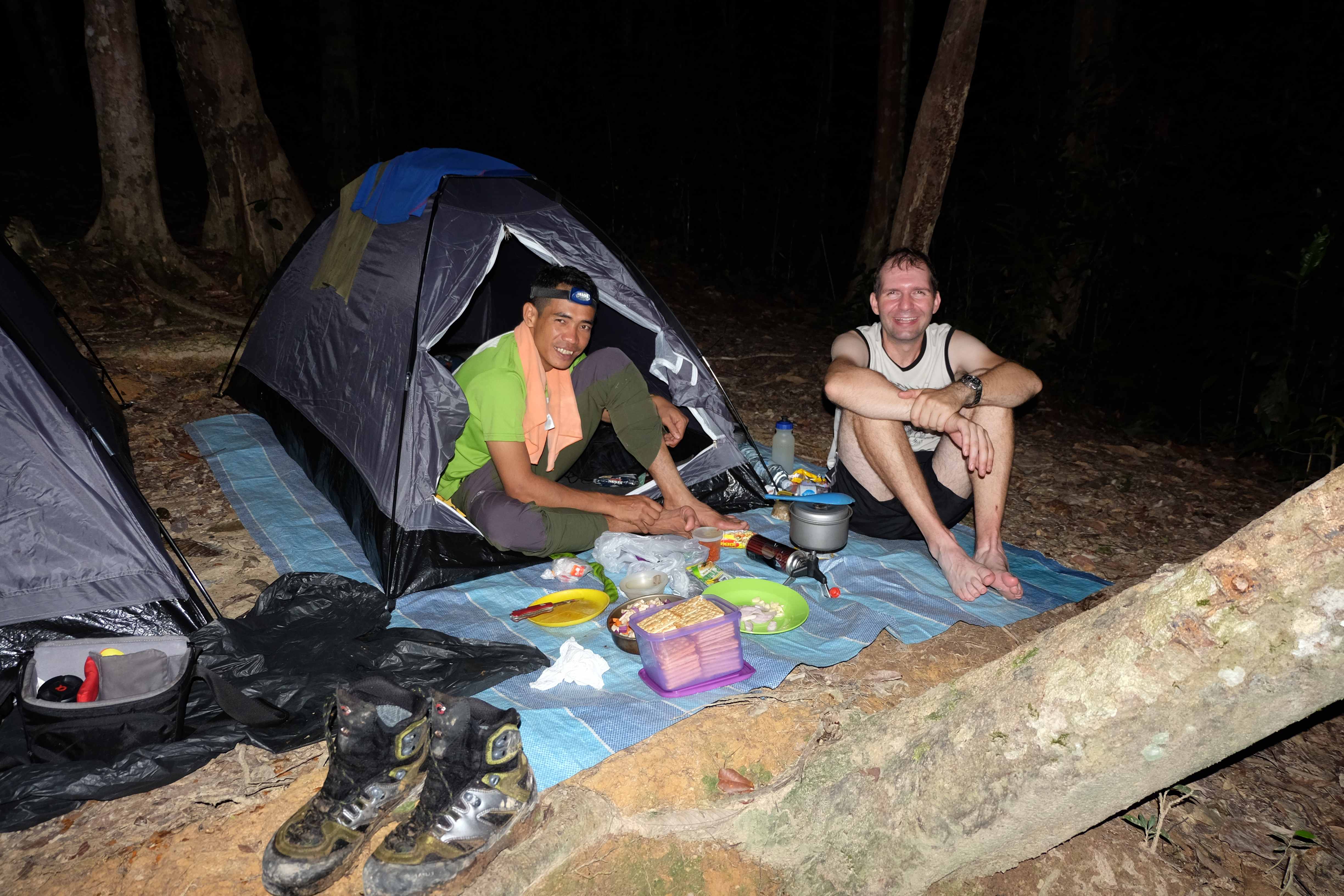 Nach diesen „homo touristicus“ typischen Aktivitäten beschlossen wir allerdings, dass wir „homo Rambo“ spielen wollen und eher die harte Seite des Dschungels erfahren indem wir tief hineindringen und einige Nächte mit Hab und Gut (nämlich Zelt und Essen) dort übernachten. Was für eine bessere Route dafür, als jene auf den höchsten Berg der Halbinsel: Gunung Tahan, der lächerliche 2183 m misst. Ein Spaziergang … und ein wenig Dschungelerlebnis dazu (dachten wir uns Idioten!) Sehr selbstsicher und unserer Fitness bewusst lachten wir sämtliche Touranbieter aus, als sie entsetzt reagierten, weil wir die von ihnen standardmässig in 7 Tagen angebotene, 110 km lange Tour auf derer 5 kürzen wollten. „Die Typen waren noch nie auf einem Berg“, dachten wir uns… es sind lächerliche 2000m, bitte schön! Die Apres-Ski Bar in Saas Fee ist ja fast auf der Höhe! 🙂 Wir kommen aus der Heimat der Alpen, verfügen über 8000er Erfahrung, sind sehr sportlich, fahren mit dem Velo an einem Tag von Zürich nach Genf, in 12 Tagen von der Schweiz nach Rumänien… das wird für uns ein Kinderspiel sein! Eigentlich bräuchten wir gar keinen Guide, den nehmen wir nur wegen des dichten Dschungels und des nicht unbedingt markierten Weges. Natürlich fanden wir ziemlich schnell einen Guide, der (verrückt genug war und) einwilligte, die Tour mit uns in 5 Tagen zu machen. Für noch Verrücktere gäbe es ja die gleiche Variante als Sportveranstaltung: ein Ultra-Marathon, den einige in unter 24 h absolvieren. Also nichts wie los: 2 „homo Rambo“ und ein Guide gingen einkaufen – Essensvorräte und eine minimale Campingausrüstung muss her. Stellt ihr euch schon die Action-Hintergrundmusik und den Silvester Stallone vor, der seine gesamte Kampfausrüstung vorbereitet? So hat das nämlich bei uns ausgesehen :-):