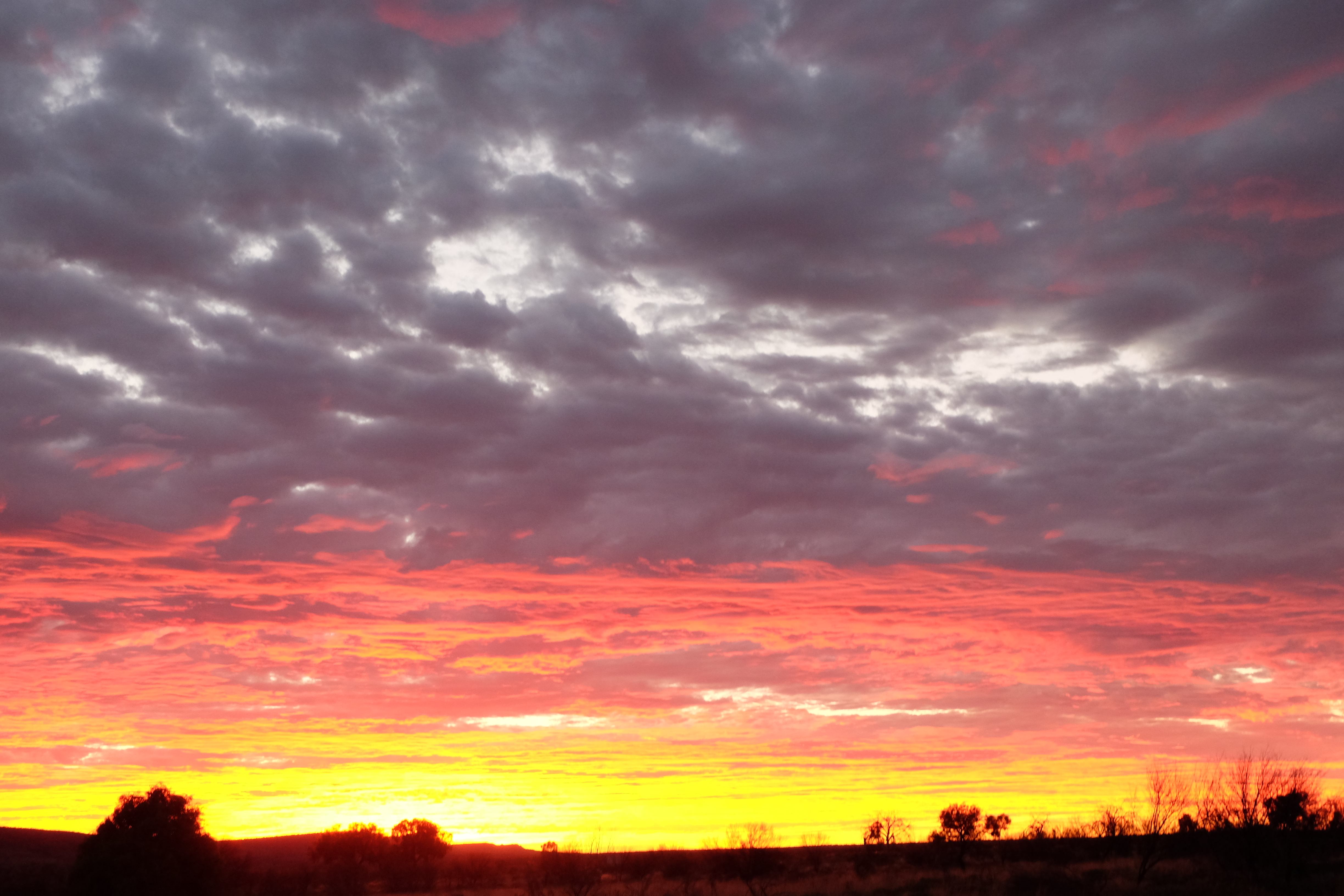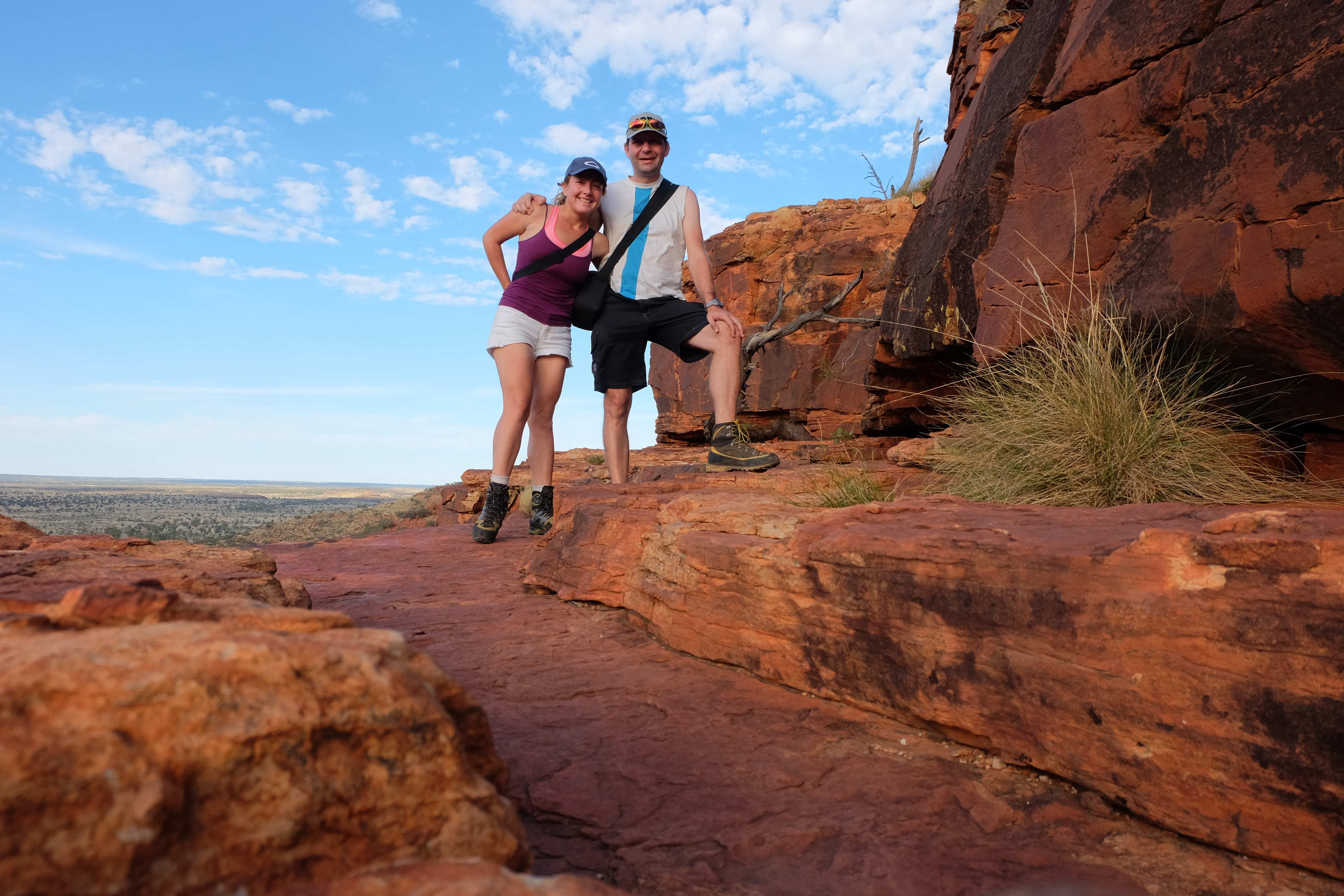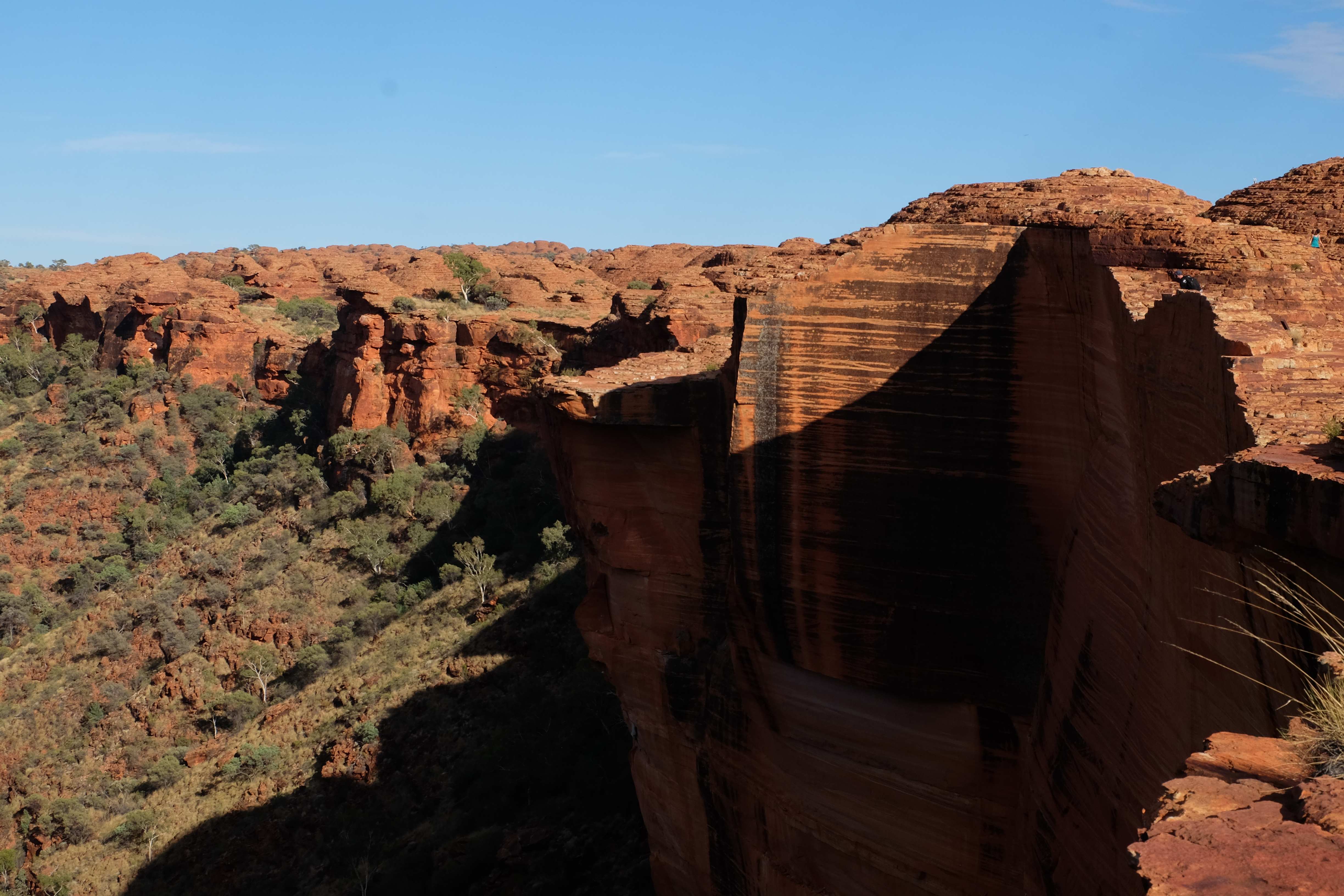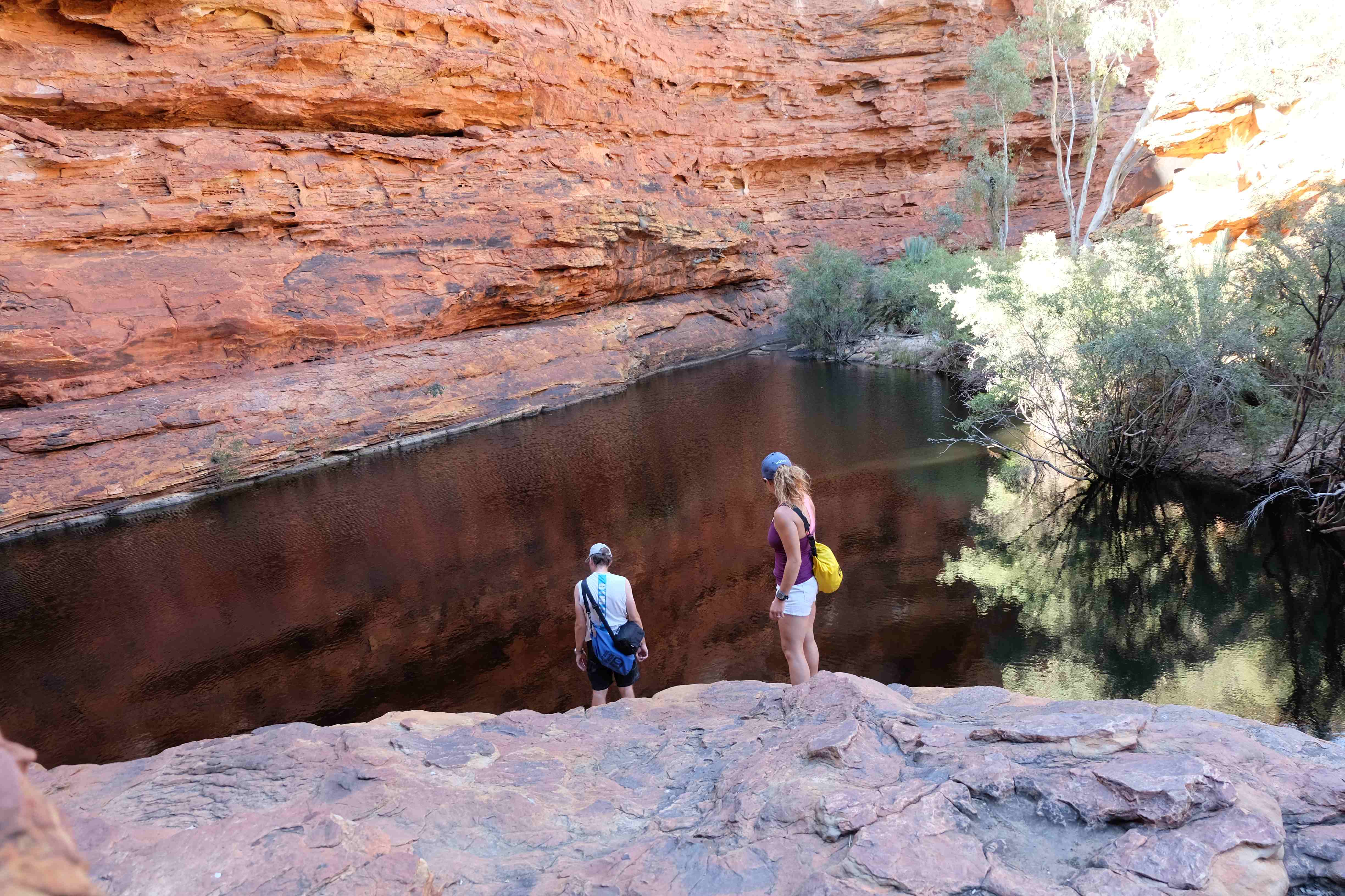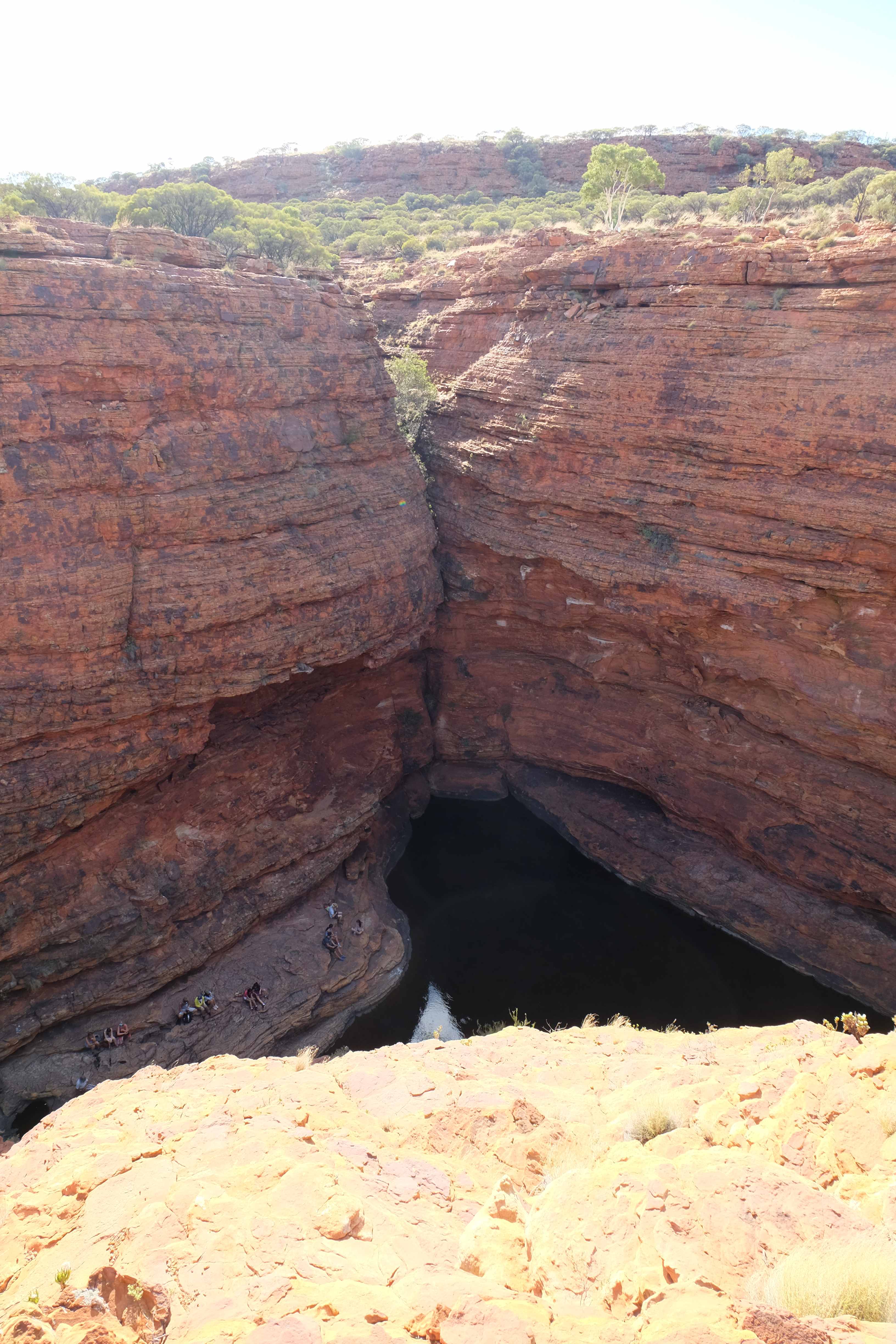 Nach der ersten im Auto verbrachten und mit einem unglaublichen Sonnenaufgang belohnten Nacht ging es morgens früh los – sehr früh, da die Wanderrouten hier aufgrund der lebensbedrohlichen Hitze und Dürre bereits um 9 Uhr morgens geschlossen werden. Wir unterschätzten ein wenig den Kampf gegen die aggressiven australischen Fliegen – die einem scharenweise beim Nasen- , Augen- und Ohrenputzen helfen wollen und sich somit in jedes Loch den Weg bahnen – sowie die vorgegebenen Flüssigkeitsmengen pro Stunden – 1 Liter Wasser pro Stunde ist doch nur normal wenn man der Gattung Kamel angehört! – Erschöpft und erschlagen erreichten wir nach guten 4 Stunden unsere Luxus-Residenz: unser neon-grünes Toyota, welches überhitzt auf uns auf dem Parkplatz wartete. Die Situation schrie einfach nur noch nach einer kalten Dusche, welche wir uns auch gönnten! Wo, fragt ihr euch? In einer der Duschanlagen der überteuerten Ressorts auf der Strecke, welche ebenfalls Mehrbetten-Zimmer mit geteilter Dusche anboten und wo wir uns einbrechermässig hereinschlichen – als seien wir zahlende Gäste – und uns erfrischten. 🙂 Da wir ja wussten, dass zwei weitere nächtliche Luxus-Aufenthalte in unserem Toyota folgten, mussten wir doch einen Weg finden unsere Geruchssinne zu schonen und – sei es auch nur einbrechermässig – zu duschen! 🙂 Frisch, sauber und als hätten wir nichts Unerlaubtes getan stolzierten wir aus den Duschanlagen heraus, begaben uns – als wären wir dortige Gäste – zu unserer schön im Schatten parkierten Luxus-Residenz und setzten unsere Reise fort. 🙂