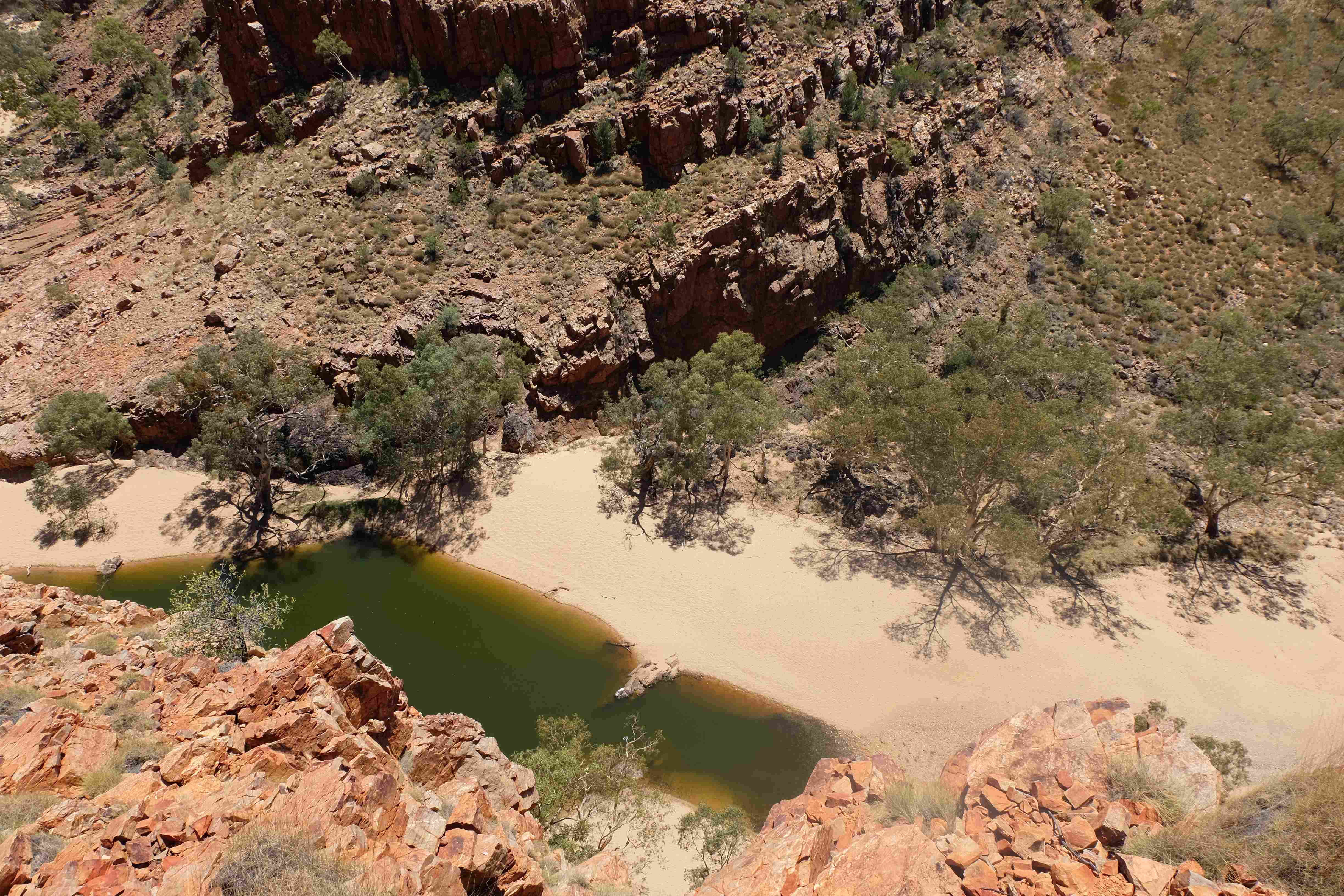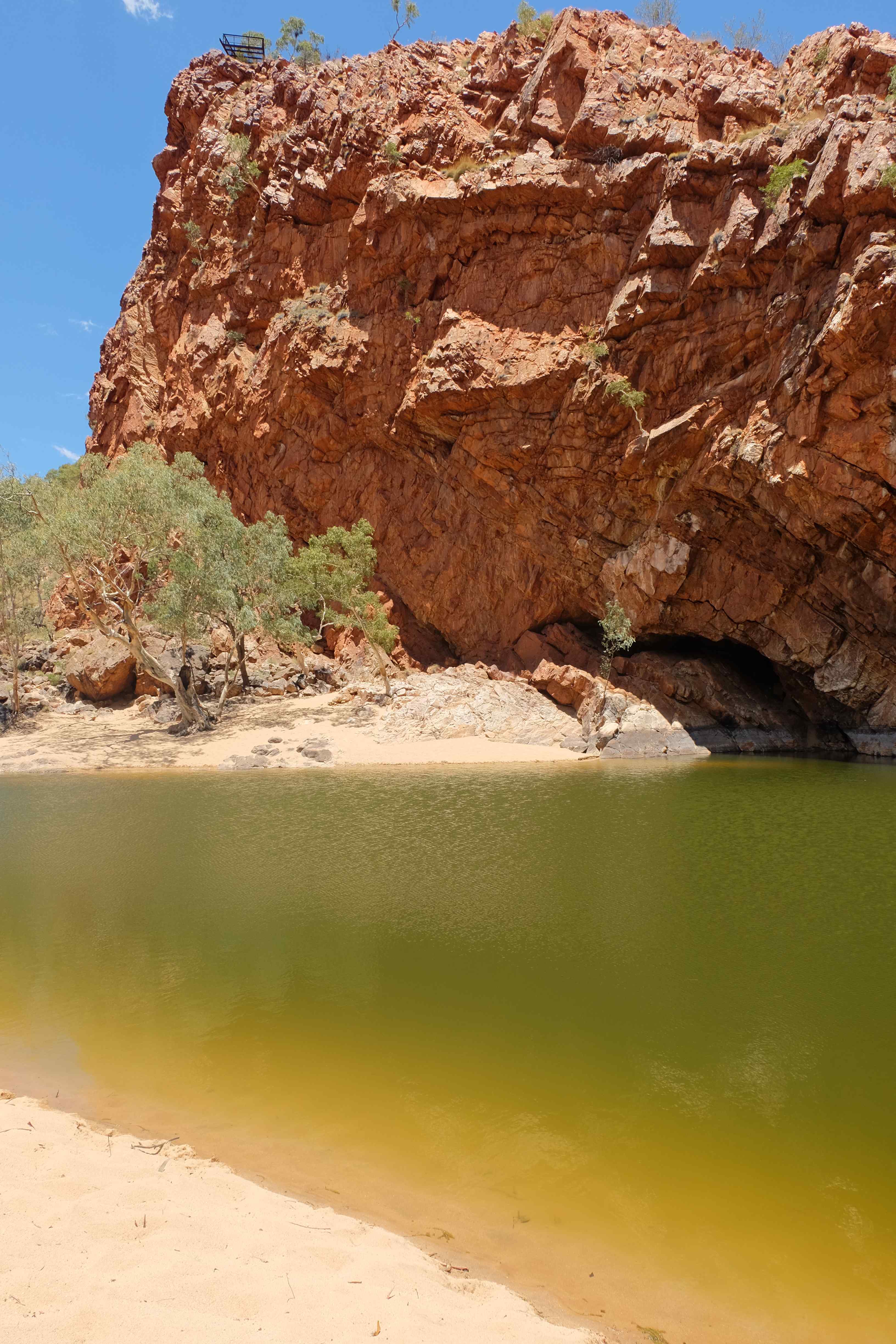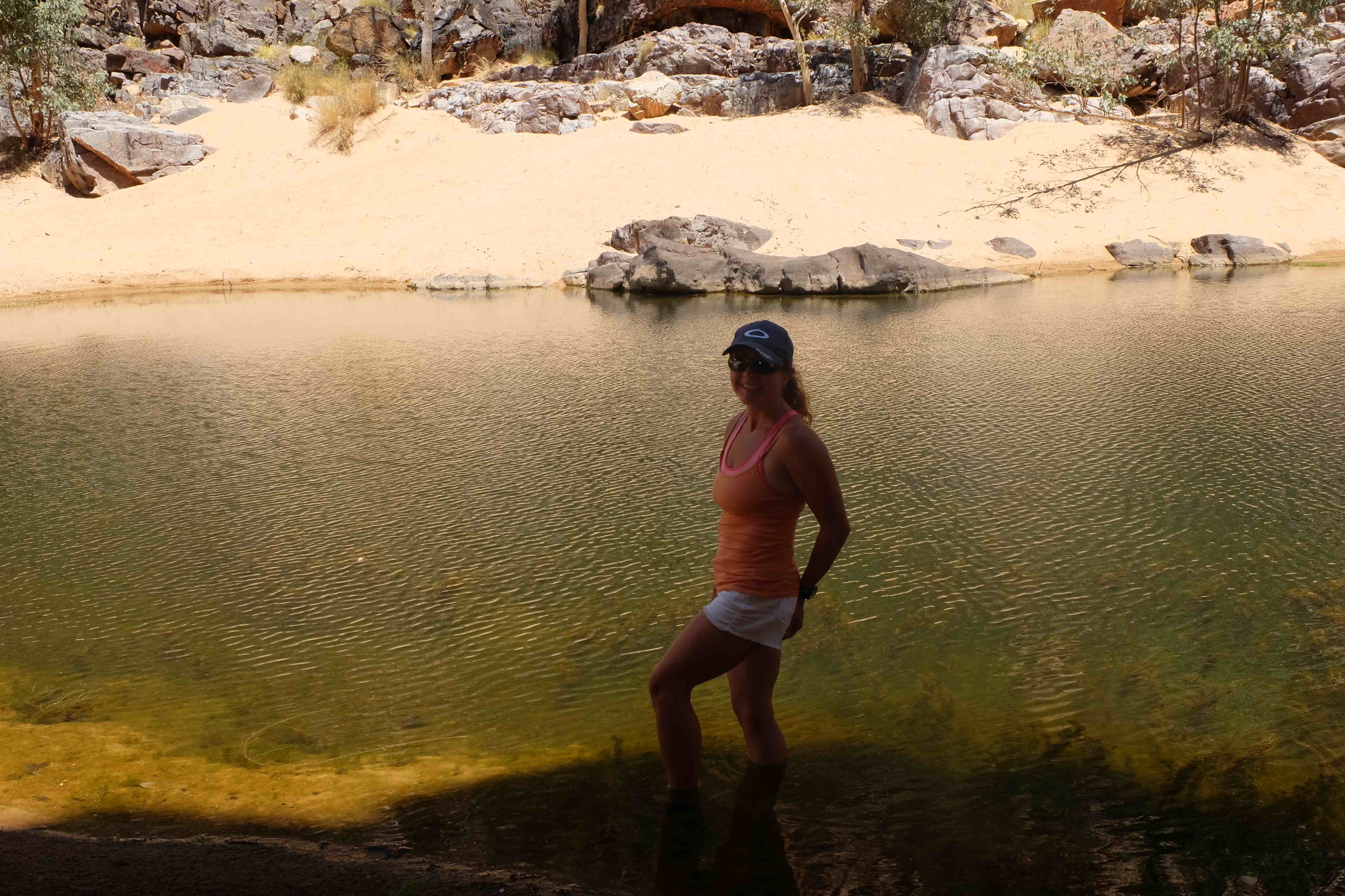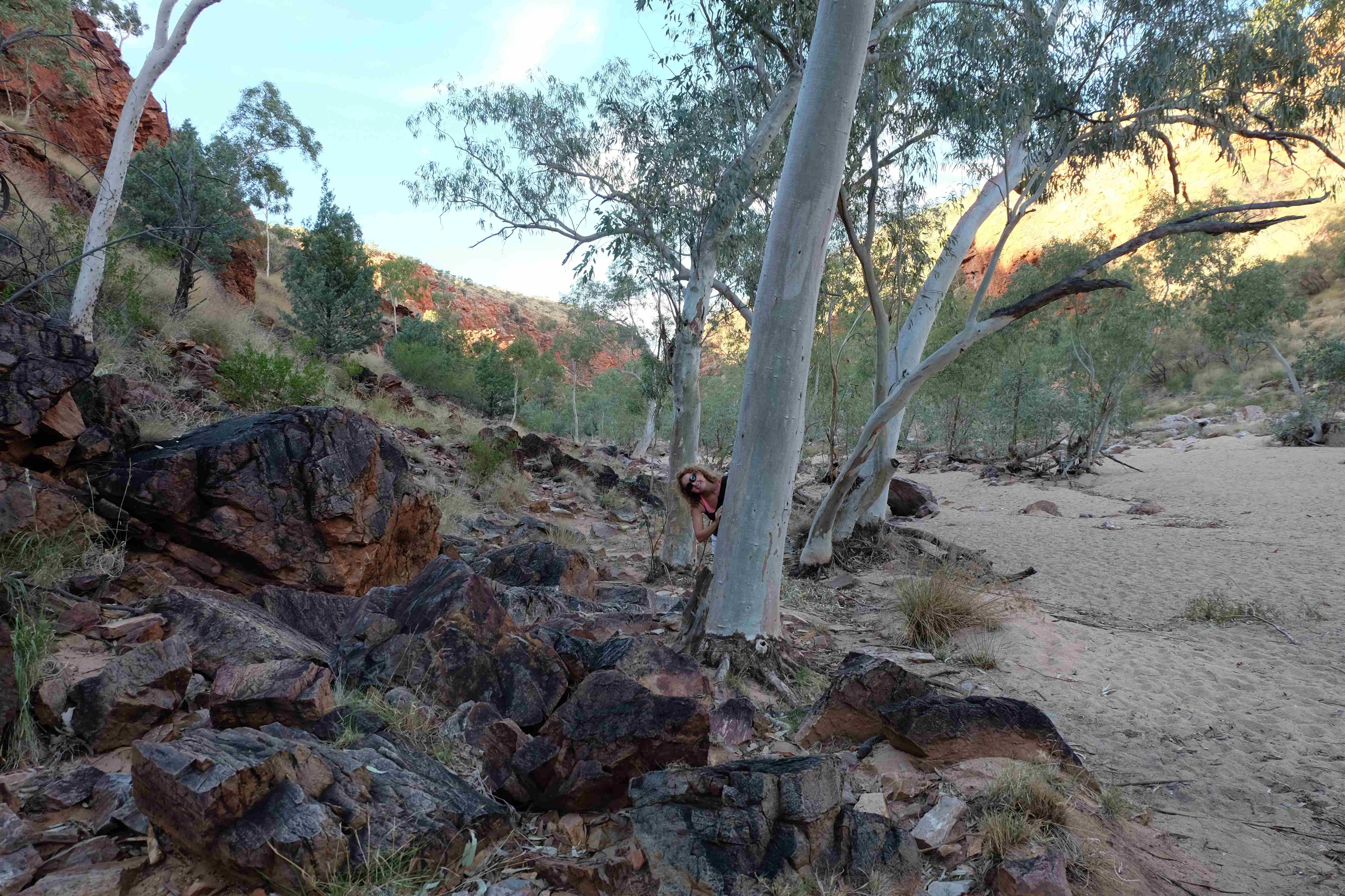 Nach der ersten im Auto verbrachten und mit einem unglaublichen Sonnenaufgang belohnten Nacht ging es morgens früh los – sehr früh, da die Wanderrouten hier aufgrund der lebensbedrohlichen Hitze und Dürre bereits um 9 Uhr morgens geschlossen werden. Wir unterschätzten ein wenig den Kampf gegen die aggressiven australischen Fliegen – die einem scharenweise beim Nasen- , Augen- und Ohrenputzen helfen wollen und sich somit in jedes Loch den Weg bahnen – sowie die vorgegebenen Flüssigkeitsmengen pro Stunden – 1 Liter Wasser pro Stunde ist doch nur normal wenn man der Gattung Kamel angehört! – Erschöpft und erschlagen erreichten wir nach guten 4 Stunden unsere Luxus-Residenz: unser neon-grünes Toyota, welches überhitzt auf uns auf dem Parkplatz wartete. Die Situation schrie einfach nur noch nach einer kalten Dusche, welche wir uns auch gönnten! Wo, fragt ihr euch? In einer der Duschanlagen der überteuerten Ressorts auf der Strecke, welche ebenfalls Mehrbetten-Zimmer mit geteilter Dusche anboten und wo wir uns einbrechermässig hereinschlichen – als seien wir zahlende Gäste – und uns erfrischten. 🙂 Da wir ja wussten, dass zwei weitere nächtliche Luxus-Aufenthalte in unserem Toyota folgten, mussten wir doch einen Weg finden unsere Geruchssinne zu schonen und – sei es auch nur einbrechermässig – zu duschen! 🙂 Frisch, sauber und als hätten wir nichts Unerlaubtes getan stolzierten wir aus den Duschanlagen heraus, begaben uns – als wären wir dortige Gäste – zu unserer schön im Schatten parkierten Luxus-Residenz und setzten unsere Reise fort. 🙂