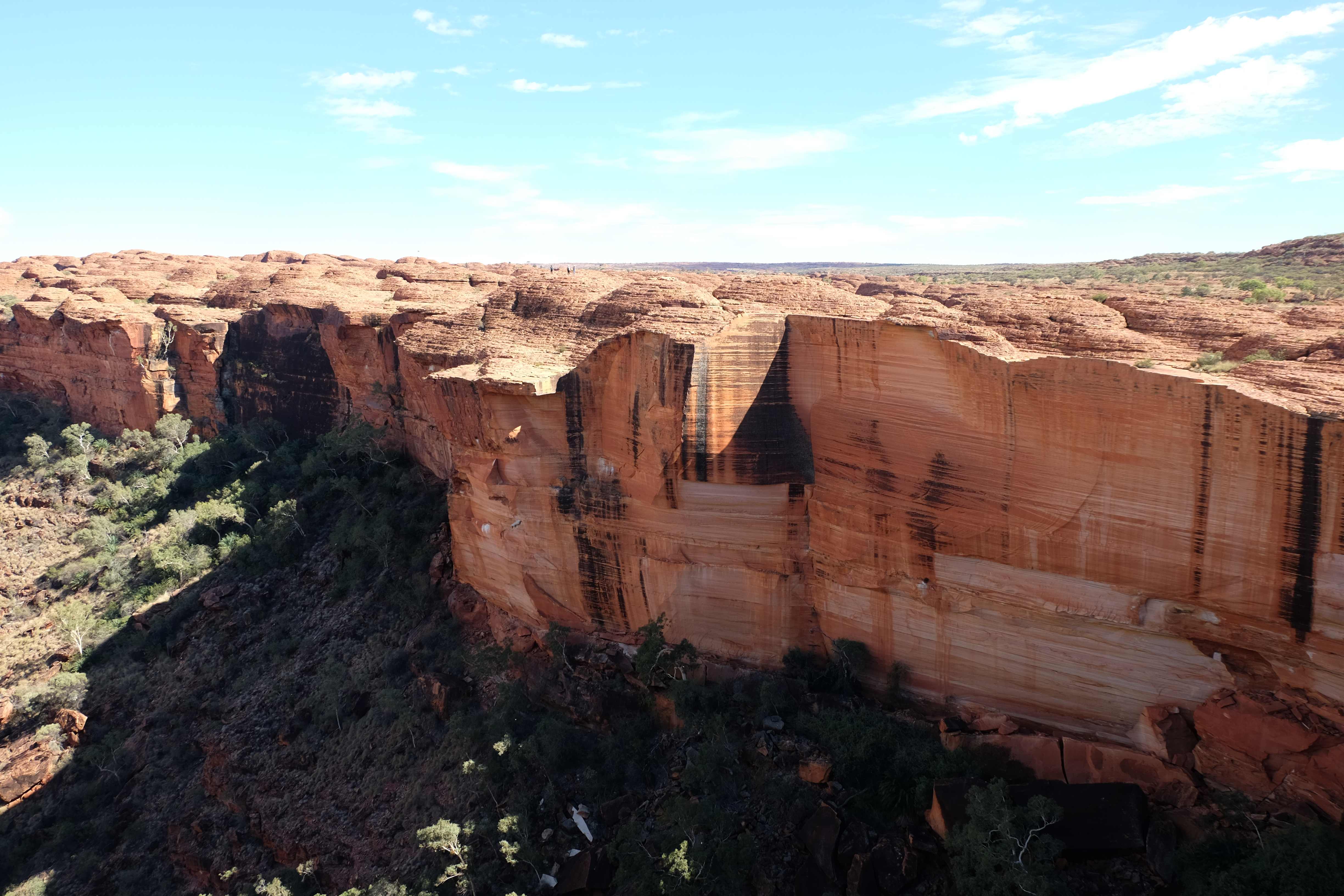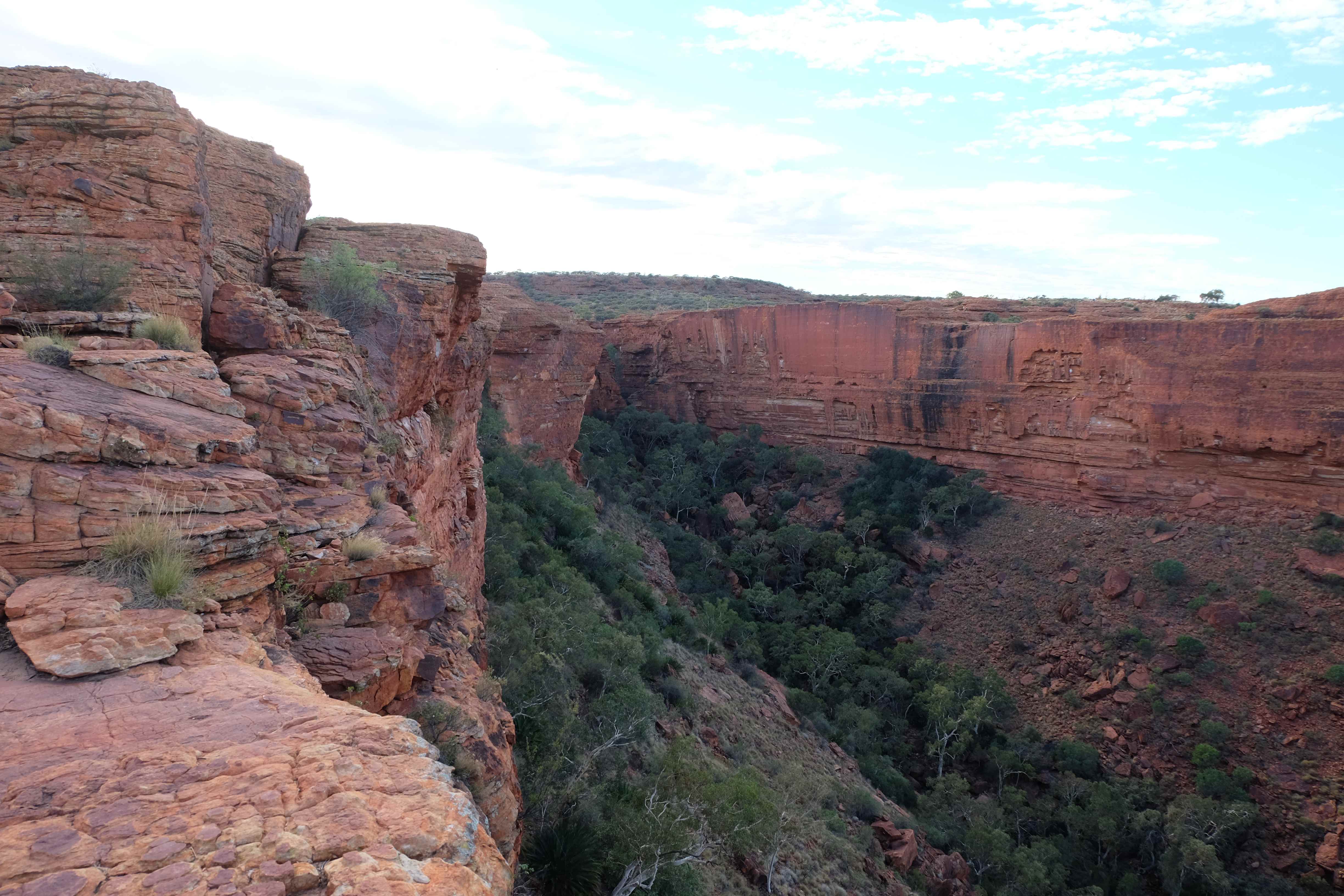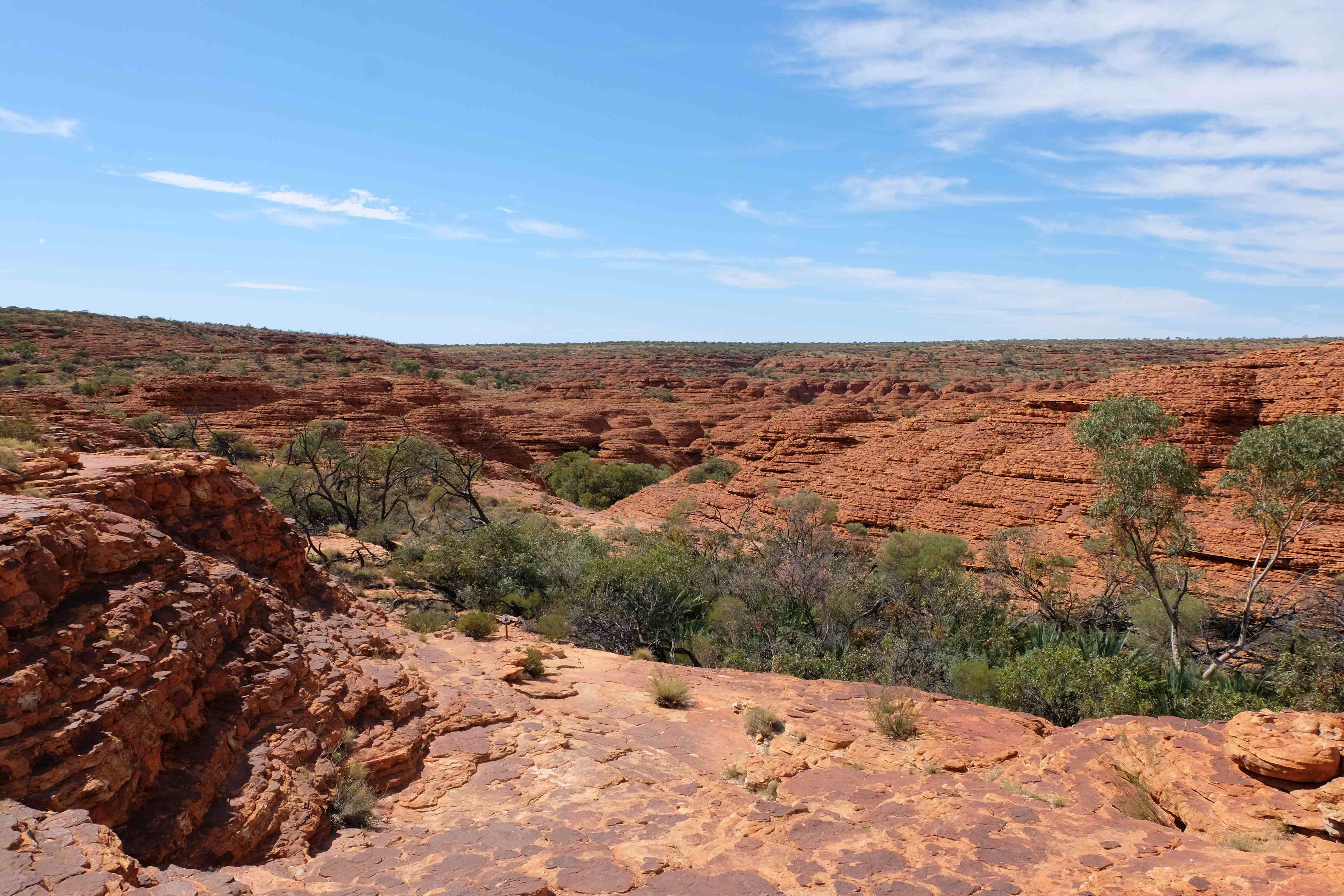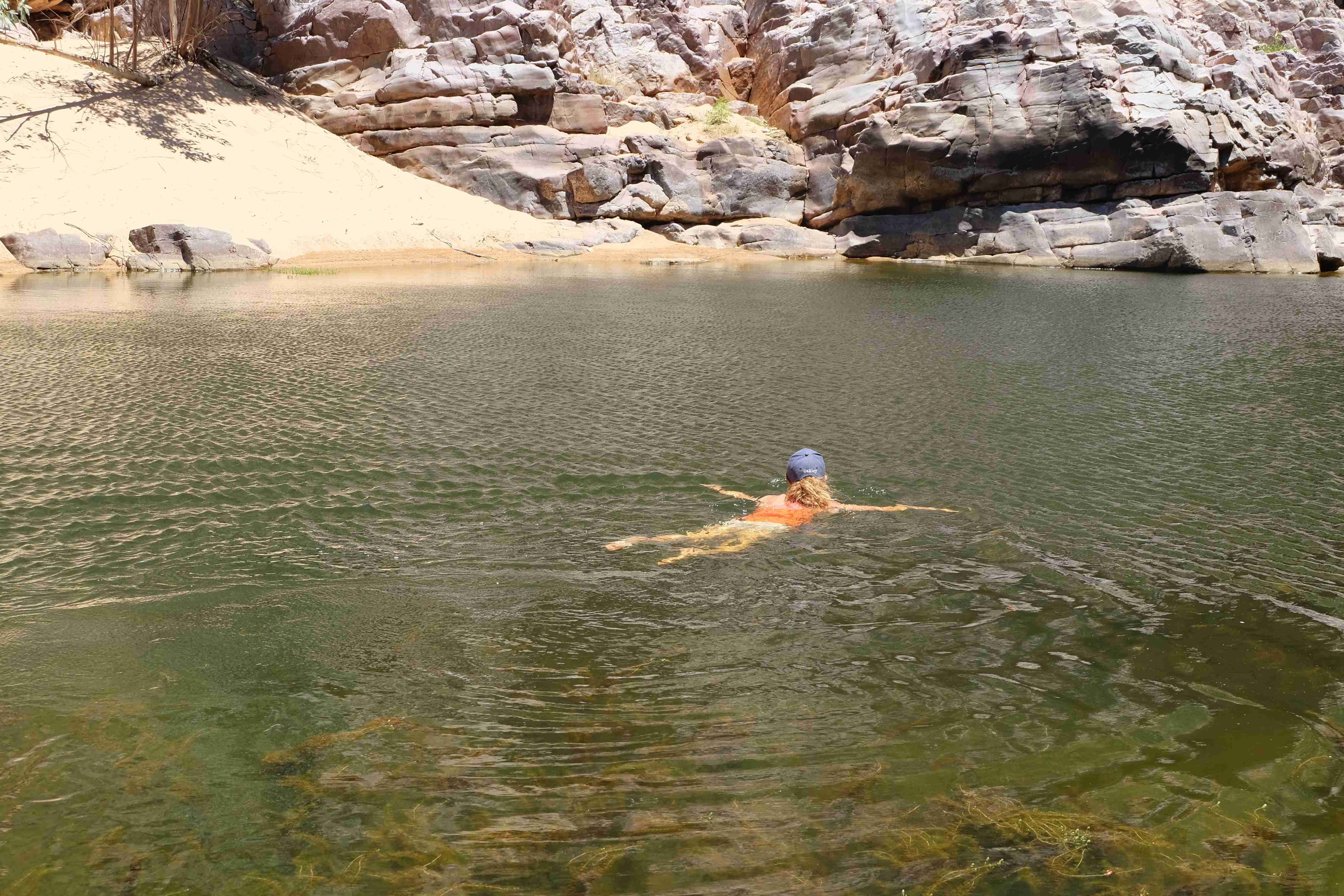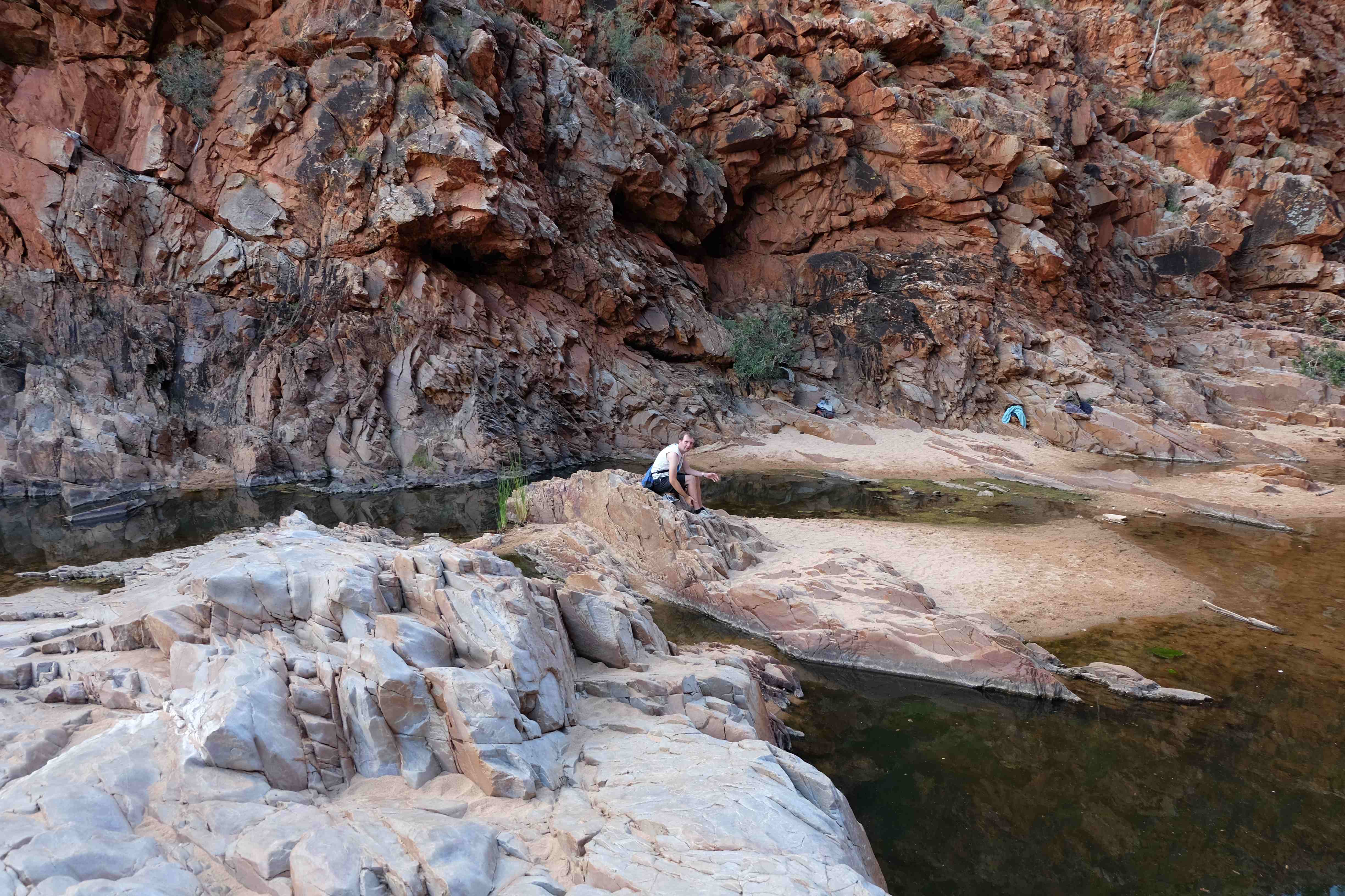 Nach der ersten im Auto verbrachten und mit einem unglaublichen Sonnenaufgang belohnten Nacht ging es morgens früh los – sehr früh, da die Wanderrouten hier aufgrund der lebensbedrohlichen Hitze und Dürre bereits um 9 Uhr morgens geschlossen werden. Wir unterschätzten ein wenig den Kampf gegen die aggressiven australischen Fliegen – die einem scharenweise beim Nasen- , Augen- und Ohrenputzen helfen wollen und sich somit in jedes Loch den Weg bahnen – sowie die vorgegebenen Flüssigkeitsmengen pro Stunden – 1 Liter Wasser pro Stunde ist doch nur normal wenn man der Gattung Kamel angehört! – Erschöpft und erschlagen erreichten wir nach guten 4 Stunden unsere Luxus-Residenz: unser neon-grünes Toyota, welches überhitzt auf uns auf dem Parkplatz wartete. Die Situation schrie einfach nur noch nach einer kalten Dusche, welche wir uns auch gönnten! Wo, fragt ihr euch? In einer der Duschanlagen der überteuerten Ressorts auf der Strecke, welche ebenfalls Mehrbetten-Zimmer mit geteilter Dusche anboten und wo wir uns einbrechermässig hereinschlichen – als seien wir zahlende Gäste – und uns erfrischten. 🙂 Da wir ja wussten, dass zwei weitere nächtliche Luxus-Aufenthalte in unserem Toyota folgten, mussten wir doch einen Weg finden unsere Geruchssinne zu schonen und – sei es auch nur einbrechermässig – zu duschen! 🙂 Frisch, sauber und als hätten wir nichts Unerlaubtes getan stolzierten wir aus den Duschanlagen heraus, begaben uns – als wären wir dortige Gäste – zu unserer schön im Schatten parkierten Luxus-Residenz und setzten unsere Reise fort. 🙂