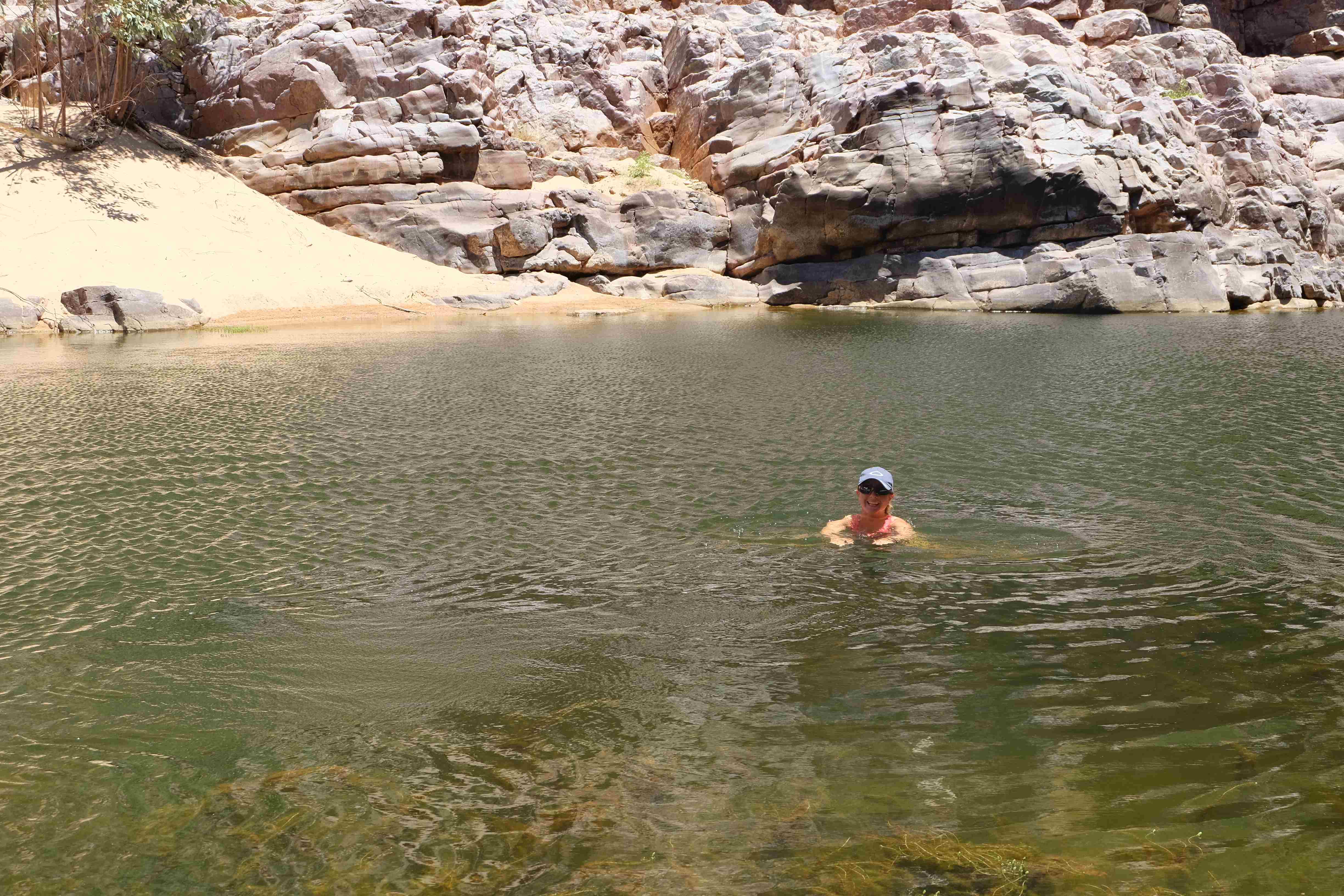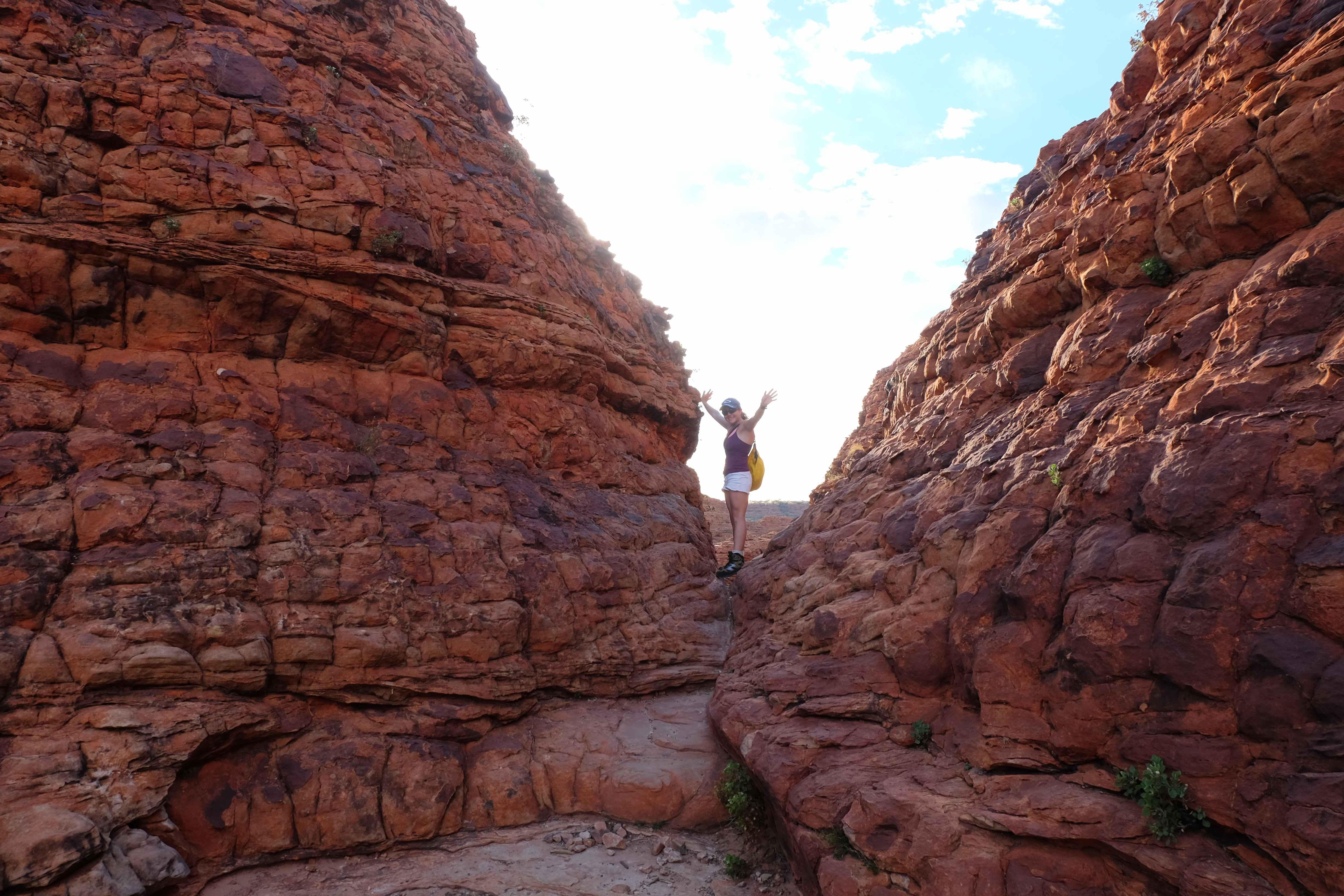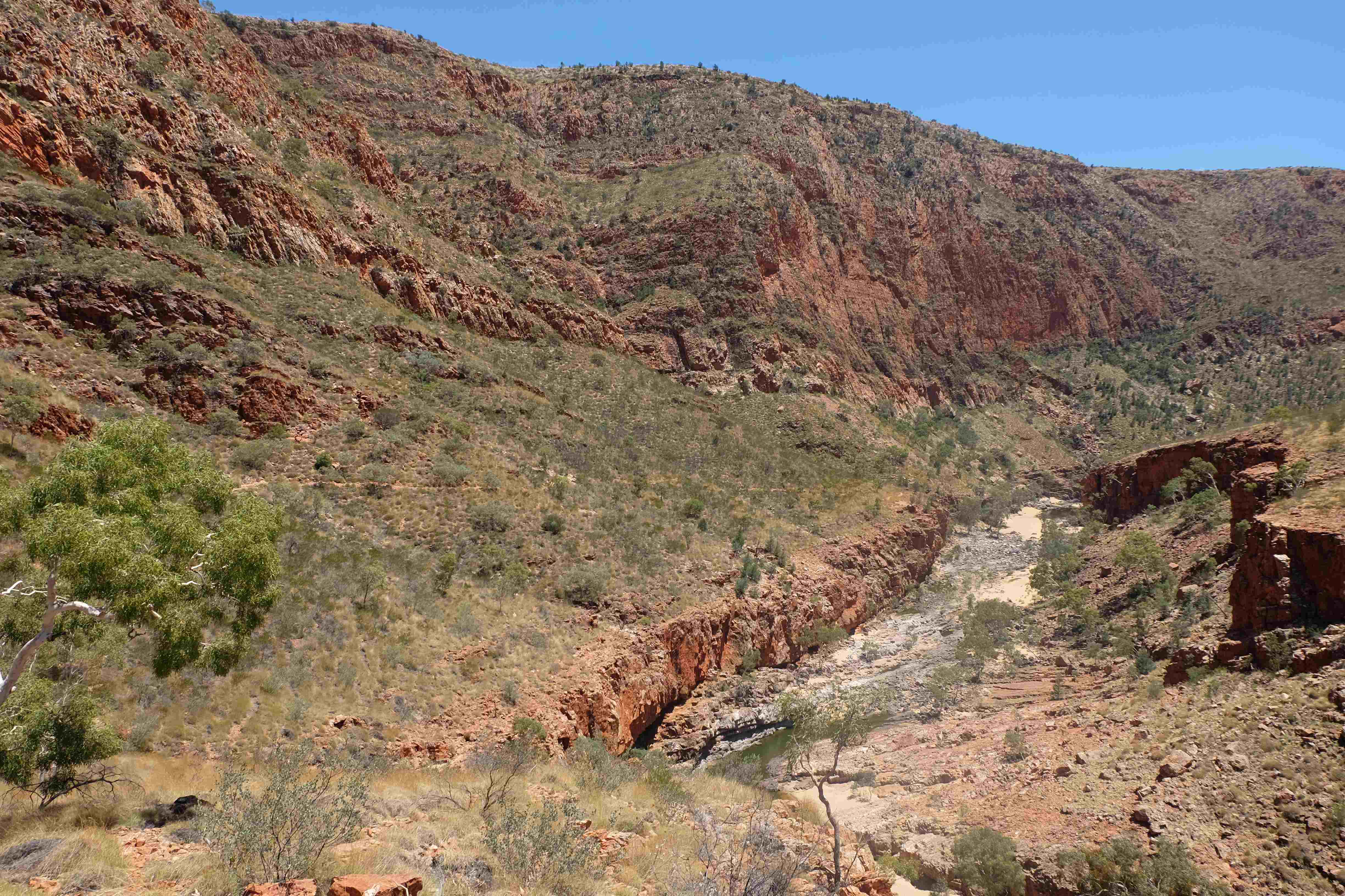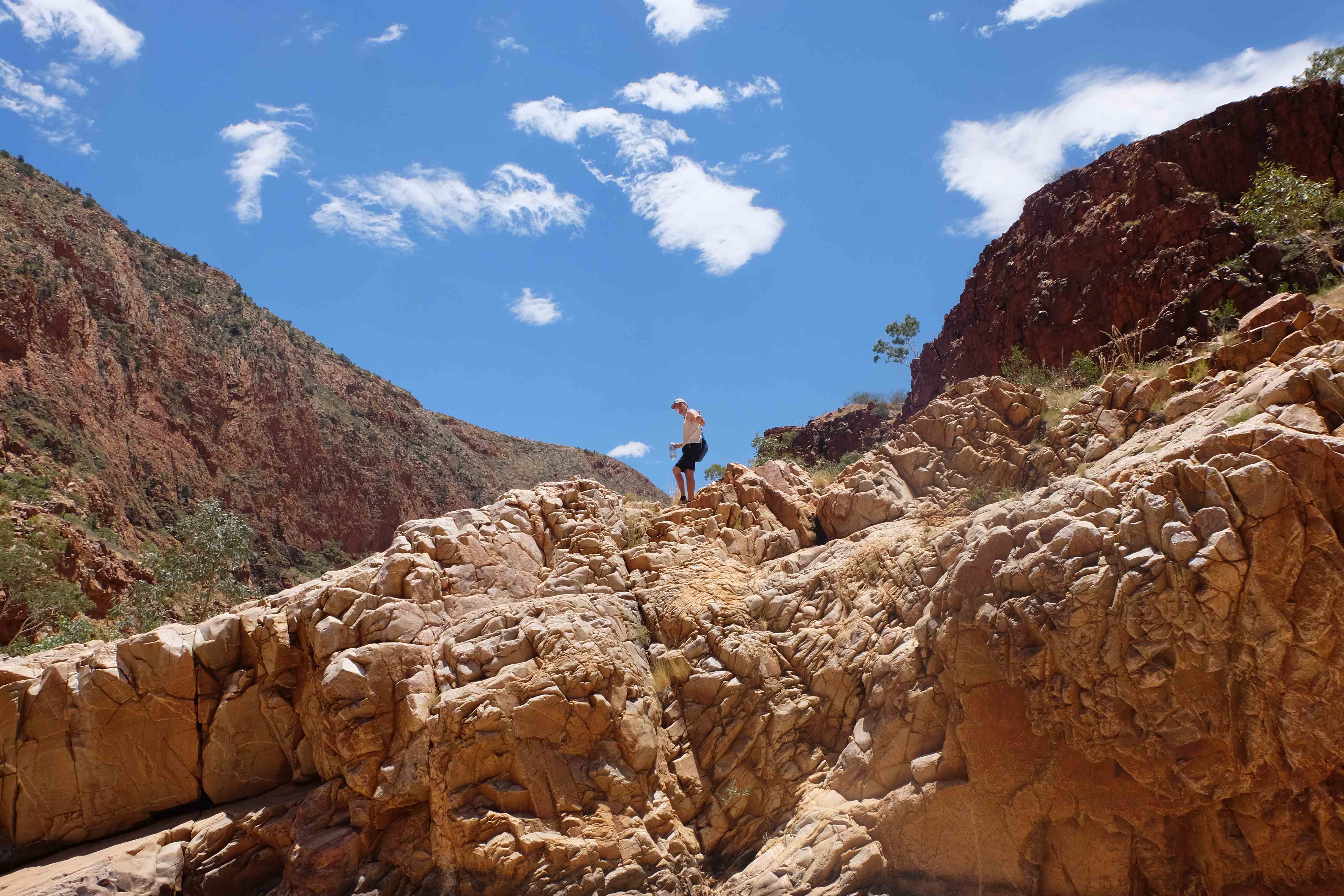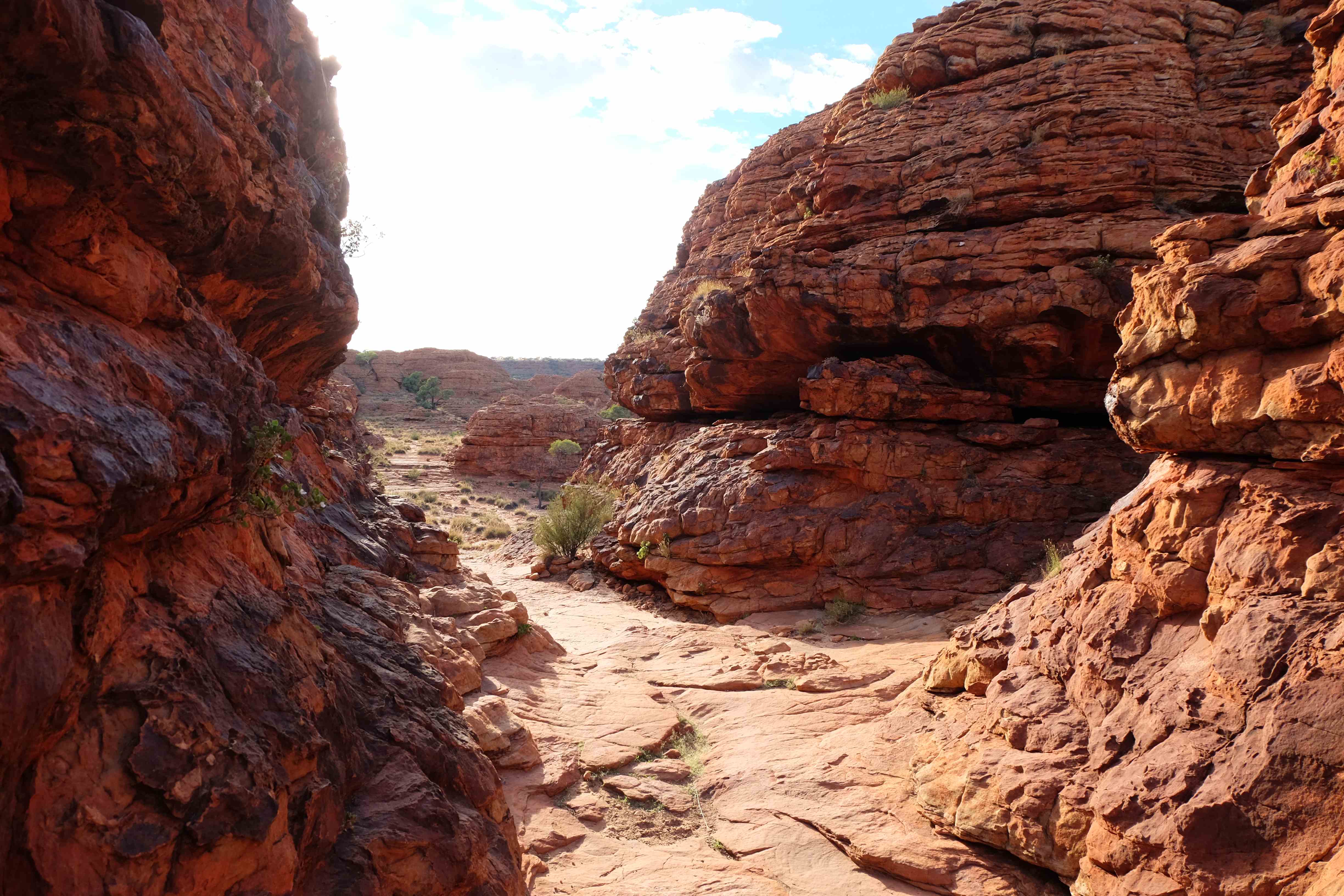 Nach der ersten im Auto verbrachten und mit einem unglaublichen Sonnenaufgang belohnten Nacht ging es morgens früh los – sehr früh, da die Wanderrouten hier aufgrund der lebensbedrohlichen Hitze und Dürre bereits um 9 Uhr morgens geschlossen werden. Wir unterschätzten ein wenig den Kampf gegen die aggressiven australischen Fliegen – die einem scharenweise beim Nasen- , Augen- und Ohrenputzen helfen wollen und sich somit in jedes Loch den Weg bahnen – sowie die vorgegebenen Flüssigkeitsmengen pro Stunden – 1 Liter Wasser pro Stunde ist doch nur normal wenn man der Gattung Kamel angehört! – Erschöpft und erschlagen erreichten wir nach guten 4 Stunden unsere Luxus-Residenz: unser neon-grünes Toyota, welches überhitzt auf uns auf dem Parkplatz wartete. Die Situation schrie einfach nur noch nach einer kalten Dusche, welche wir uns auch gönnten! Wo, fragt ihr euch? In einer der Duschanlagen der überteuerten Ressorts auf der Strecke, welche ebenfalls Mehrbetten-Zimmer mit geteilter Dusche anboten und wo wir uns einbrechermässig hereinschlichen – als seien wir zahlende Gäste – und uns erfrischten. 🙂 Da wir ja wussten, dass zwei weitere nächtliche Luxus-Aufenthalte in unserem Toyota folgten, mussten wir doch einen Weg finden unsere Geruchssinne zu schonen und – sei es auch nur einbrechermässig – zu duschen! 🙂 Frisch, sauber und als hätten wir nichts Unerlaubtes getan stolzierten wir aus den Duschanlagen heraus, begaben uns – als wären wir dortige Gäste – zu unserer schön im Schatten parkierten Luxus-Residenz und setzten unsere Reise fort. 🙂