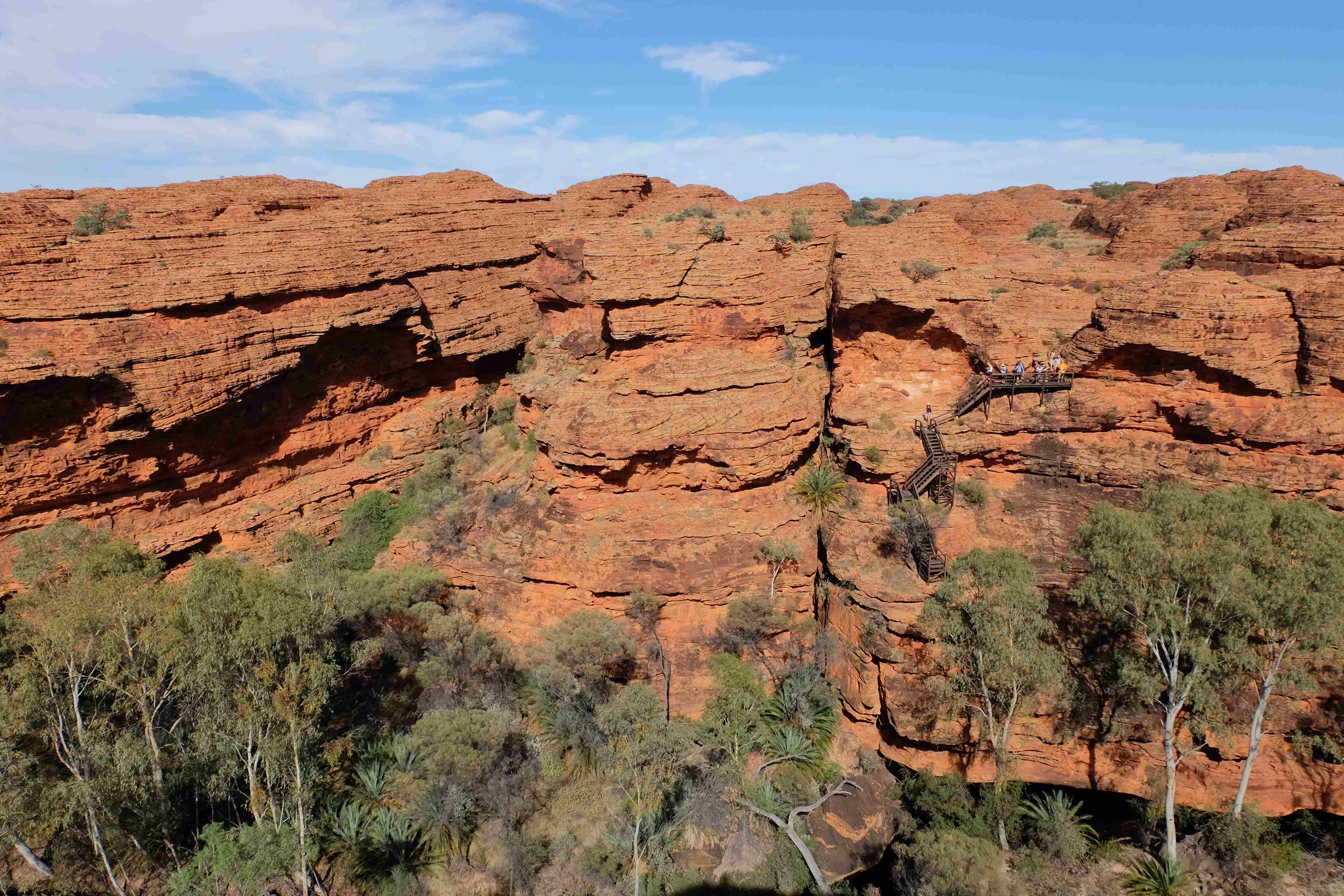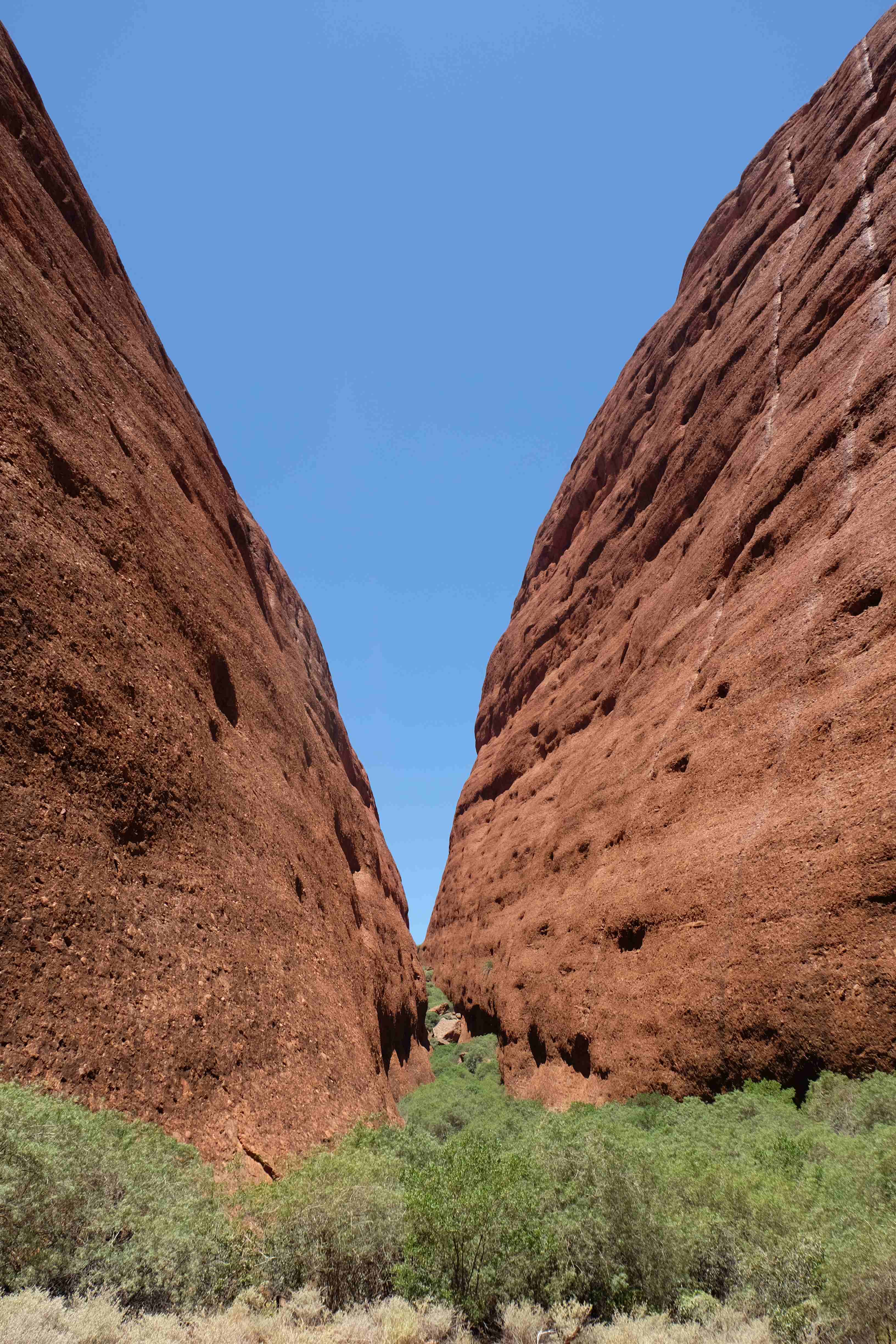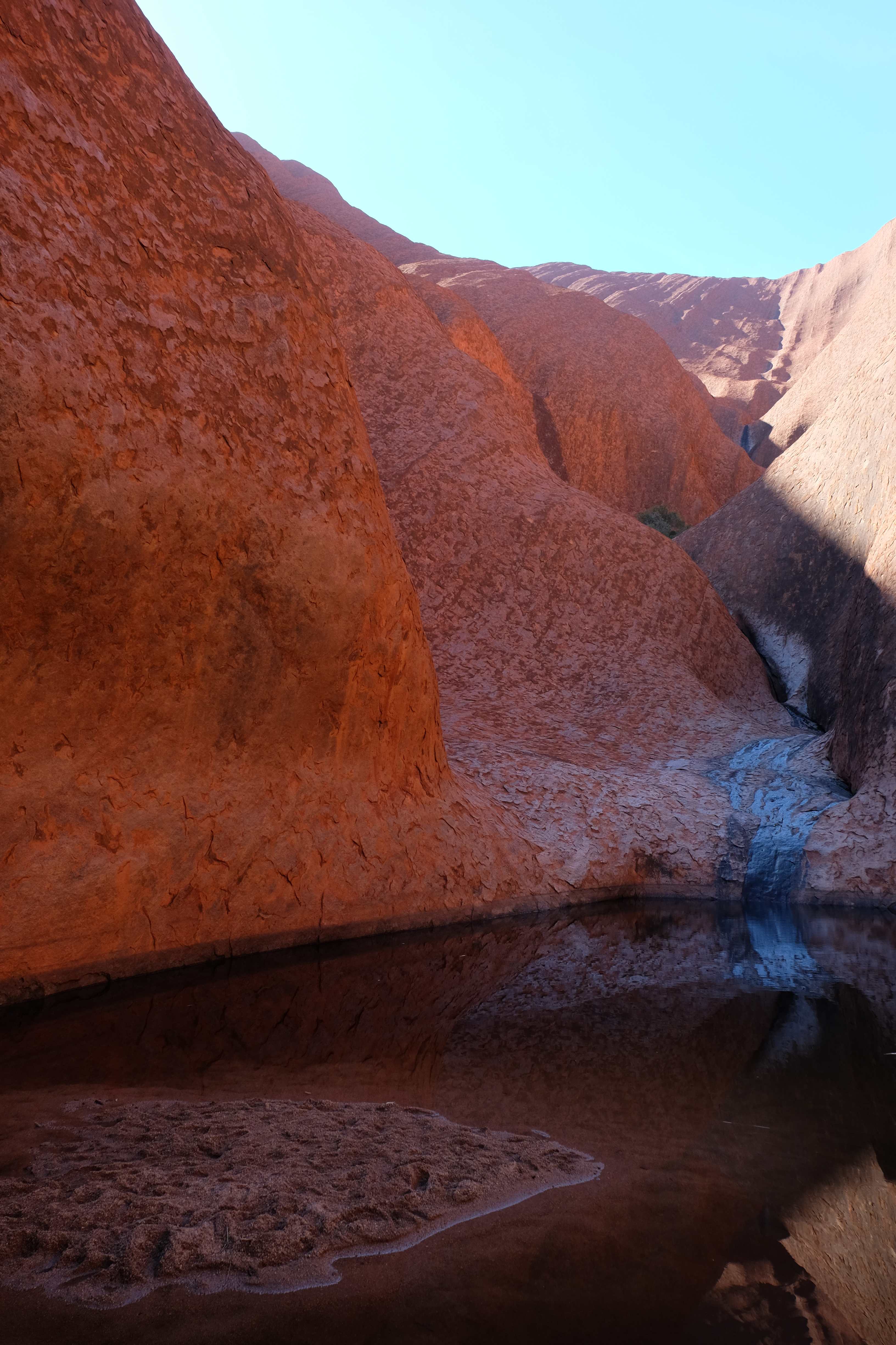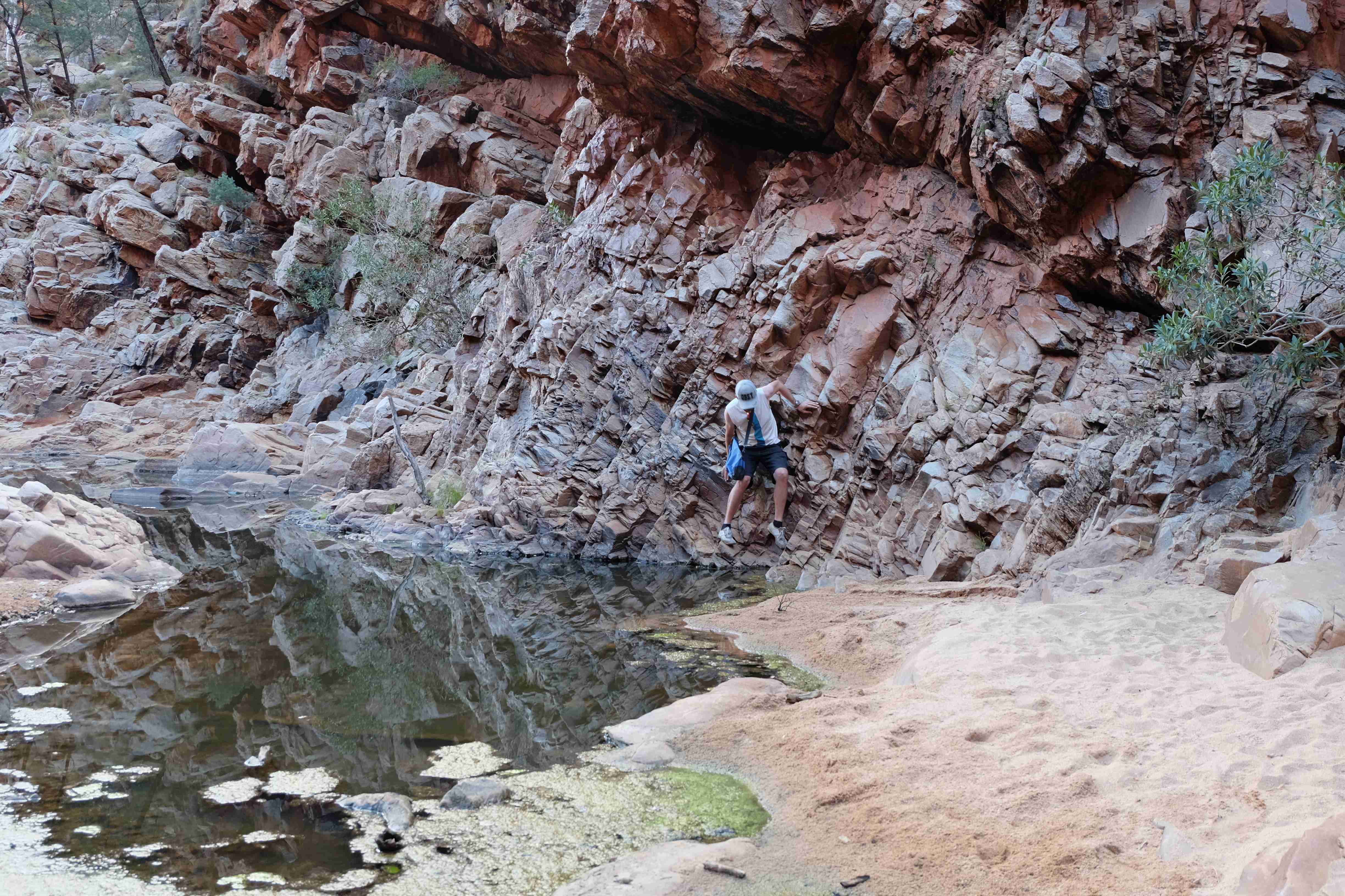 Nach der ersten im Auto verbrachten und mit einem unglaublichen Sonnenaufgang belohnten Nacht ging es morgens früh los – sehr früh, da die Wanderrouten hier aufgrund der lebensbedrohlichen Hitze und Dürre bereits um 9 Uhr morgens geschlossen werden. Wir unterschätzten ein wenig den Kampf gegen die aggressiven australischen Fliegen – die einem scharenweise beim Nasen- , Augen- und Ohrenputzen helfen wollen und sich somit in jedes Loch den Weg bahnen – sowie die vorgegebenen Flüssigkeitsmengen pro Stunden – 1 Liter Wasser pro Stunde ist doch nur normal wenn man der Gattung Kamel angehört! – Erschöpft und erschlagen erreichten wir nach guten 4 Stunden unsere Luxus-Residenz: unser neon-grünes Toyota, welches überhitzt auf uns auf dem Parkplatz wartete. Die Situation schrie einfach nur noch nach einer kalten Dusche, welche wir uns auch gönnten! Wo, fragt ihr euch? In einer der Duschanlagen der überteuerten Ressorts auf der Strecke, welche ebenfalls Mehrbetten-Zimmer mit geteilter Dusche anboten und wo wir uns einbrechermässig hereinschlichen – als seien wir zahlende Gäste – und uns erfrischten. 🙂 Da wir ja wussten, dass zwei weitere nächtliche Luxus-Aufenthalte in unserem Toyota folgten, mussten wir doch einen Weg finden unsere Geruchssinne zu schonen und – sei es auch nur einbrechermässig – zu duschen! 🙂 Frisch, sauber und als hätten wir nichts Unerlaubtes getan stolzierten wir aus den Duschanlagen heraus, begaben uns – als wären wir dortige Gäste – zu unserer schön im Schatten parkierten Luxus-Residenz und setzten unsere Reise fort. 🙂