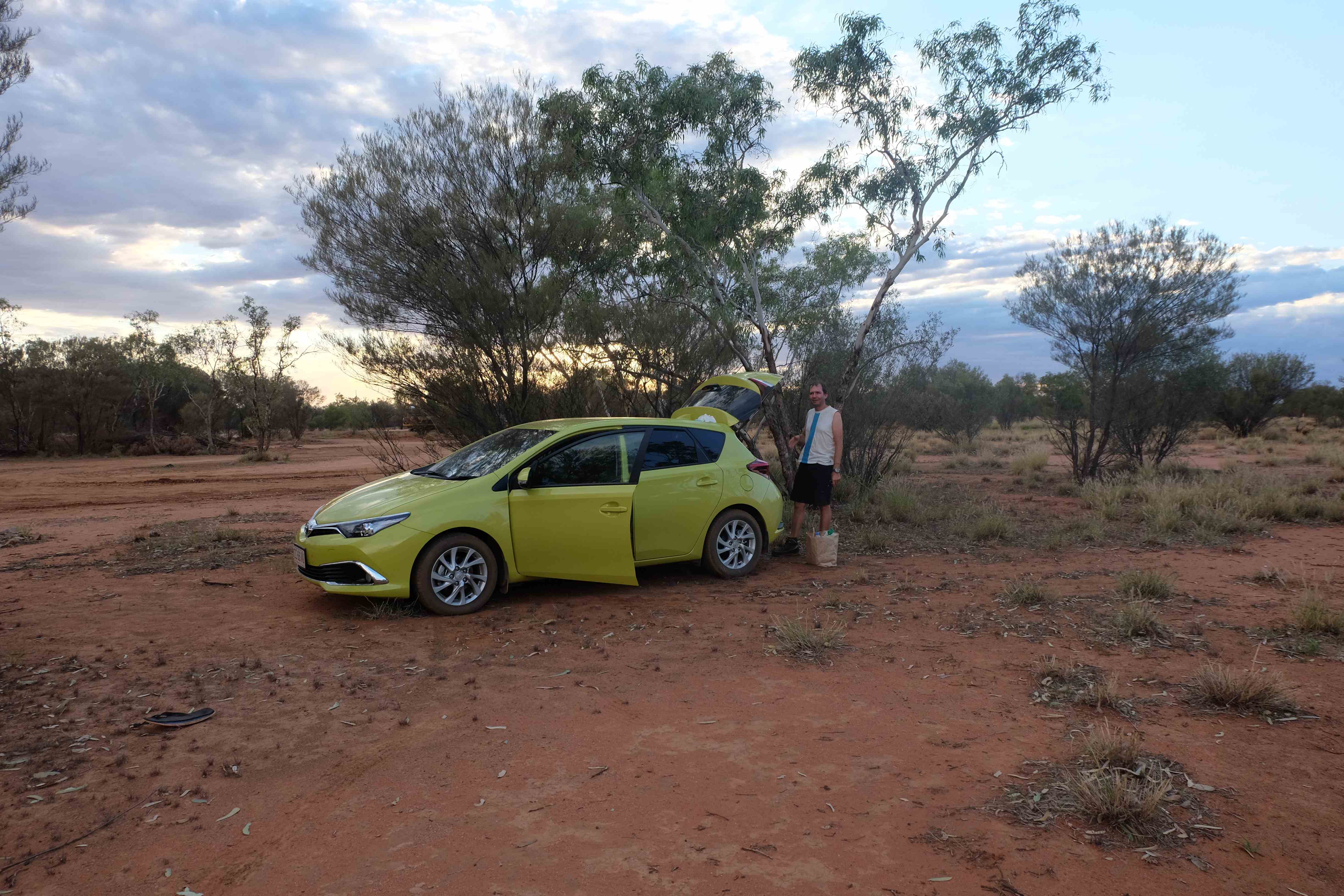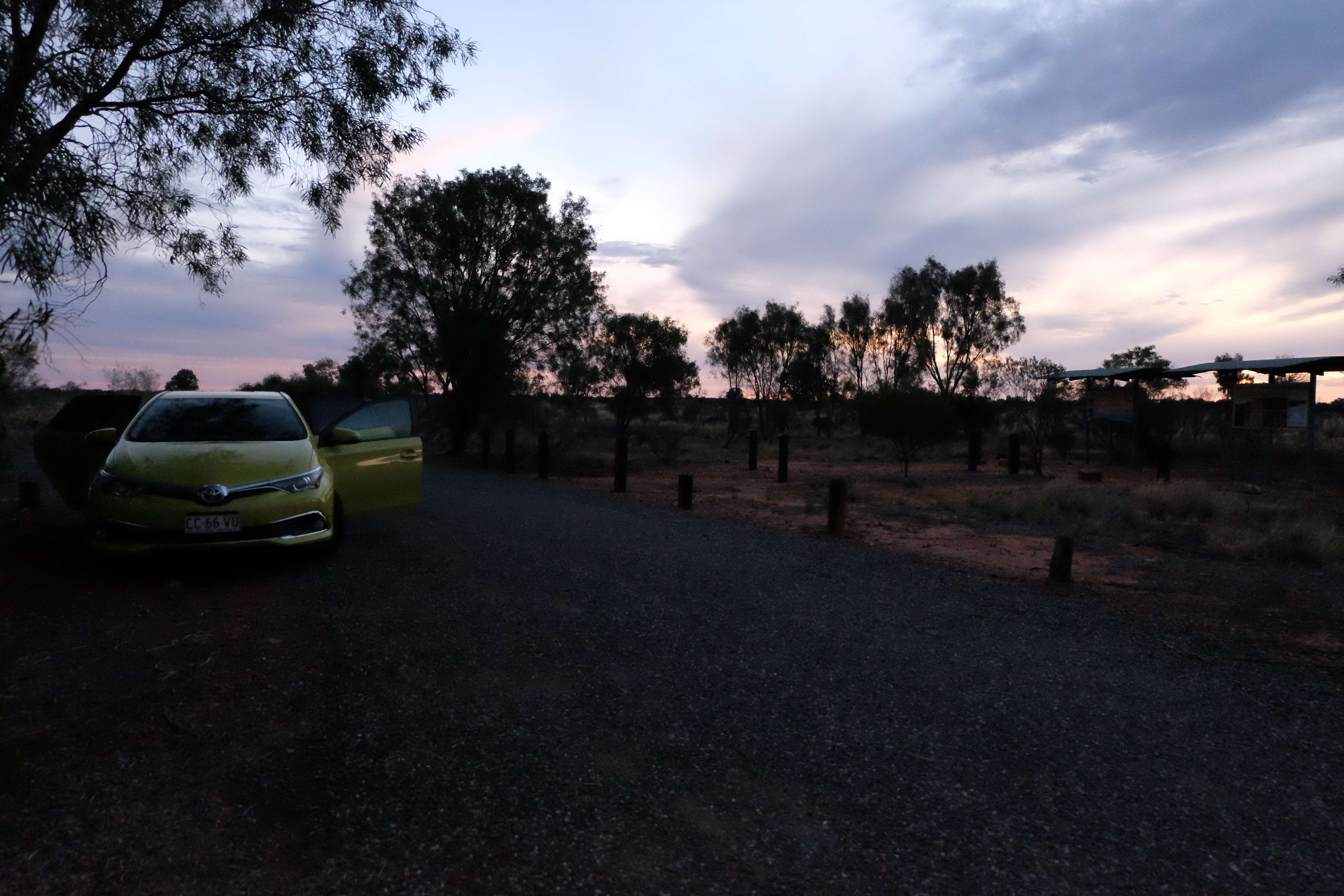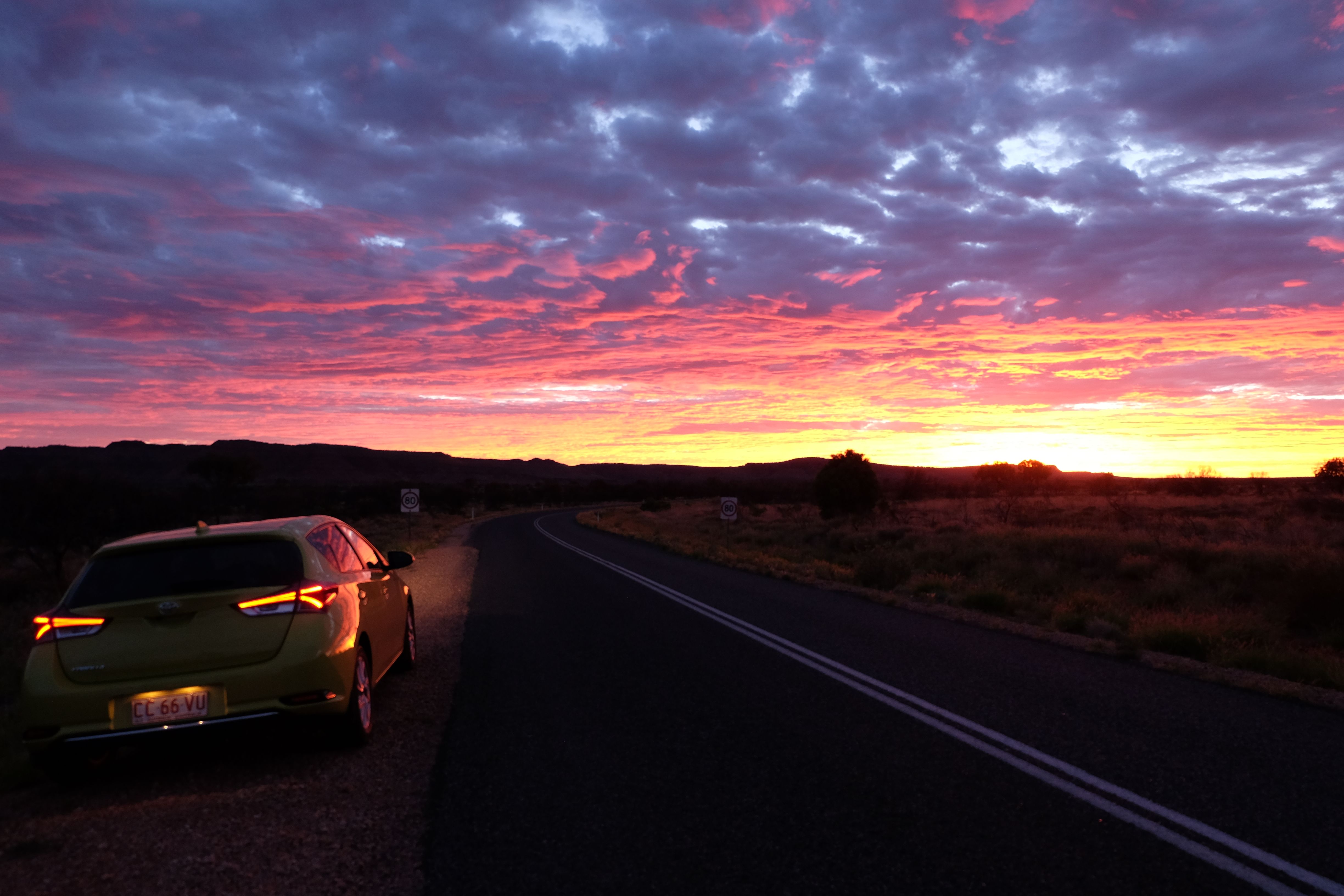 Ein Tag später und ein Kilo Geld leichter machten wir uns in unserer gemieteten Luxuskarosse auf den Weg zu den Sehenswürdigkeiten und schliesslich nach Alice Springs. Die Entscheidung war getroffen: das Budget-Loch musste repariert werden: Schlafen im Auto war angesagt! Aus jedoch unerklärbaren Gründen verspürten wir nach einem vollen Tag den Drang zurück zu unserem Lieblingsflughafen zu gehen und diesen für ein drittes und letztes Mal besichtigen – wir mussten nämlich das Auto wechseln. Die zweite Luxuskarosse die wir erhielten war Luxus als Preis jedoch Miniatur als Masse, so dass mit dem Auto auch einige Yoga-Lektionen inbegriffen waren – aber was soll’s, schlafen und dabei gleichzeitig Kontorsionismus trainieren ist auch etwas Spezielles! 🙂 Hier einige Bilder von unserem dortigen Abenteuer: