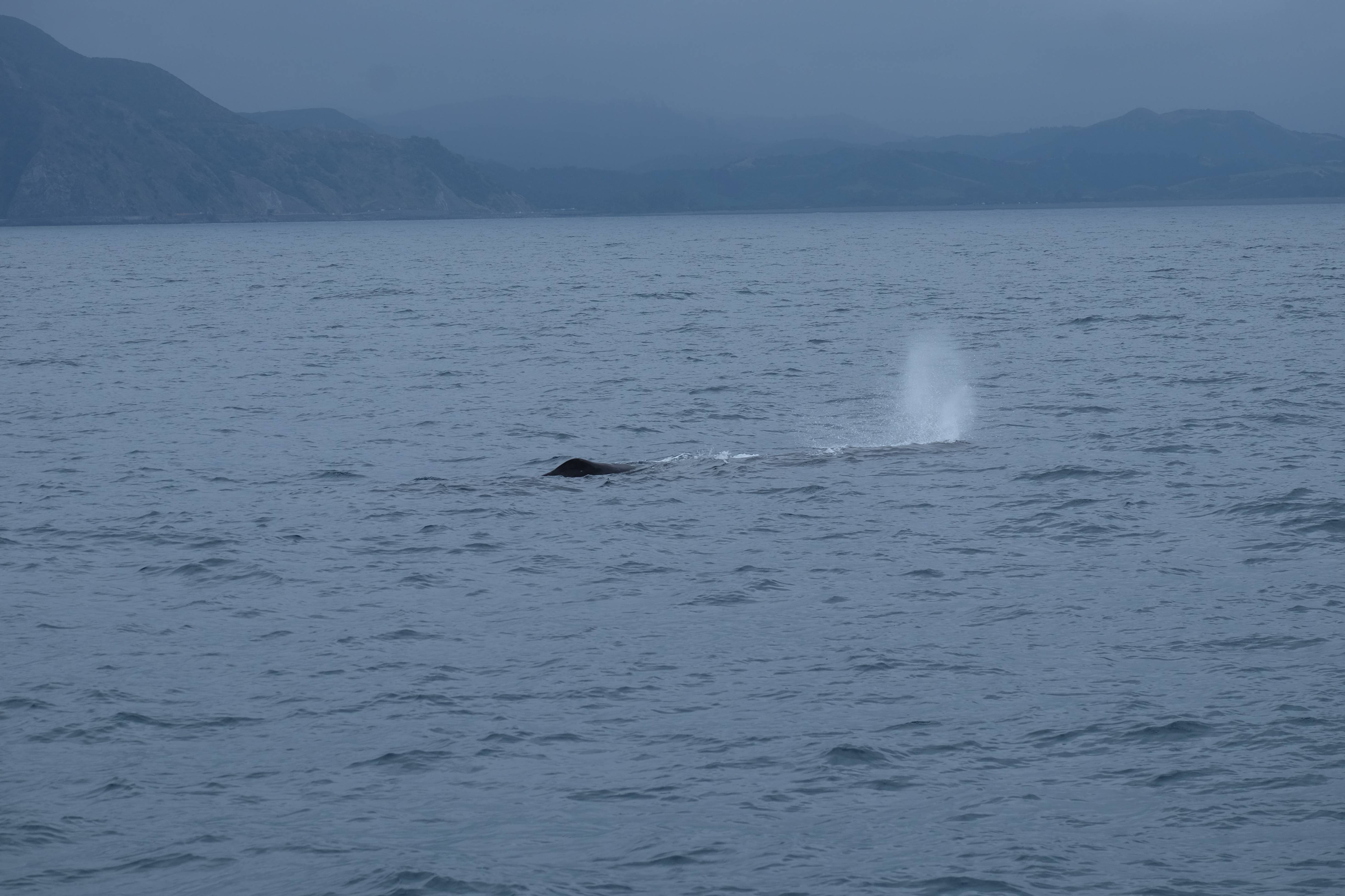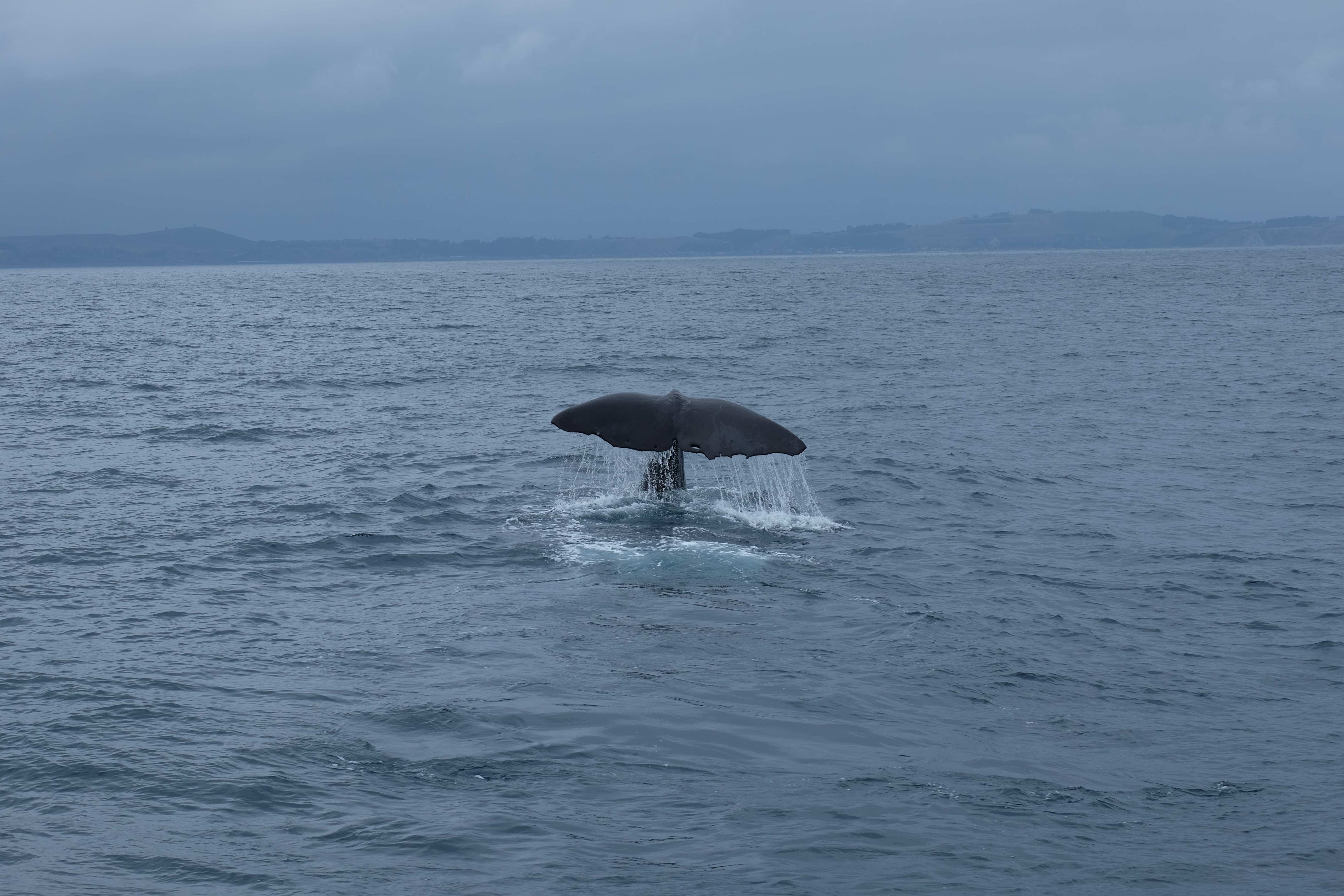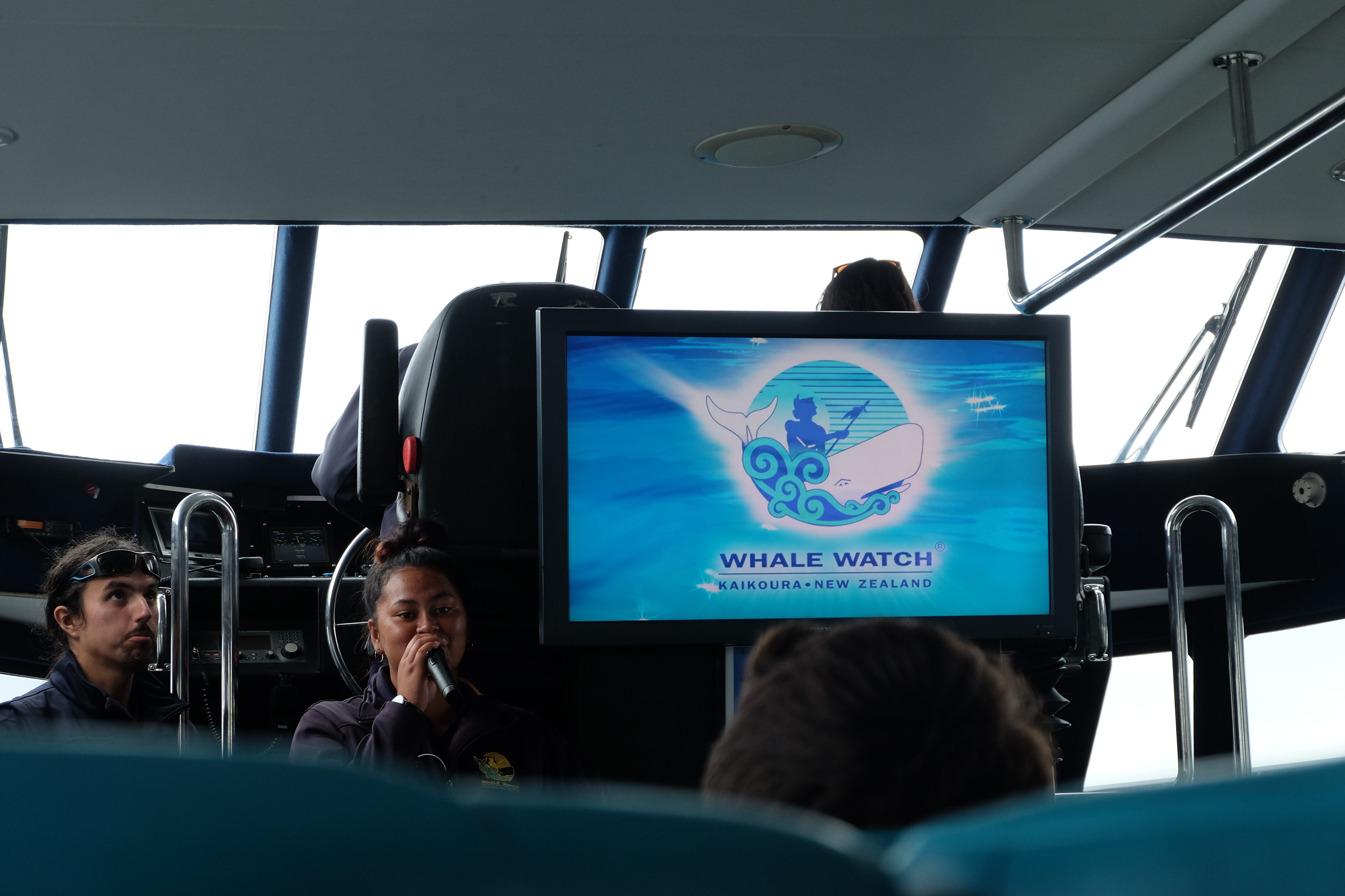 Aber die Enttäuschung hielt nicht lange an… am Nachmittag gingen wir nämlich auf die einzige dort existierende Walsichten-Tour. Die Firma gehört den Maori – die einheimische Bevölkerung Neuseelands vor der Ankunft der Europäer – und ist eine Erfolgsgeschichte. Vor Jahrzehnten, als die hiesige Maori-Bevölkerung in finanziellen Schwierigkeiten war, mussten sie eine Lösung finden. Da fiel ihnen ein, dass sie mit ihren Bräuchen und kulturellen Hinterlassenschaften eigentlich den Weg finden könnten. Die Maori sind eine Segel-Nation, sie sollen vor Tausenden von Jahren mit selbstgebauten Baumstamm-Booten die Ufer Neuseelands erreicht haben. Daher wussten sie immer, wo welche Tiere sich befanden und hatten die ganze Zeit eine sehr nahe Beziehung zur Wasser- und Unterwasserwelt. Als sie diese schweren Zeiten durchmachten, entstand die Idee den Leuten Touren anzubieten, um Wale zu sichten – da sie ja die einzigen waren, die wussten, wo sich diese aufhielten bzw. wie diese finden. Was als Miniatur-Geschäft mit einem Gummiboot anfing ist heute ein Millionen-Unternehmen mit 4 speziell für Walsichten gebauten Katamaranen.