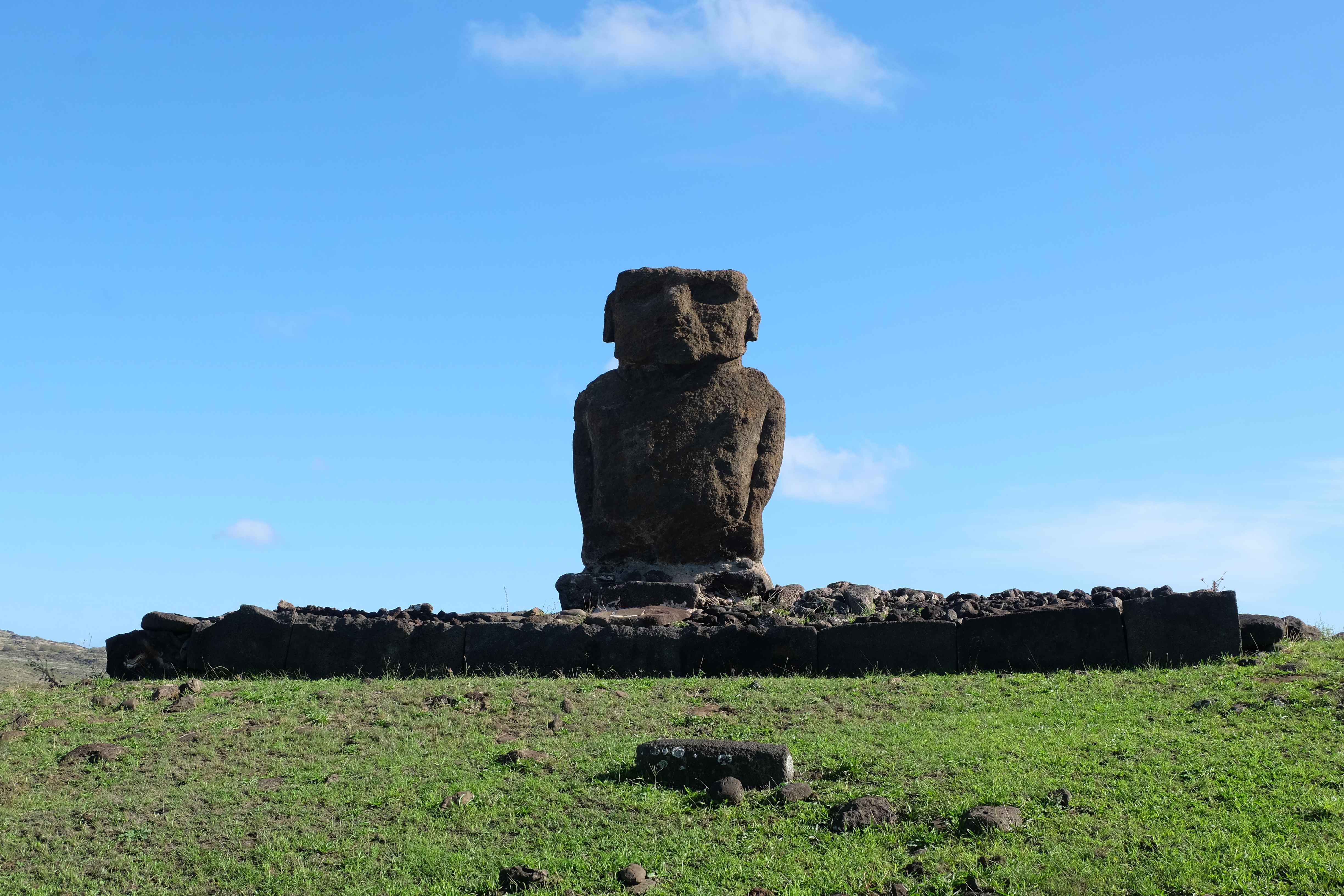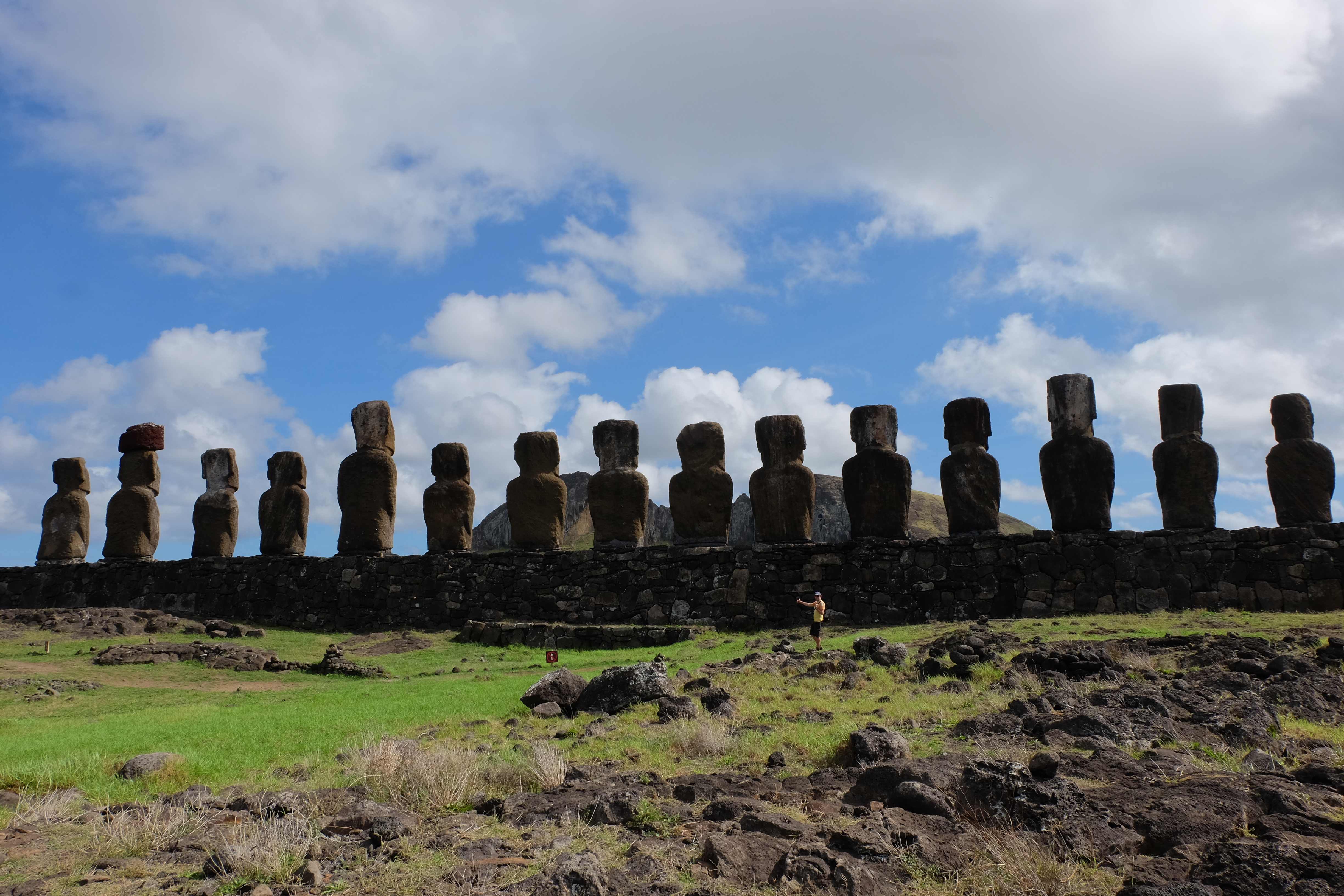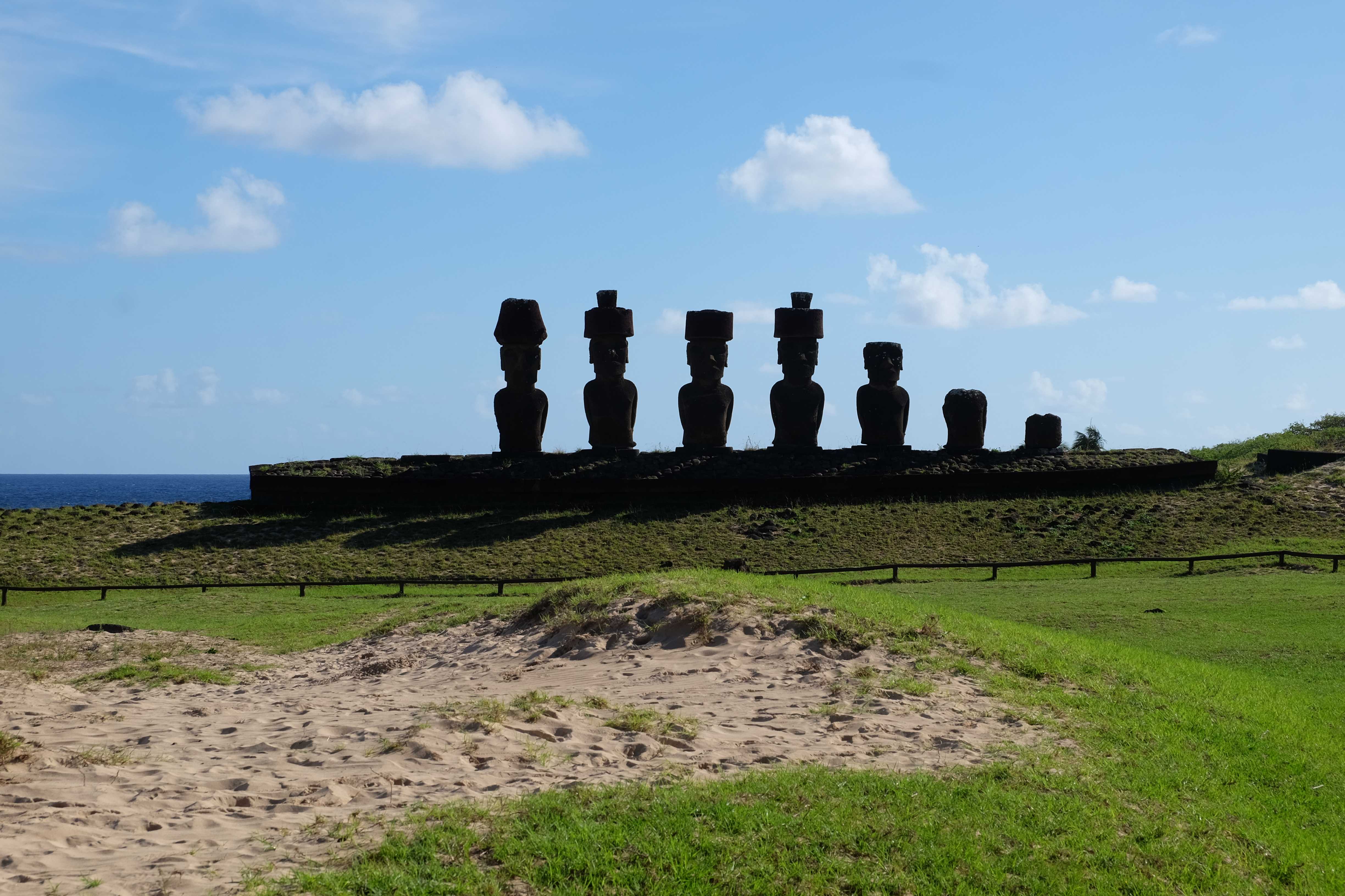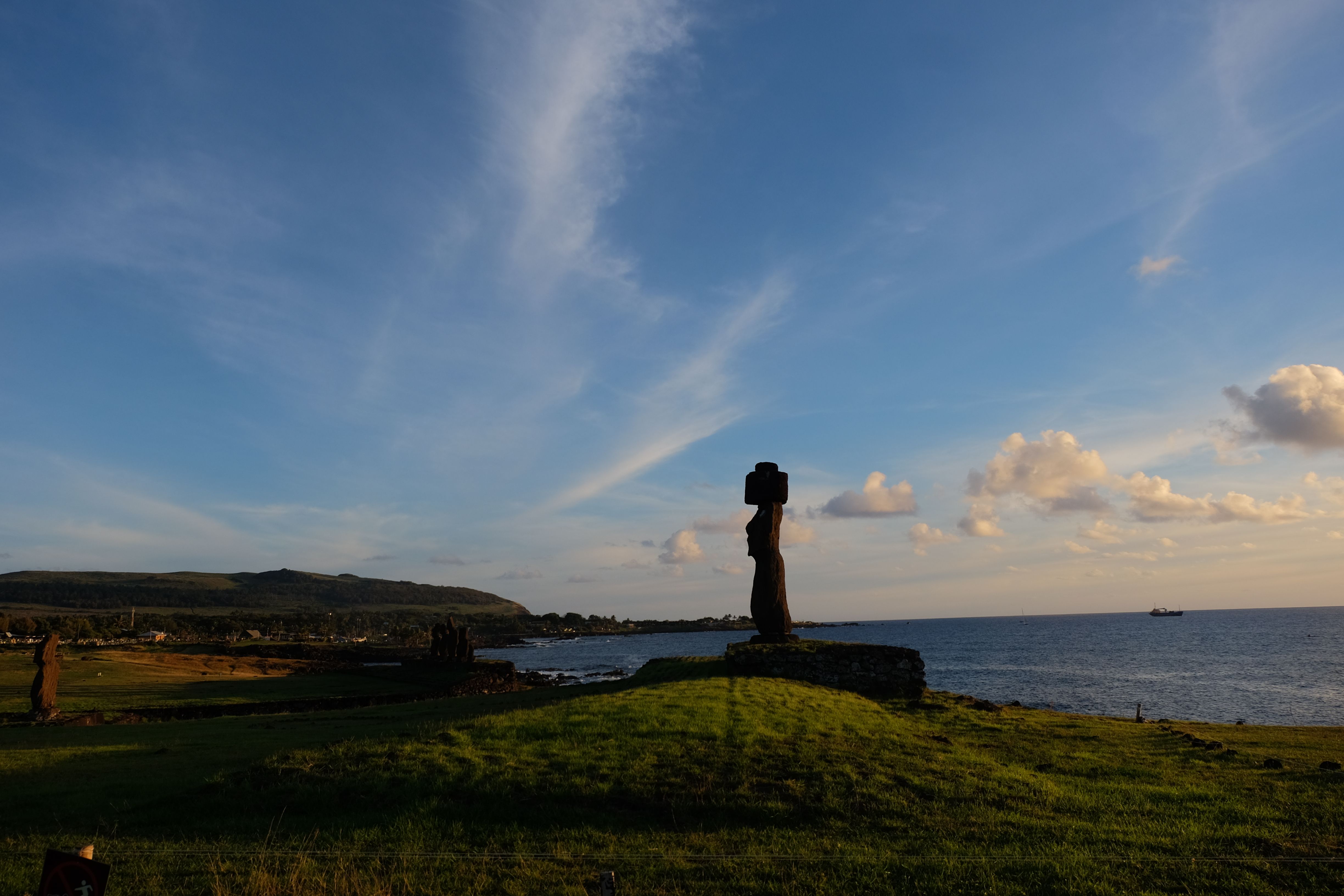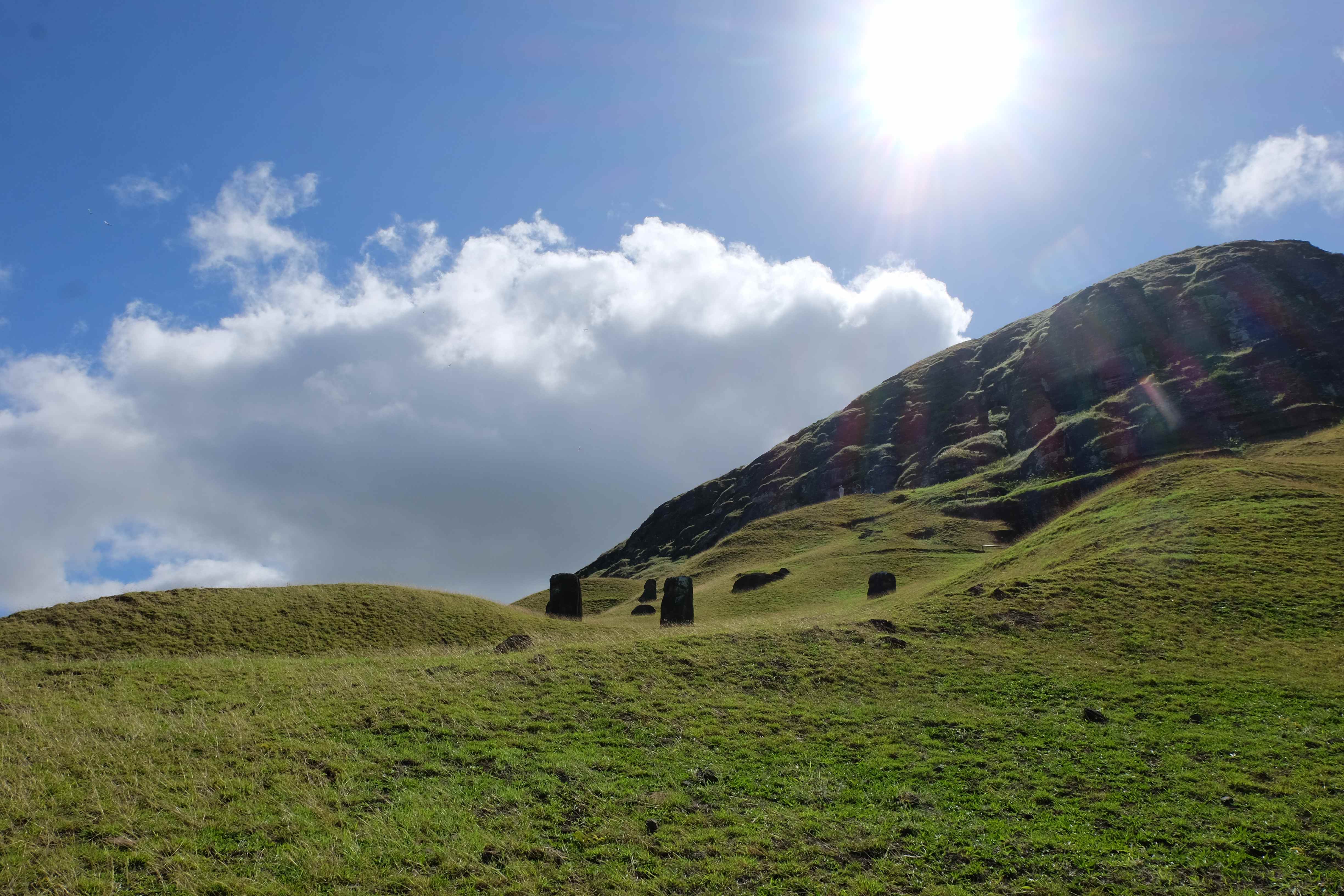 Auf der Osterinsel gibt es vieles zu erkunden sobald man die Hauptsiedlung verlässt. Spuren einer alten Kultur warten auf einen um ihm die Geschichte der ersten Segler zu erzählen, welche auf einem Boot hierhin gekommen waren und die Rapa Nui Kultur auf diesen Landfleck mitten im Ozean mit sich brachten. Riesige, imposante Steinstrukturen zu Männern, legendären Vorfahren und für die Einheimischen nicht nur interessanten, sondern auch bedeutungstragenden Gesichtern geformt weisen von einer mystischen und mythischen Zeit zugleich, welche hierzulande, weit weg vom Rest der Welt – während die Inkas, Mayas und Azteken dem südamerikanischen Kontinenten zu einer Blütezeit verhalfen – die Wiege einer eigenen Kultur schuf: die Rapa Nui. Es war ein unglaublich schönes, gewaltiges jedoch unerklärbar mystisches Gefühl diesen riesigen Steinen in menschlicher Gestalt gegenüberzustehen, ihre Präsenz lediglich als unaufgeklärte Nichtkenner wahrzunehmen und dabei trotzdem den Hauch einer gewissen zeitüberdauernden Hinterlassenschaft zu spüren. Riesige Zeremonie-Anlagen, ganze Hügel voller alten steinigen Gestalten, aus dem Nichts herausragende und geheimnisvolle „Männlein mit Hut“… und das überall, an allen Seiten einschränkende Wasser, welches einen ständig erinnerte, dass man sich lediglich auf einem Fleck Land befindet… die Kombination all dieser Gegebenheiten verwandelten die Osterinsel in einen speziellen Ort, an welchem man sich fremd und wohl zugleich fühlte.