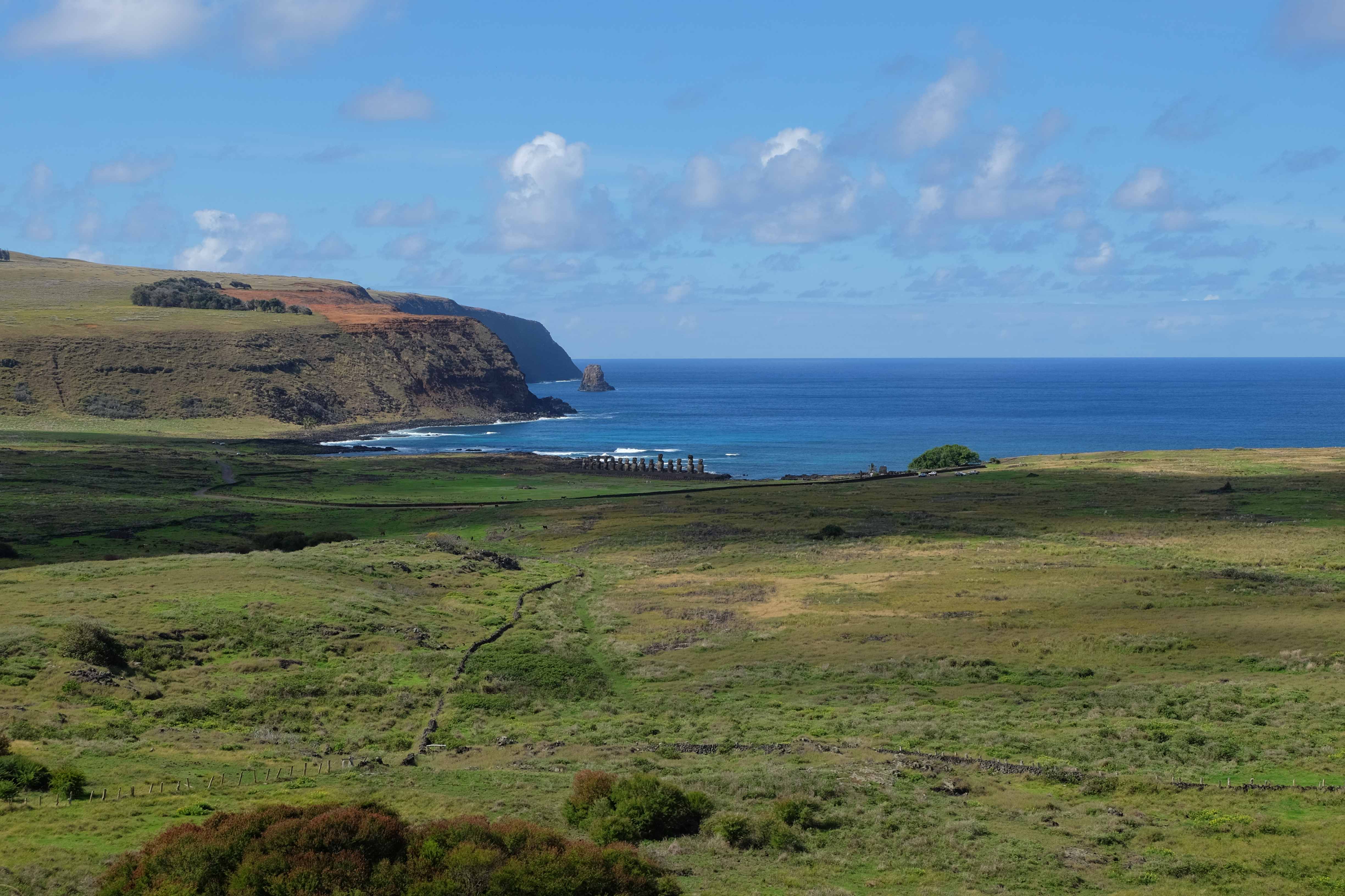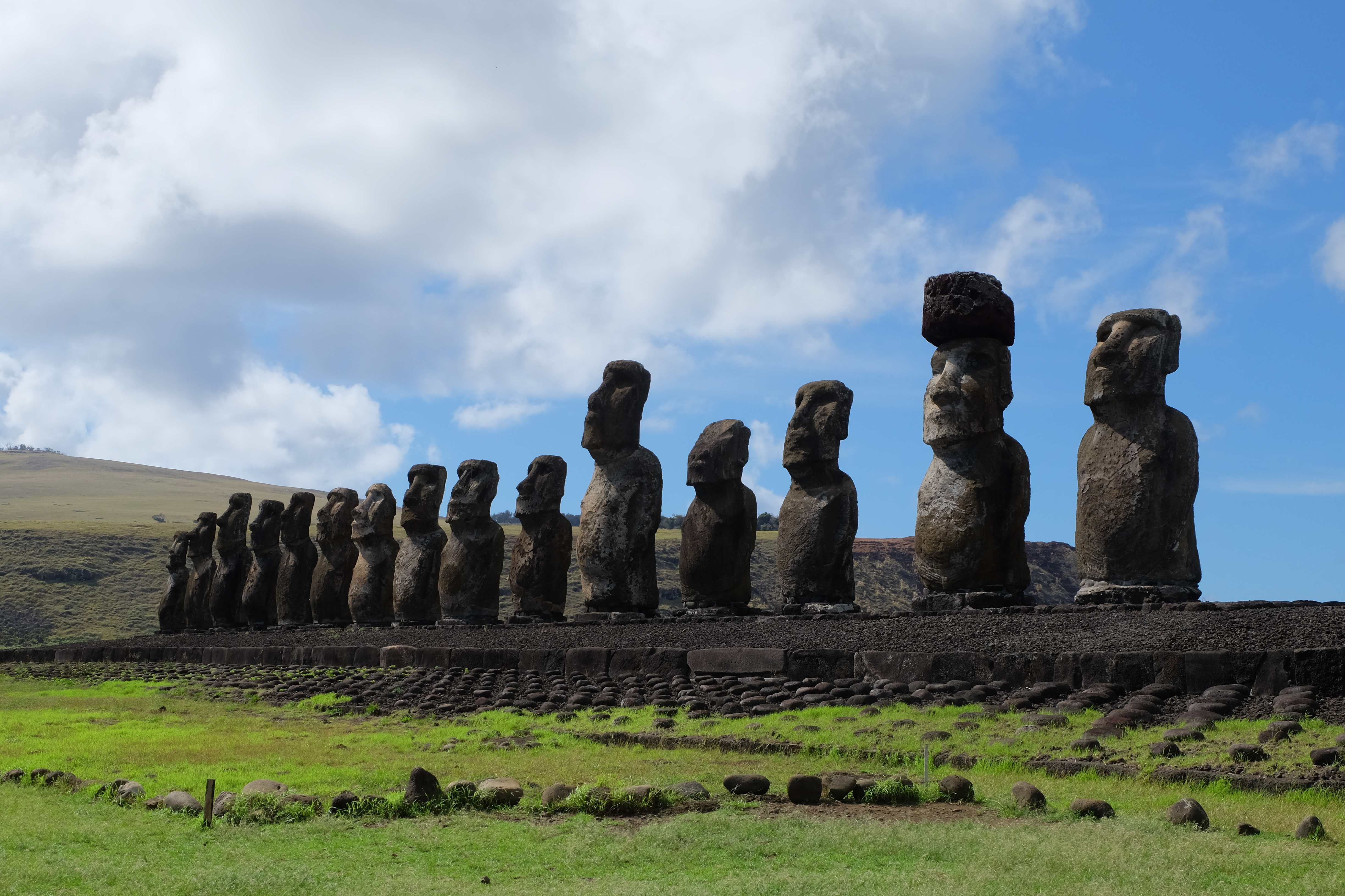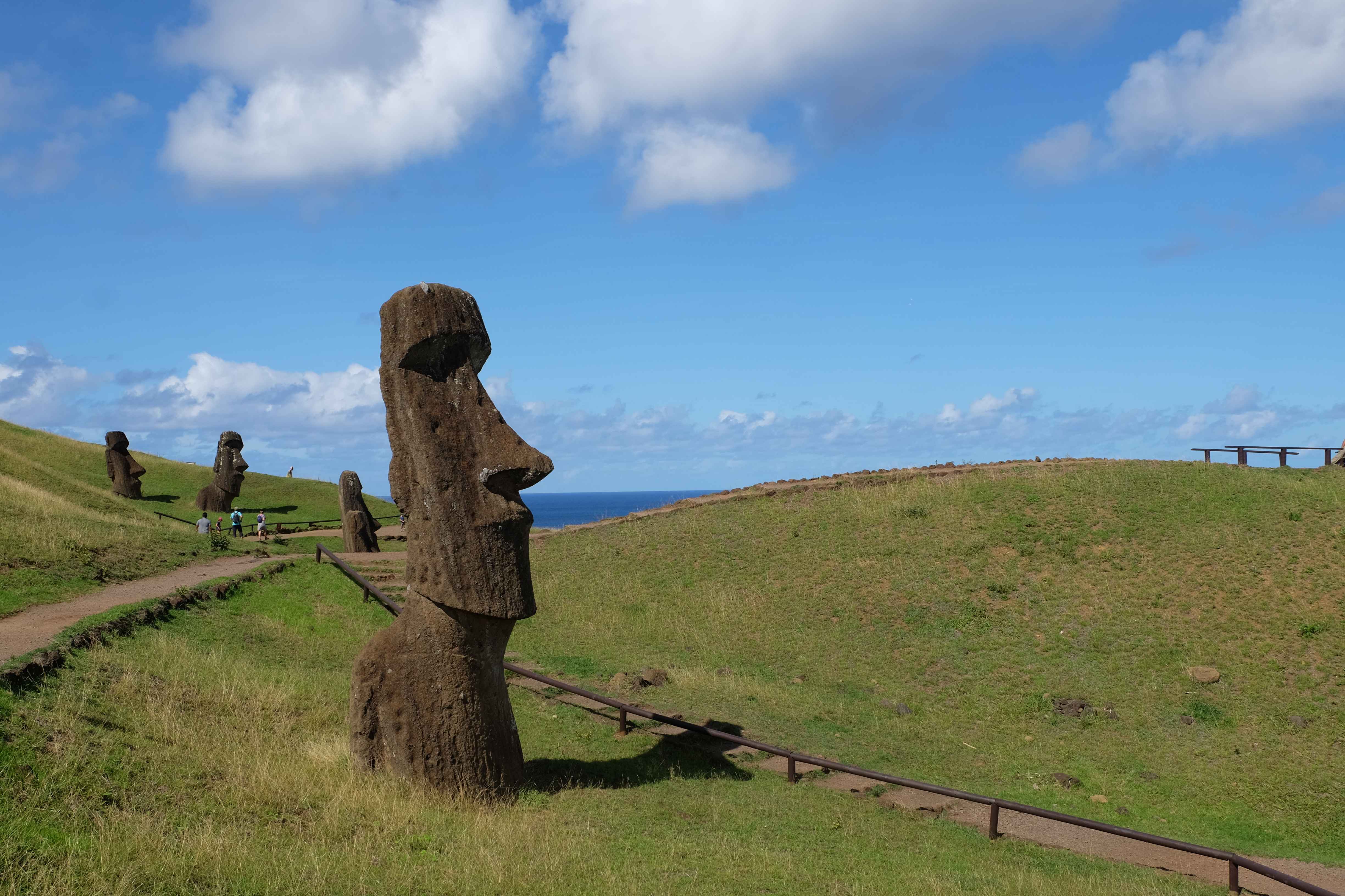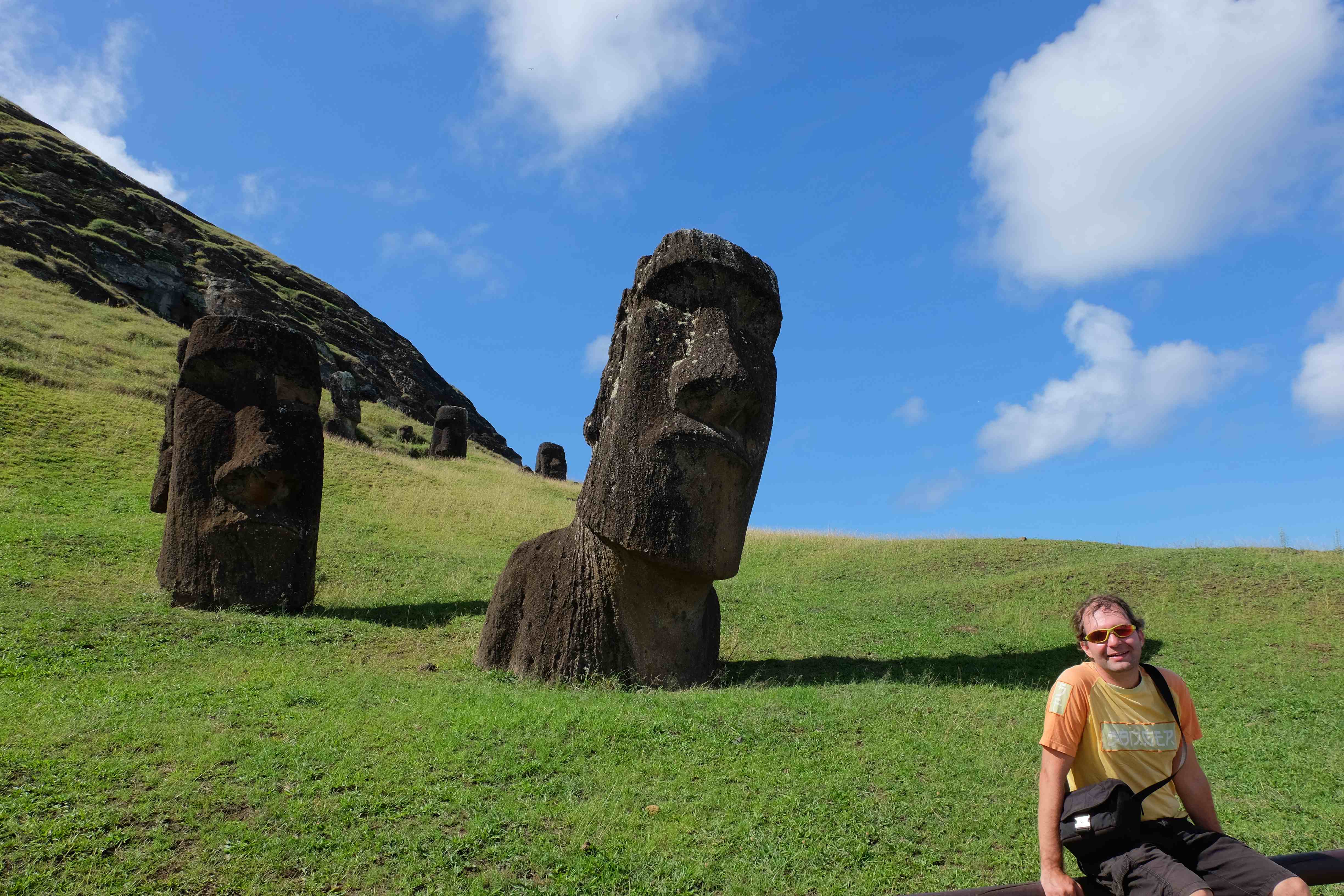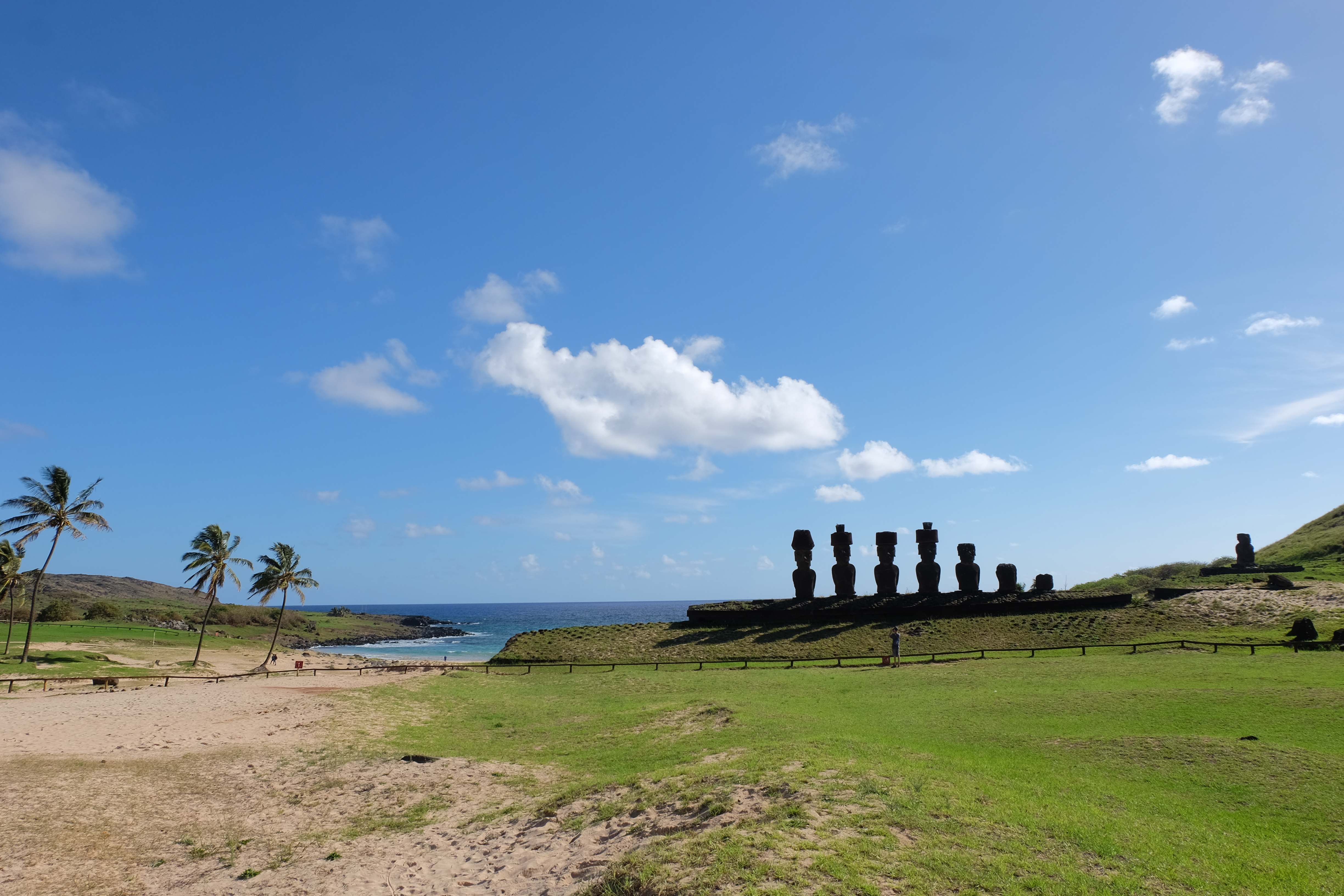 Auf der Osterinsel gibt es vieles zu erkunden sobald man die Hauptsiedlung verlässt. Spuren einer alten Kultur warten auf einen um ihm die Geschichte der ersten Segler zu erzählen, welche auf einem Boot hierhin gekommen waren und die Rapa Nui Kultur auf diesen Landfleck mitten im Ozean mit sich brachten. Riesige, imposante Steinstrukturen zu Männern, legendären Vorfahren und für die Einheimischen nicht nur interessanten, sondern auch bedeutungstragenden Gesichtern geformt weisen von einer mystischen und mythischen Zeit zugleich, welche hierzulande, weit weg vom Rest der Welt – während die Inkas, Mayas und Azteken dem südamerikanischen Kontinenten zu einer Blütezeit verhalfen – die Wiege einer eigenen Kultur schuf: die Rapa Nui. Es war ein unglaublich schönes, gewaltiges jedoch unerklärbar mystisches Gefühl diesen riesigen Steinen in menschlicher Gestalt gegenüberzustehen, ihre Präsenz lediglich als unaufgeklärte Nichtkenner wahrzunehmen und dabei trotzdem den Hauch einer gewissen zeitüberdauernden Hinterlassenschaft zu spüren. Riesige Zeremonie-Anlagen, ganze Hügel voller alten steinigen Gestalten, aus dem Nichts herausragende und geheimnisvolle „Männlein mit Hut“… und das überall, an allen Seiten einschränkende Wasser, welches einen ständig erinnerte, dass man sich lediglich auf einem Fleck Land befindet… die Kombination all dieser Gegebenheiten verwandelten die Osterinsel in einen speziellen Ort, an welchem man sich fremd und wohl zugleich fühlte.