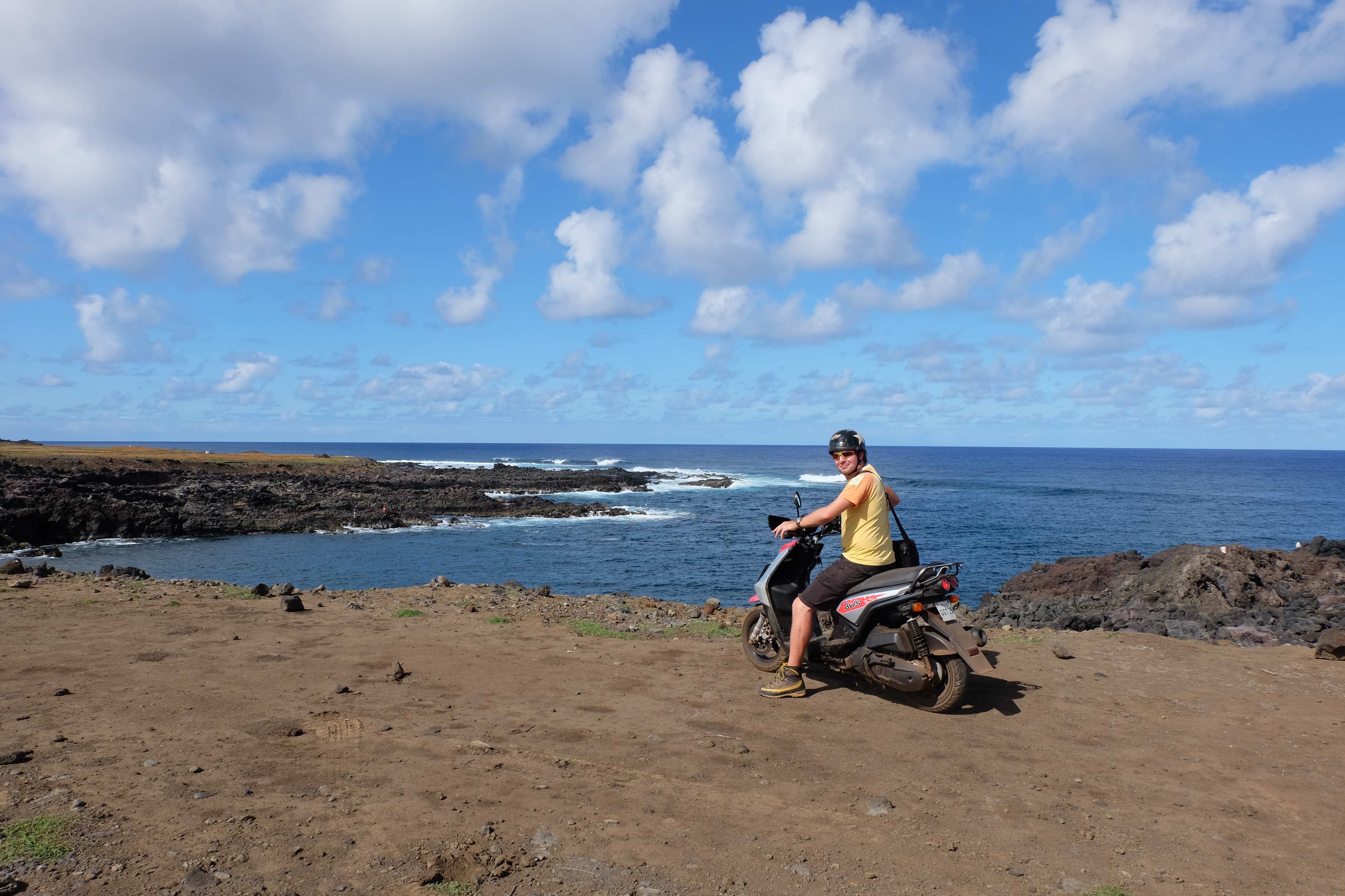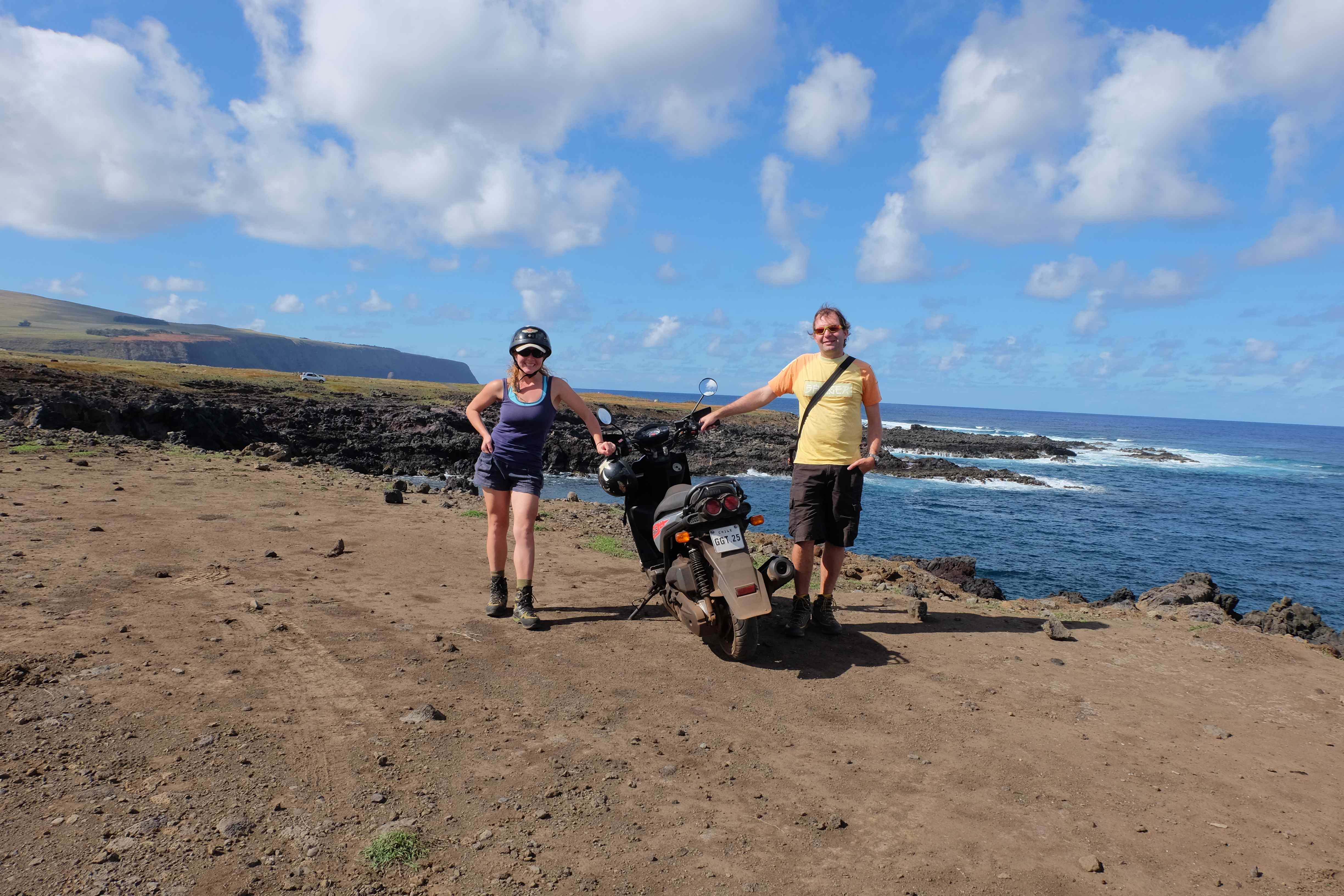 Obwohl wir bei Bob Marley und seinen Freunden zuhause (einfach ohne Bob Marley) landeten, waren wir hier trotzdem sehr aktiv: ich meinerseits setzte mich sehr viel mit Tauchen auseinander, liess mich in einigen Bereichen weiterzertifizieren und bestand sogar Prüfungen – und wir erkundeten die Insel. Wie macht man denn das an einem solch teuren Ort? Selbstverständlich auf abenteuerliche Art und Weise mit dem Transportmittel, welches am günstigsten zu mieten ist: ein Scooter! 🙂 Natürlich erhielten wir die dazugehörigen Helme, welche sehr nützlich waren, vor allem als Rafi zu viel Freude auf den hügeligen und nichtasphaltierten Wegpartien hatte und sein Training für die Osterinsel-Scootermeisterschaft absolvieren wollte – und dabei vergass, dass er hinten jemanden hatte, dessen Hintern nach einem ganzen Tag die Form des Sattels angenommen hatte. 🙂