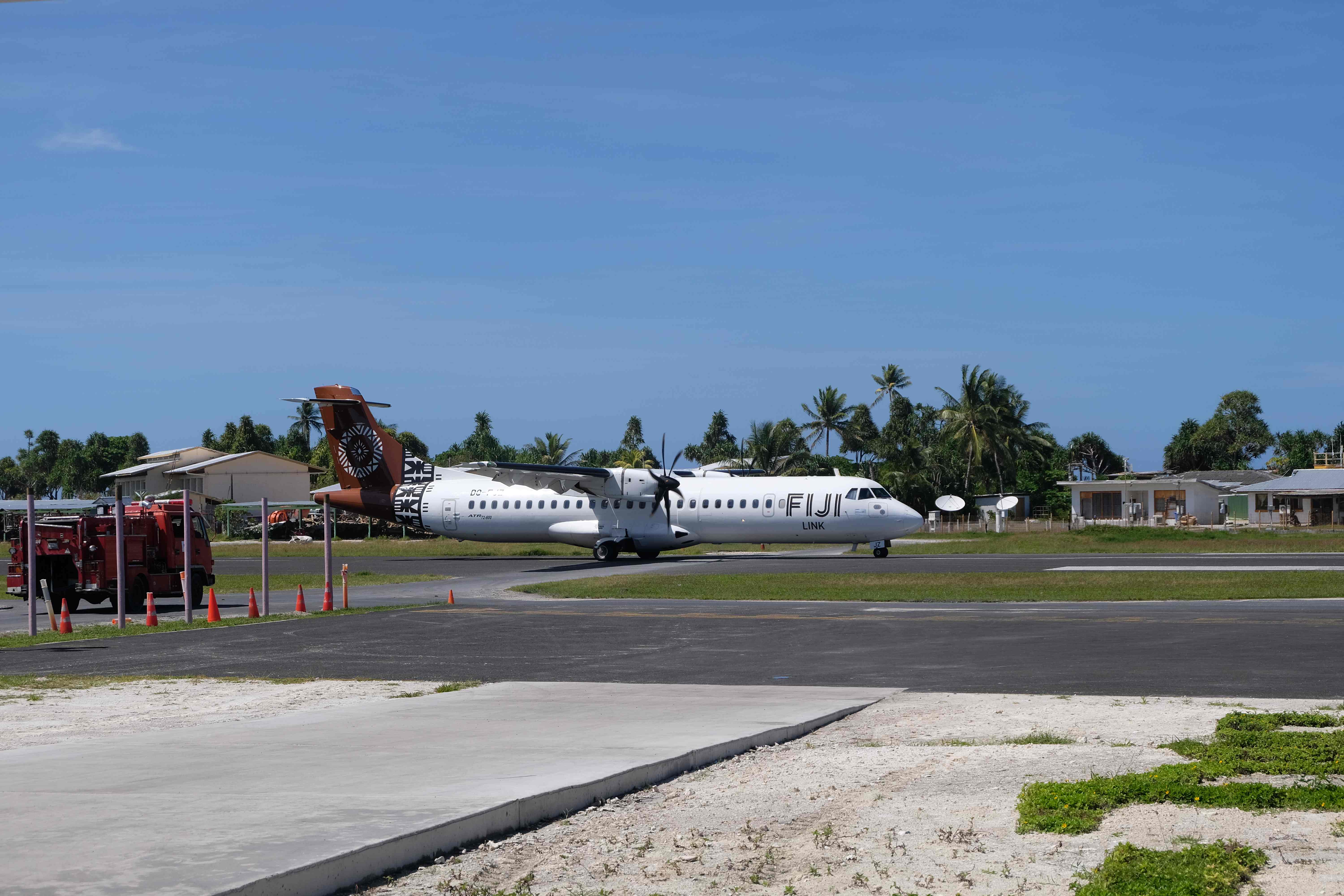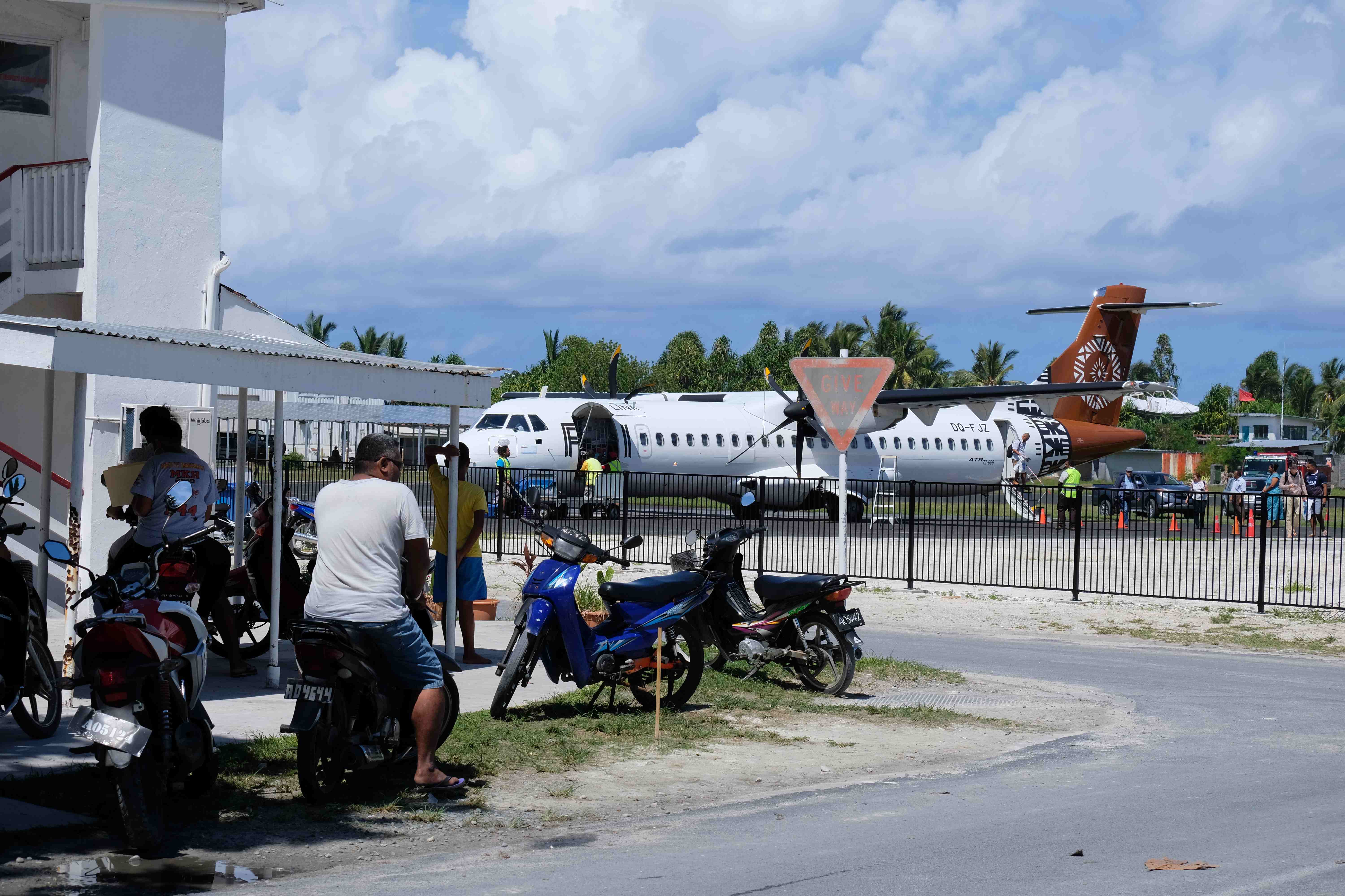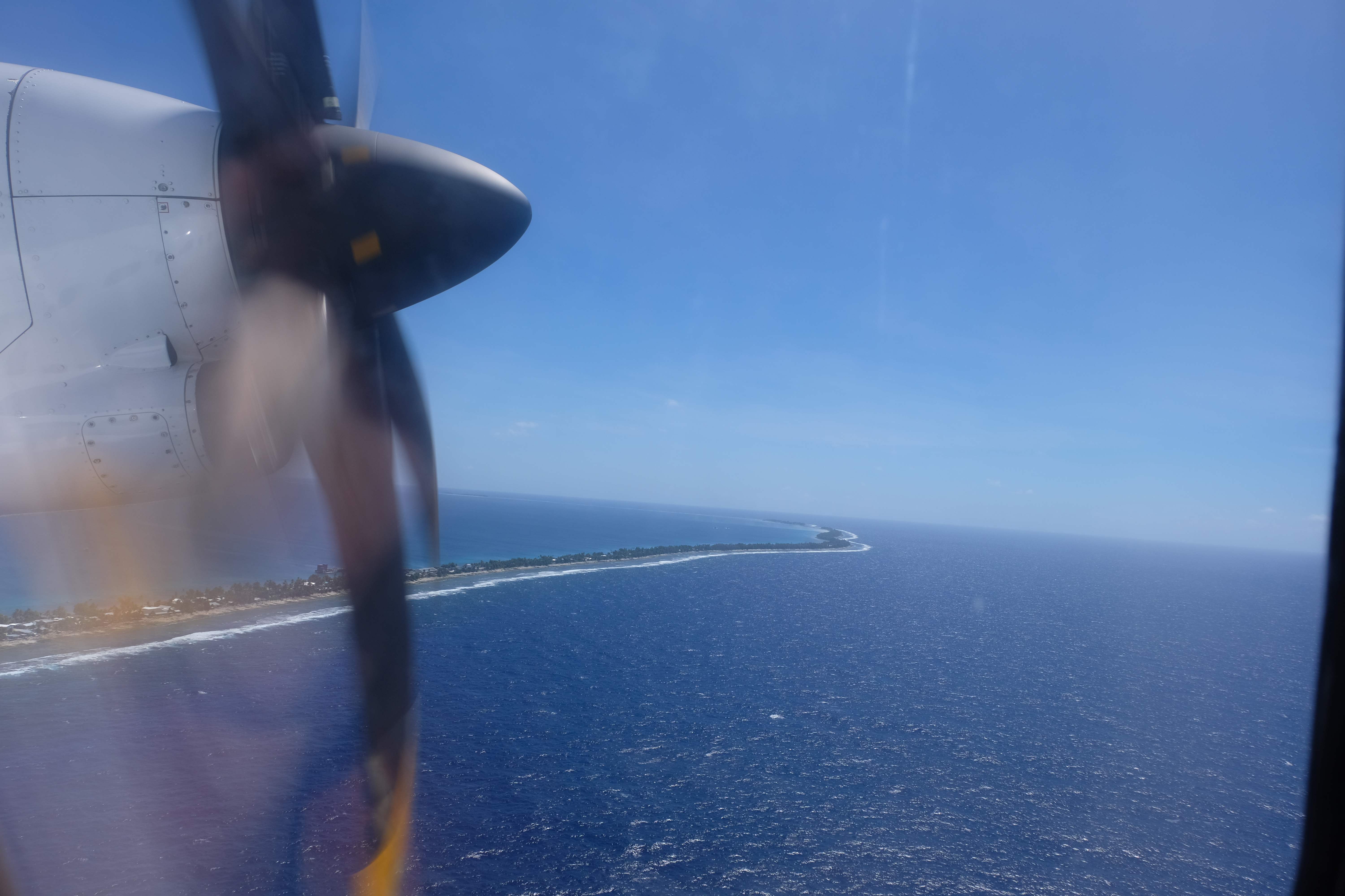 Insa inapoi la anuntul nostru: Tuvalu, sosim! Si inca ce sosire! Credeti-ne, aterizarea aici este o experienta aparte: pilotul anunta clar si raspicat ca toata lumea trebuie sa se pregateasca de aterizare, in urechi se resimte un pocnit usor (in afara de cei care ca si mine sunt de cateva zile locuitori de pestera si au urechea dreapta infundata!), te uiti pe fereastra si realizezi ca avionul pierde altitudine si ca este pe punctul de a ateriza – si iata-te ca deja te pregatesti sa scormonesti dupa vesta de salvare caci, da-o naibii de treaba, o sa aterizam in apa fratilor! Sau totusi nu? Insula principala a atolului principal (unde se afla de altfel aeroportul) este intr-atat de ingusta, incat nu o vezi din avion cand pilotul se indreapta spre ea… si anume atat de ingusta: