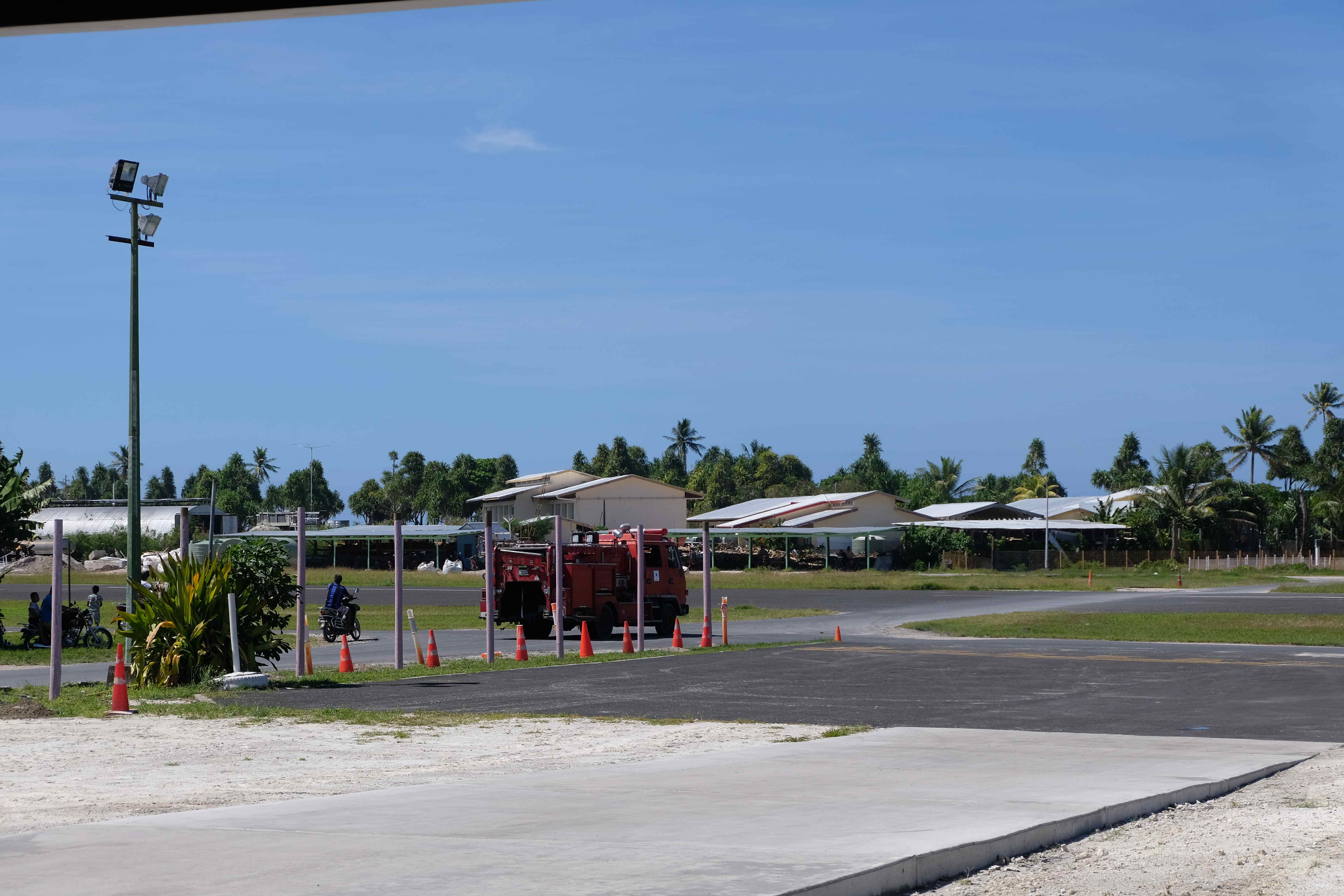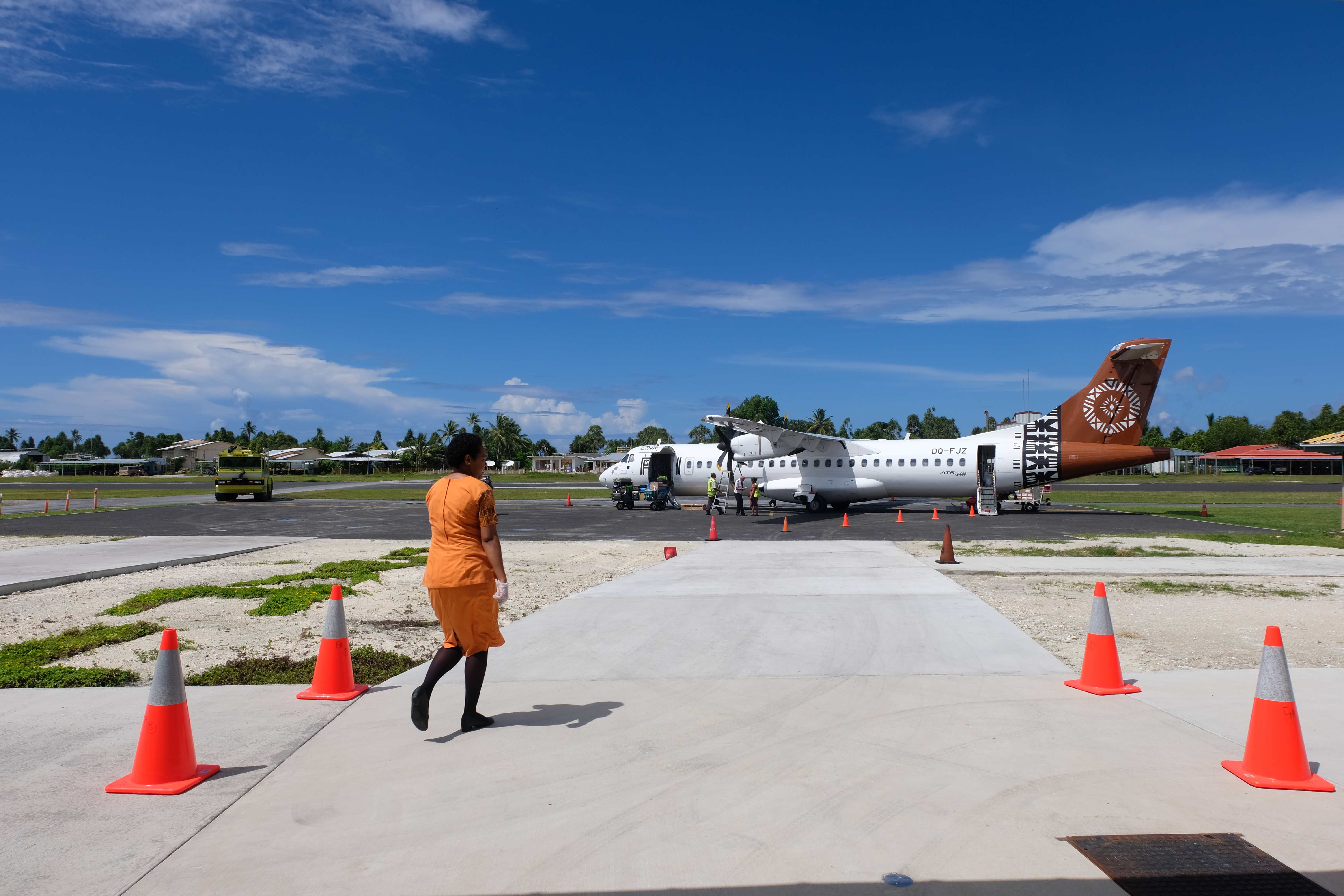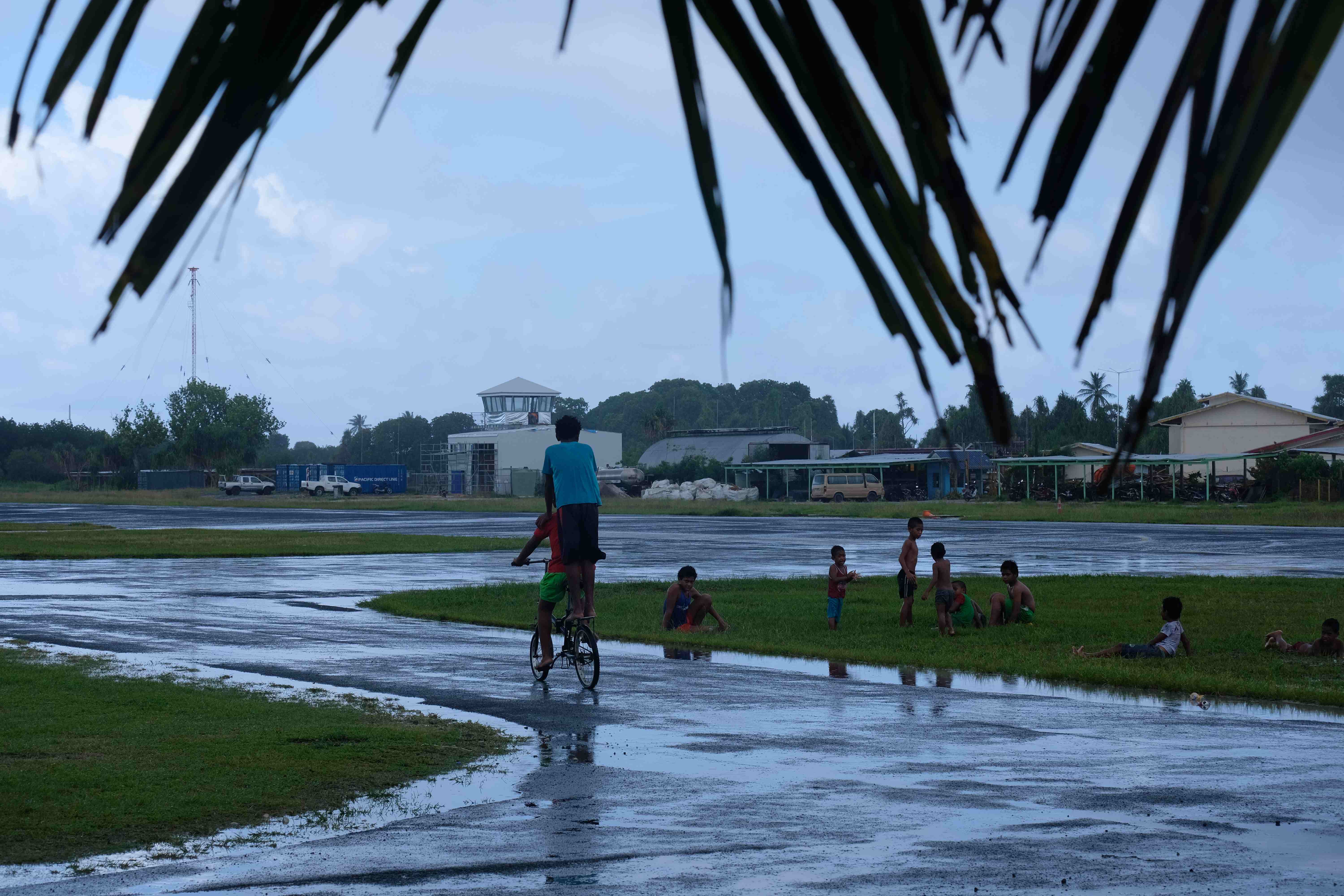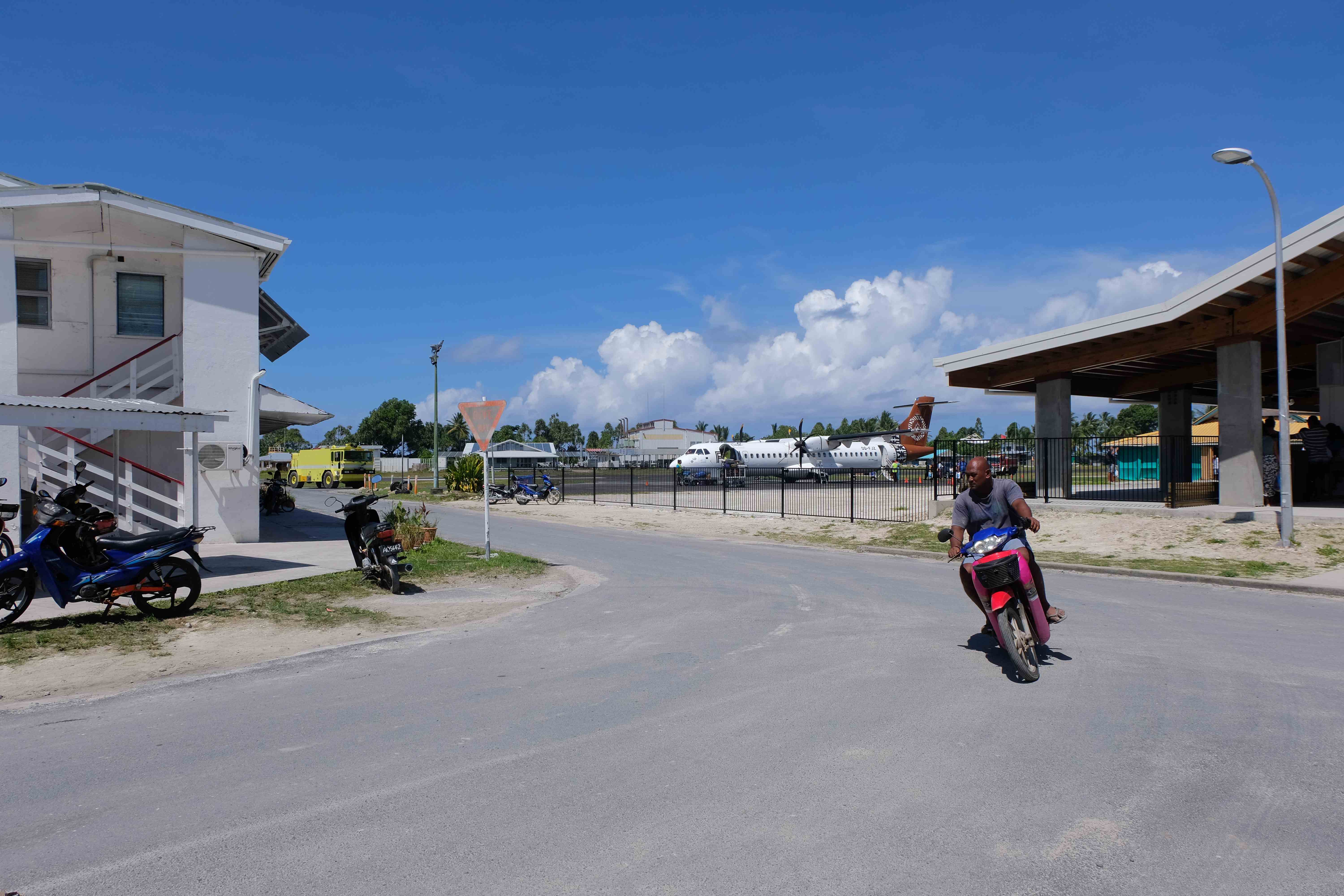 Insa inapoi la anuntul nostru: Tuvalu, sosim! Si inca ce sosire! Credeti-ne, aterizarea aici este o experienta aparte: pilotul anunta clar si raspicat ca toata lumea trebuie sa se pregateasca de aterizare, in urechi se resimte un pocnit usor (in afara de cei care ca si mine sunt de cateva zile locuitori de pestera si au urechea dreapta infundata!), te uiti pe fereastra si realizezi ca avionul pierde altitudine si ca este pe punctul de a ateriza – si iata-te ca deja te pregatesti sa scormonesti dupa vesta de salvare caci, da-o naibii de treaba, o sa aterizam in apa fratilor! Sau totusi nu? Insula principala a atolului principal (unde se afla de altfel aeroportul) este intr-atat de ingusta, incat nu o vezi din avion cand pilotul se indreapta spre ea… si anume atat de ingusta:
