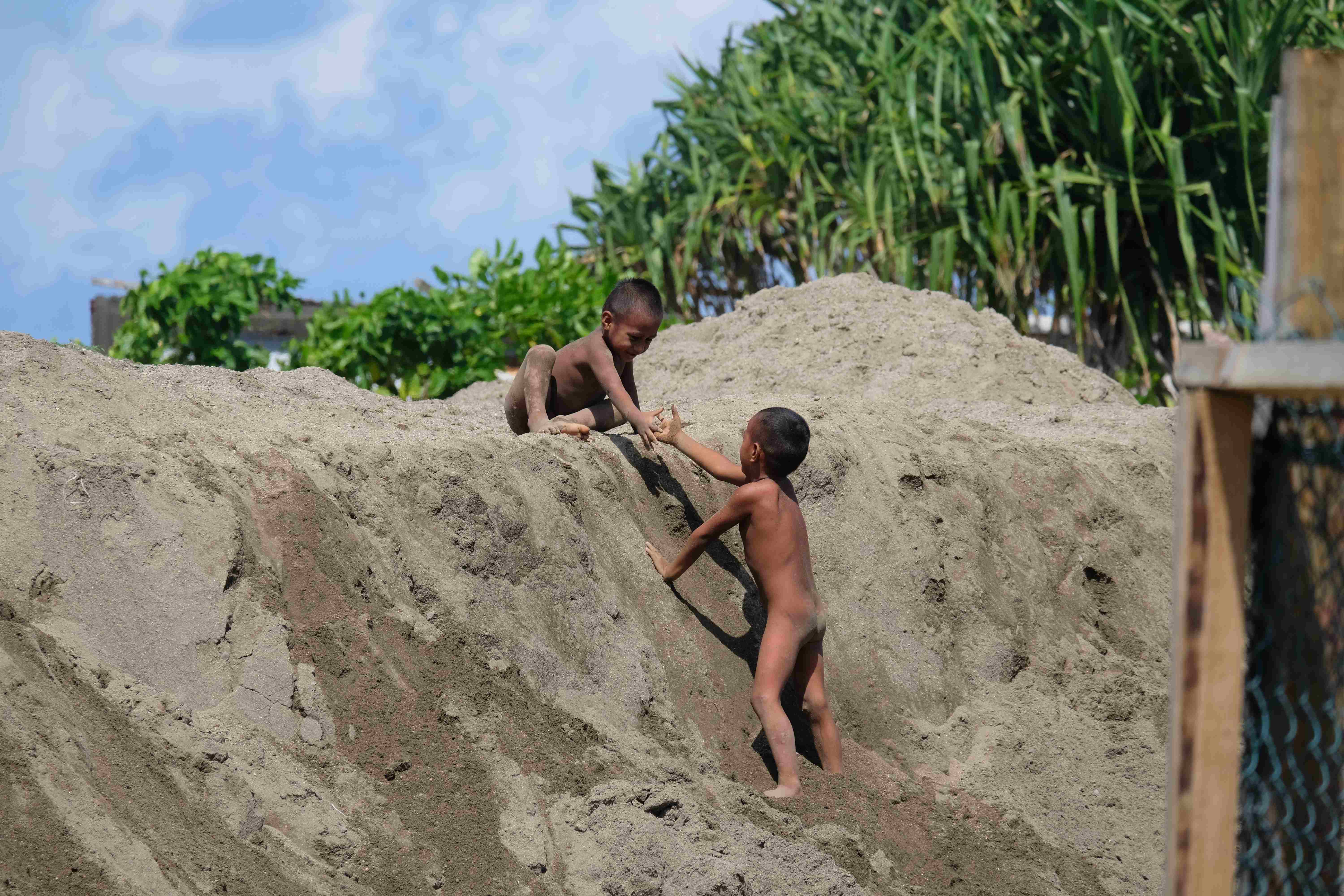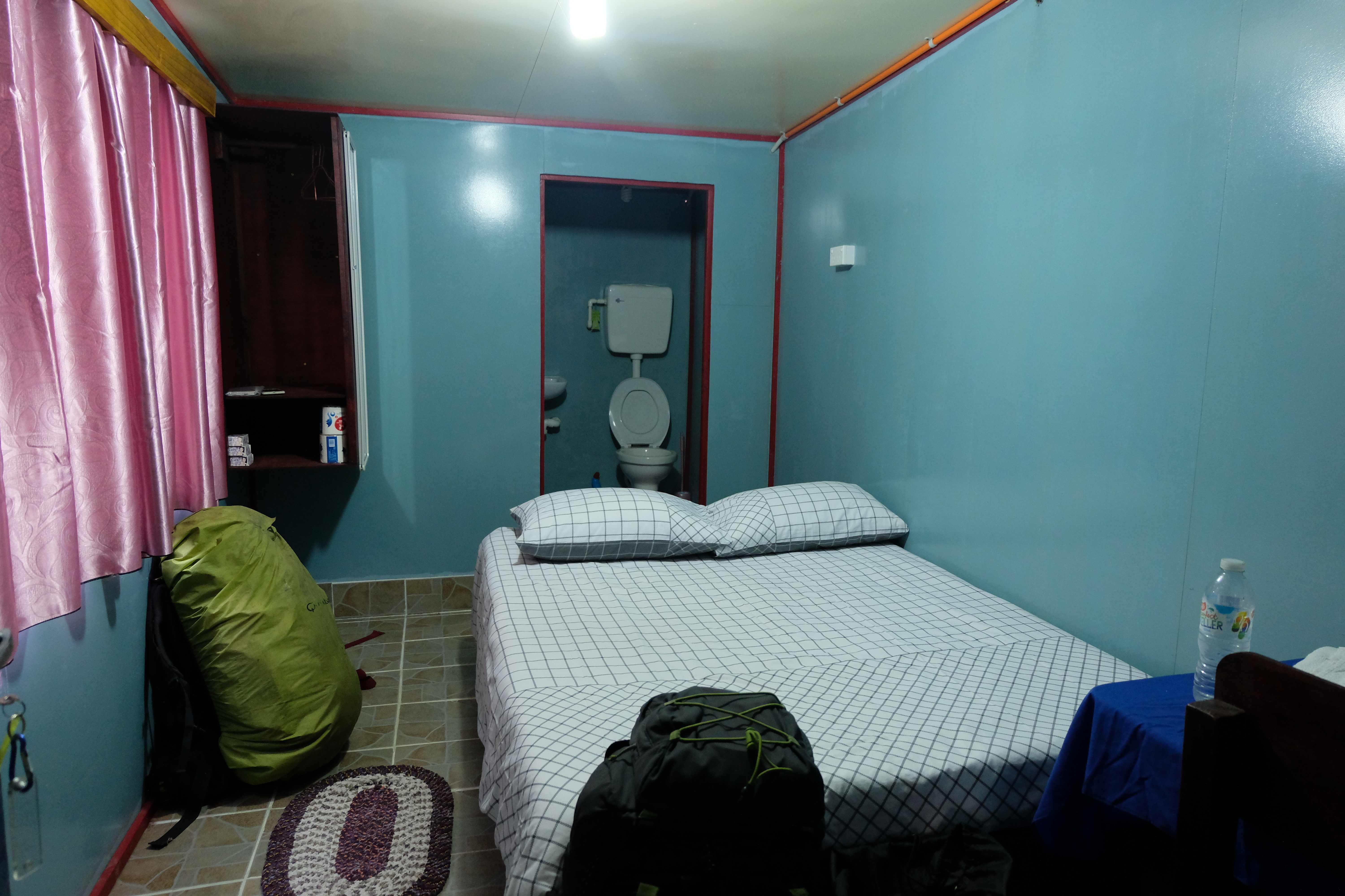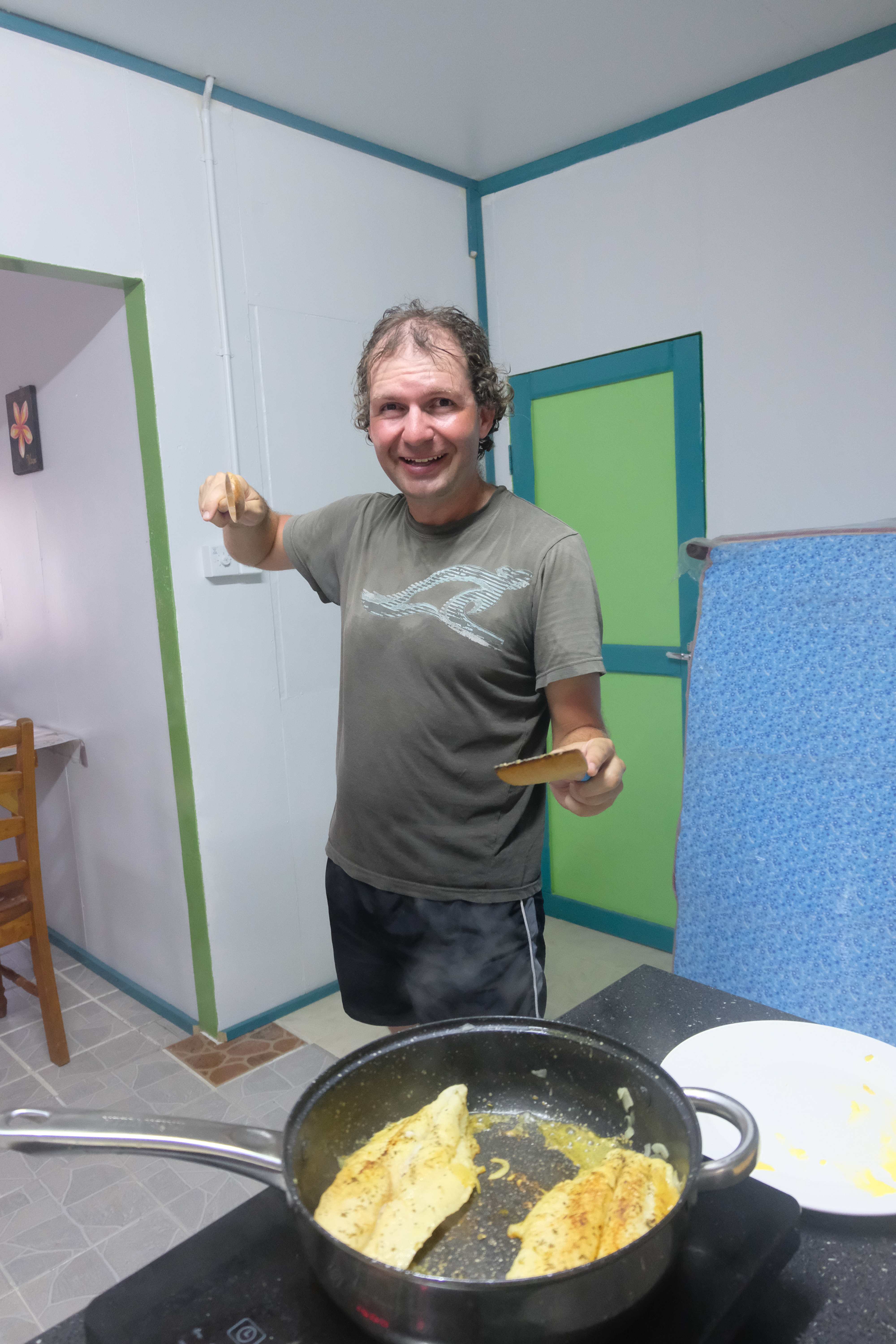 Da wir hier keinen Gastgeber finden konnten (welch Wunder!) kamen wir wortwörtlich nichts wissend an und mussten vor Ort nach einer Bleibe suchen. Nach dem netten Zimmerangebot des einzigen Hotels, welches wir aus homo rucksackus traegerus Finanzgründen ablehnen mussten, liessen wir unser Gepäck dort um uns auf der Suche nach Billigerem zu machen. Während unserer Erkundungsrunde von Gasthaustür zu Gasthaustür durften wir nicht nur ständig im eigenen springbrunnenartig hinunterfliessenden Schweiss duschen – ja, es ist nämlich ein bisschen heiss hier! – sondern uns auch mit den Einheimischen – vor allem mit den entlang der Strasse spielenden Kindern, welche uns bereits beim Namen nannten – anfreunden. Unsere Geduld und Perseverenz wurden schliesslich belohnt: wir fanden nicht nur den Geheimtipp der Insel, sondern auch den günstigsten und für uns luxuriösesten Ort! Während wir die gleiche (ziemlich lange) Strecke nun mit den Gepäcksstücken zurücklegen mussten, lächelten uns die Einheimischen ständig an: ob sie unsere Anwesenheit dermassen sympathisch fanden oder eher unseren nassen Schleppesel-Anblick sie belustigte, das sei dahingestellt! 🙂