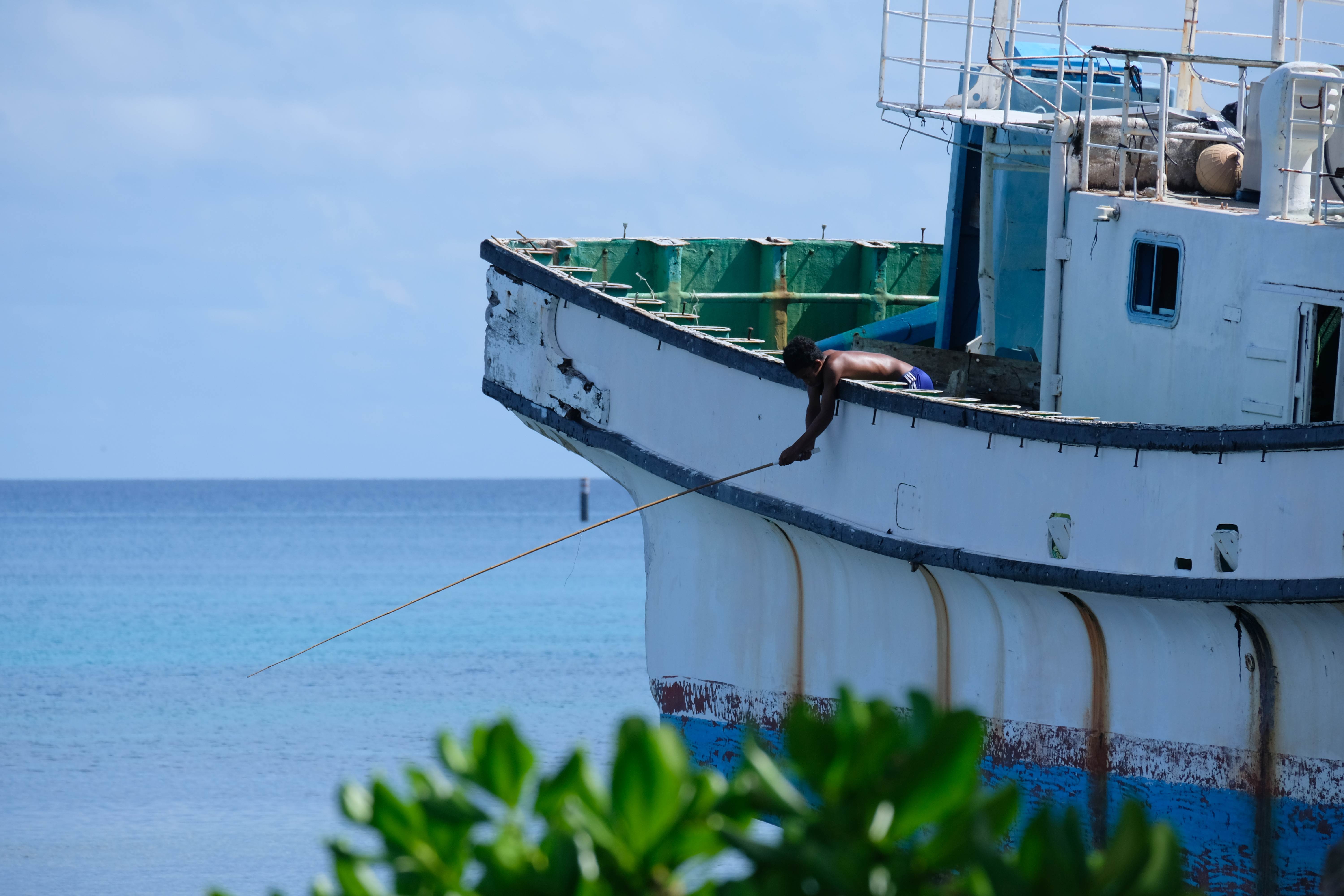 Dem Beispiel der Einheimischen folgend beabsichtigten wir ebenfalls das Meiste aus den zwei letzten Tagen herauszuholen, also ging es noch einmal aufs Boot – ab ins Wasser zum Tauchen und in eine Marine-Schule auf einer anderen Insel. Wenn man für den Besuch dieser eine telefonische Erlaubnis des Kapitäns höchstpersönlich einholen musste und wenn einem während des Besuches nicht nur tonnenweise frisches Kokosnusswasser angeboten, sondern auch die Fliegen vom diensthabenden Offizier persönlich mit einem Ast weggefächert wurden, dann wusste man, man befand sich in Tuvalu, in einer Welt, welche nicht unbedingt den Koordinaten der uns Bekannten entspricht. Spätestens wenn man nach dem letzten Tauchgang mit einem Menschen, der seinen Lebensunterhalt mehrere Jahre lang sicherte, indem er in unglaublichen Tiefen von über 150 m sein Leben riskierte um Seegurken einzusammeln, behaupten konnte, dass wenn Schneewittchen oder Dornröschen unter Wasser gelebt hätten, hier ihr magischer Wald gewesen wäre, wusste man ganz genau, dass man glücklich und privilegiert ist. Und wenn man – wie Rafi – noch vom einheimischen Bootsfahrer-Assistenten täglich danach mit einer persönlichen Lieferung von frischen Kokosnüssen beschenkt wurde, kann man noch laut dazu schreien: Das ist ja cool! 🙂