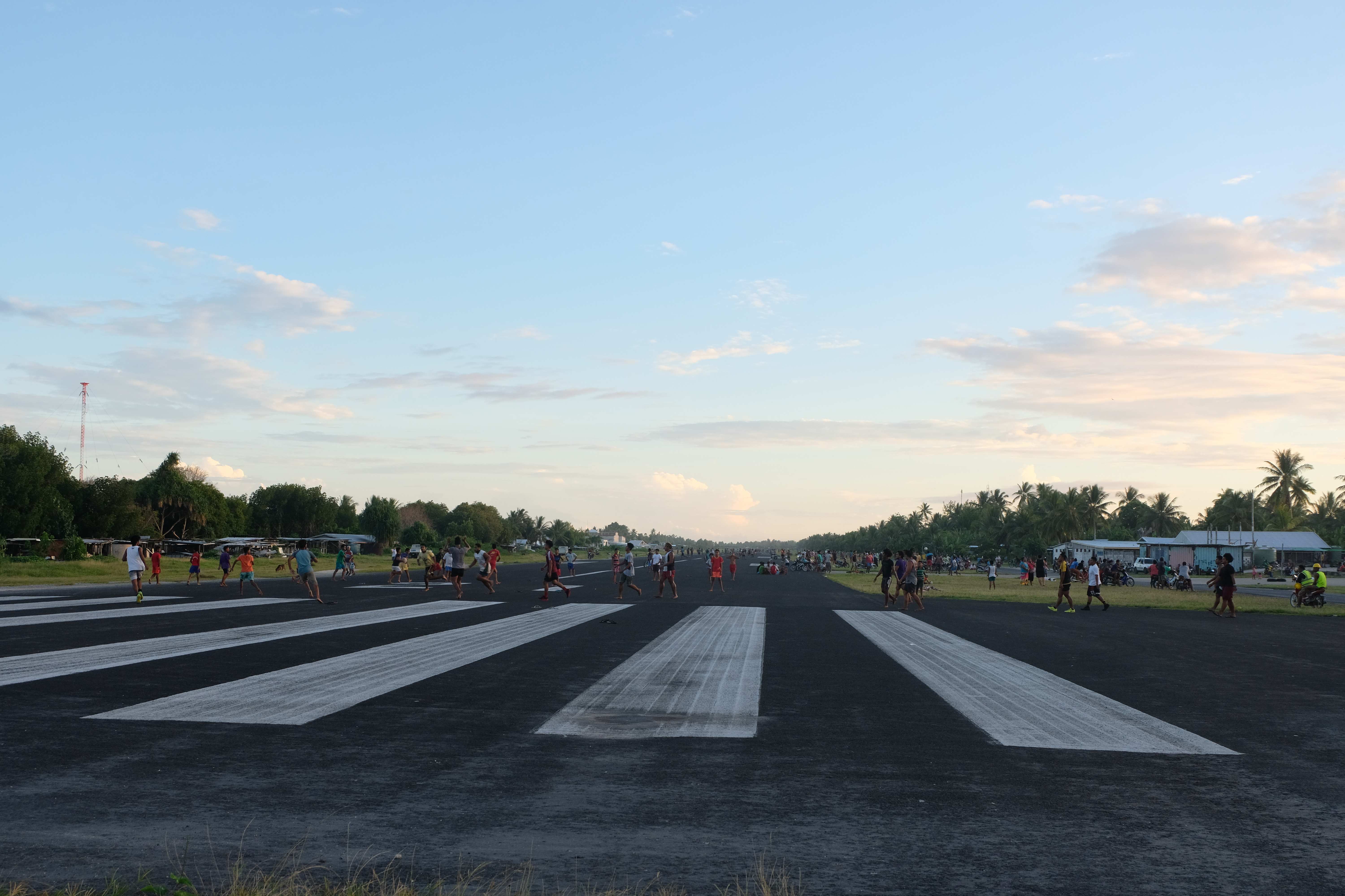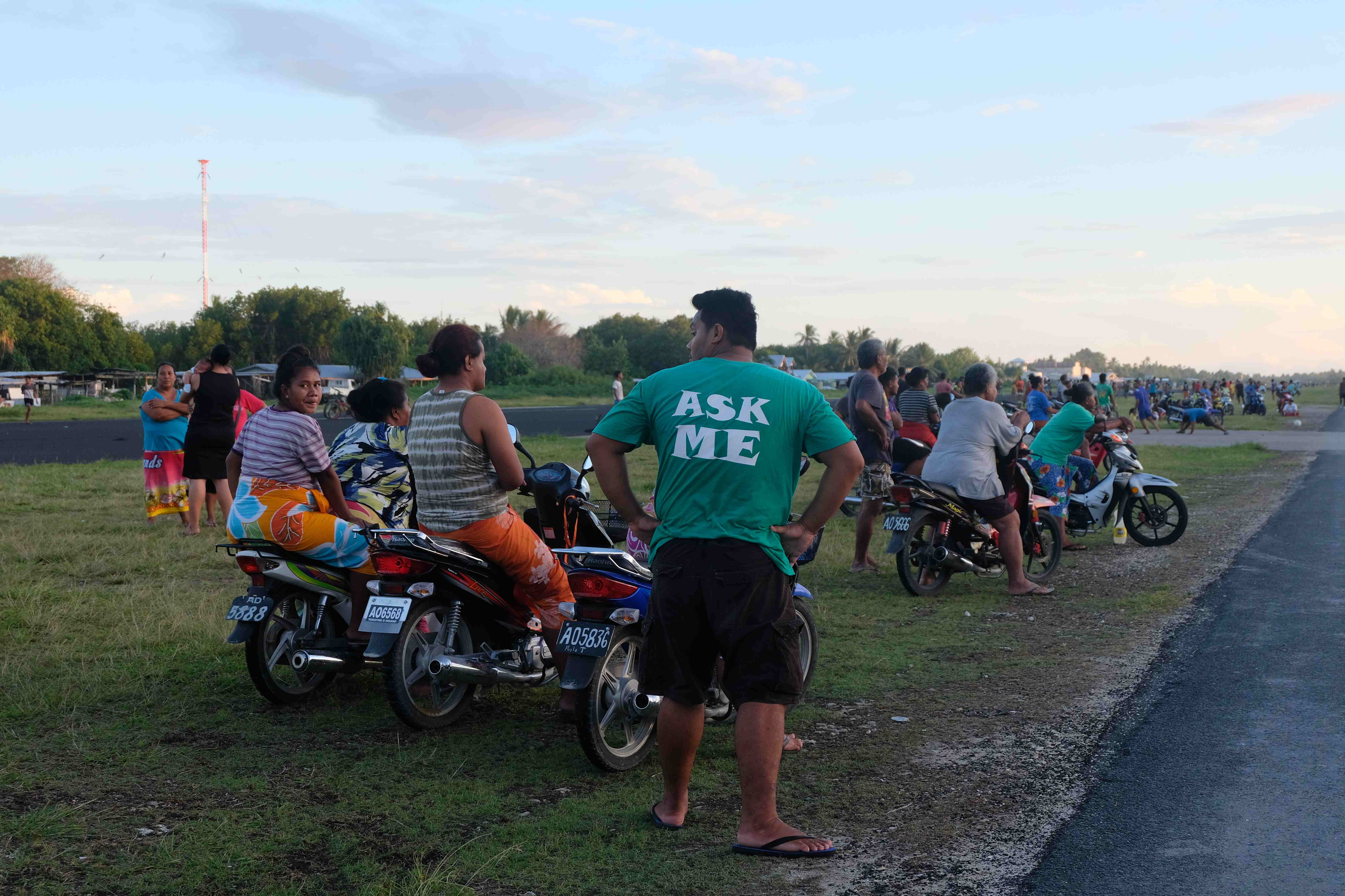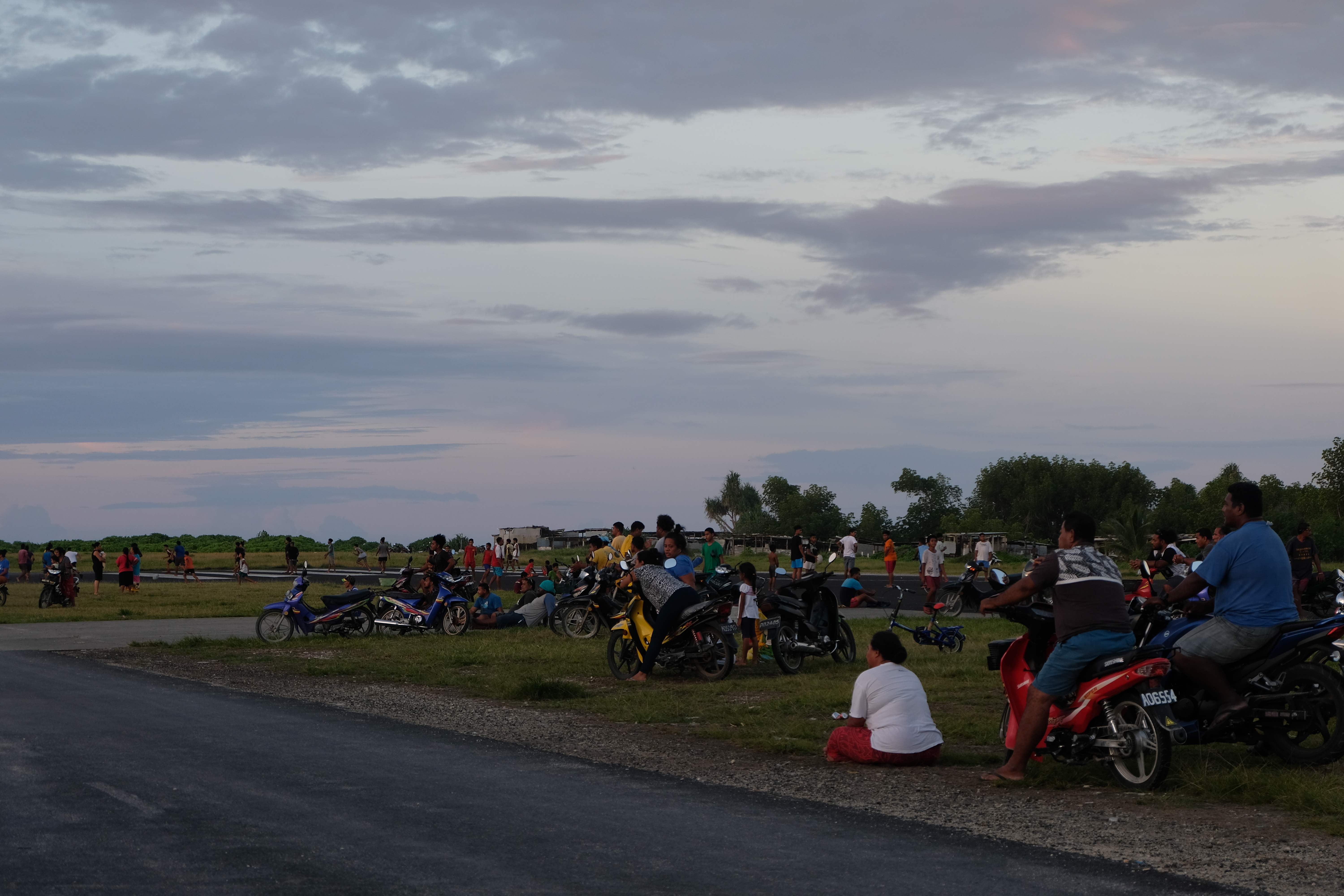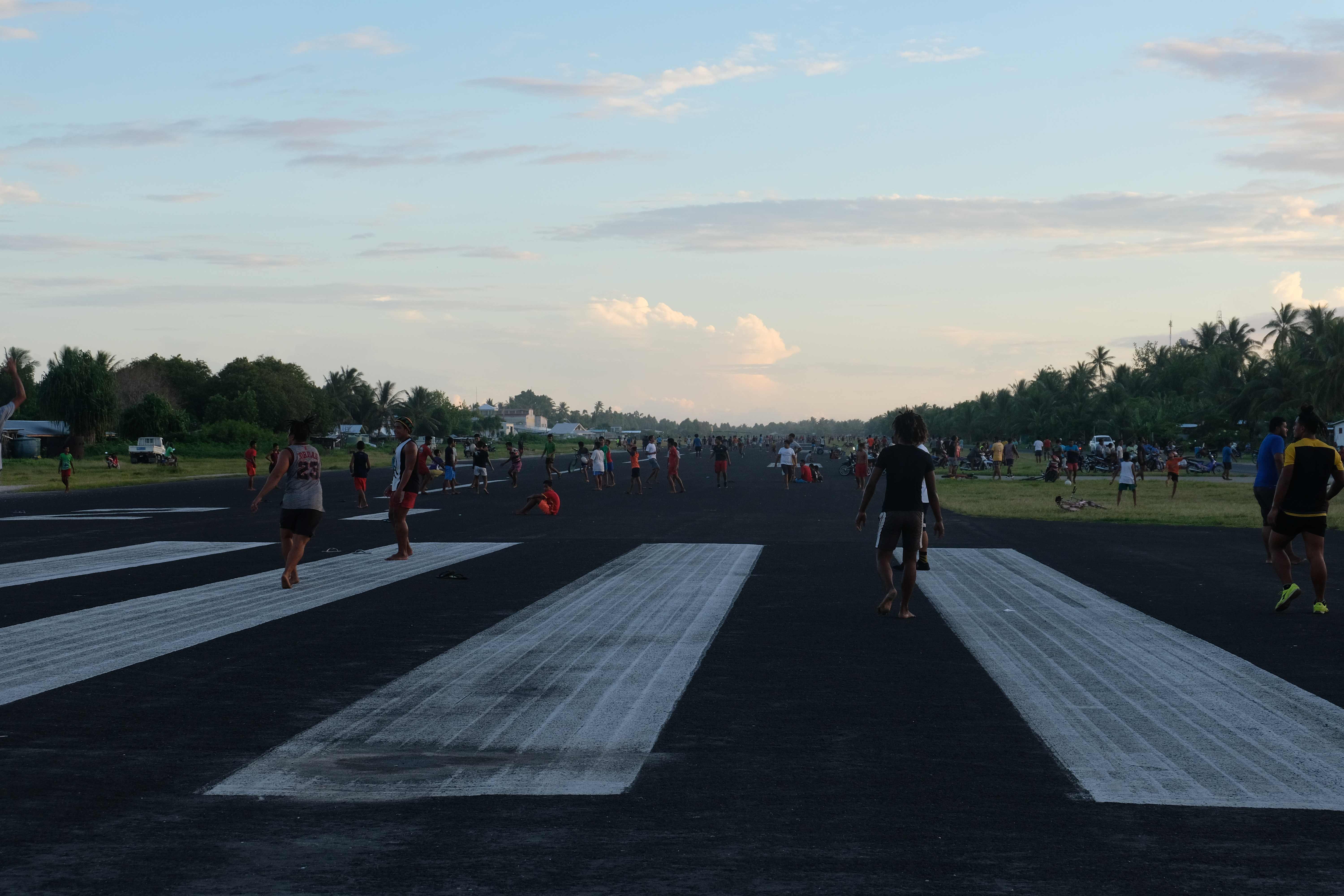 Der Versuch abzukühlen führte uns am Tag darauf ins Zentrum und den Rafi eigentlich auf konkrete Suche nach seiner neuen Liebe (ich wurde mittlerweile zu seiner alten deklassiert! :-)), nämlich frischem Kokosnusswasser. Dass wir dabei von einem einheimischen Journalisten aufgehalten wurden, welche uns interviewte und dies sogar mit einem Foto belegen wollte wird erst dann lustig zu erzählen, wenn wir in der tuvaluischen Lokalzeitung (welche er versprach uns via Email zuzusenden) verewigt werden! 🙂 Aber zurück zu unserer Alltagsbeschäftigung, der Kokosnusswasserjagd. Man stelle sich einen gierigen Rafi vor, welcher um sich herum lediglich kokosnussbeladene Palmen erblickte und bei mehreren Verkaufsständen und Lokalen solange danach fragte, bis ihm die beste Antwort aller Zeiten geliefert wurde: „Kokosnüsse werden hier nicht verkauft, Sie müssen jemanden bitten schnell rauf zu klettern und ihnen welche zu holen.“ 🙂 Spätestens wenn einem dies gesagt wird, realisiert man, wo man sich befindet! Wo sich jedoch die anderen – und damit ist die Mehrheit der sonst trotz der Hitze täglich fleissig arbeitenden Inselbevölkerung – nach 16 Uhr befanden, dies wussten wir nicht, bis wir der kühlen Brise und dem angenehmen Wind folgten und entlang der Landepiste/Autobahn/grösstem offenen Platz der Insel 90% der Bevölkerung antrafen. Während die jüngere Generation sich in zahlreichen Gruppen aufteilte und den Ballspielen widmete: Volleyball, Rugby, Fussball und weitere sportliche Betätigungen bildete die ältere Generation eher die – meistens auf den Motorrädern sitzende – Fankurve. Es war ein einmaliger Anblick und eine unglaubliche Entdeckung: man bog nur von der Strasse ab und man fand das ganze Dorf am Leben! Während es in den Metropolen der Welt an Zeit, Lust oder schlichtweg Lebensfreude fehlt sich zu versammeln, schaffte es die Bevölkerung einer knapp 12 km langen und an ihrer breitesten Stelle vermutlich höchstens 400 m breiten Insel das Leben viel stärker und krasser zu zelebrieren als manch andere hochentwickelte Gesellschaften! Wow ist vermutlich der beste Ausdruck dafür!