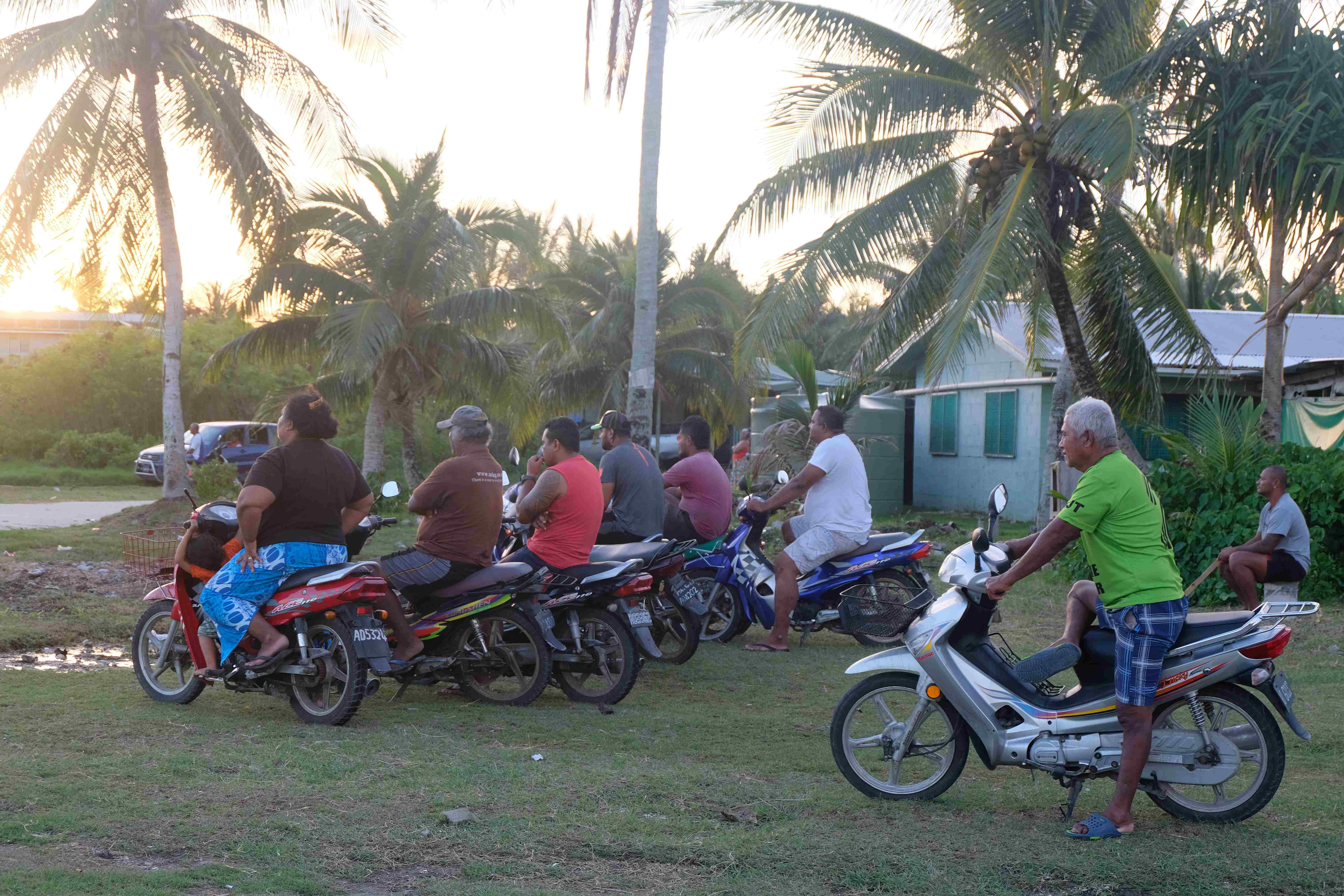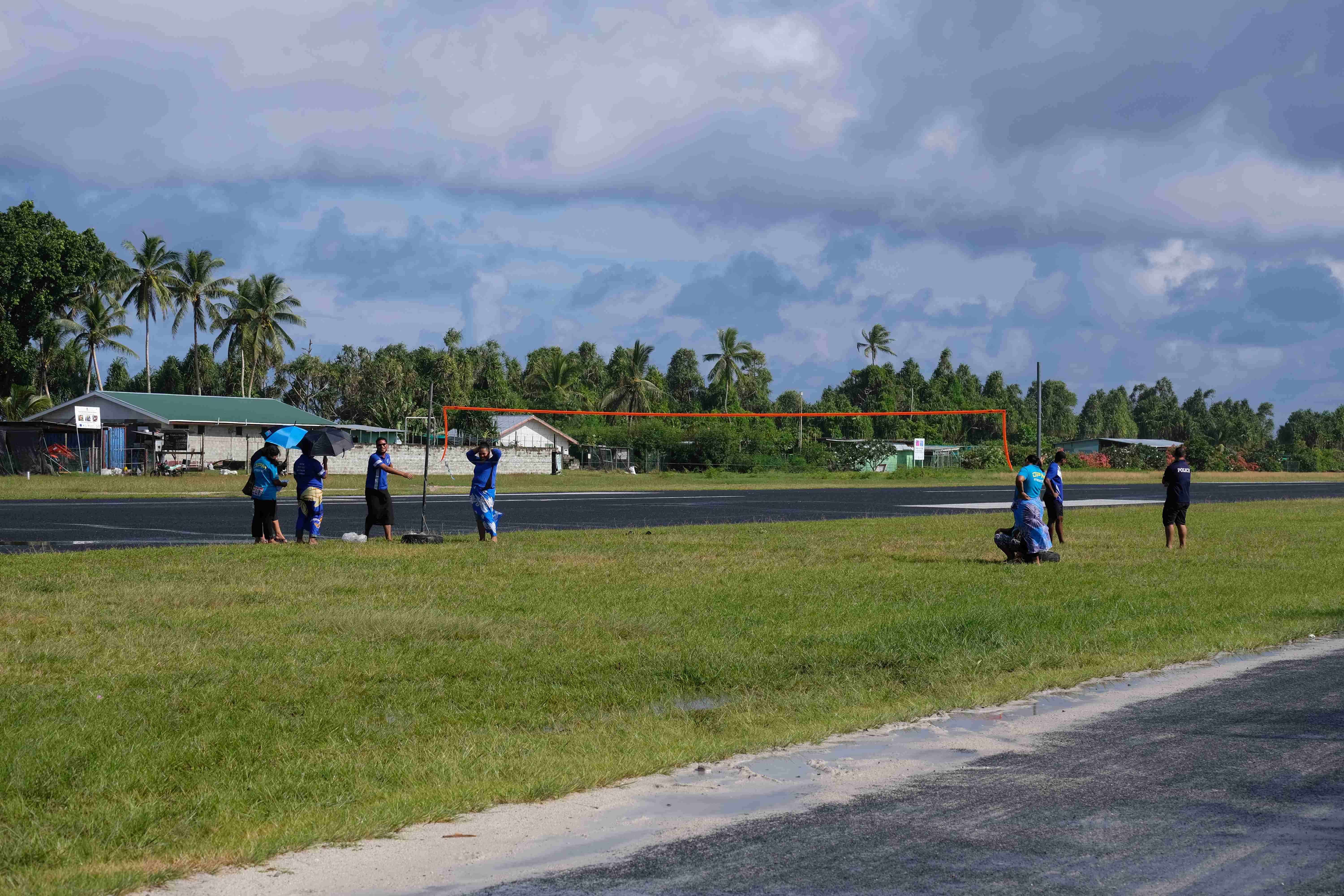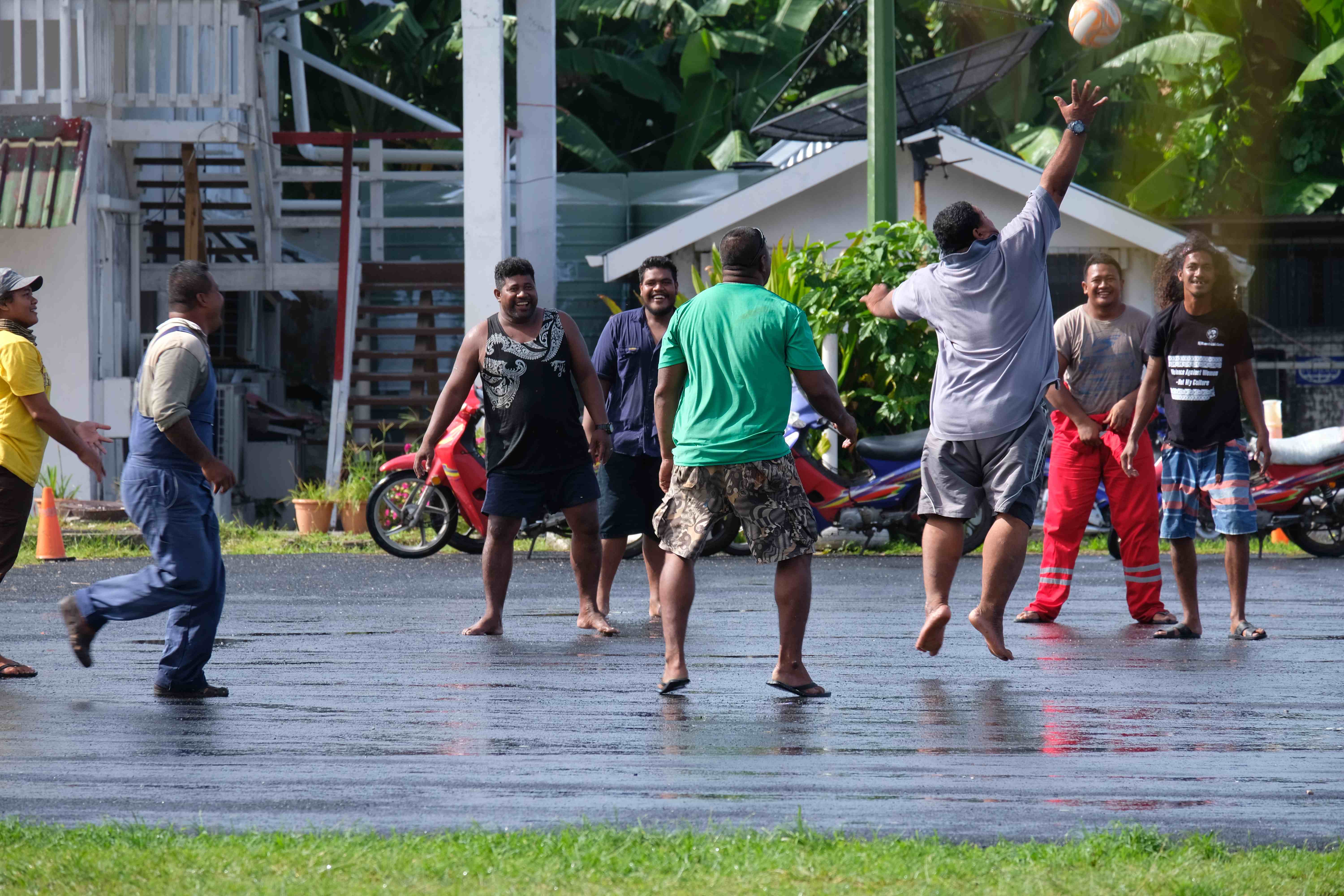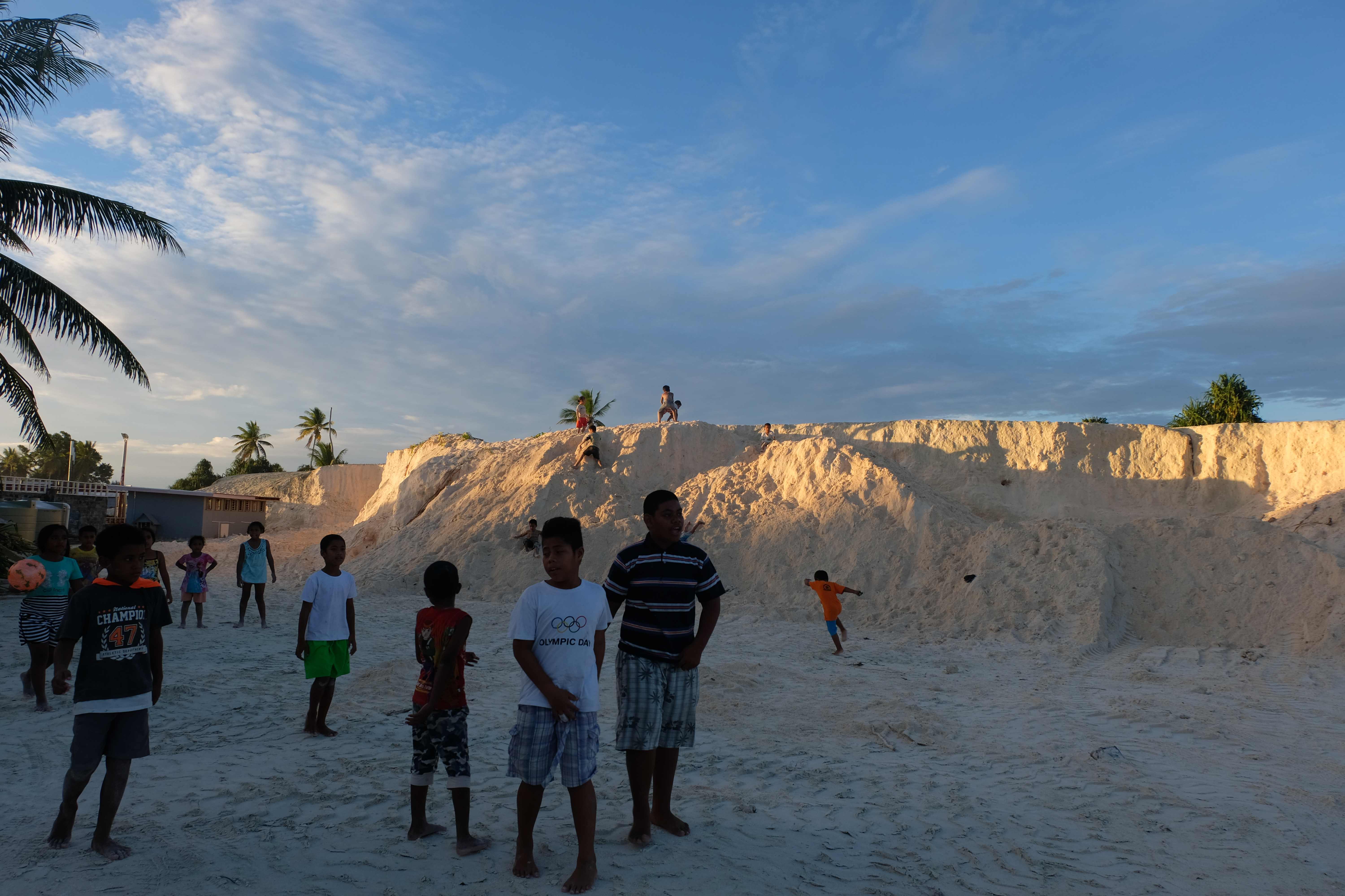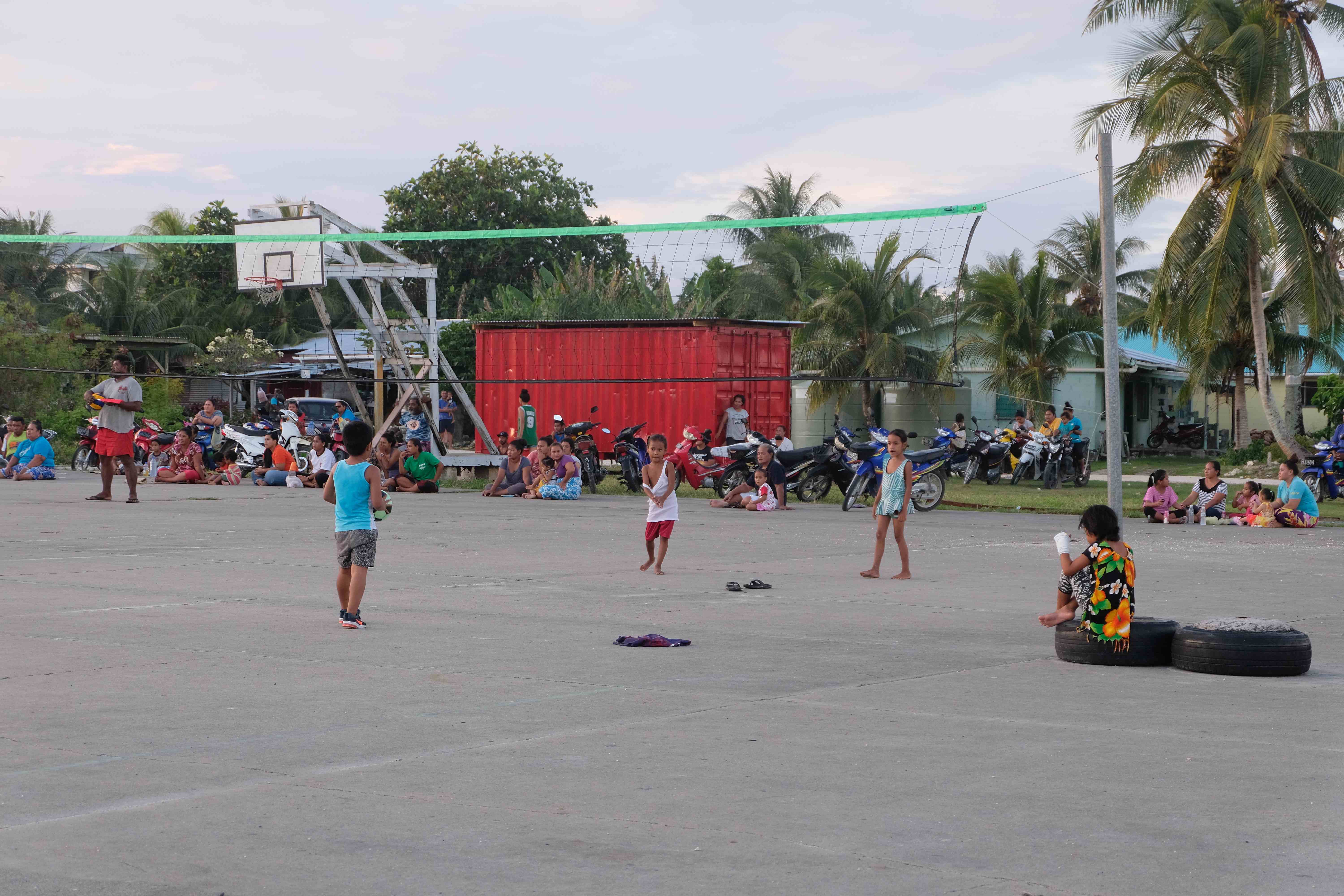 Der Versuch abzukühlen führte uns am Tag darauf ins Zentrum und den Rafi eigentlich auf konkrete Suche nach seiner neuen Liebe (ich wurde mittlerweile zu seiner alten deklassiert! :-)), nämlich frischem Kokosnusswasser. Dass wir dabei von einem einheimischen Journalisten aufgehalten wurden, welche uns interviewte und dies sogar mit einem Foto belegen wollte wird erst dann lustig zu erzählen, wenn wir in der tuvaluischen Lokalzeitung (welche er versprach uns via Email zuzusenden) verewigt werden! 🙂 Aber zurück zu unserer Alltagsbeschäftigung, der Kokosnusswasserjagd. Man stelle sich einen gierigen Rafi vor, welcher um sich herum lediglich kokosnussbeladene Palmen erblickte und bei mehreren Verkaufsständen und Lokalen solange danach fragte, bis ihm die beste Antwort aller Zeiten geliefert wurde: „Kokosnüsse werden hier nicht verkauft, Sie müssen jemanden bitten schnell rauf zu klettern und ihnen welche zu holen.“ 🙂 Spätestens wenn einem dies gesagt wird, realisiert man, wo man sich befindet! Wo sich jedoch die anderen – und damit ist die Mehrheit der sonst trotz der Hitze täglich fleissig arbeitenden Inselbevölkerung – nach 16 Uhr befanden, dies wussten wir nicht, bis wir der kühlen Brise und dem angenehmen Wind folgten und entlang der Landepiste/Autobahn/grösstem offenen Platz der Insel 90% der Bevölkerung antrafen. Während die jüngere Generation sich in zahlreichen Gruppen aufteilte und den Ballspielen widmete: Volleyball, Rugby, Fussball und weitere sportliche Betätigungen bildete die ältere Generation eher die – meistens auf den Motorrädern sitzende – Fankurve. Es war ein einmaliger Anblick und eine unglaubliche Entdeckung: man bog nur von der Strasse ab und man fand das ganze Dorf am Leben! Während es in den Metropolen der Welt an Zeit, Lust oder schlichtweg Lebensfreude fehlt sich zu versammeln, schaffte es die Bevölkerung einer knapp 12 km langen und an ihrer breitesten Stelle vermutlich höchstens 400 m breiten Insel das Leben viel stärker und krasser zu zelebrieren als manch andere hochentwickelte Gesellschaften! Wow ist vermutlich der beste Ausdruck dafür!