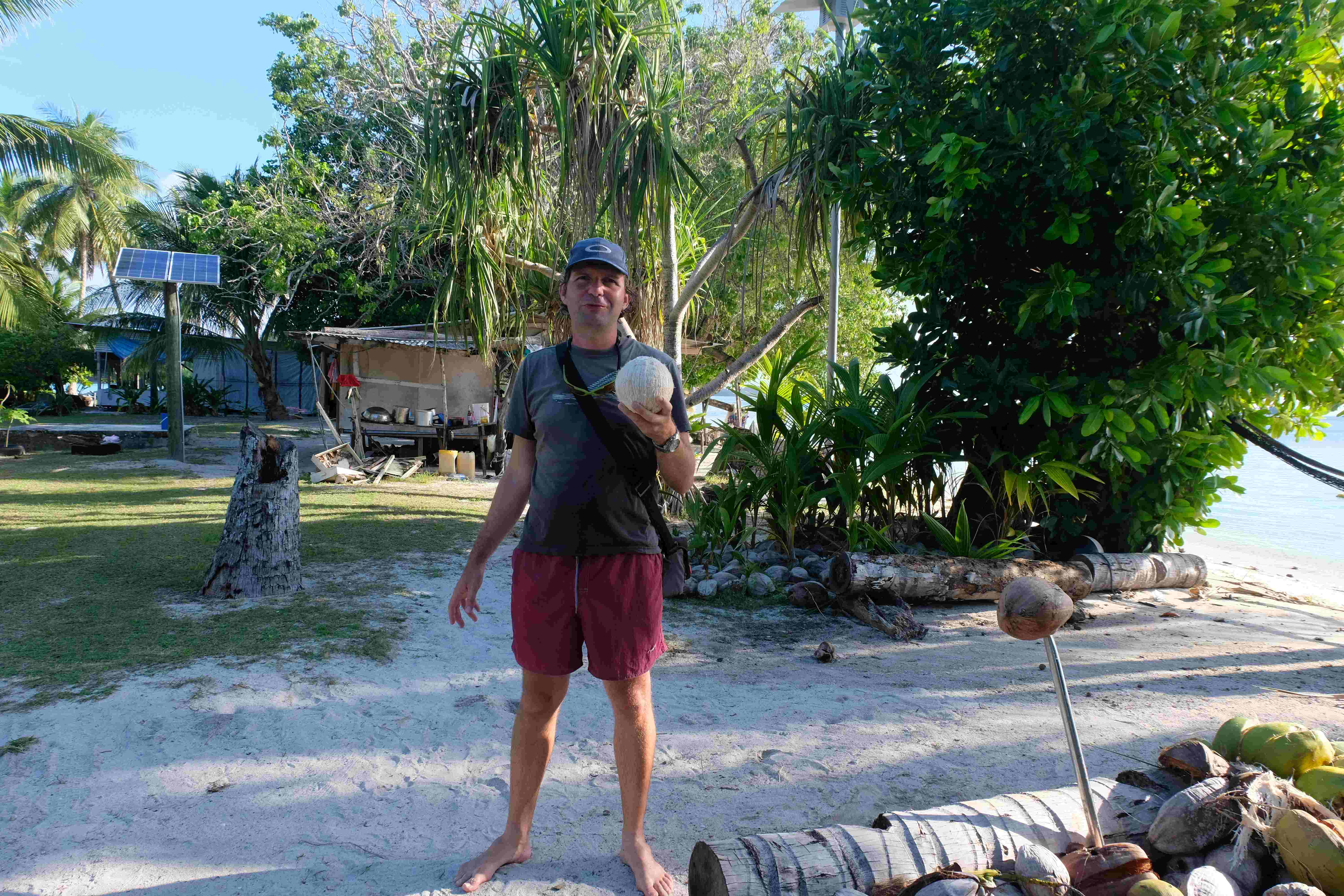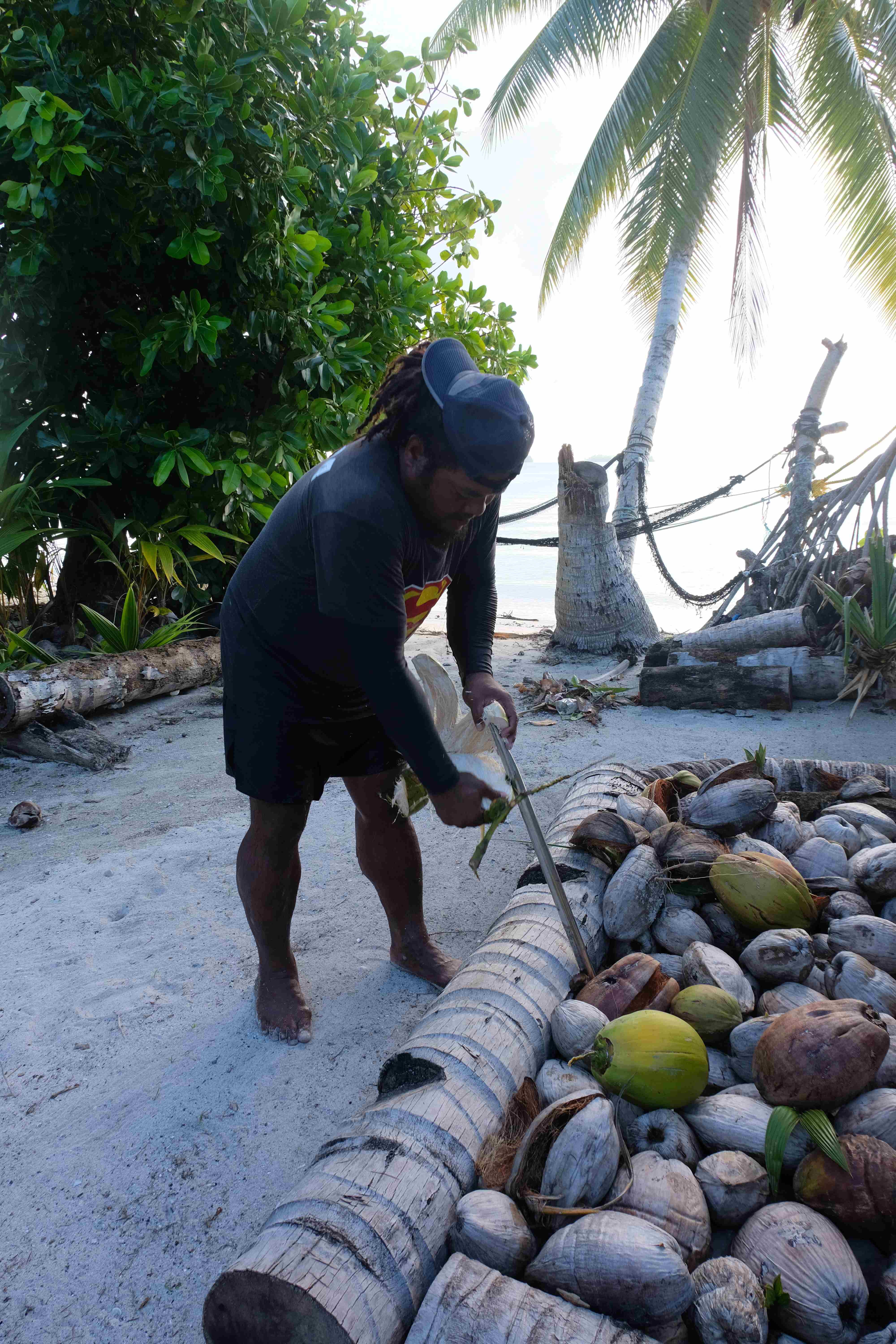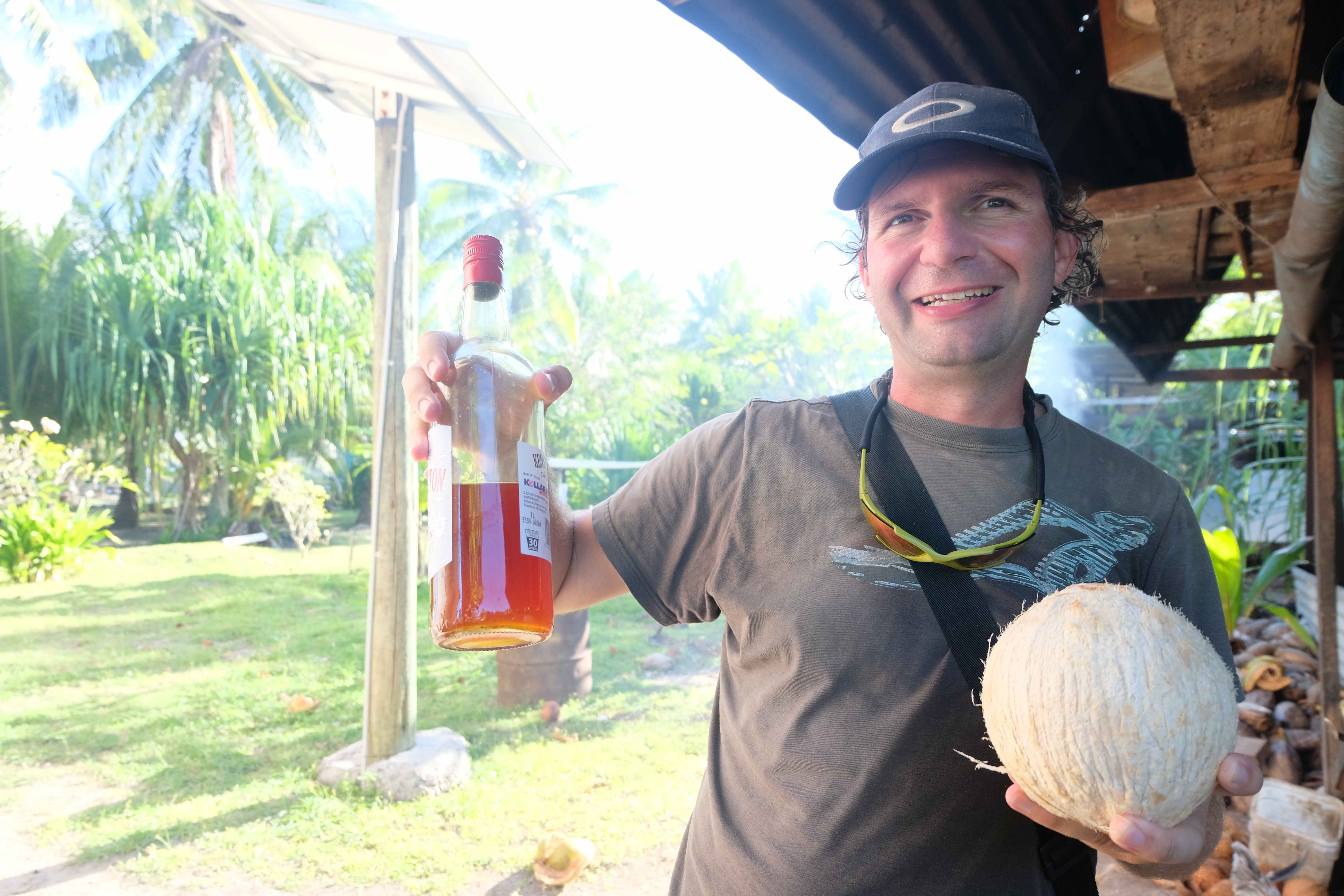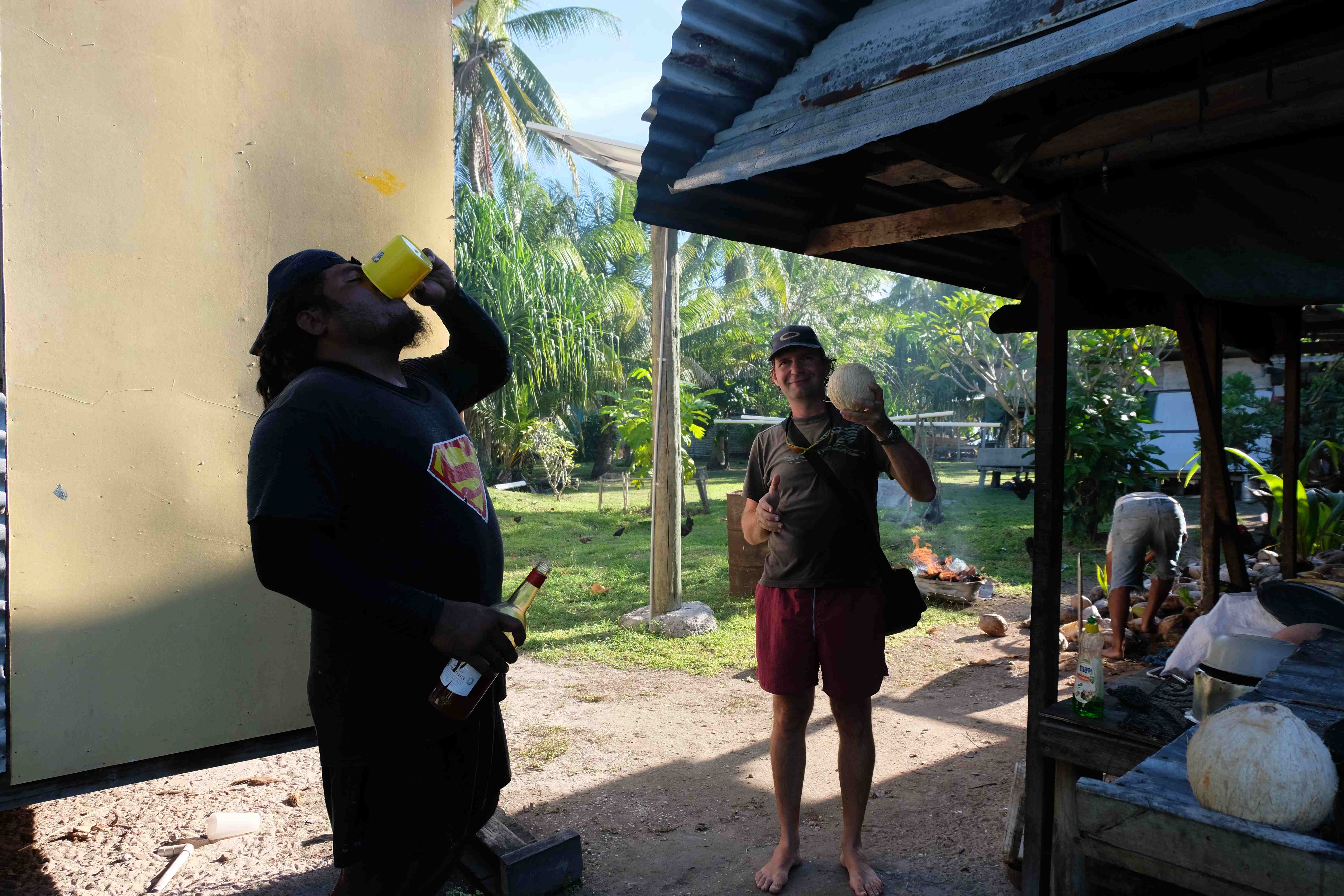 Nicht nur unglaubliche Taucherfahrungen und gratis Kokosnuss-Lieferdienst erhielten wir von unseren zwei Tour Leitern, sondern auch nützliche Ratschläge bezüglich ihrer Nachbarn: während wir uns vor den „Fijians“ und den „Kirbats“ in Acht nehmen sollten, da sie keine guten Menschen waren, sollten Staaten wie Samoa oder Tonga kein Problem darstellen. Ihre Beschützer-Rolle verwandelte sich langsam in ein Freundschaftsangebot, welches sie unbedingt mit einem Geschenk markieren wollten. Erinnert ihr euch an den Red Toddy, den gekochten Palmensaft? Nun ja, wir sollten eine Flasche davon von ihnen erhalten. Allerdings teilten sie uns sehr seriös mit, dass wir ein offizielles Papier bräuchten, um diese bis in die Schweiz zu transportieren – nämlich eine Bestätigung von dem Landwirtschaftsministeriums Tuvalus für allfällige Zollkontrollen, dass wir berechtigt sind, dies mitzuführen. 🙂