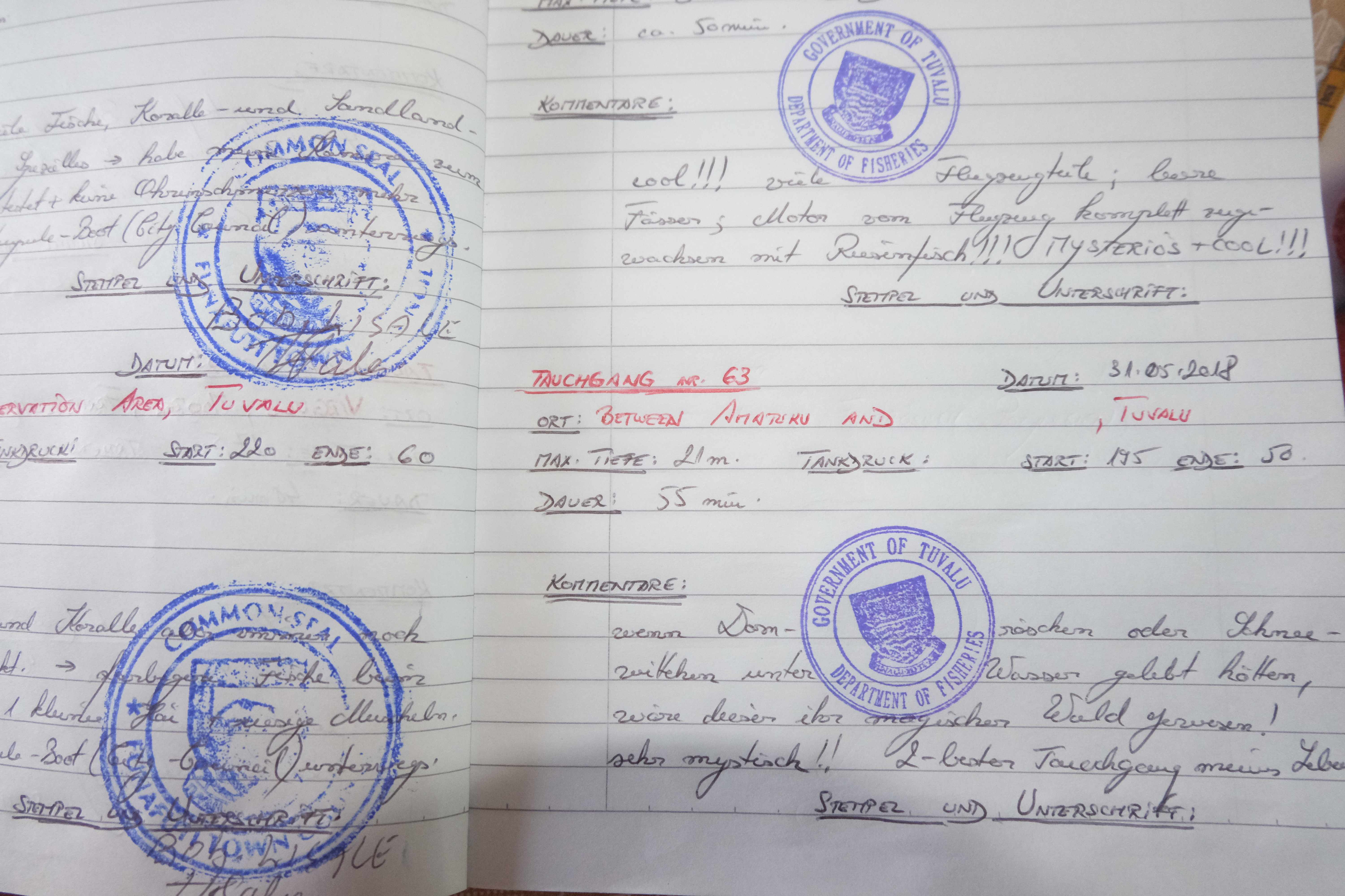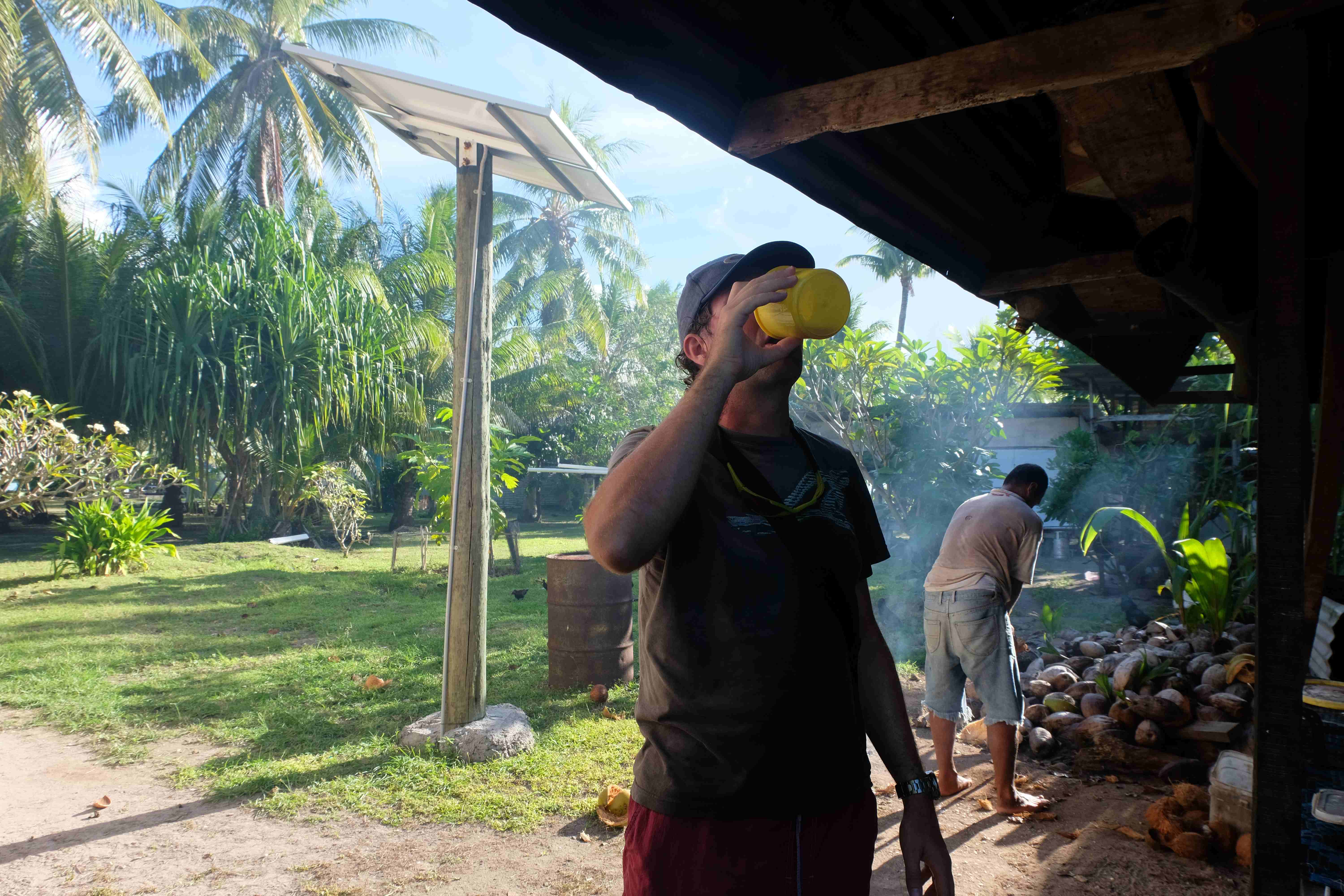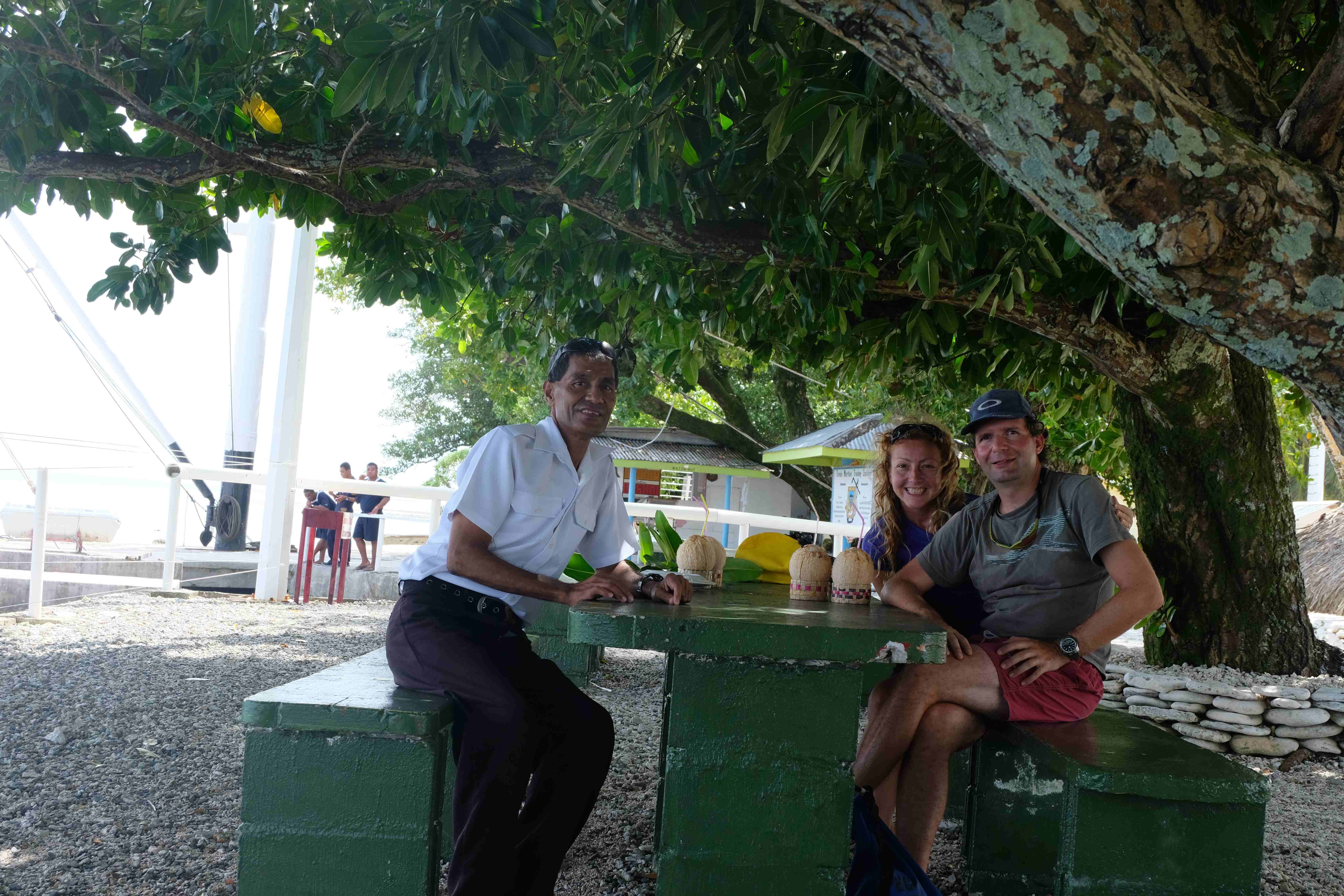 Nicht nur unglaubliche Taucherfahrungen und gratis Kokosnuss-Lieferdienst erhielten wir von unseren zwei Tour Leitern, sondern auch nützliche Ratschläge bezüglich ihrer Nachbarn: während wir uns vor den „Fijians“ und den „Kirbats“ in Acht nehmen sollten, da sie keine guten Menschen waren, sollten Staaten wie Samoa oder Tonga kein Problem darstellen. Ihre Beschützer-Rolle verwandelte sich langsam in ein Freundschaftsangebot, welches sie unbedingt mit einem Geschenk markieren wollten. Erinnert ihr euch an den Red Toddy, den gekochten Palmensaft? Nun ja, wir sollten eine Flasche davon von ihnen erhalten. Allerdings teilten sie uns sehr seriös mit, dass wir ein offizielles Papier bräuchten, um diese bis in die Schweiz zu transportieren – nämlich eine Bestätigung von dem Landwirtschaftsministeriums Tuvalus für allfällige Zollkontrollen, dass wir berechtigt sind, dies mitzuführen. 🙂