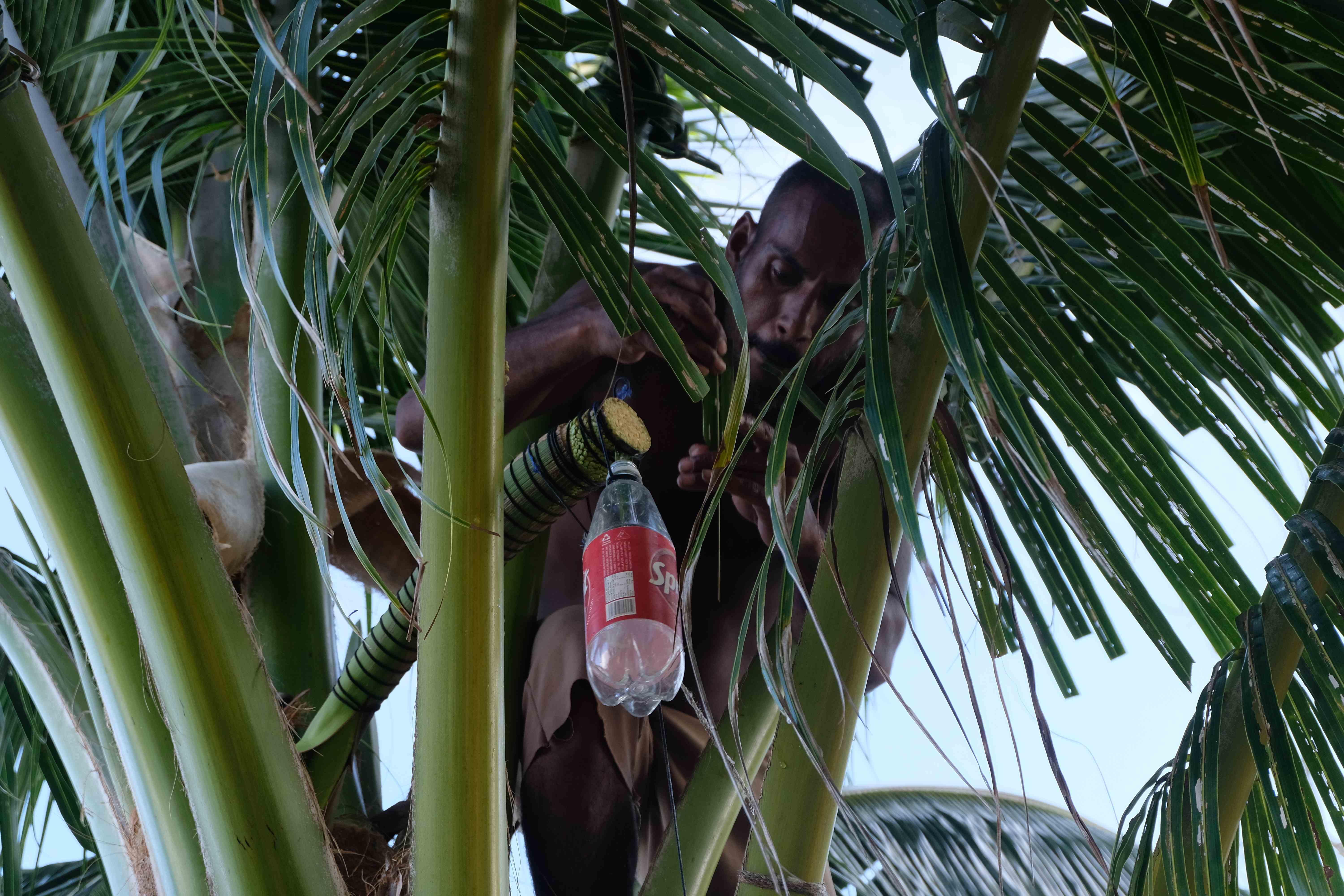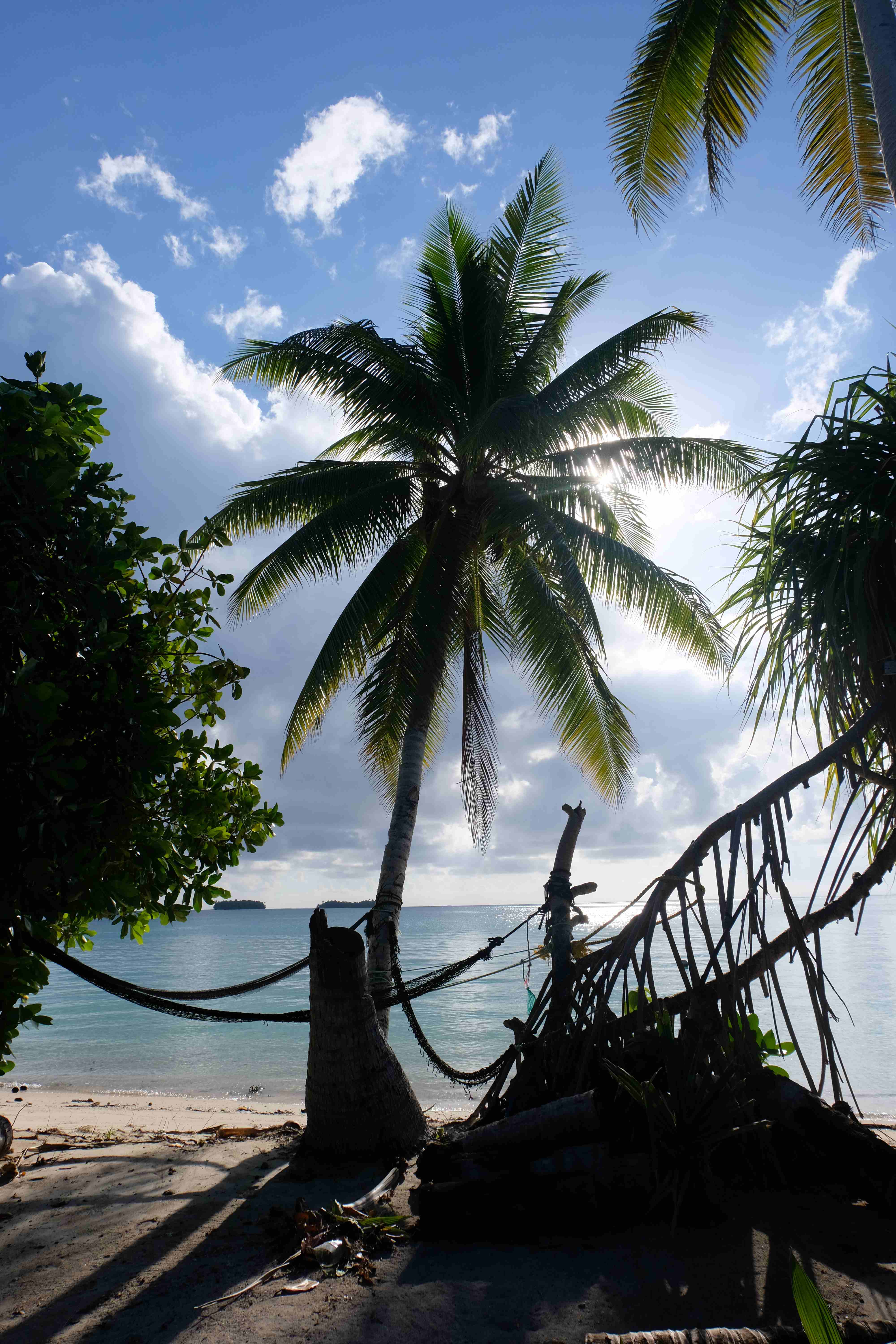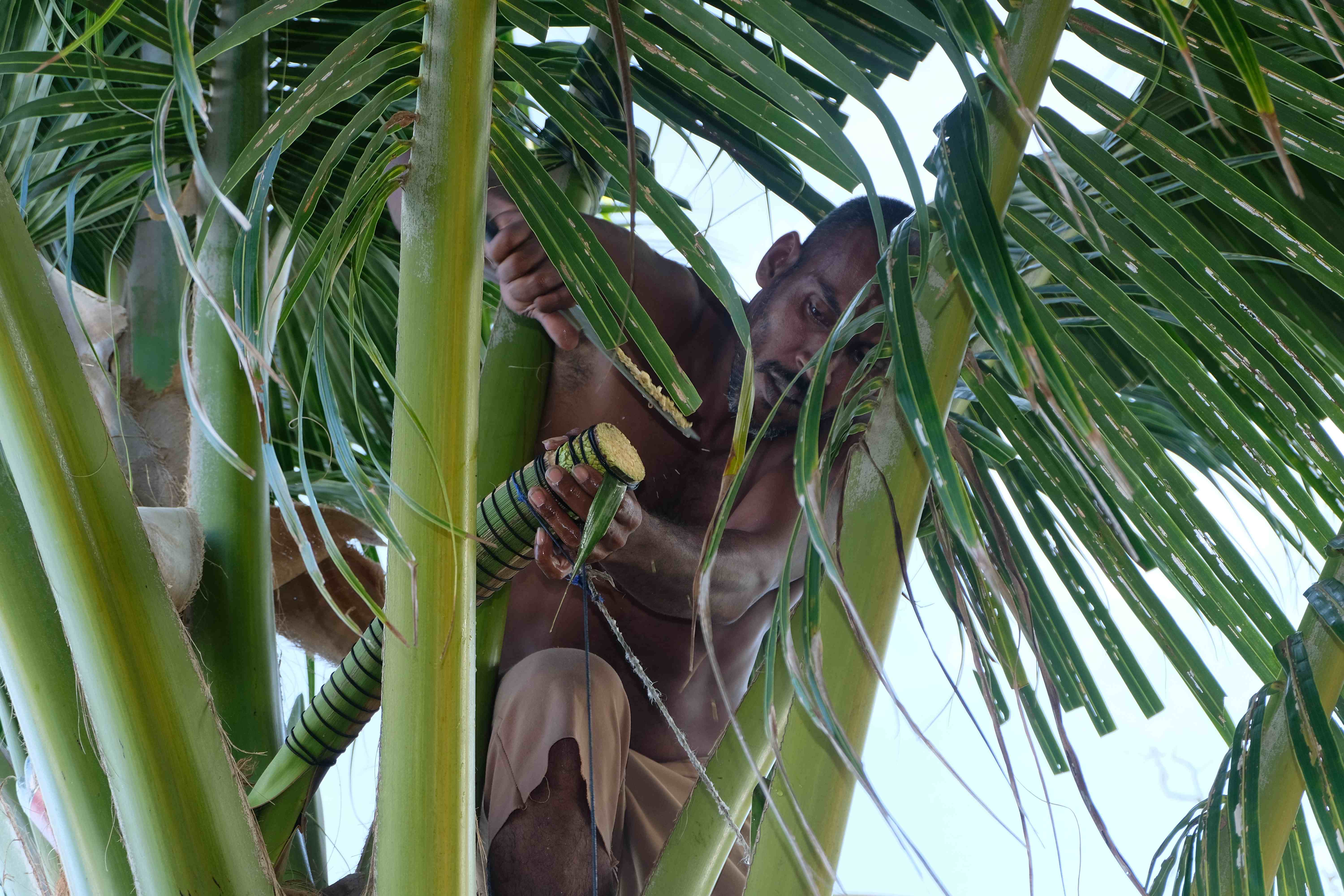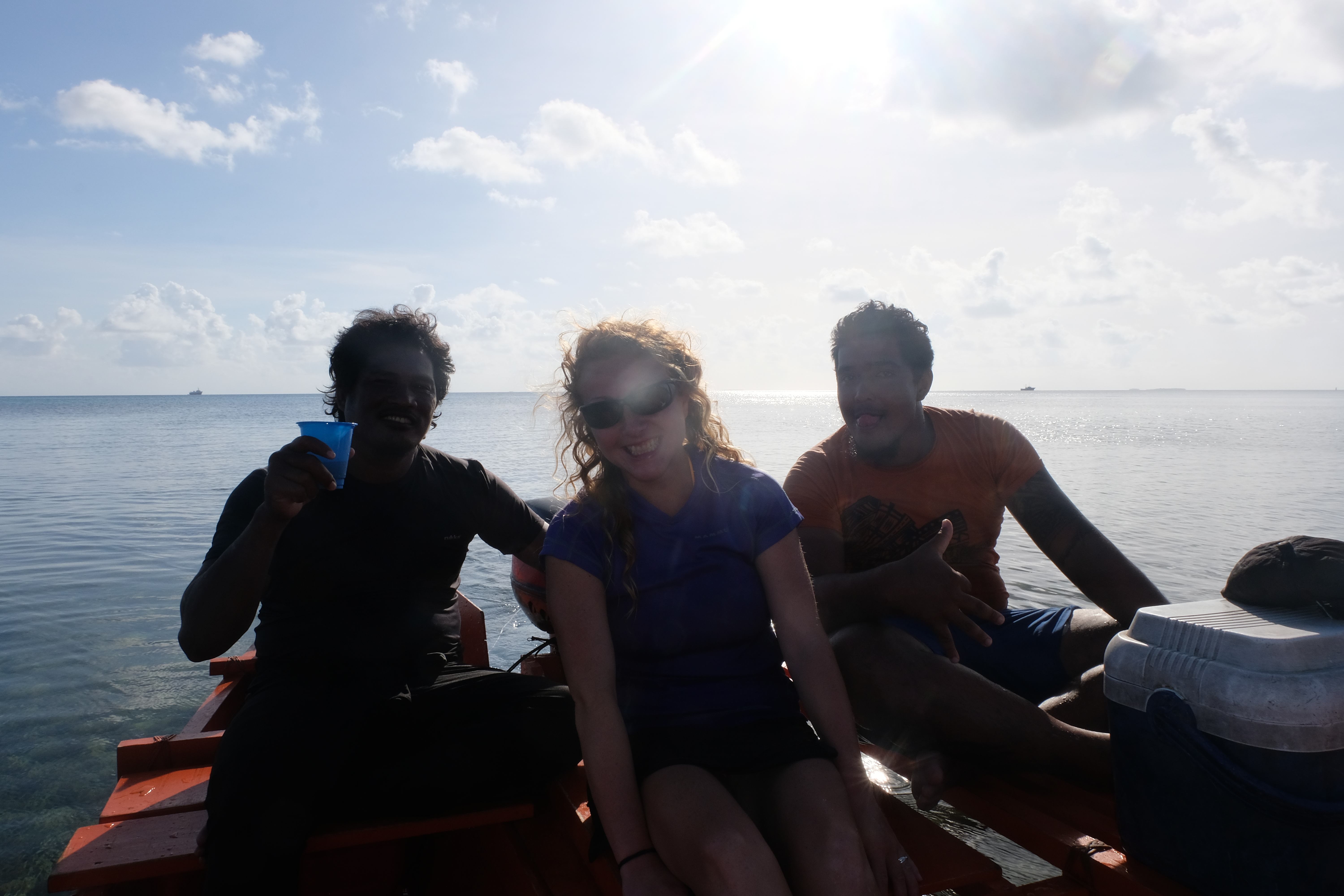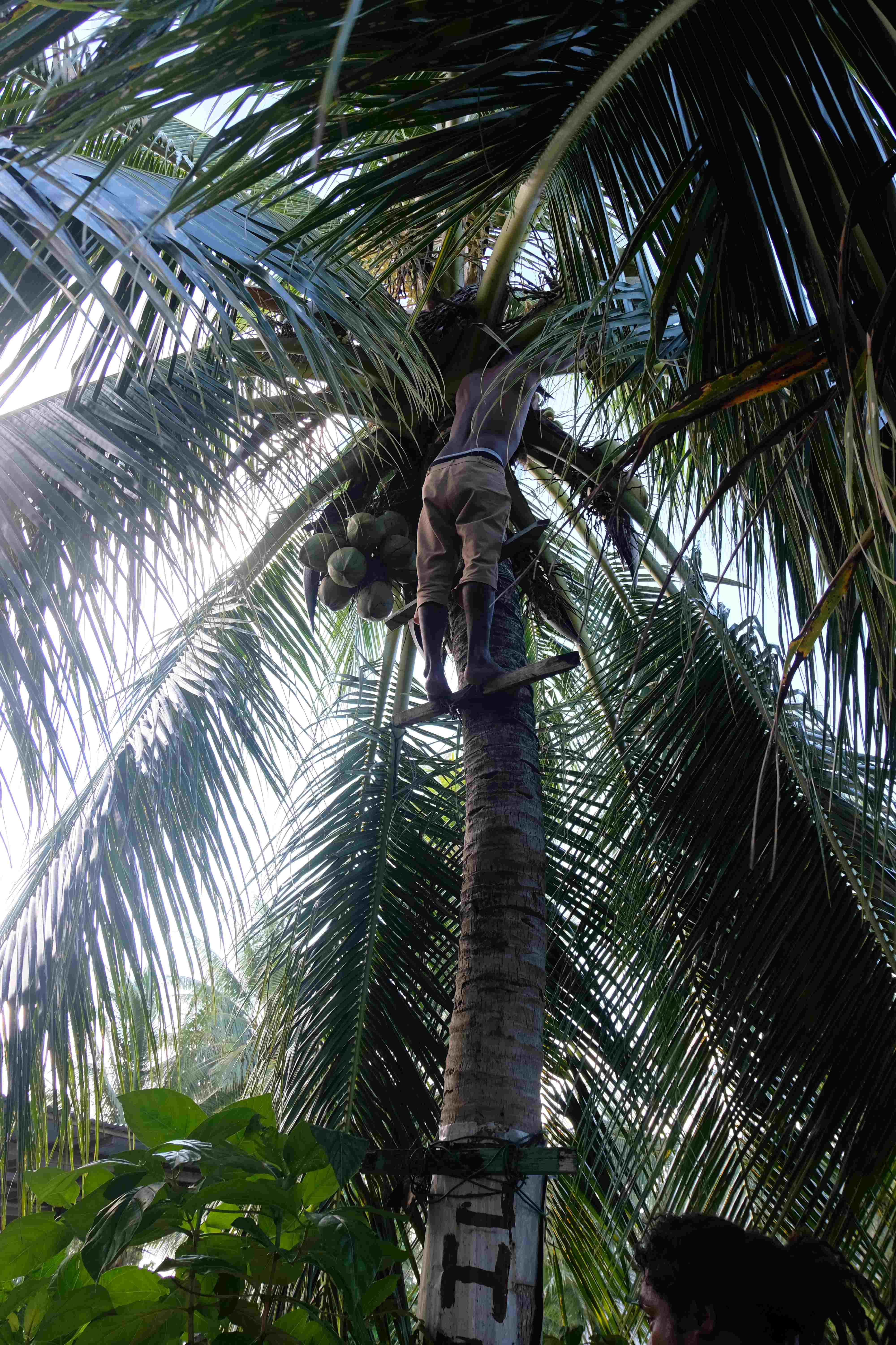 Nach der Beerdigungsfeier unseres Objektivs ging es weiter auf eine – mit 5 hier wohnenden Familien – dicht besiedelte Insel. Hier erhielten wir eine Tour der Niederlassung, wurden nach der Kletterakrobatik eines Einheimischen mit frischem Kokosnusswasser belohnt (ist das nicht toll, einer arbeitet, die anderen trinken! :-)) und erhielten nicht nur eine Erklärung bezüglich der Gewinnung, sondern auch eine Kostprobe von dem sog. Red Toddy. Dabei handelt es sich um den einheimischen Palmensaft, welcher aus dem speziell abgeschnittenen Palmenzweig in eine unmittelbar darunter aufgehängte Flasche fliesst und darauf zu einem dickflüssigen, dem Honig ähnlichen Sirup gekocht wird. Die Tour endete mit einem leckeren Festschmaus bestehend aus frischem Fisch (mit der Harpune unter Rafi’s schnorchelndem Blick gefangen): sowohl grilliert als auch roh! Zum Anblick der in der Ferne bleibenden kleinen Insel mit ihren einfachen aber glücklichen Bewohnern gesellte sich ein unglaublicher Regenbogen, welcher je weiter wir uns mit dem Boot entfernten, desto heller leuchtete. Vermutlich mussten wir in dem Moment feststellen, dass am heutigen Tag nicht nur unser Objektiv, sondern auch unser Ersatzakku den Geist aufgab; vermutlich musste dies geschehen, damit ihr eurer Phantasie freien Lauf lassen könnt um euch diese Szene vorzustellen; vermutlich gibt es einfach Sachen, welche zu schön sind, um auf Fotos festgehalten zu werden!