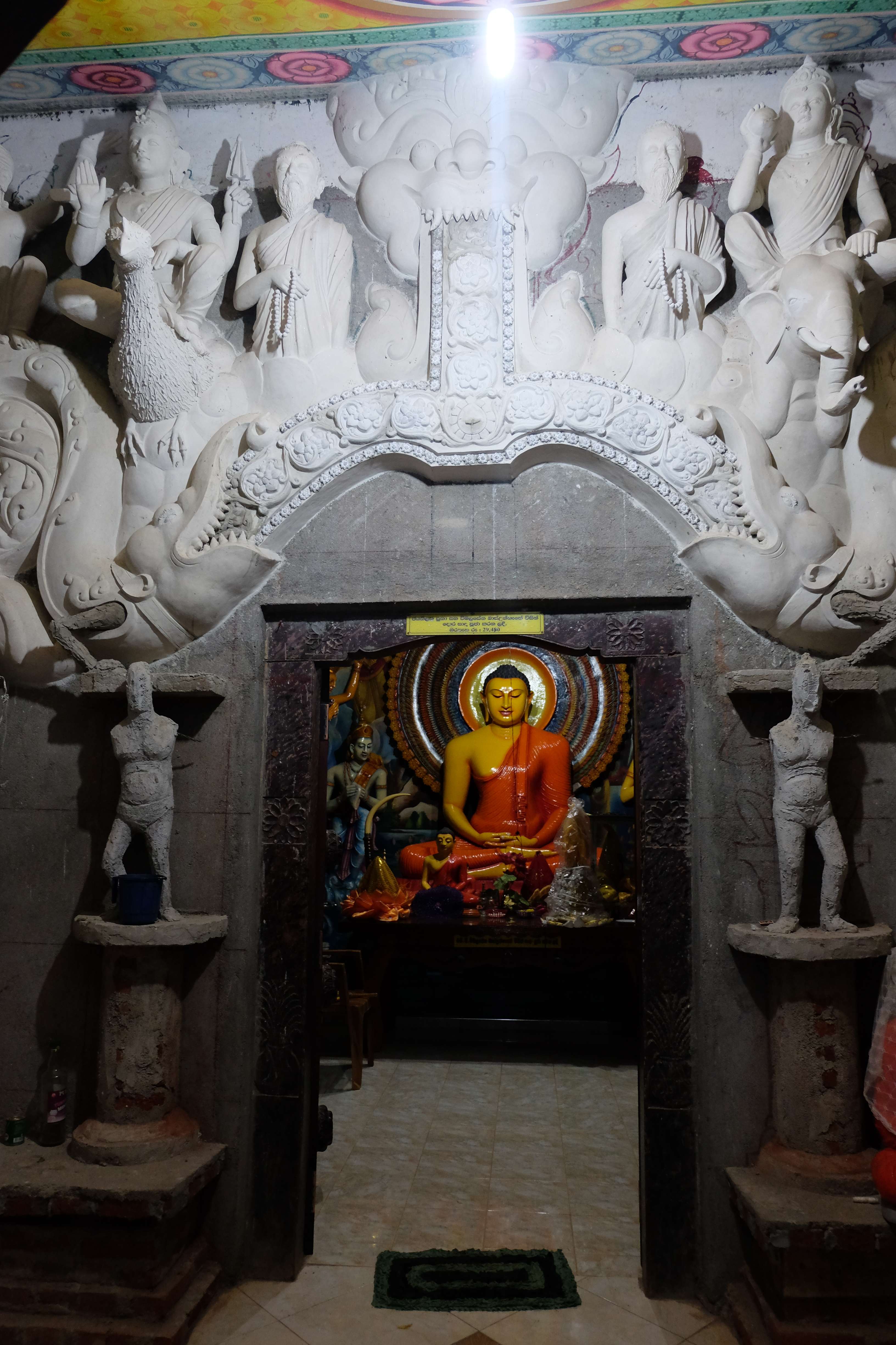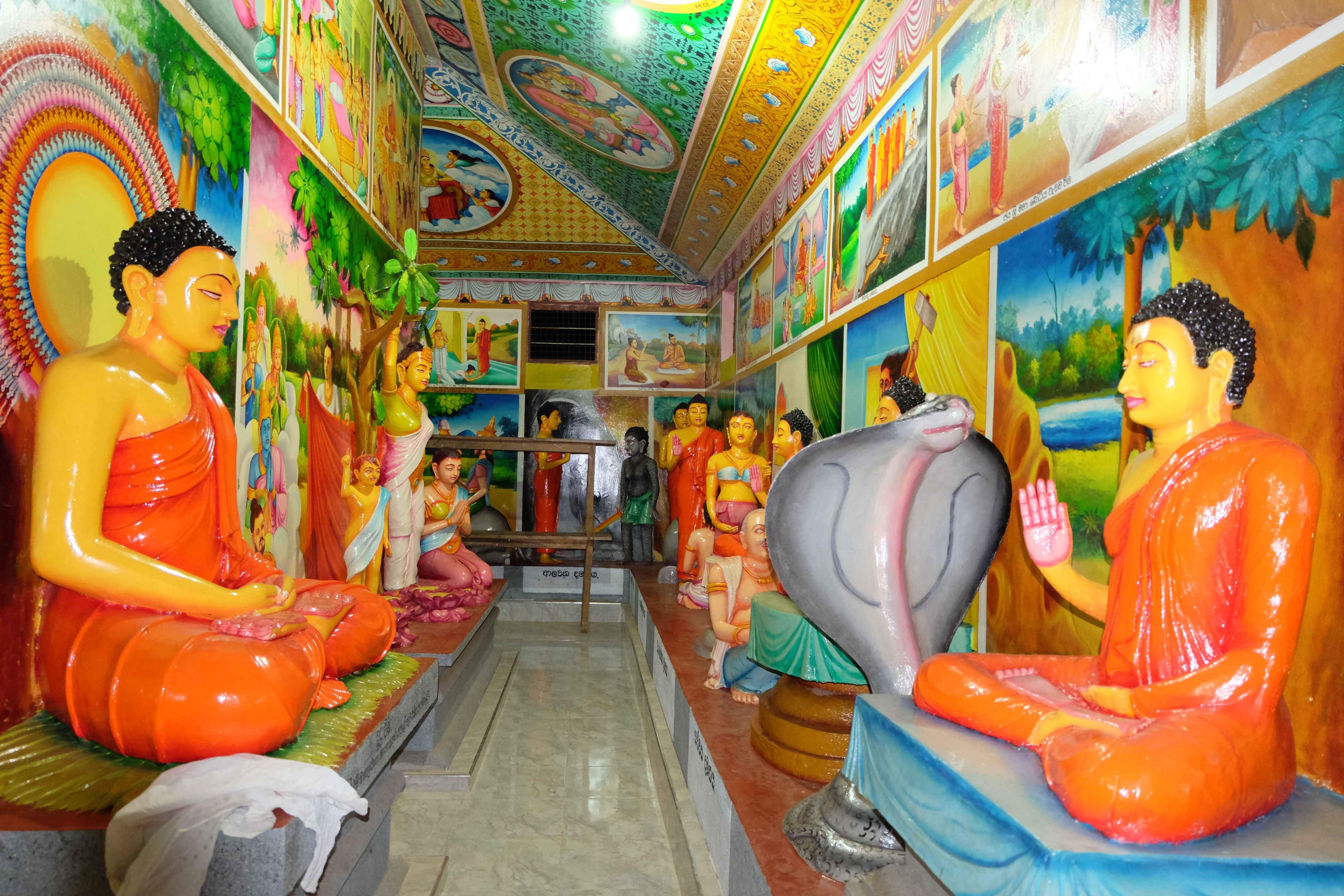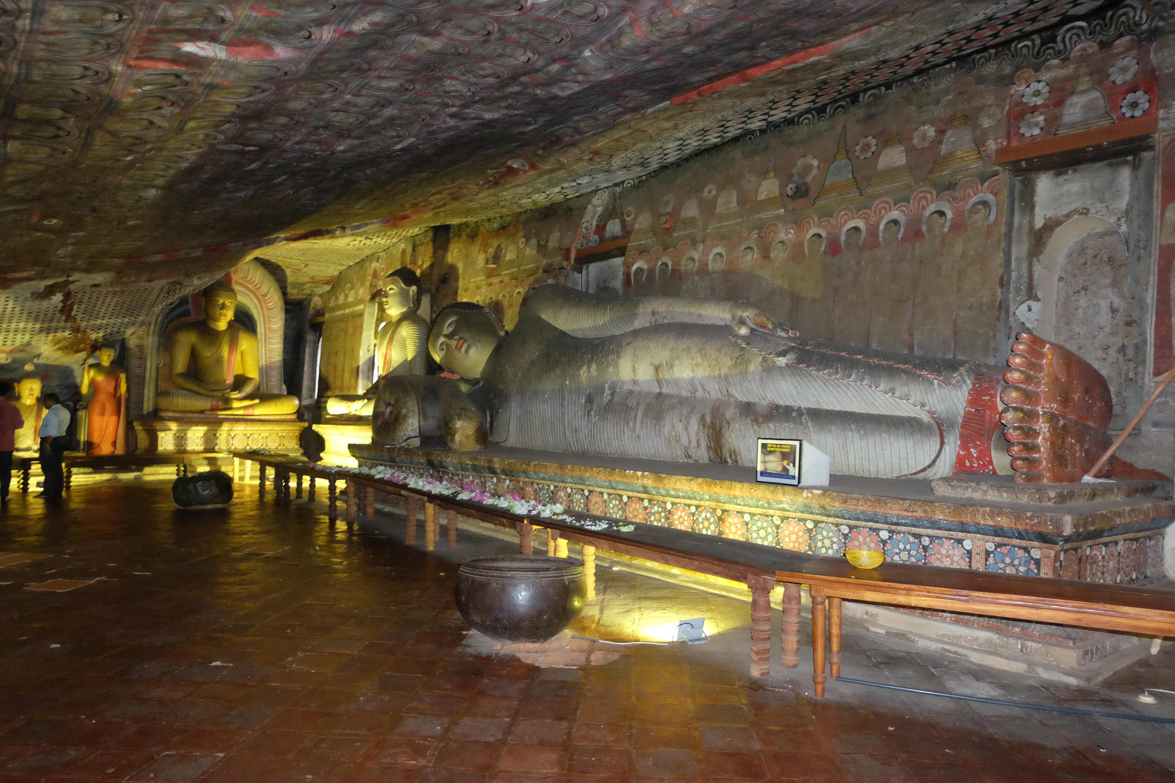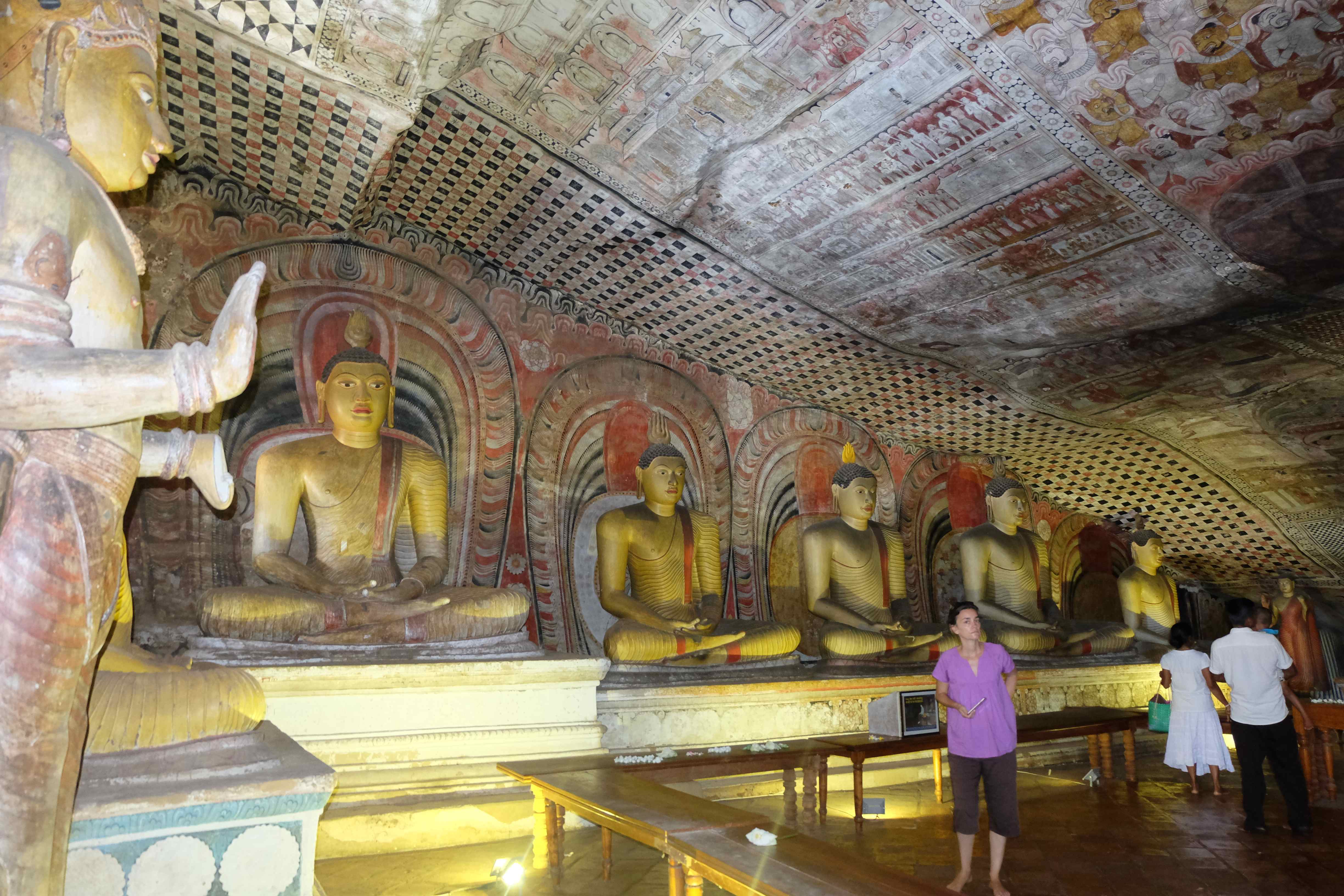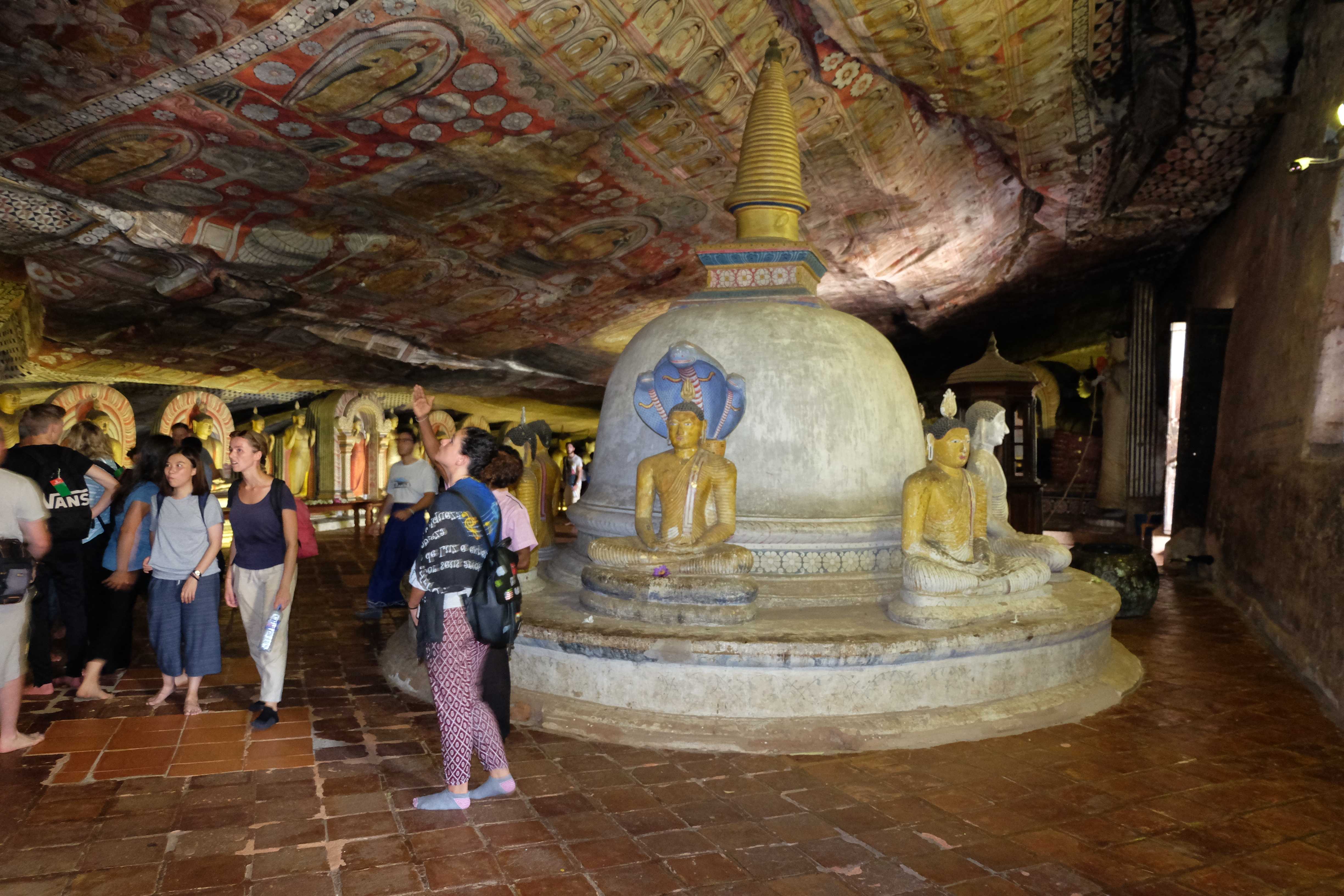 Ziua urmatoare ne-am luat ramas bun de la paradisul nostru mic in mijloc de jungla si ne-am pus pe drum spre Dambulla. Aici se afla unul dintre cele mai renumite temple budiste in stanca, gen pestera. Nu putem spune nimic, este un loc frumos, insa daca ai vazut deja vreo 20 de temple budiste inainte, care de care mai spectaculare, acesta nu ti se mai pare asa de nemaipomenit precum ii este faima. Ceea ce insa a meritat cu varf si indesat a fost privelistea de sus… plus faptul ca  fost un antrenament foarte bun sa urcam pana acolo cu rucsacurile in spate (ce-i drept, le aveam la noi doar pe cele mici, cele mari le lasaseram in Colombo la dependentul nostru de zahar, neavand nici un rost sa le caram dupa noi prin toata Sri Lanka.) Iata cateva imagini: