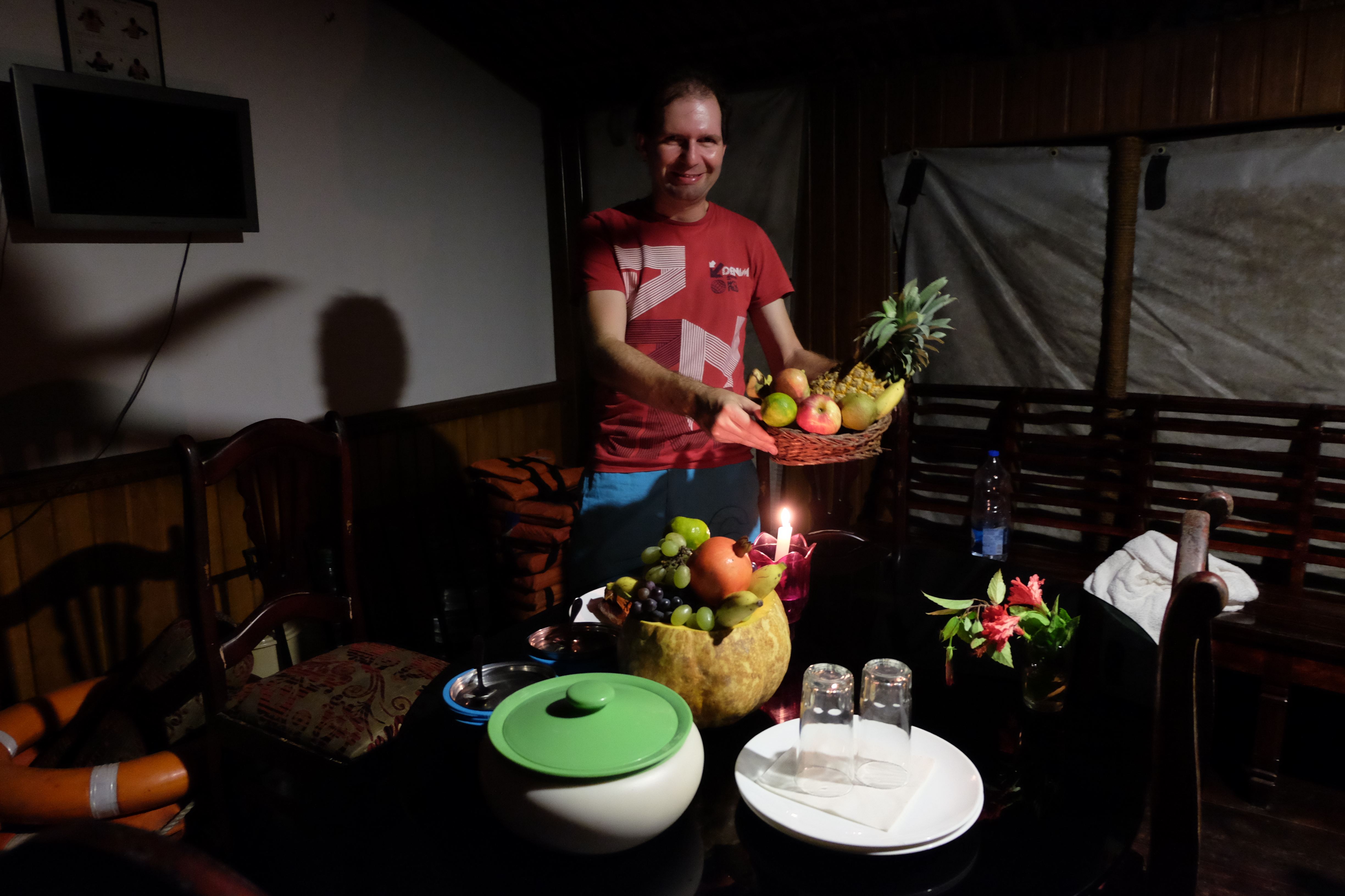 Es war kein Wow-Erlebnis bzw. wenn man bereits auf einem Boot oder einem Schiff war, ist das eher ein wenig langweilig, da das Boot durch die Kanäle fährt und dann immer wieder in einem Dorf anhält und dort bleibt. Die Strecke, die man eigentlich zurücklegt ist sehr kurz, aber für uns war es gerade mal eine willkommene Entspannungsrunde nach einigen sehr langen Tagen und Nächten. Ausserdem wurden wir vom Bootspersonal bekocht und Rafi erhielt als Überraschung sogar einen Tortenersatz: eine riesige Früchteplatte! (ich hatte nämlich Angst ihm eine Torte zu organisieren, da er vermutlich bei der hiesigen Zuckerkonzentration in allen Lebensmitteln raketenmässig abgehoben hätte!) 🙂 Und eines muss man dem Ort wo die Boote abfahren doch lassen: er ist dreckig, aber bisher der sauberste von ganz Indien!