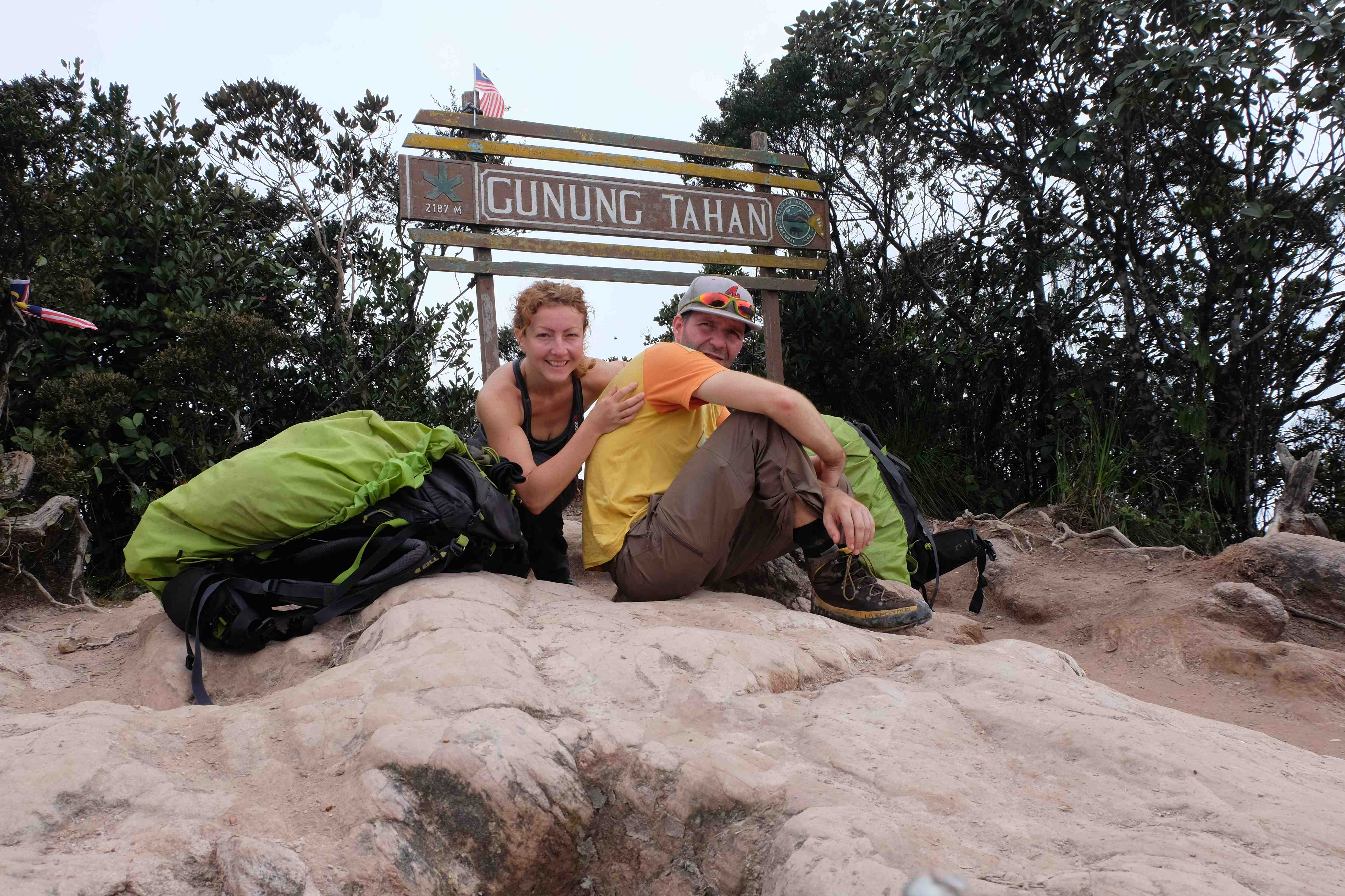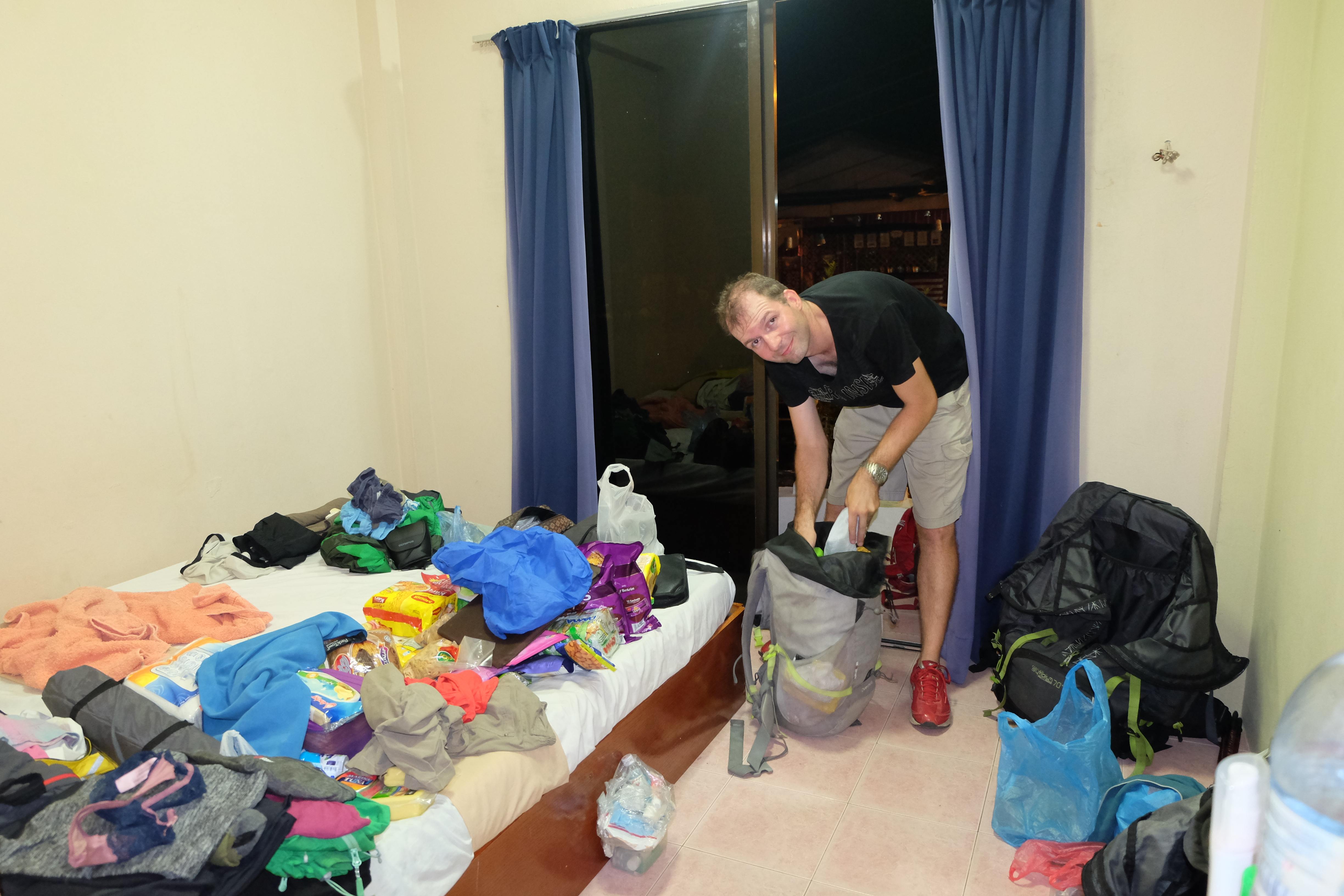 Nach diesen „homo touristicus“ typischen Aktivitäten beschlossen wir allerdings, dass wir „homo Rambo“ spielen wollen und eher die harte Seite des Dschungels erfahren indem wir tief hineindringen und einige Nächte mit Hab und Gut (nämlich Zelt und Essen) dort übernachten. Was für eine bessere Route dafür, als jene auf den höchsten Berg der Halbinsel: Gunung Tahan, der lächerliche 2183 m misst. Ein Spaziergang … und ein wenig Dschungelerlebnis dazu (dachten wir uns Idioten!) Sehr selbstsicher und unserer Fitness bewusst lachten wir sämtliche Touranbieter aus, als sie entsetzt reagierten, weil wir die von ihnen standardmässig in 7 Tagen angebotene, 110 km lange Tour auf derer 5 kürzen wollten. „Die Typen waren noch nie auf einem Berg“, dachten wir uns… es sind lächerliche 2000m, bitte schön! Die Apres-Ski Bar in Saas Fee ist ja fast auf der Höhe! 🙂 Wir kommen aus der Heimat der Alpen, verfügen über 8000er Erfahrung, sind sehr sportlich, fahren mit dem Velo an einem Tag von Zürich nach Genf, in 12 Tagen von der Schweiz nach Rumänien… das wird für uns ein Kinderspiel sein! Eigentlich bräuchten wir gar keinen Guide, den nehmen wir nur wegen des dichten Dschungels und des nicht unbedingt markierten Weges. Natürlich fanden wir ziemlich schnell einen Guide, der (verrückt genug war und) einwilligte, die Tour mit uns in 5 Tagen zu machen. Für noch Verrücktere gäbe es ja die gleiche Variante als Sportveranstaltung: ein Ultra-Marathon, den einige in unter 24 h absolvieren. Also nichts wie los: 2 „homo Rambo“ und ein Guide gingen einkaufen – Essensvorräte und eine minimale Campingausrüstung muss her. Stellt ihr euch schon die Action-Hintergrundmusik und den Silvester Stallone vor, der seine gesamte Kampfausrüstung vorbereitet? So hat das nämlich bei uns ausgesehen :-):