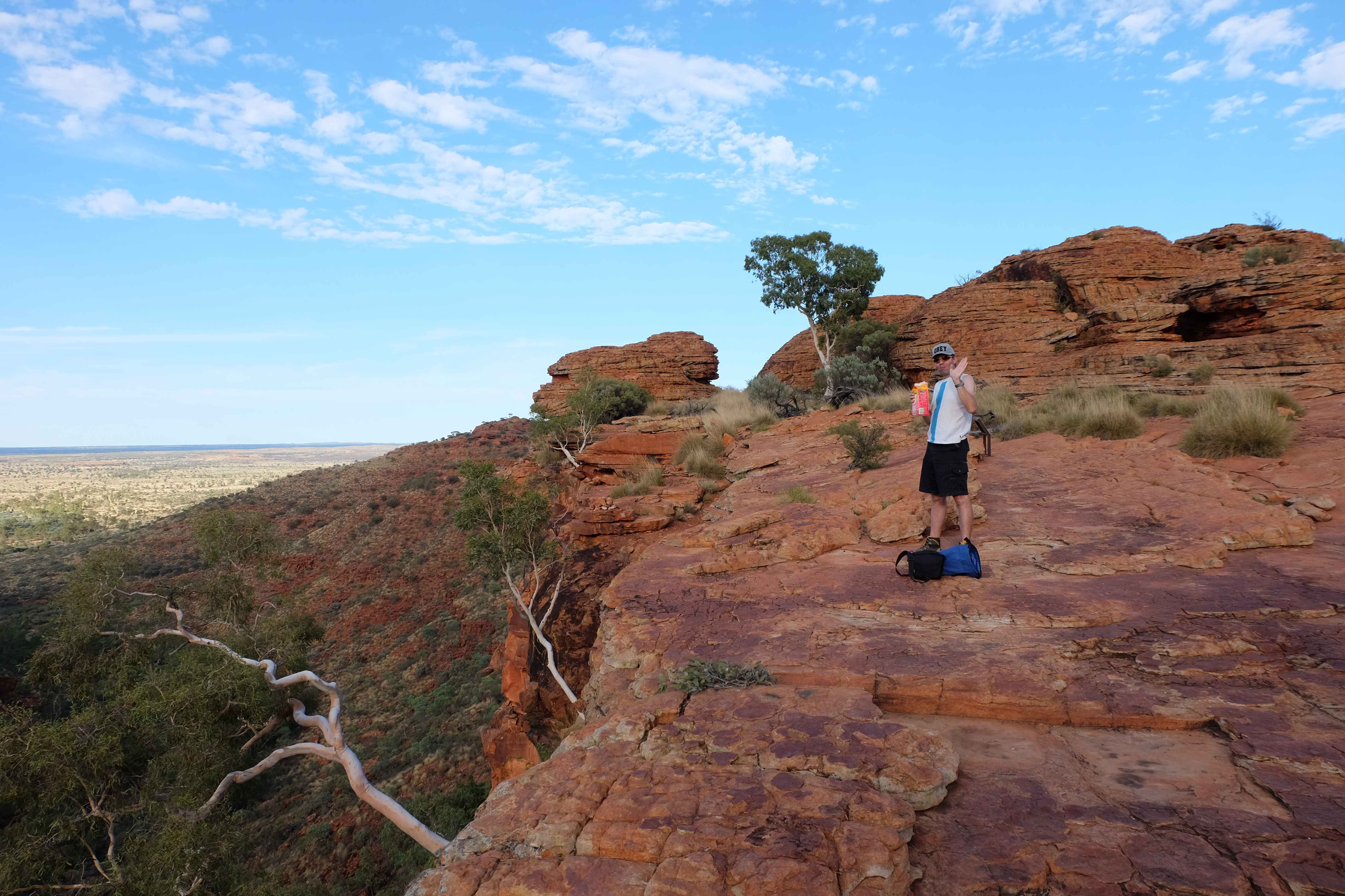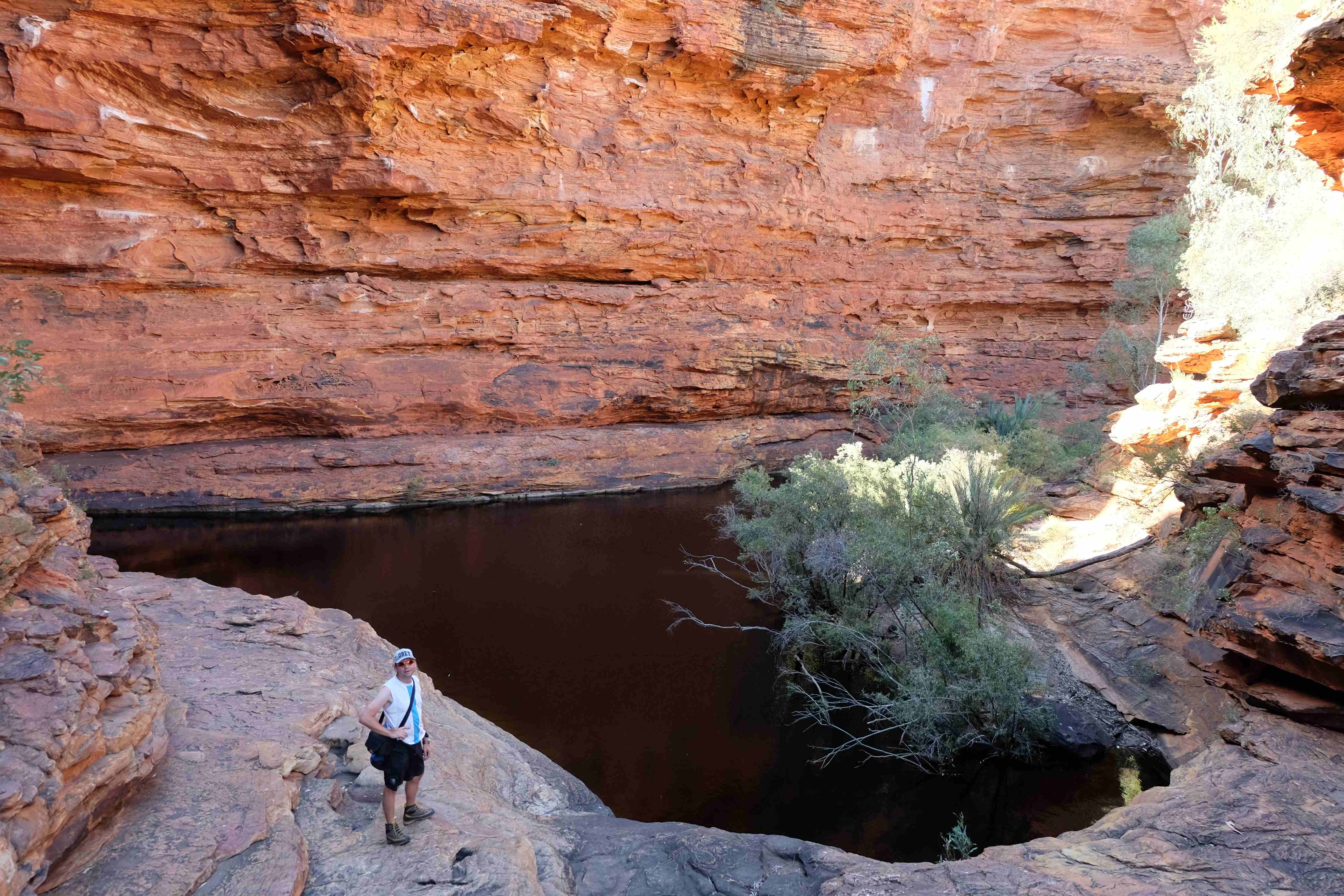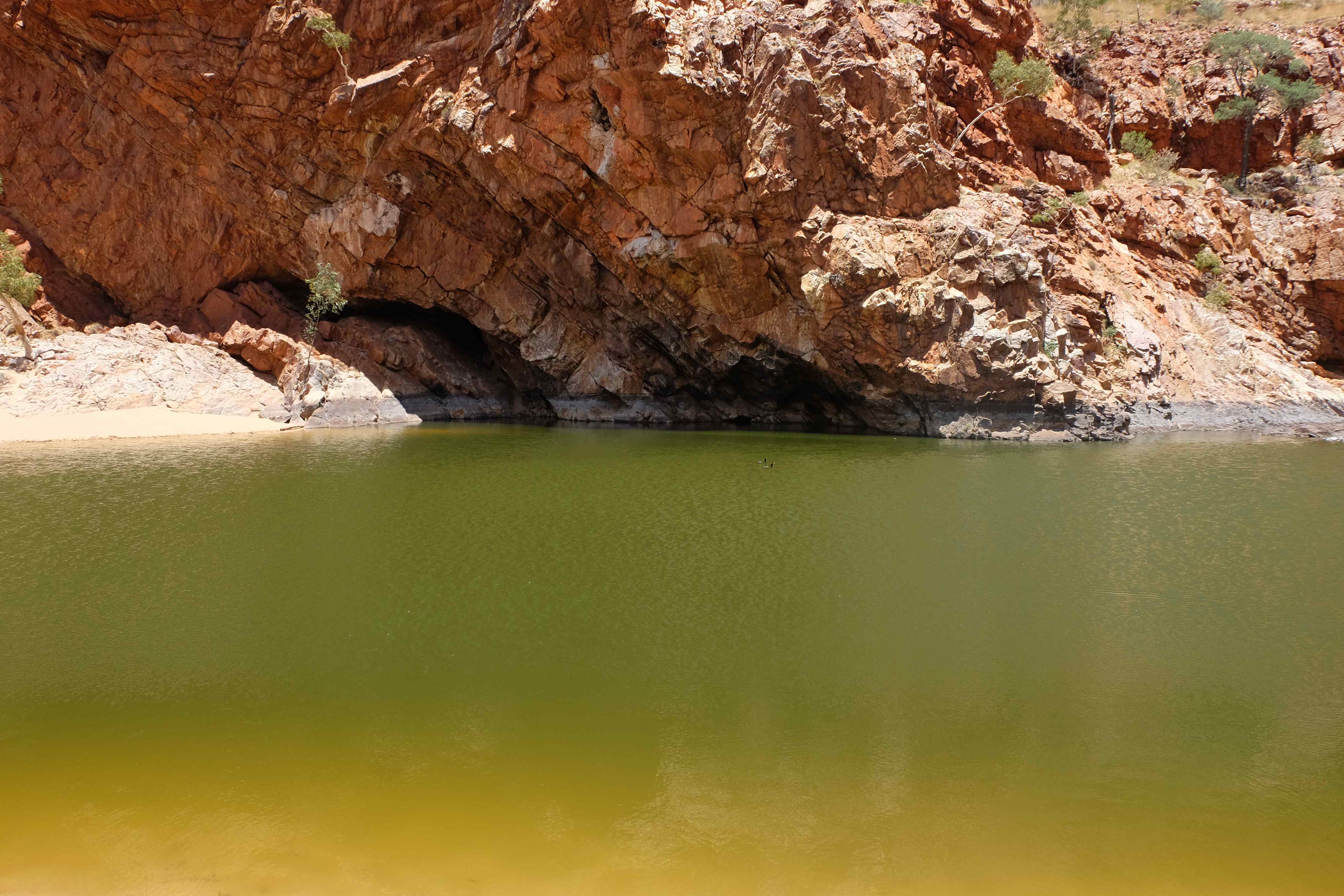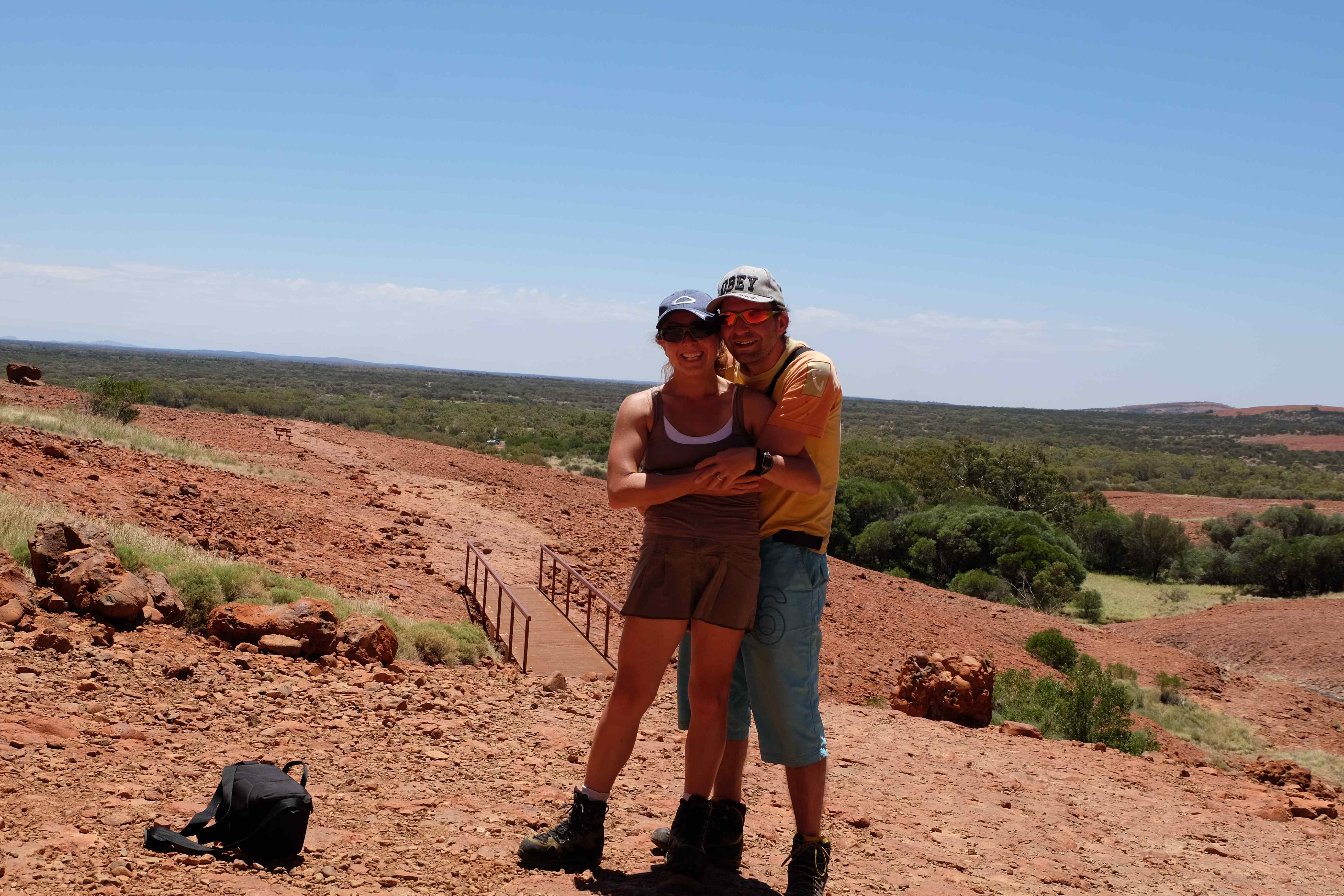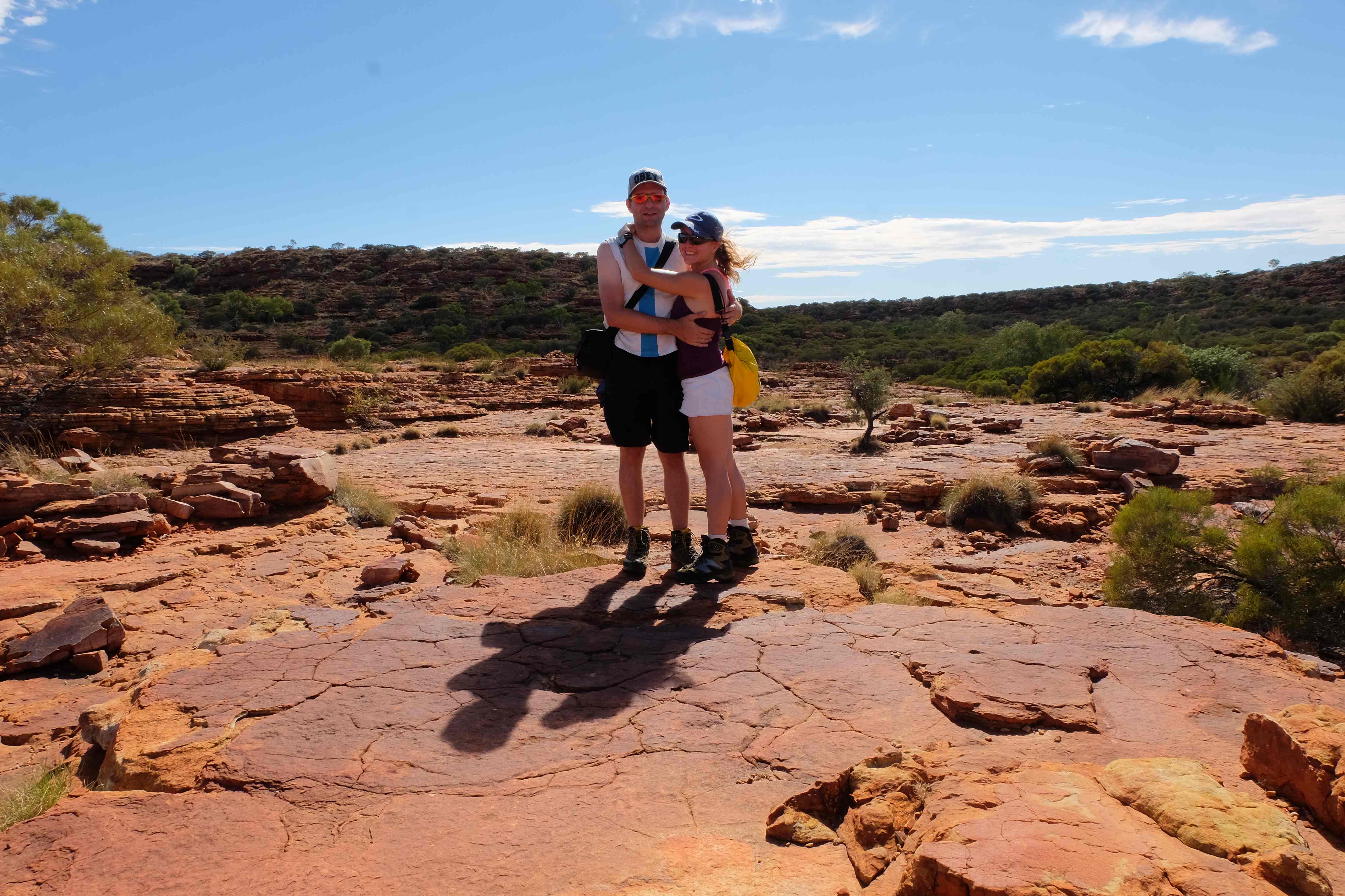 Nach der ersten im Auto verbrachten und mit einem unglaublichen Sonnenaufgang belohnten Nacht ging es morgens früh los – sehr früh, da die Wanderrouten hier aufgrund der lebensbedrohlichen Hitze und Dürre bereits um 9 Uhr morgens geschlossen werden. Wir unterschätzten ein wenig den Kampf gegen die aggressiven australischen Fliegen – die einem scharenweise beim Nasen- , Augen- und Ohrenputzen helfen wollen und sich somit in jedes Loch den Weg bahnen – sowie die vorgegebenen Flüssigkeitsmengen pro Stunden – 1 Liter Wasser pro Stunde ist doch nur normal wenn man der Gattung Kamel angehört! – Erschöpft und erschlagen erreichten wir nach guten 4 Stunden unsere Luxus-Residenz: unser neon-grünes Toyota, welches überhitzt auf uns auf dem Parkplatz wartete. Die Situation schrie einfach nur noch nach einer kalten Dusche, welche wir uns auch gönnten! Wo, fragt ihr euch? In einer der Duschanlagen der überteuerten Ressorts auf der Strecke, welche ebenfalls Mehrbetten-Zimmer mit geteilter Dusche anboten und wo wir uns einbrechermässig hereinschlichen – als seien wir zahlende Gäste – und uns erfrischten. 🙂 Da wir ja wussten, dass zwei weitere nächtliche Luxus-Aufenthalte in unserem Toyota folgten, mussten wir doch einen Weg finden unsere Geruchssinne zu schonen und – sei es auch nur einbrechermässig – zu duschen! 🙂 Frisch, sauber und als hätten wir nichts Unerlaubtes getan stolzierten wir aus den Duschanlagen heraus, begaben uns – als wären wir dortige Gäste – zu unserer schön im Schatten parkierten Luxus-Residenz und setzten unsere Reise fort. 🙂