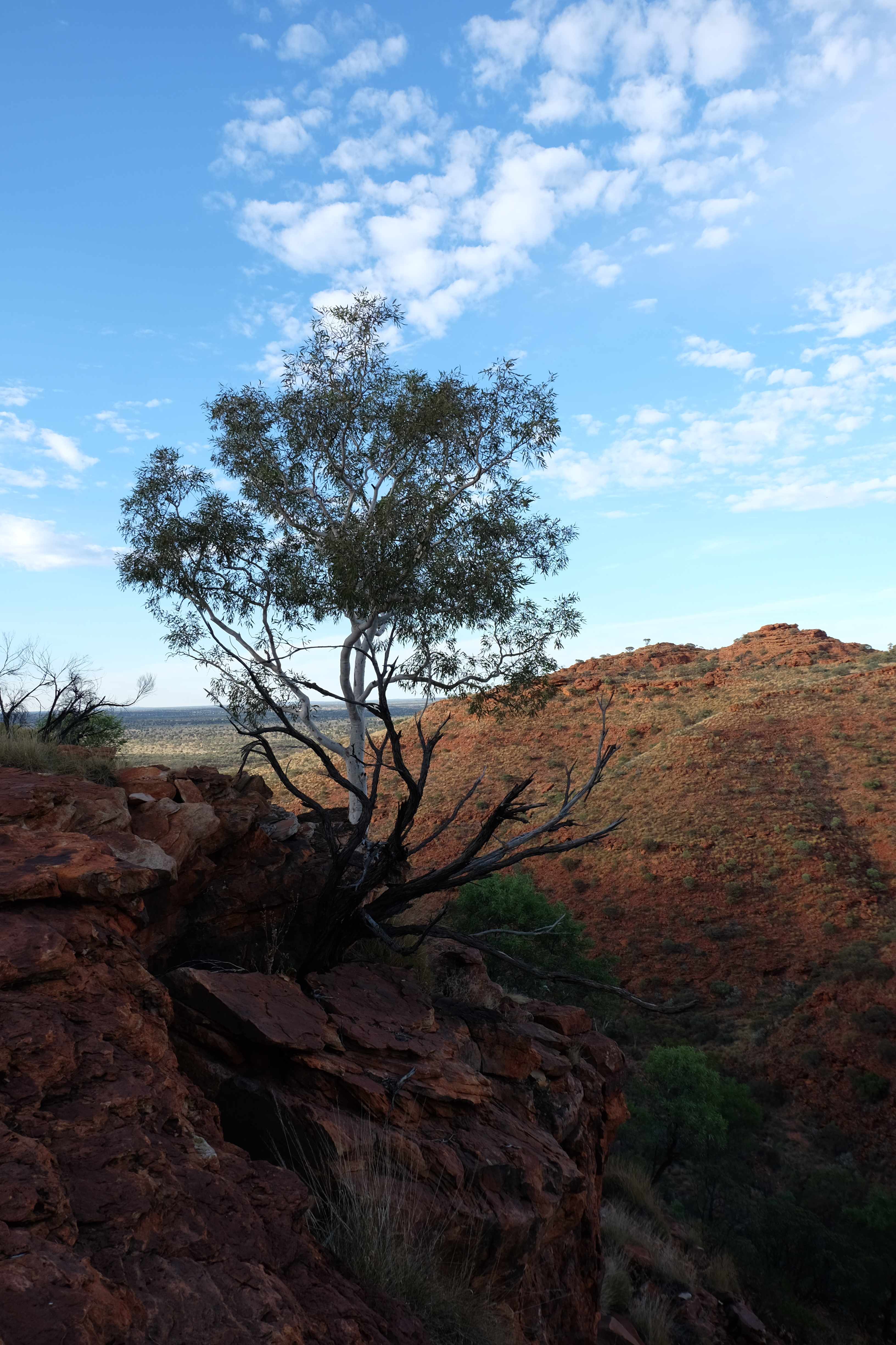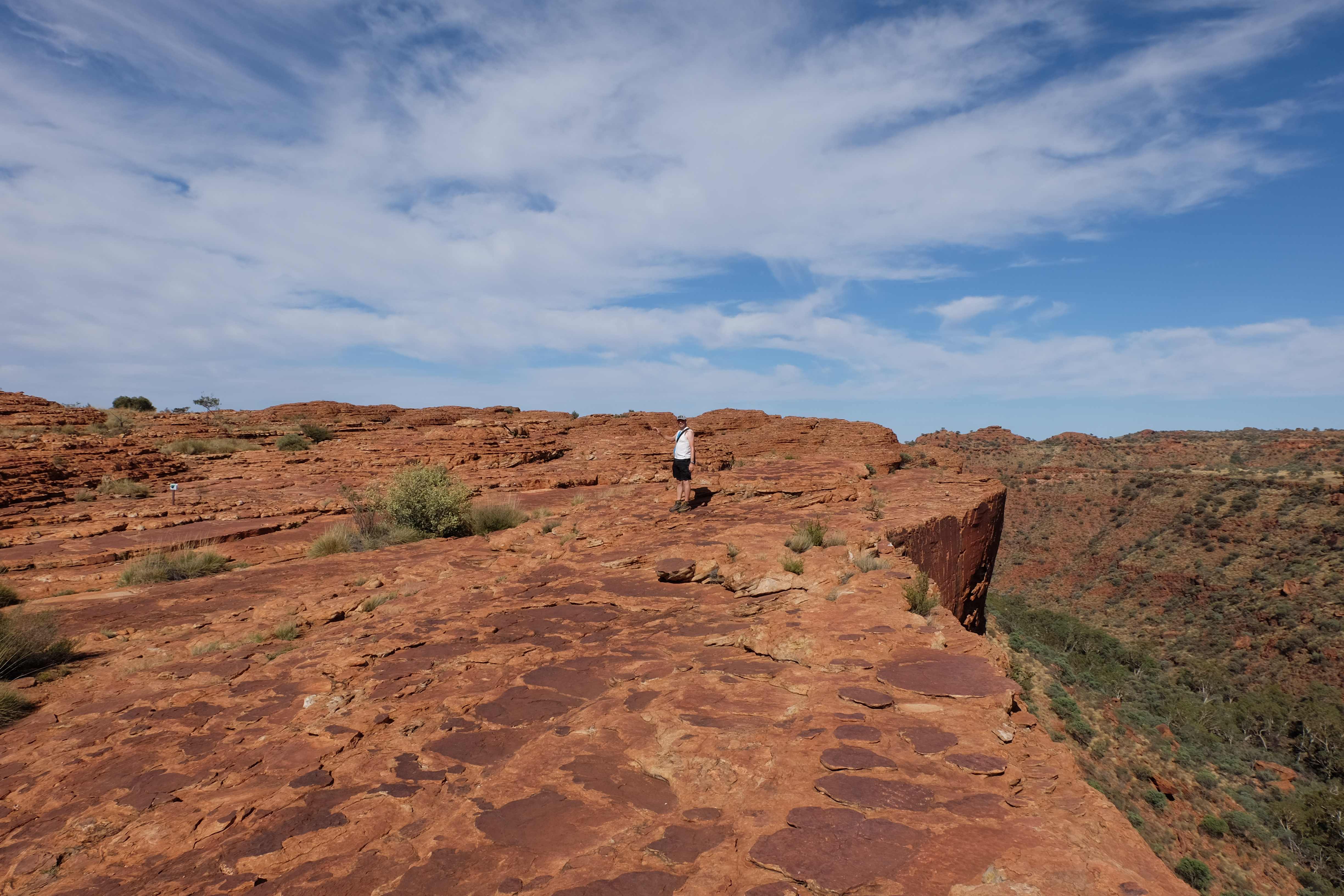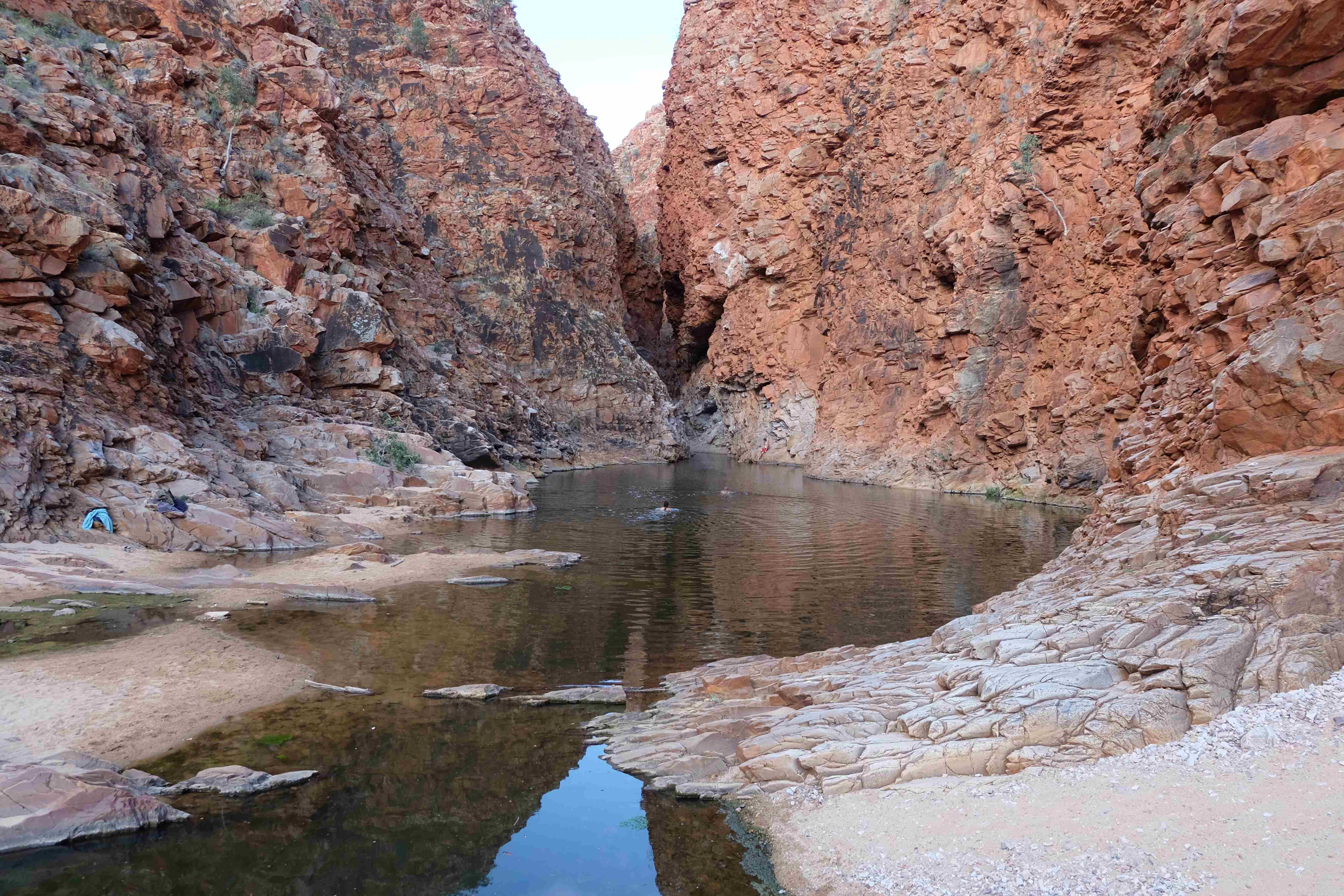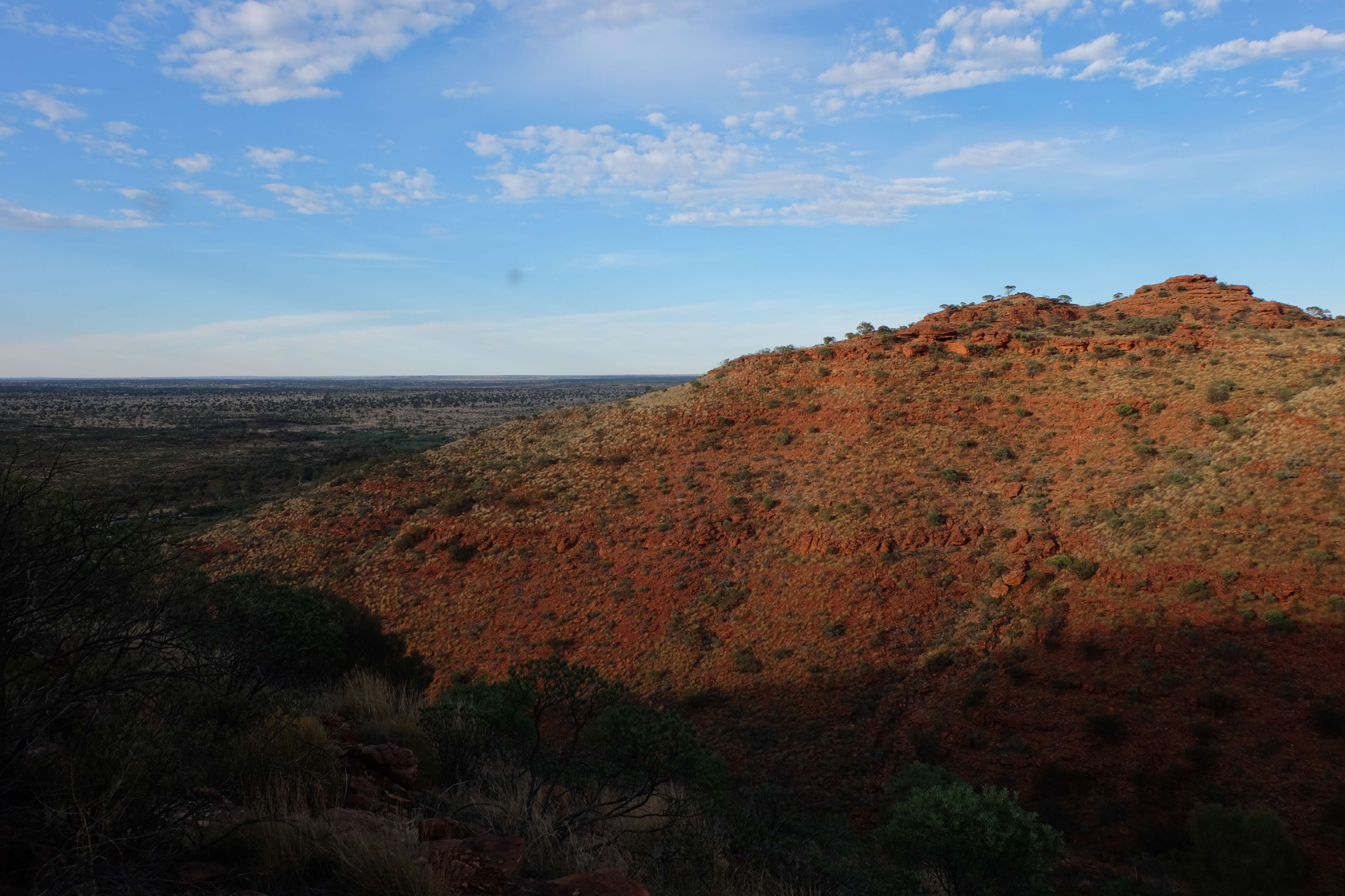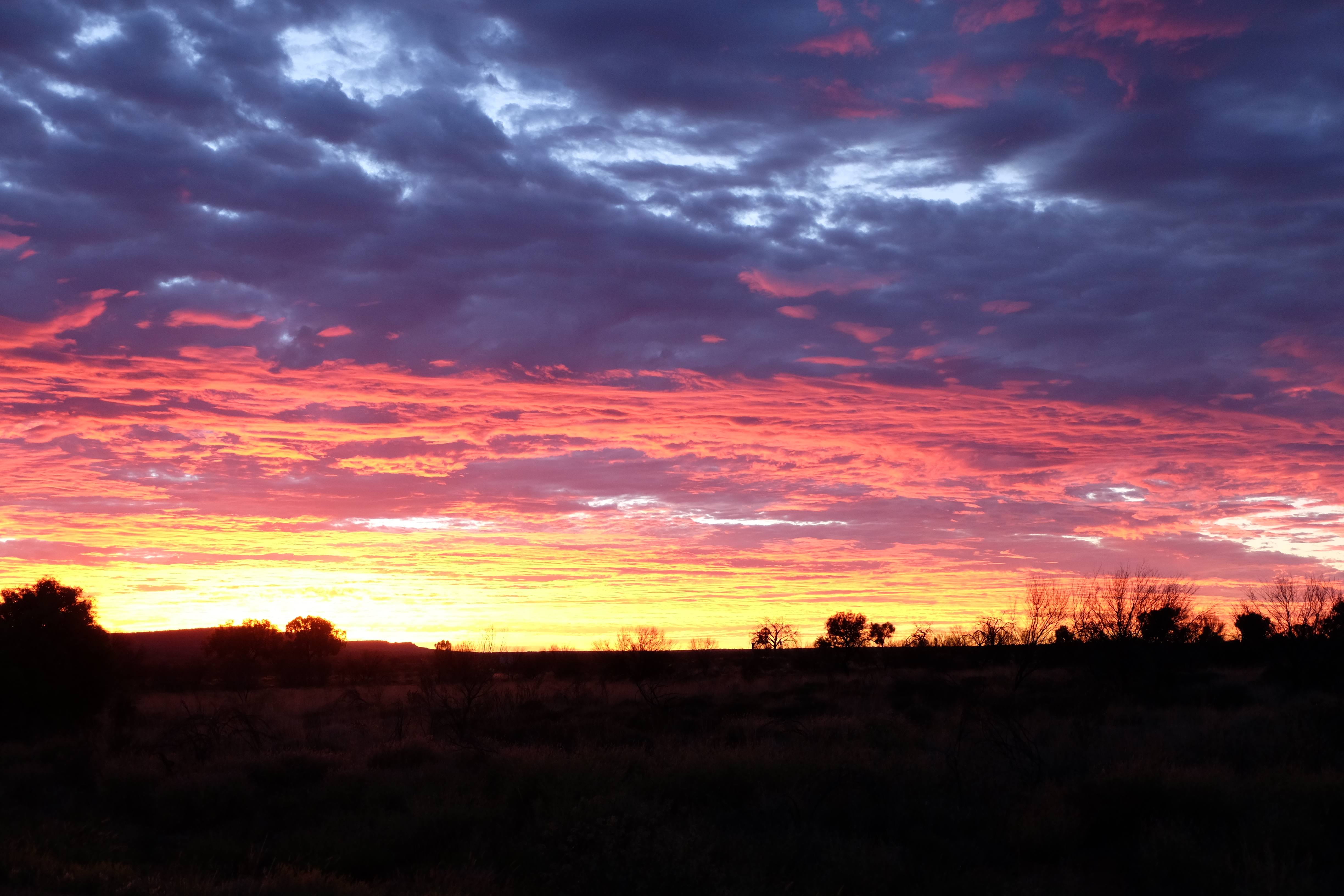 Nach der ersten im Auto verbrachten und mit einem unglaublichen Sonnenaufgang belohnten Nacht ging es morgens früh los – sehr früh, da die Wanderrouten hier aufgrund der lebensbedrohlichen Hitze und Dürre bereits um 9 Uhr morgens geschlossen werden. Wir unterschätzten ein wenig den Kampf gegen die aggressiven australischen Fliegen – die einem scharenweise beim Nasen- , Augen- und Ohrenputzen helfen wollen und sich somit in jedes Loch den Weg bahnen – sowie die vorgegebenen Flüssigkeitsmengen pro Stunden – 1 Liter Wasser pro Stunde ist doch nur normal wenn man der Gattung Kamel angehört! – Erschöpft und erschlagen erreichten wir nach guten 4 Stunden unsere Luxus-Residenz: unser neon-grünes Toyota, welches überhitzt auf uns auf dem Parkplatz wartete. Die Situation schrie einfach nur noch nach einer kalten Dusche, welche wir uns auch gönnten! Wo, fragt ihr euch? In einer der Duschanlagen der überteuerten Ressorts auf der Strecke, welche ebenfalls Mehrbetten-Zimmer mit geteilter Dusche anboten und wo wir uns einbrechermässig hereinschlichen – als seien wir zahlende Gäste – und uns erfrischten. 🙂 Da wir ja wussten, dass zwei weitere nächtliche Luxus-Aufenthalte in unserem Toyota folgten, mussten wir doch einen Weg finden unsere Geruchssinne zu schonen und – sei es auch nur einbrechermässig – zu duschen! 🙂 Frisch, sauber und als hätten wir nichts Unerlaubtes getan stolzierten wir aus den Duschanlagen heraus, begaben uns – als wären wir dortige Gäste – zu unserer schön im Schatten parkierten Luxus-Residenz und setzten unsere Reise fort. 🙂