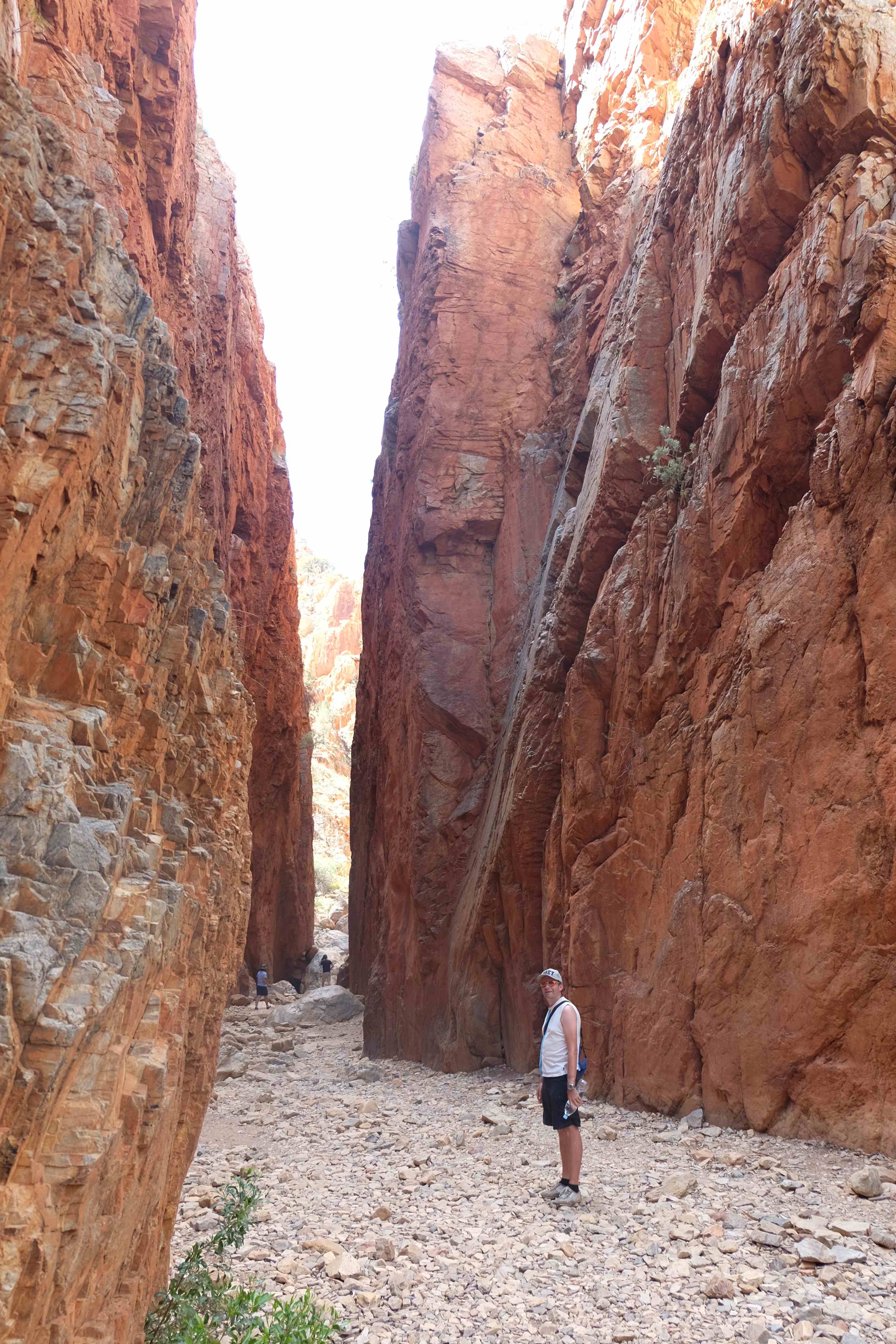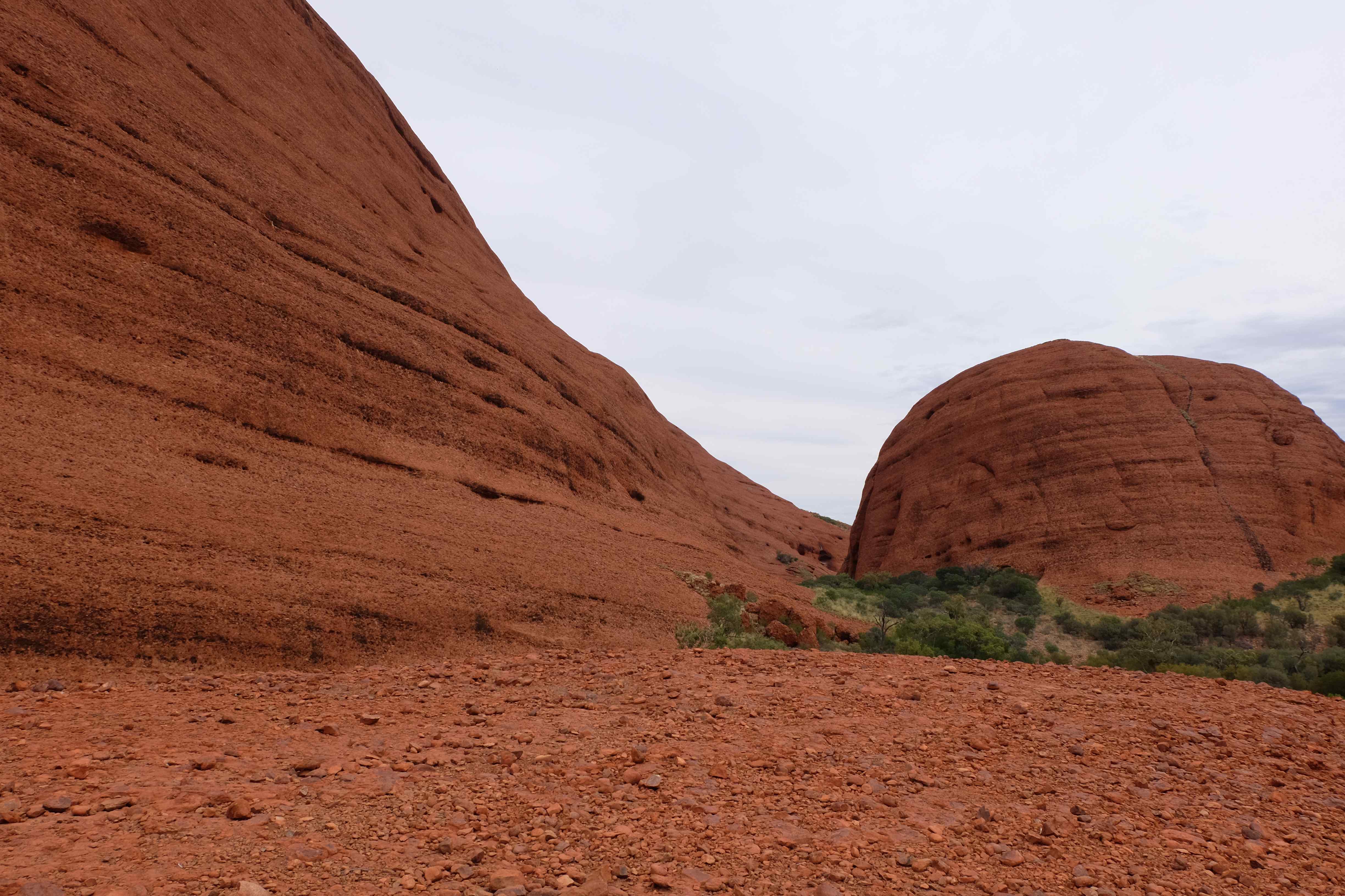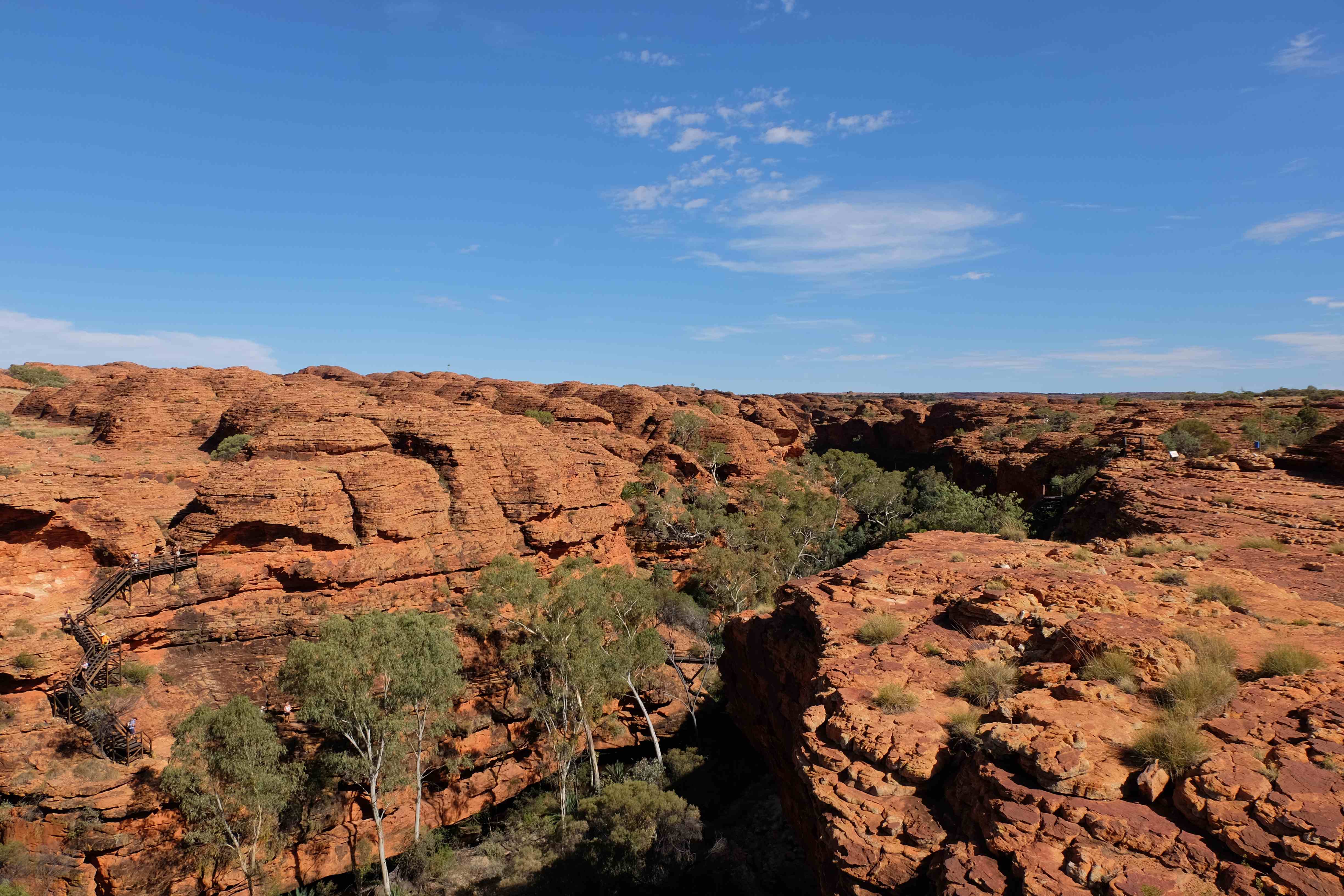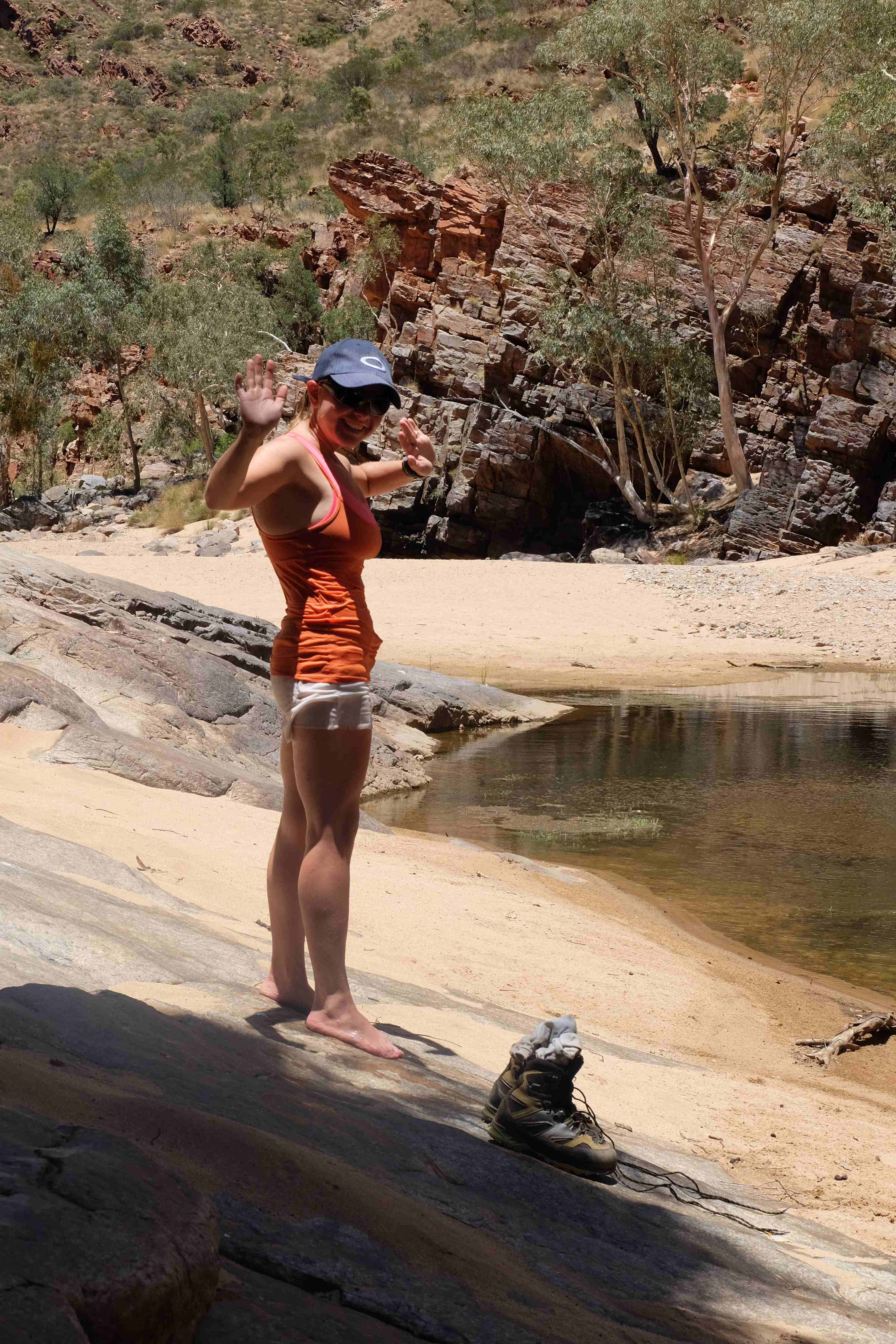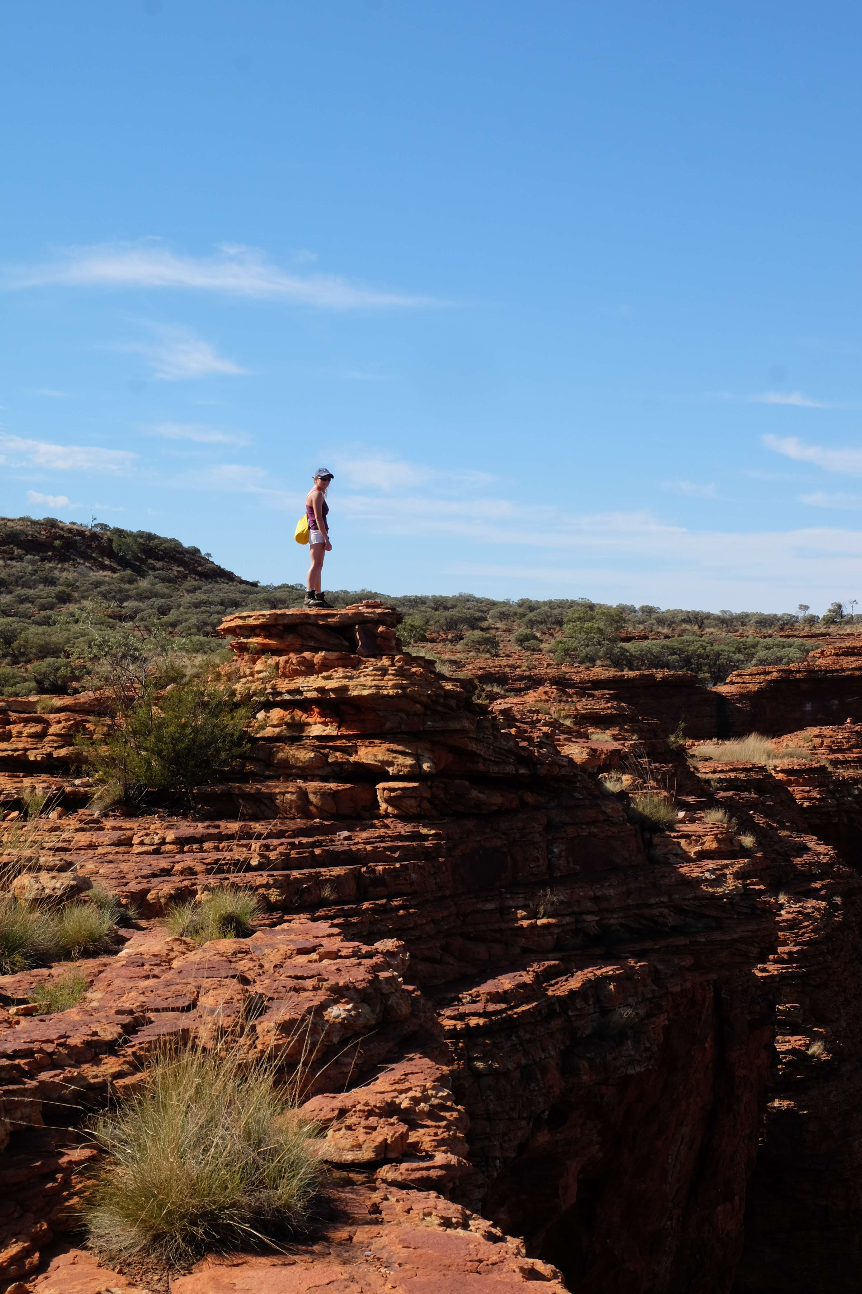 Nach der ersten im Auto verbrachten und mit einem unglaublichen Sonnenaufgang belohnten Nacht ging es morgens früh los – sehr früh, da die Wanderrouten hier aufgrund der lebensbedrohlichen Hitze und Dürre bereits um 9 Uhr morgens geschlossen werden. Wir unterschätzten ein wenig den Kampf gegen die aggressiven australischen Fliegen – die einem scharenweise beim Nasen- , Augen- und Ohrenputzen helfen wollen und sich somit in jedes Loch den Weg bahnen – sowie die vorgegebenen Flüssigkeitsmengen pro Stunden – 1 Liter Wasser pro Stunde ist doch nur normal wenn man der Gattung Kamel angehört! – Erschöpft und erschlagen erreichten wir nach guten 4 Stunden unsere Luxus-Residenz: unser neon-grünes Toyota, welches überhitzt auf uns auf dem Parkplatz wartete. Die Situation schrie einfach nur noch nach einer kalten Dusche, welche wir uns auch gönnten! Wo, fragt ihr euch? In einer der Duschanlagen der überteuerten Ressorts auf der Strecke, welche ebenfalls Mehrbetten-Zimmer mit geteilter Dusche anboten und wo wir uns einbrechermässig hereinschlichen – als seien wir zahlende Gäste – und uns erfrischten. 🙂 Da wir ja wussten, dass zwei weitere nächtliche Luxus-Aufenthalte in unserem Toyota folgten, mussten wir doch einen Weg finden unsere Geruchssinne zu schonen und – sei es auch nur einbrechermässig – zu duschen! 🙂 Frisch, sauber und als hätten wir nichts Unerlaubtes getan stolzierten wir aus den Duschanlagen heraus, begaben uns – als wären wir dortige Gäste – zu unserer schön im Schatten parkierten Luxus-Residenz und setzten unsere Reise fort. 🙂