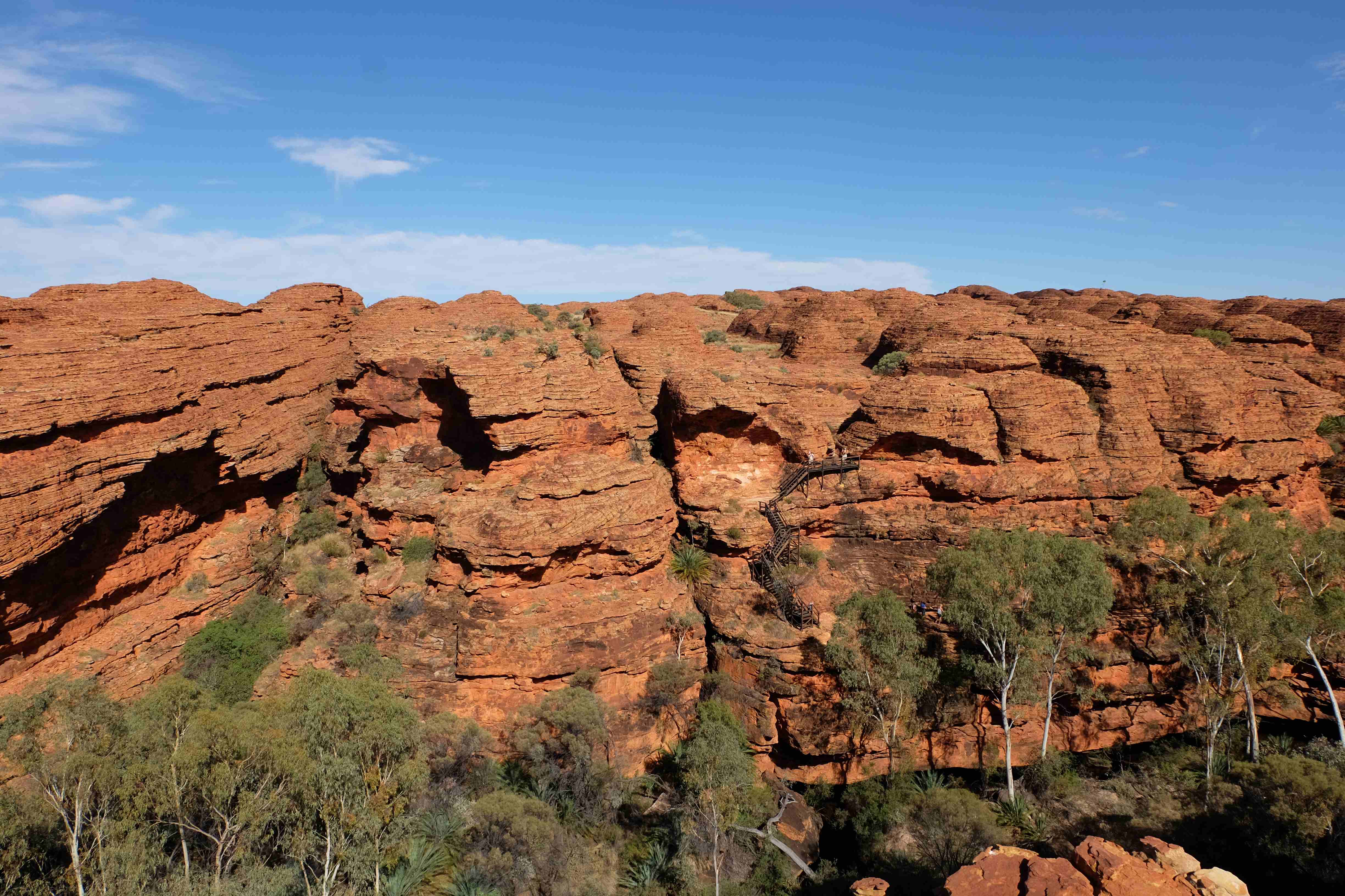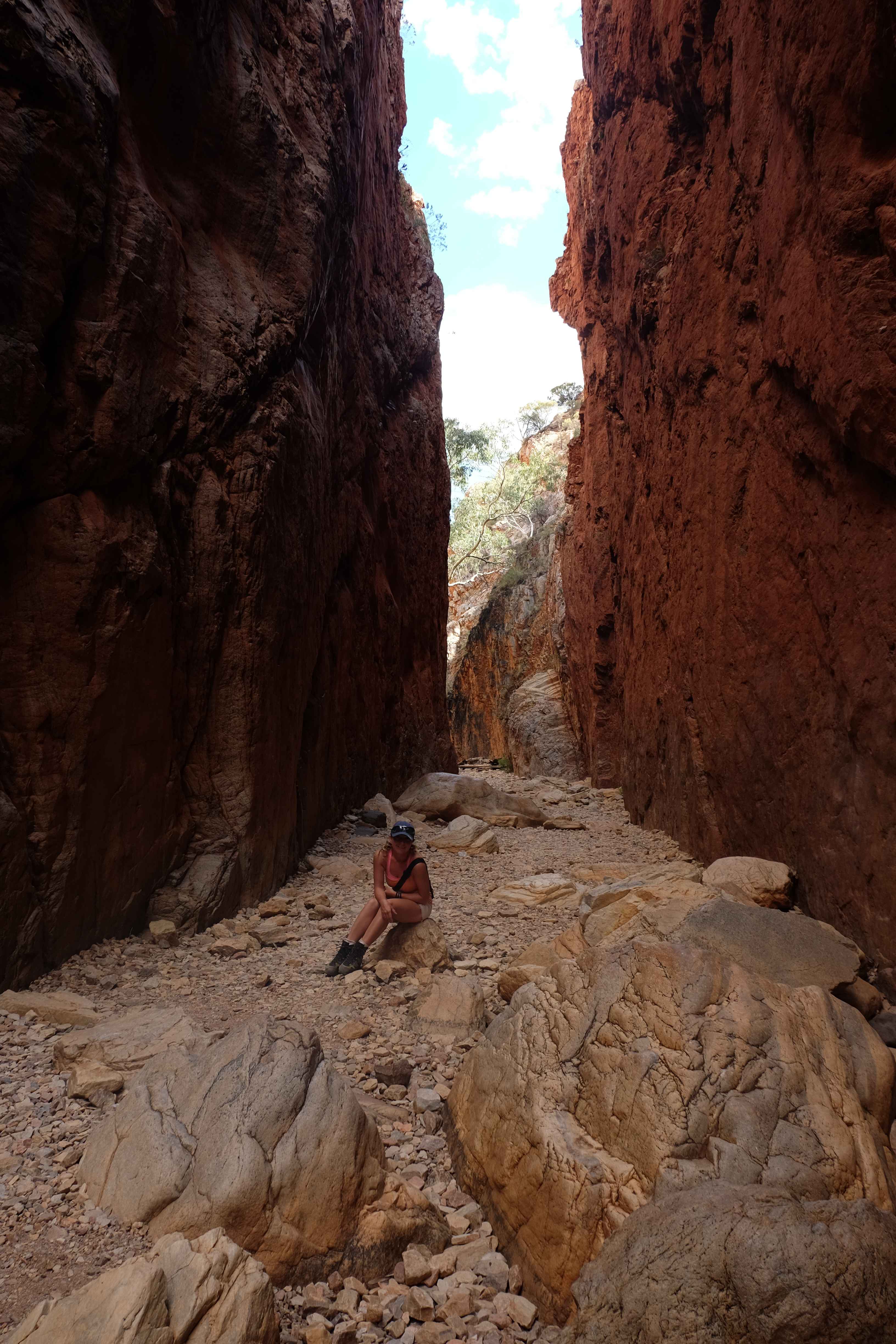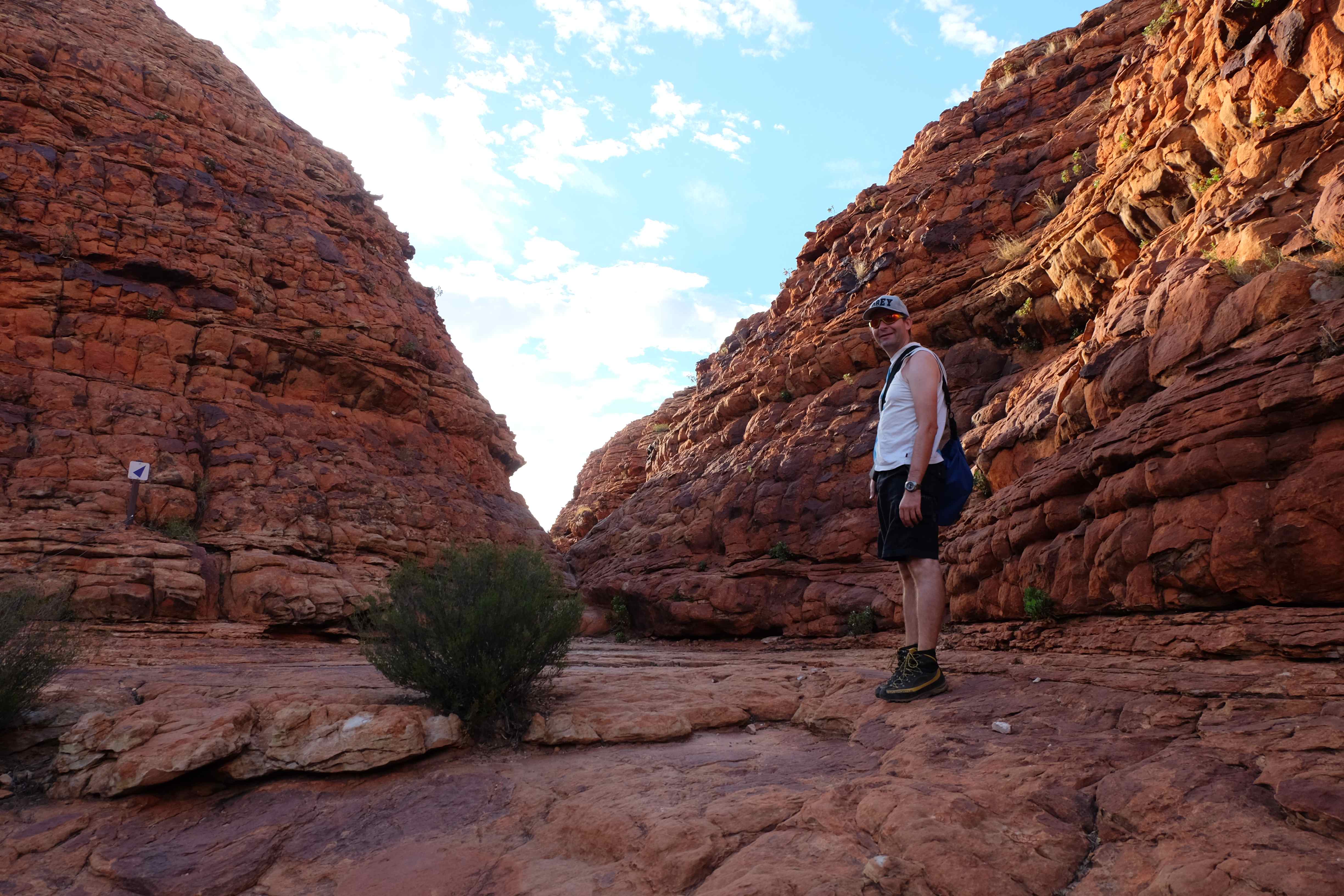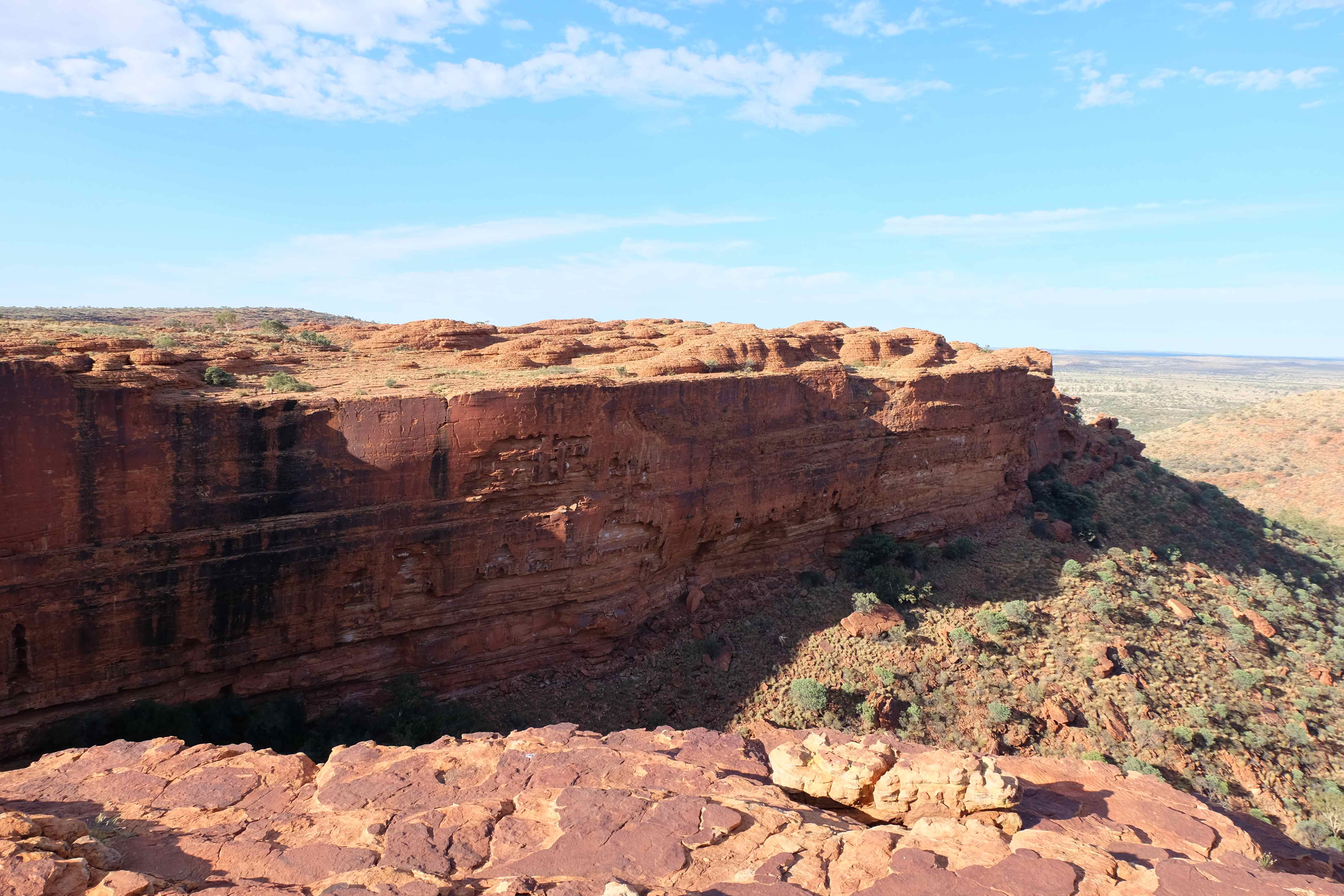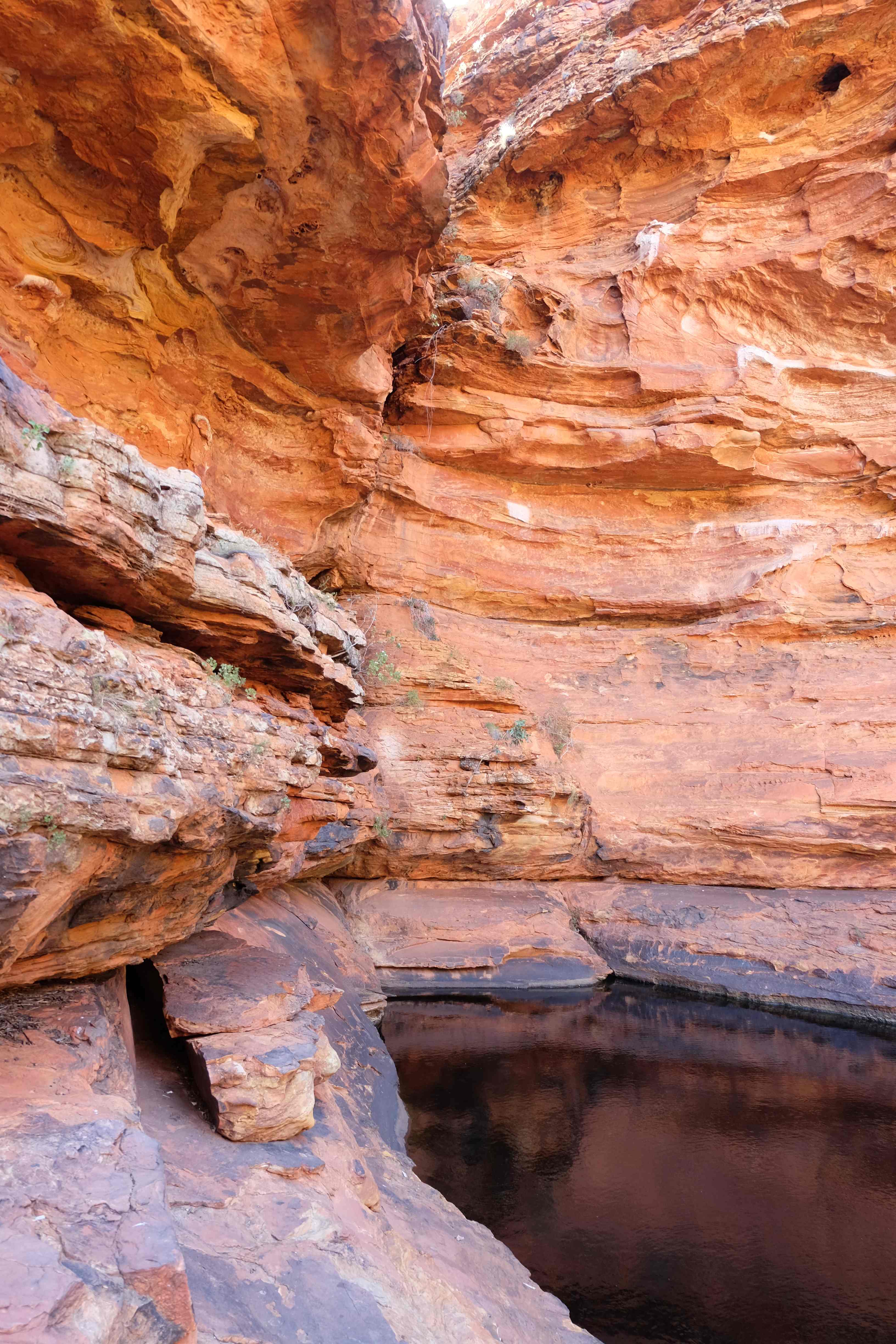 Nach der ersten im Auto verbrachten und mit einem unglaublichen Sonnenaufgang belohnten Nacht ging es morgens früh los – sehr früh, da die Wanderrouten hier aufgrund der lebensbedrohlichen Hitze und Dürre bereits um 9 Uhr morgens geschlossen werden. Wir unterschätzten ein wenig den Kampf gegen die aggressiven australischen Fliegen – die einem scharenweise beim Nasen- , Augen- und Ohrenputzen helfen wollen und sich somit in jedes Loch den Weg bahnen – sowie die vorgegebenen Flüssigkeitsmengen pro Stunden – 1 Liter Wasser pro Stunde ist doch nur normal wenn man der Gattung Kamel angehört! – Erschöpft und erschlagen erreichten wir nach guten 4 Stunden unsere Luxus-Residenz: unser neon-grünes Toyota, welches überhitzt auf uns auf dem Parkplatz wartete. Die Situation schrie einfach nur noch nach einer kalten Dusche, welche wir uns auch gönnten! Wo, fragt ihr euch? In einer der Duschanlagen der überteuerten Ressorts auf der Strecke, welche ebenfalls Mehrbetten-Zimmer mit geteilter Dusche anboten und wo wir uns einbrechermässig hereinschlichen – als seien wir zahlende Gäste – und uns erfrischten. 🙂 Da wir ja wussten, dass zwei weitere nächtliche Luxus-Aufenthalte in unserem Toyota folgten, mussten wir doch einen Weg finden unsere Geruchssinne zu schonen und – sei es auch nur einbrechermässig – zu duschen! 🙂 Frisch, sauber und als hätten wir nichts Unerlaubtes getan stolzierten wir aus den Duschanlagen heraus, begaben uns – als wären wir dortige Gäste – zu unserer schön im Schatten parkierten Luxus-Residenz und setzten unsere Reise fort. 🙂