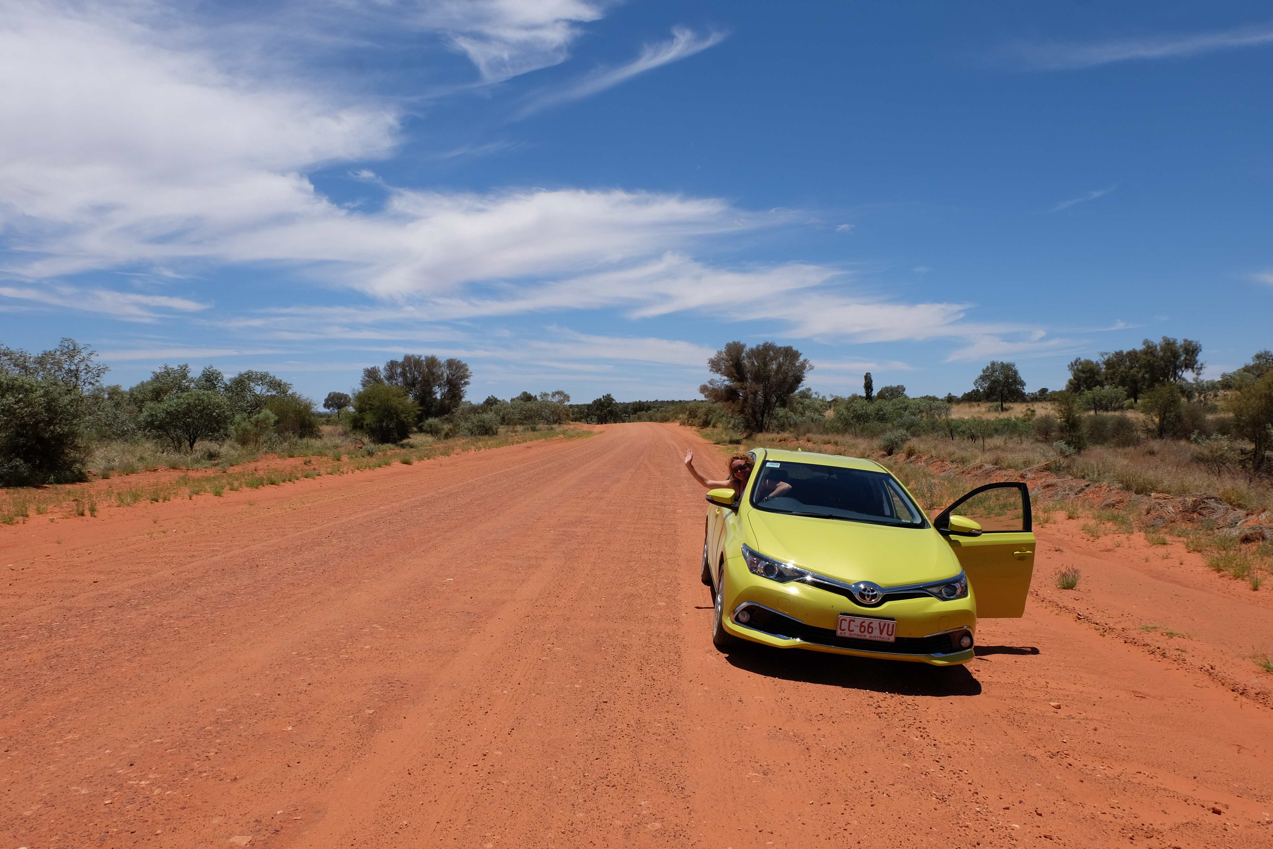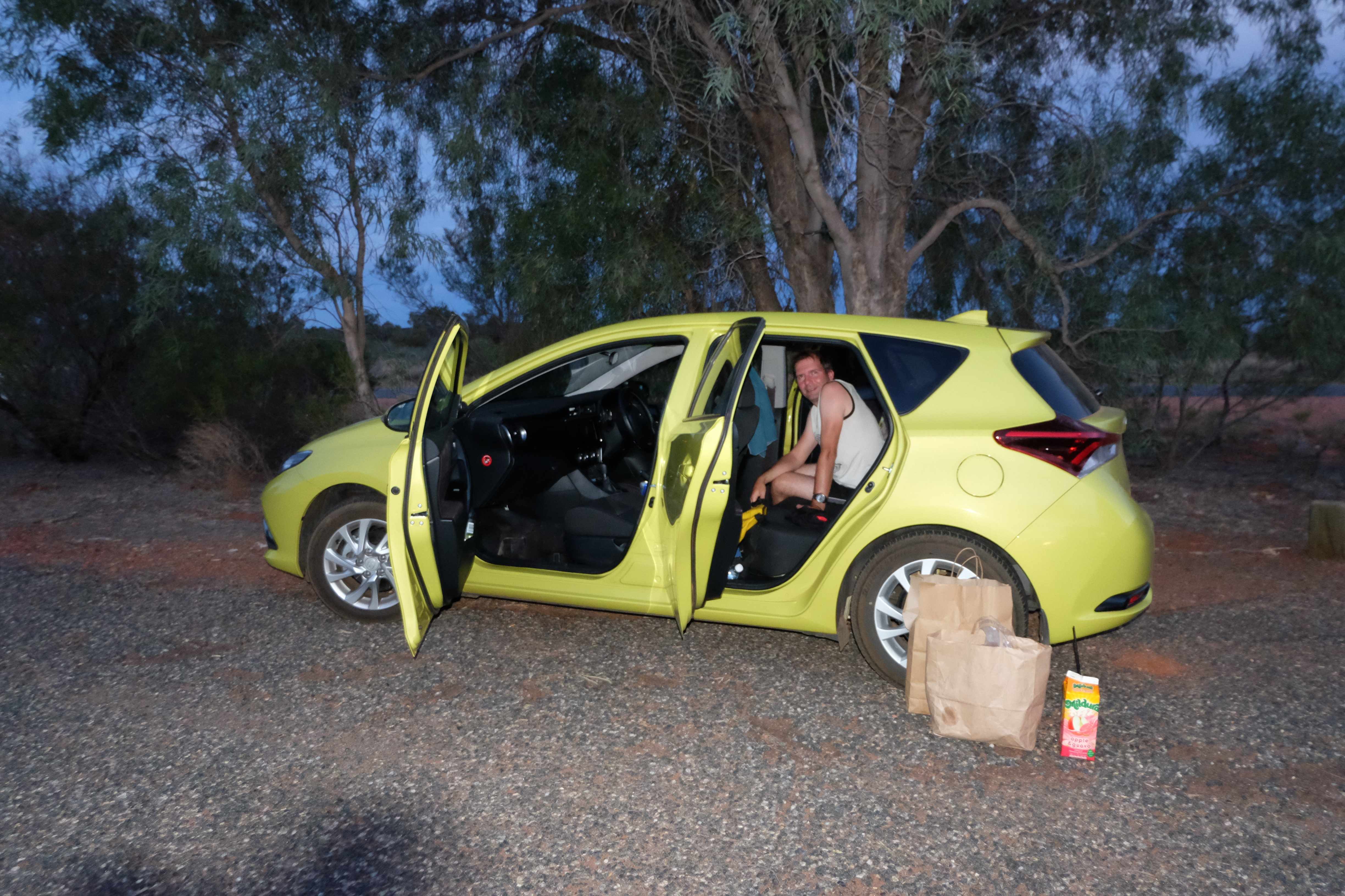 Ein Tag später und ein Kilo Geld leichter machten wir uns in unserer gemieteten Luxuskarosse auf den Weg zu den Sehenswürdigkeiten und schliesslich nach Alice Springs. Die Entscheidung war getroffen: das Budget-Loch musste repariert werden: Schlafen im Auto war angesagt! Aus jedoch unerklärbaren Gründen verspürten wir nach einem vollen Tag den Drang zurück zu unserem Lieblingsflughafen zu gehen und diesen für ein drittes und letztes Mal besichtigen – wir mussten nämlich das Auto wechseln. Die zweite Luxuskarosse die wir erhielten war Luxus als Preis jedoch Miniatur als Masse, so dass mit dem Auto auch einige Yoga-Lektionen inbegriffen waren – aber was soll’s, schlafen und dabei gleichzeitig Kontorsionismus trainieren ist auch etwas Spezielles! 🙂 Hier einige Bilder von unserem dortigen Abenteuer: