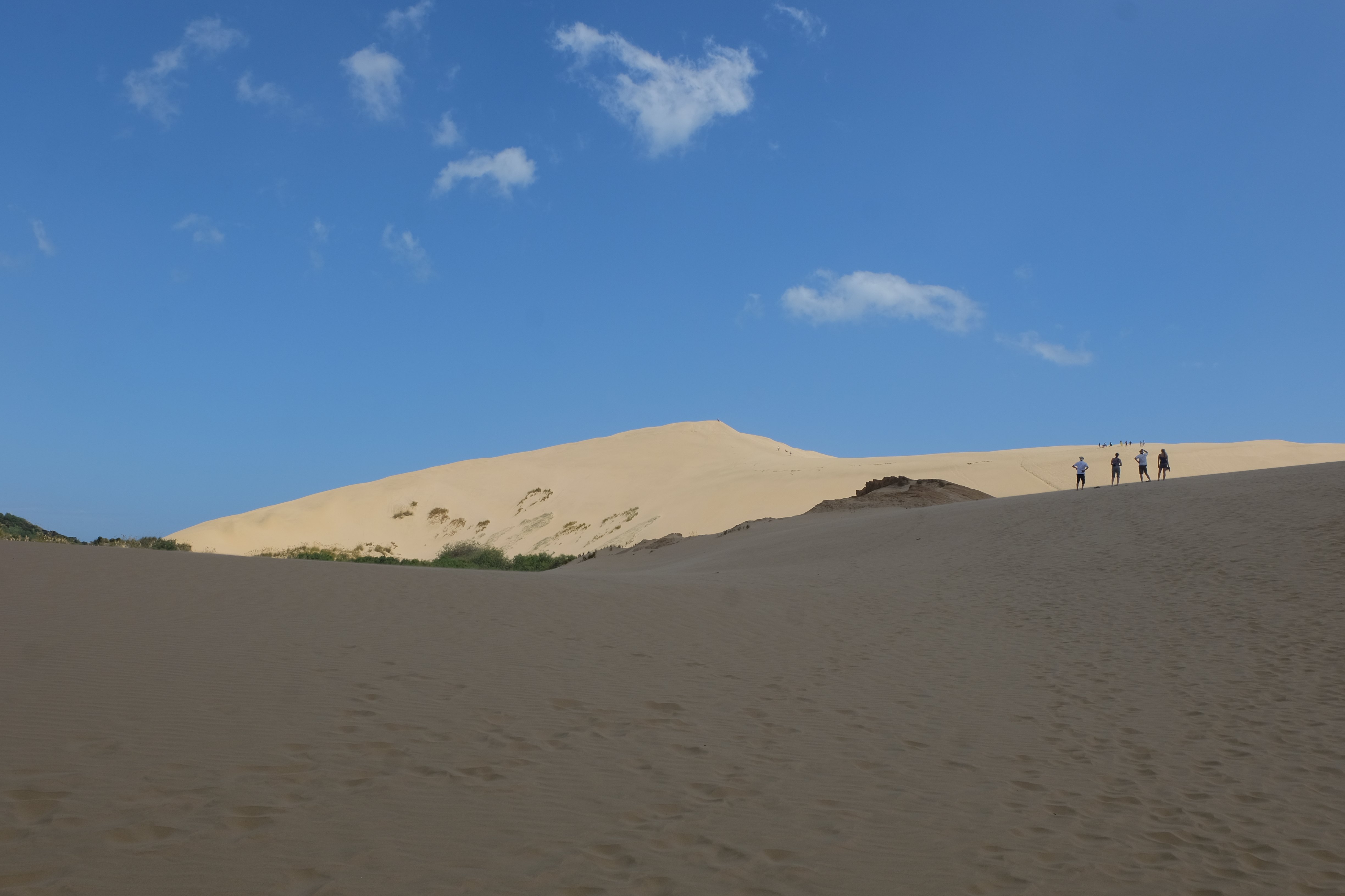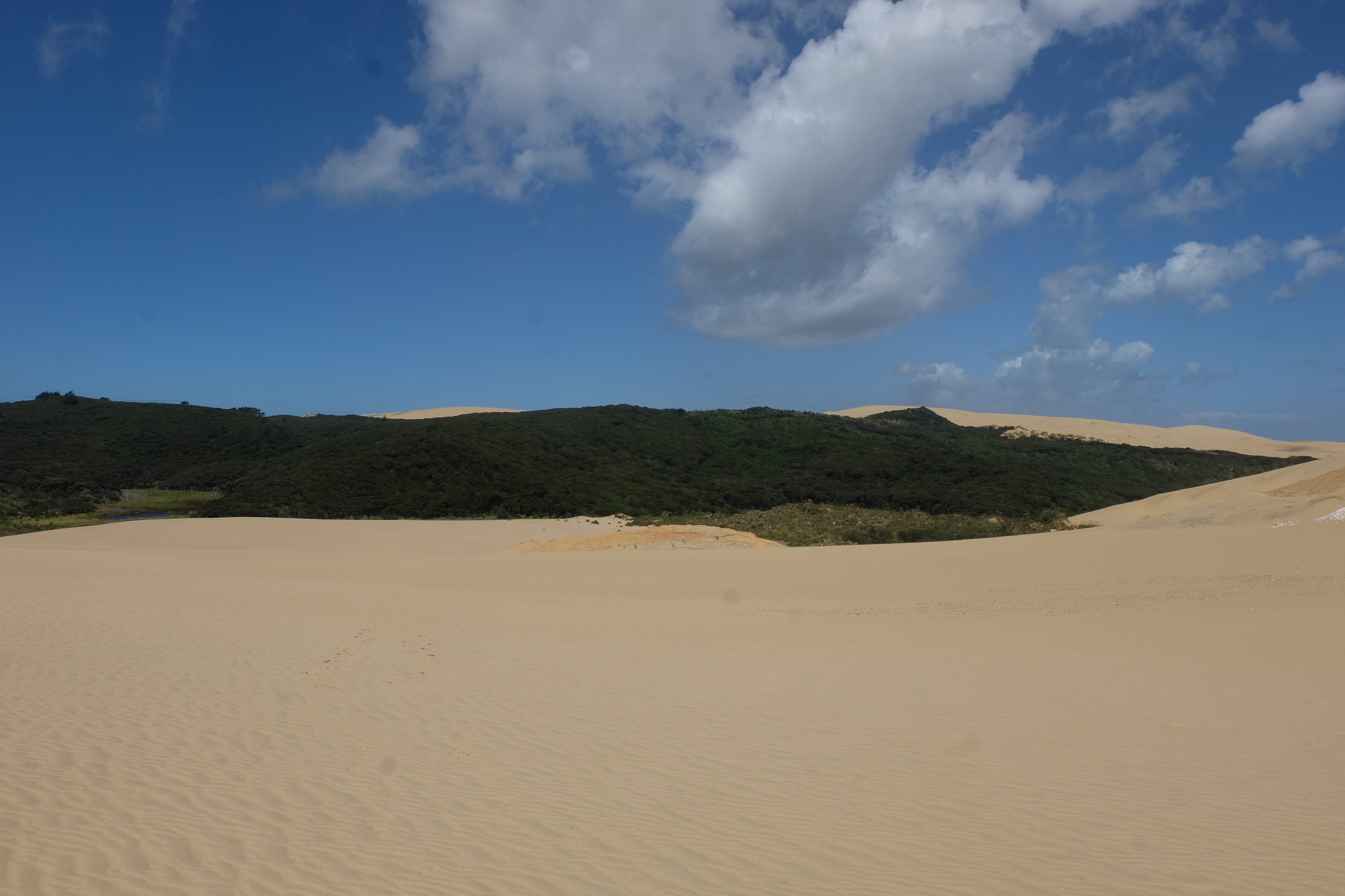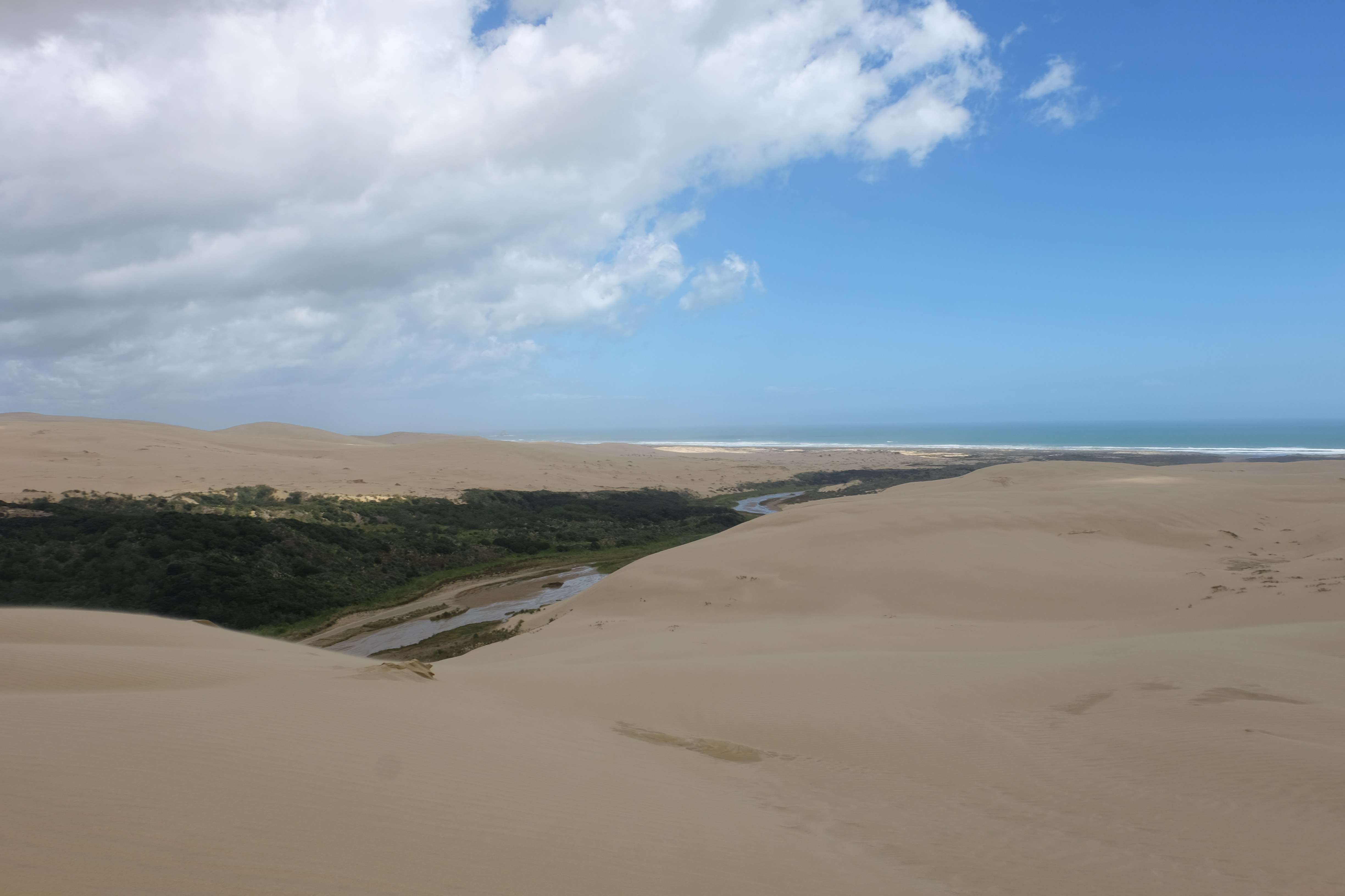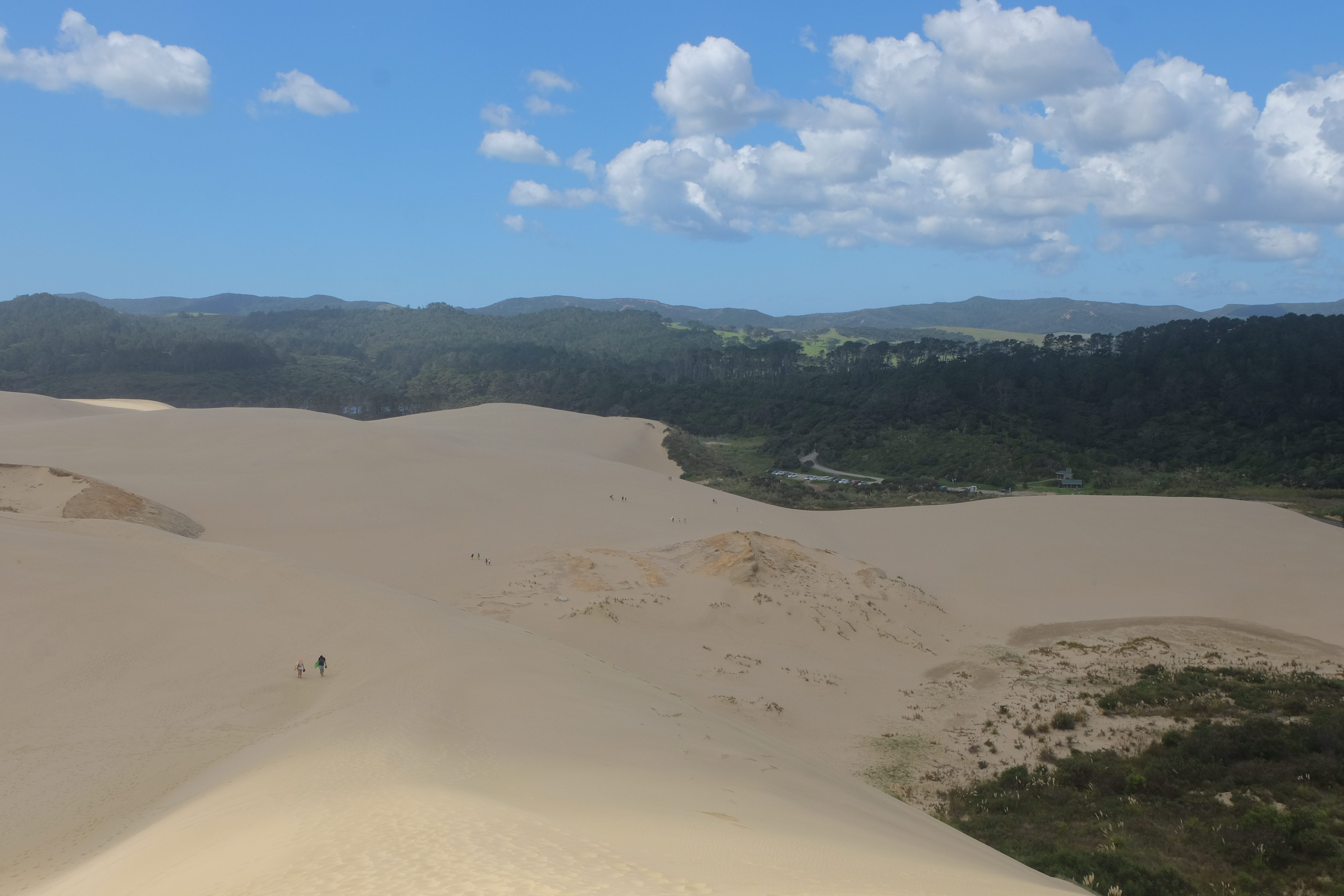 Mai in nord, da, insa cat de in nord? Ei, daca facem ceva, atunci sa o facem pana la capat! O zi lunga, un drum si mai lung si multe ore de condus in acea zi, insa ne-am dus pana la dunele de nisip gigante. Da, ati citit bine si nu, nu ne-am ratacit din nou… ne aflam inca in Noua Zeelanda si nu intr-un desert tropical… si totusi: dune de nisip! De-a dreptul incredibil: in mijlocul dunei de nisip o dunga verde: padure deasa! Ascuns in spatele unor coline de nisip, un peisaj stancos si pe partea cealalta oceanul. Ceva unic! La fel de unic ca si arsurile superficiale cu care ne-am ales in timp ce am urcat desculti pe duna. Bineinteles ca aveam pantofii la noi si am vrut sa ii incaltam cel tarziu in momentul in care talpile noastre au devenit de un roz aprins… insa ia incercati voi sa va luati pantofii in picioare in timp ce va aflati pe un deal de nisip. Mult noroc! La urma urmei a trebuit sa alegem intre arsuri la fund sau la talpi. Si am decis… 🙂
