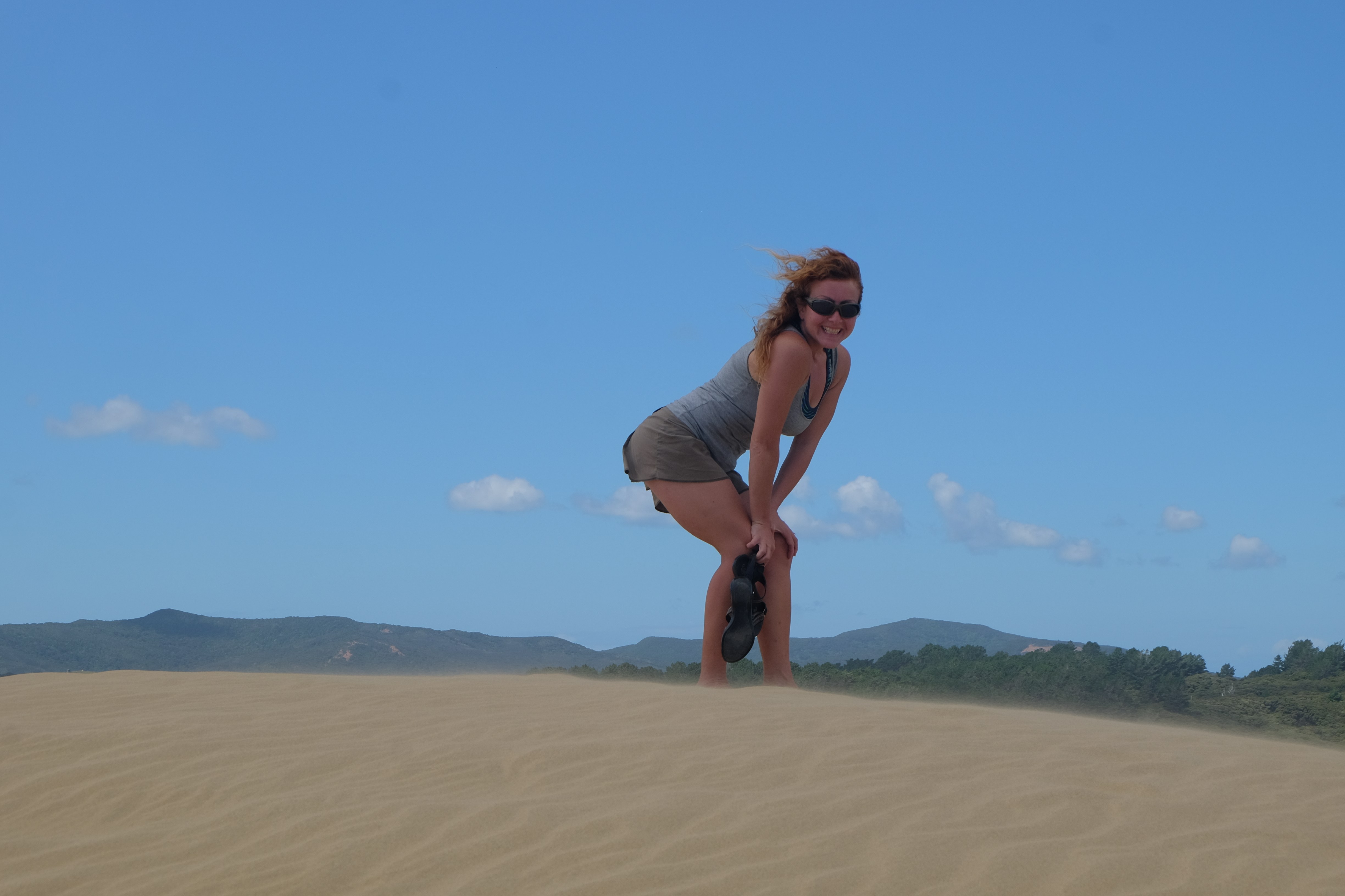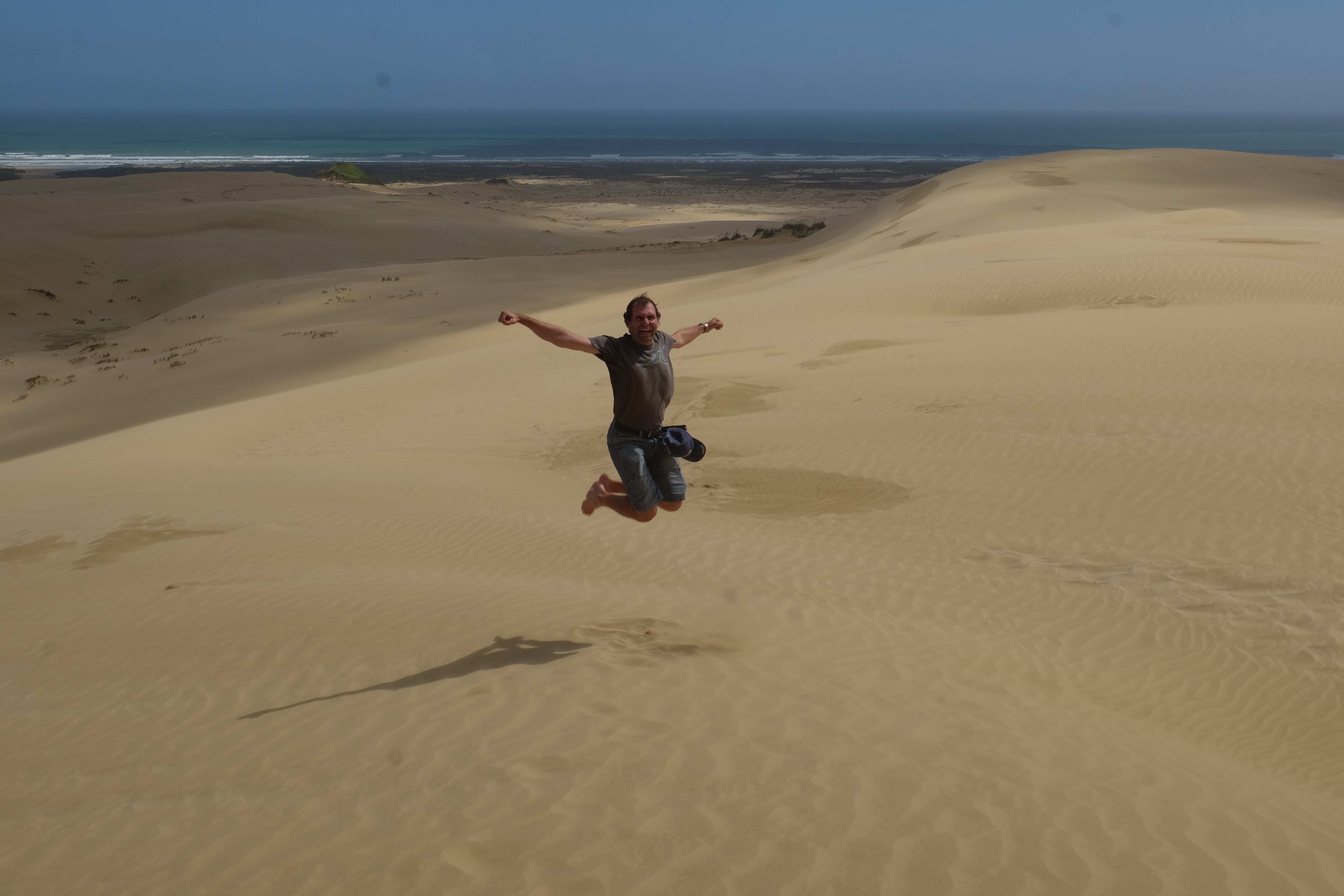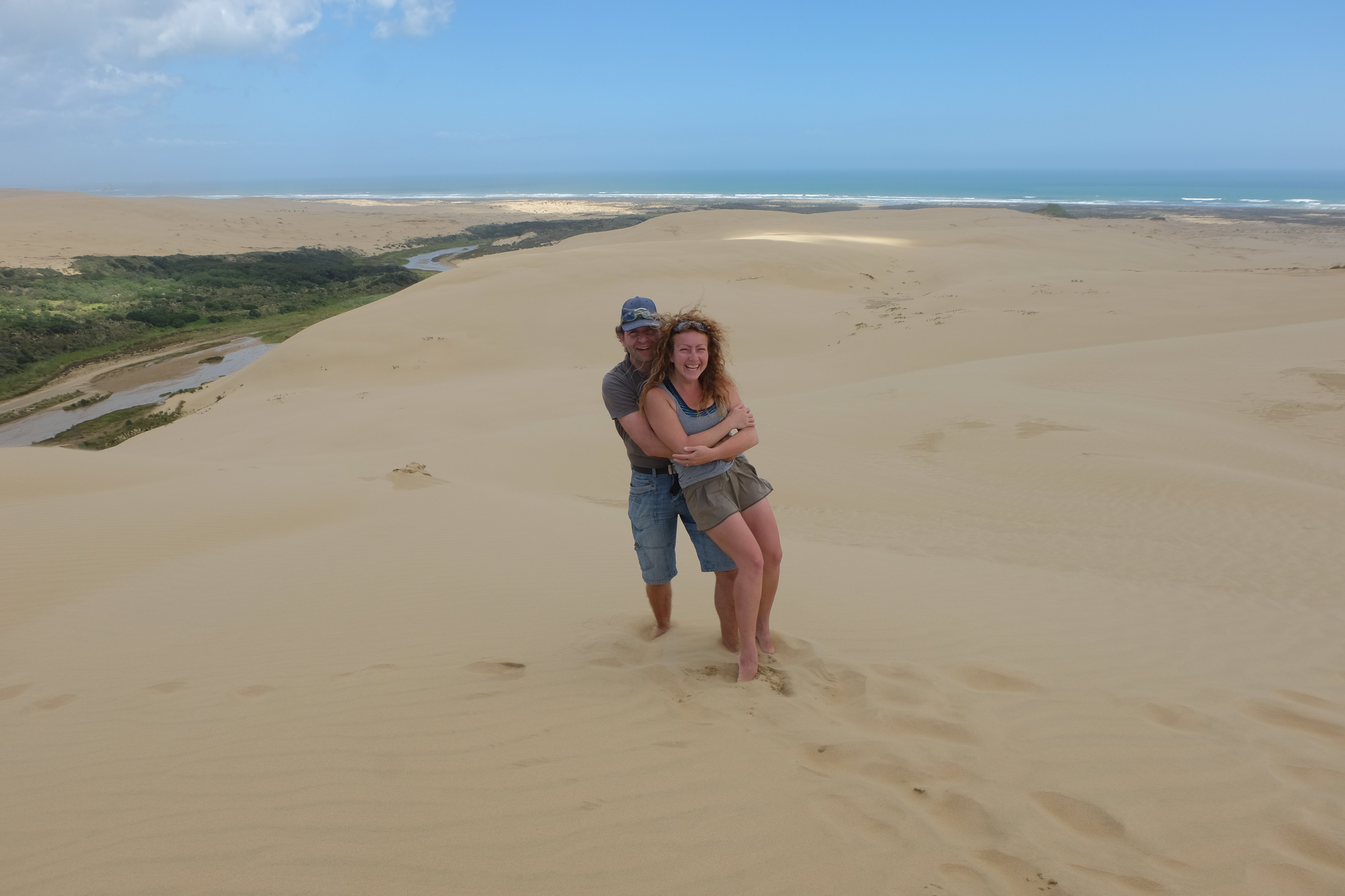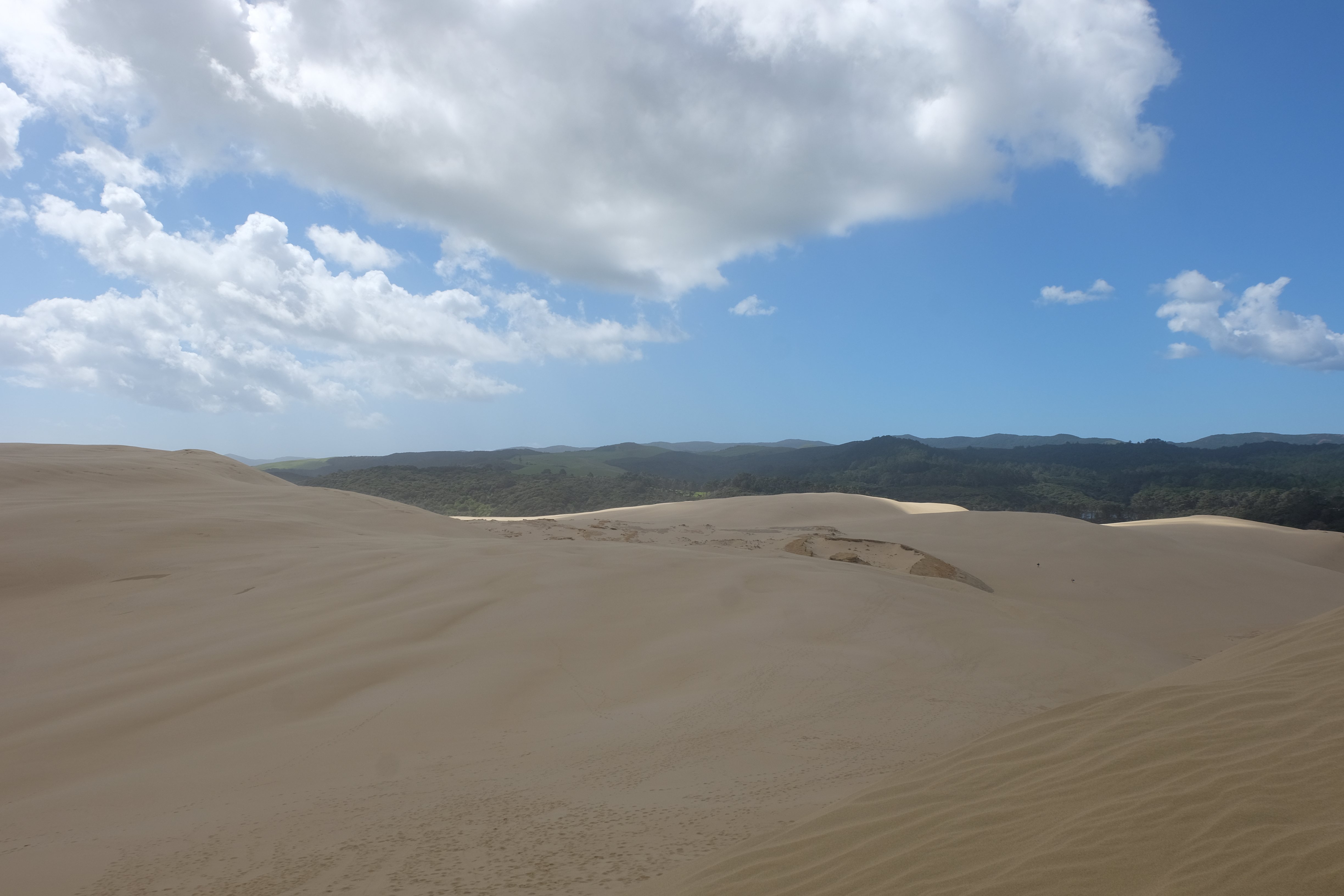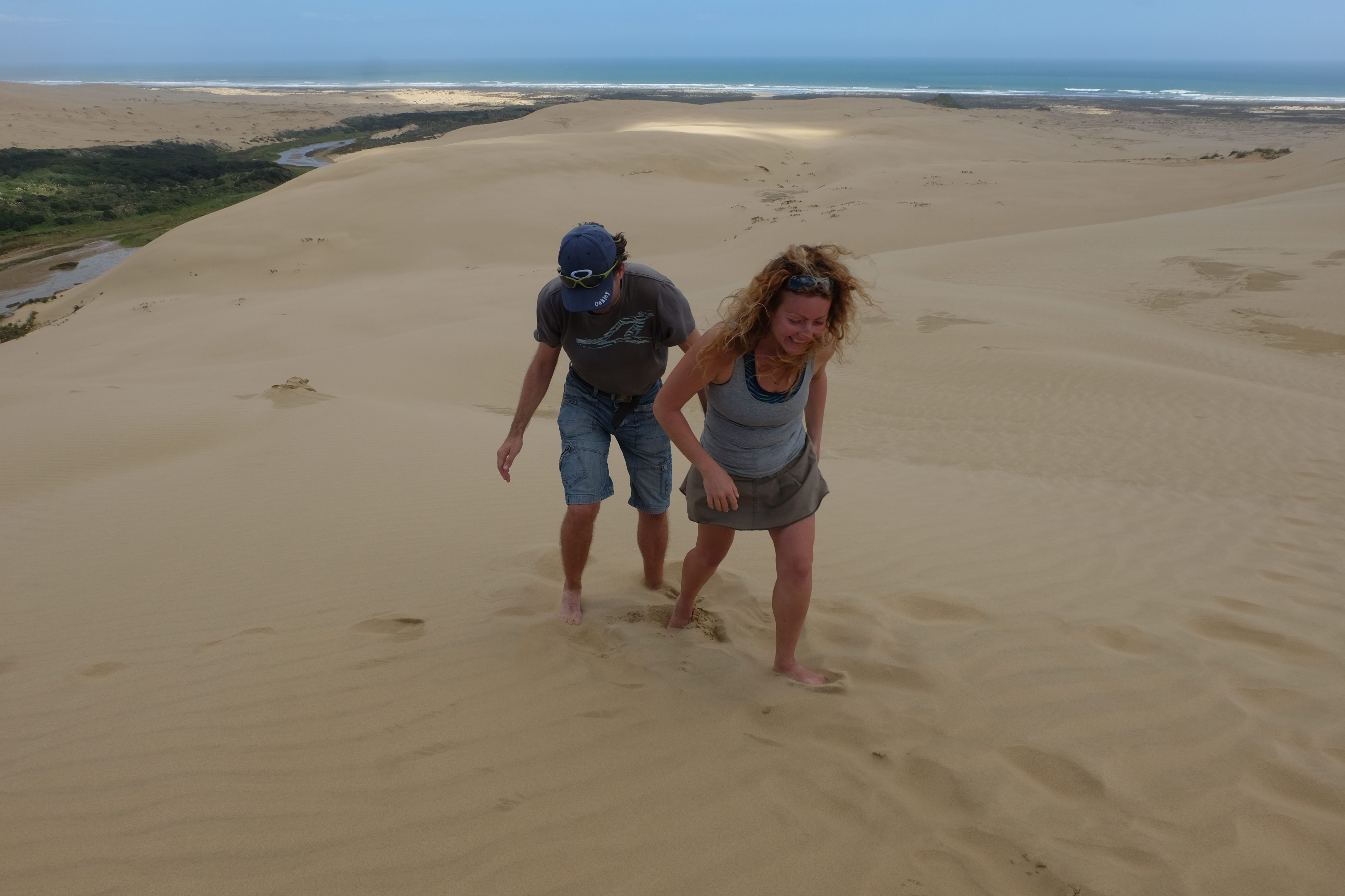 Weiter nördlich, ja wie weit nördlich denn? Wenn schon, dann schon! Eine lange Strecke, ein Tag mit vielen Fahrstunden hin und zurück, aber durchaus die beste Entscheidung. Wir gingen zu den riesigen Sanddünen. Ja, ihr habt es richtig gelesen und nein, wir verliefen und nicht schon wieder… wir waren in Neuseeland und nicht in einer tropischen Wüste… und trotzdem: Sanddünen! Und zwar so unglaublich: mitten in der Sanddüne ein grüner Waldstreifen, dann wieder mal etwas Sand, eine versteckte Steinlandschaft und schliesslich das Meer am anderen Ende. Einmalig! Genau so einmalig wie die oberflächlichen Verbrennungen, die wir uns holten während wir barfuss die Sanddüne erklommen. Natürlich hatten wir die Schuhe dabei und wollten diese spätestens dann anlegen, als unsere Sohlen knall-rosarot wurden, aber versucht ihr mal auf einem Sandhügel laufend Schuhe anzulegen. Viel Spass! Schlussendlich ging es darum zu entscheiden: wollten wir Arsch- oder Sohlenverbrennungen haben? Und wir entschieden… 🙂