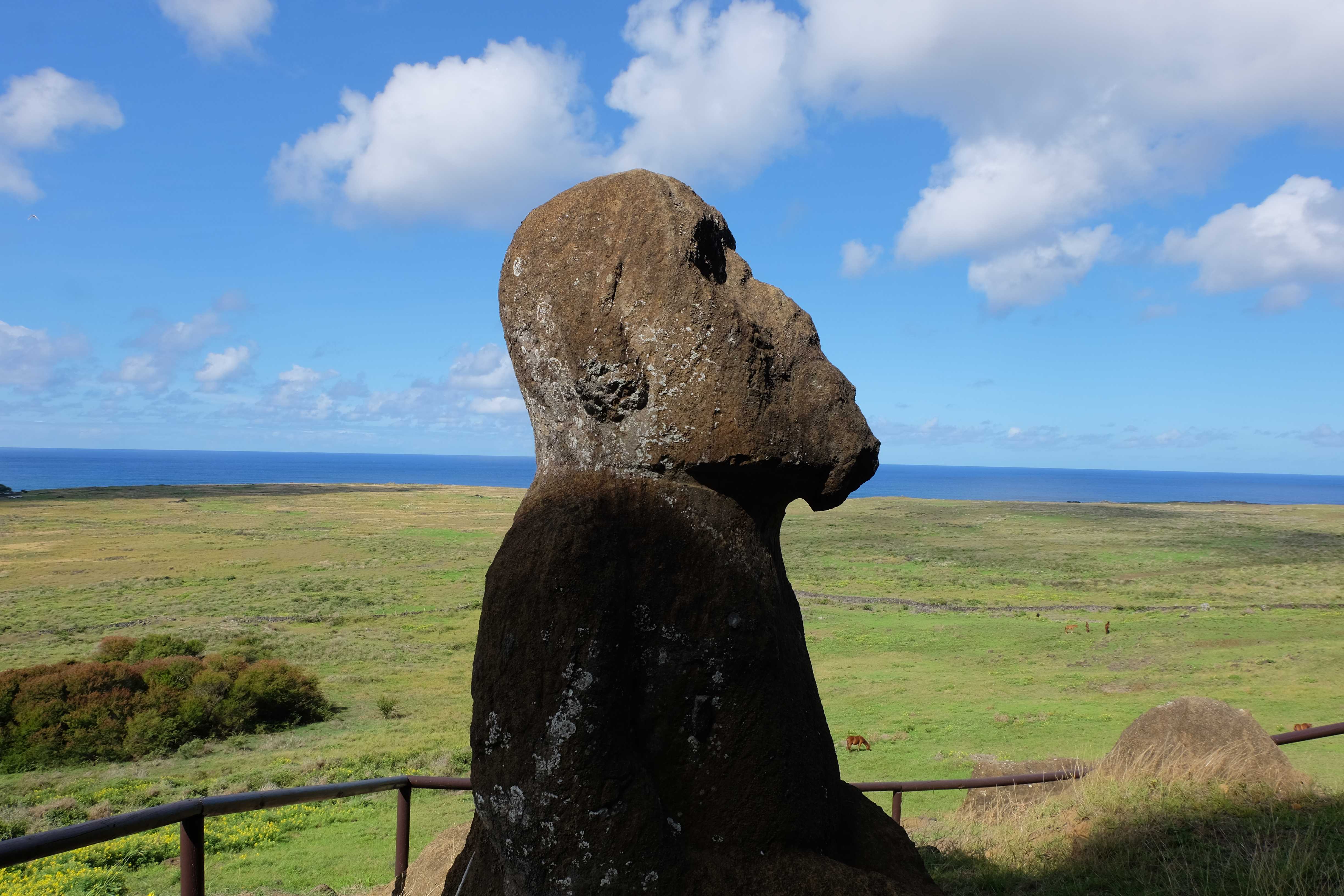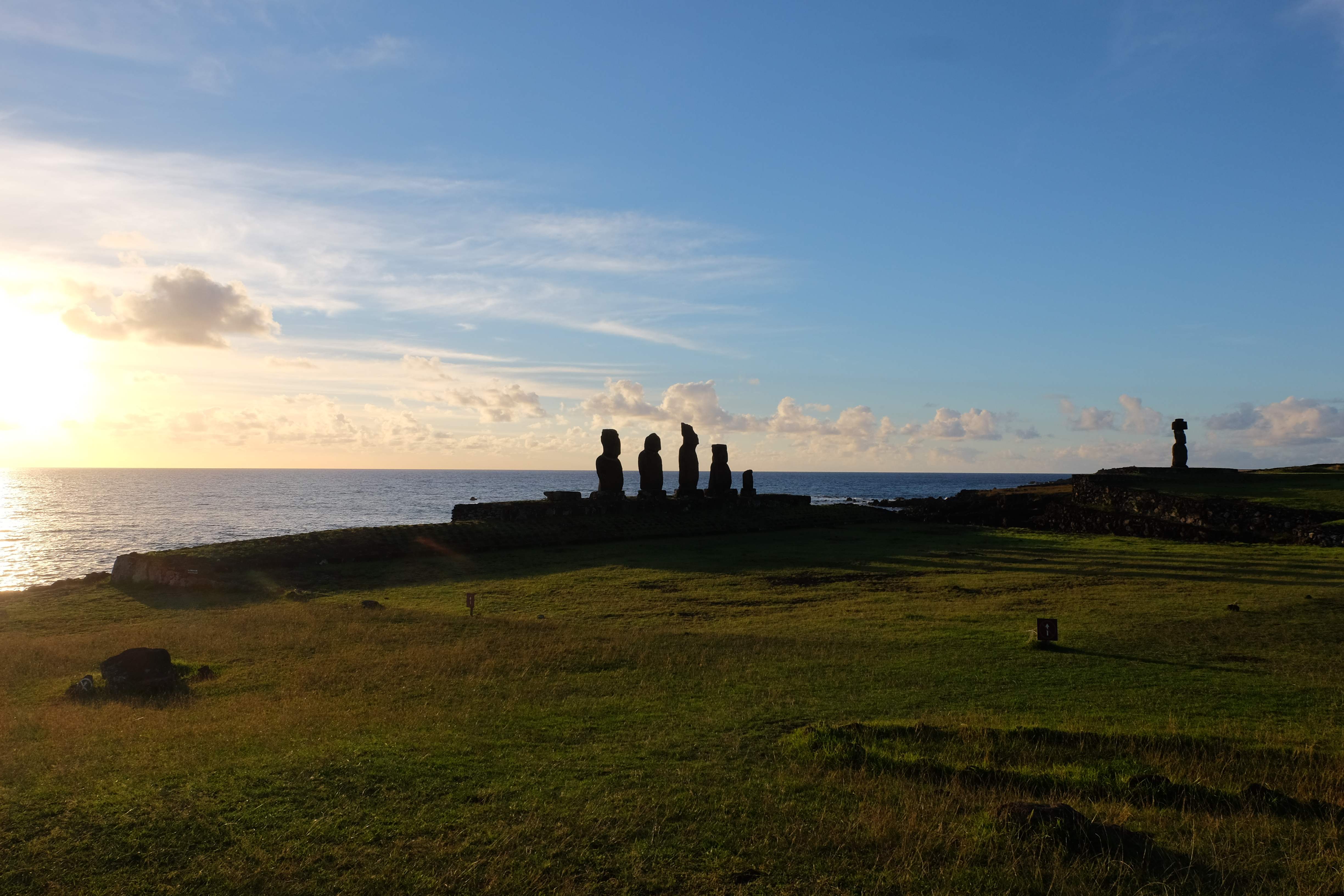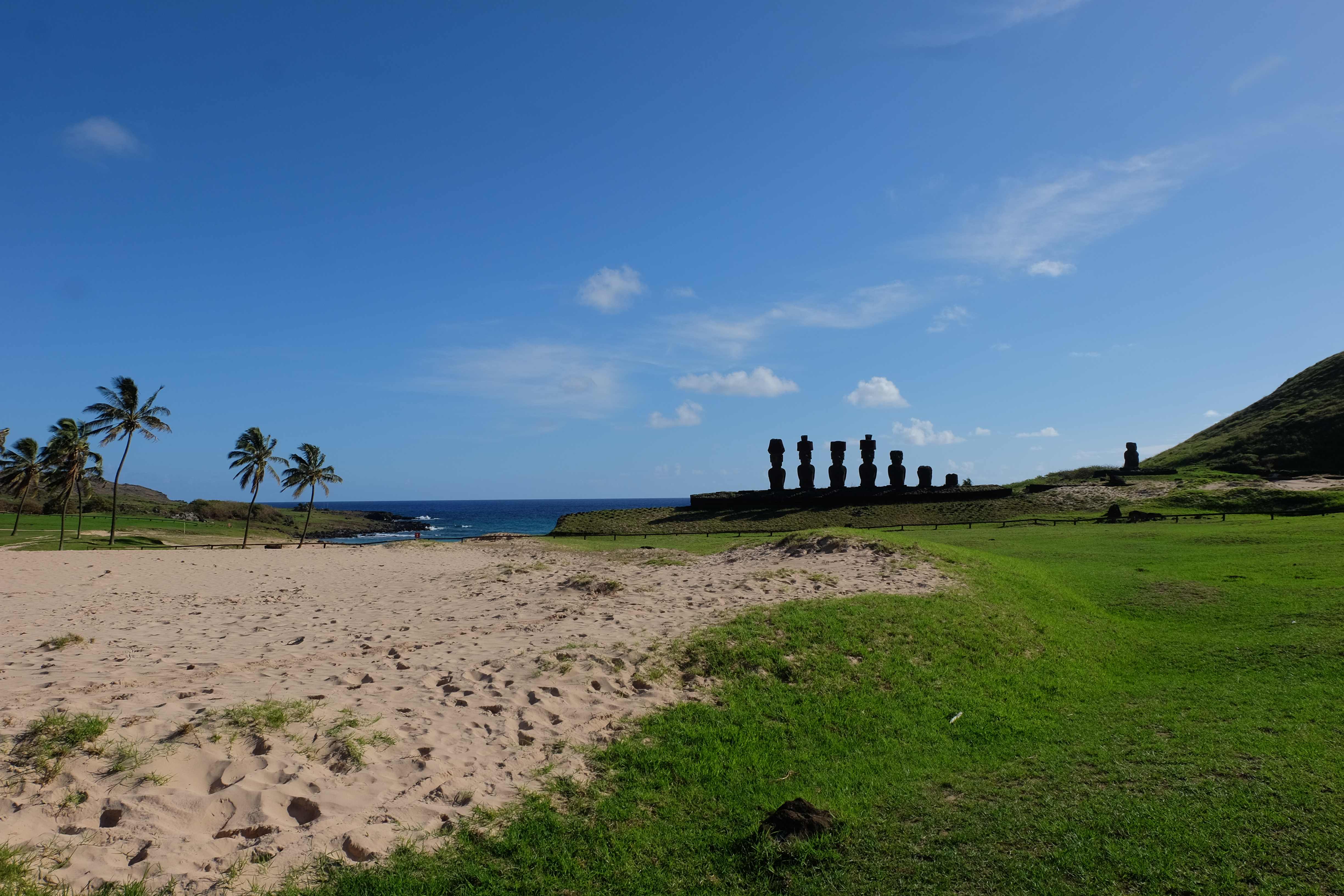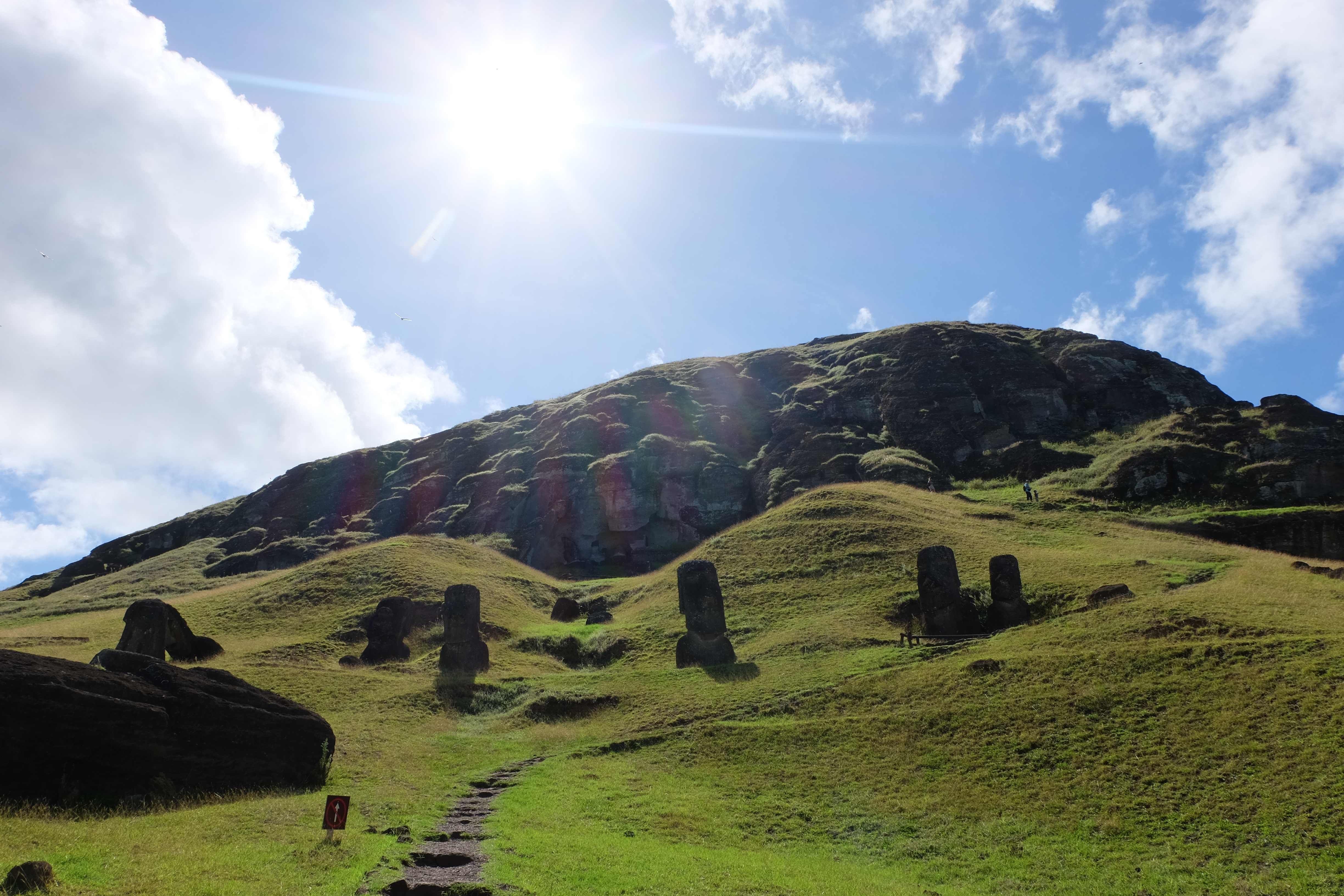 Auf der Osterinsel gibt es vieles zu erkunden sobald man die Hauptsiedlung verlässt. Spuren einer alten Kultur warten auf einen um ihm die Geschichte der ersten Segler zu erzählen, welche auf einem Boot hierhin gekommen waren und die Rapa Nui Kultur auf diesen Landfleck mitten im Ozean mit sich brachten. Riesige, imposante Steinstrukturen zu Männern, legendären Vorfahren und für die Einheimischen nicht nur interessanten, sondern auch bedeutungstragenden Gesichtern geformt weisen von einer mystischen und mythischen Zeit zugleich, welche hierzulande, weit weg vom Rest der Welt – während die Inkas, Mayas und Azteken dem südamerikanischen Kontinenten zu einer Blütezeit verhalfen – die Wiege einer eigenen Kultur schuf: die Rapa Nui. Es war ein unglaublich schönes, gewaltiges jedoch unerklärbar mystisches Gefühl diesen riesigen Steinen in menschlicher Gestalt gegenüberzustehen, ihre Präsenz lediglich als unaufgeklärte Nichtkenner wahrzunehmen und dabei trotzdem den Hauch einer gewissen zeitüberdauernden Hinterlassenschaft zu spüren. Riesige Zeremonie-Anlagen, ganze Hügel voller alten steinigen Gestalten, aus dem Nichts herausragende und geheimnisvolle „Männlein mit Hut“… und das überall, an allen Seiten einschränkende Wasser, welches einen ständig erinnerte, dass man sich lediglich auf einem Fleck Land befindet… die Kombination all dieser Gegebenheiten verwandelten die Osterinsel in einen speziellen Ort, an welchem man sich fremd und wohl zugleich fühlte.