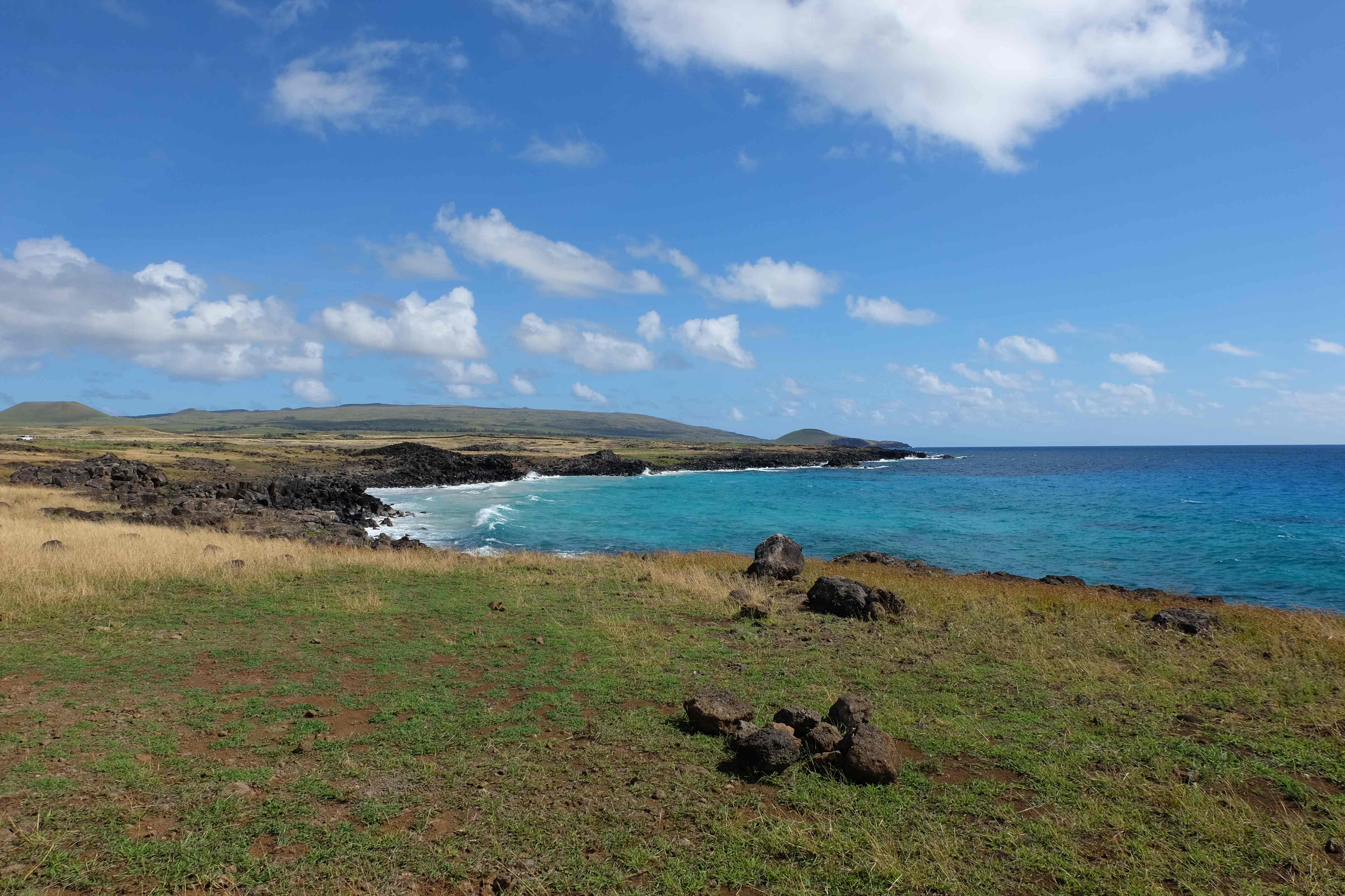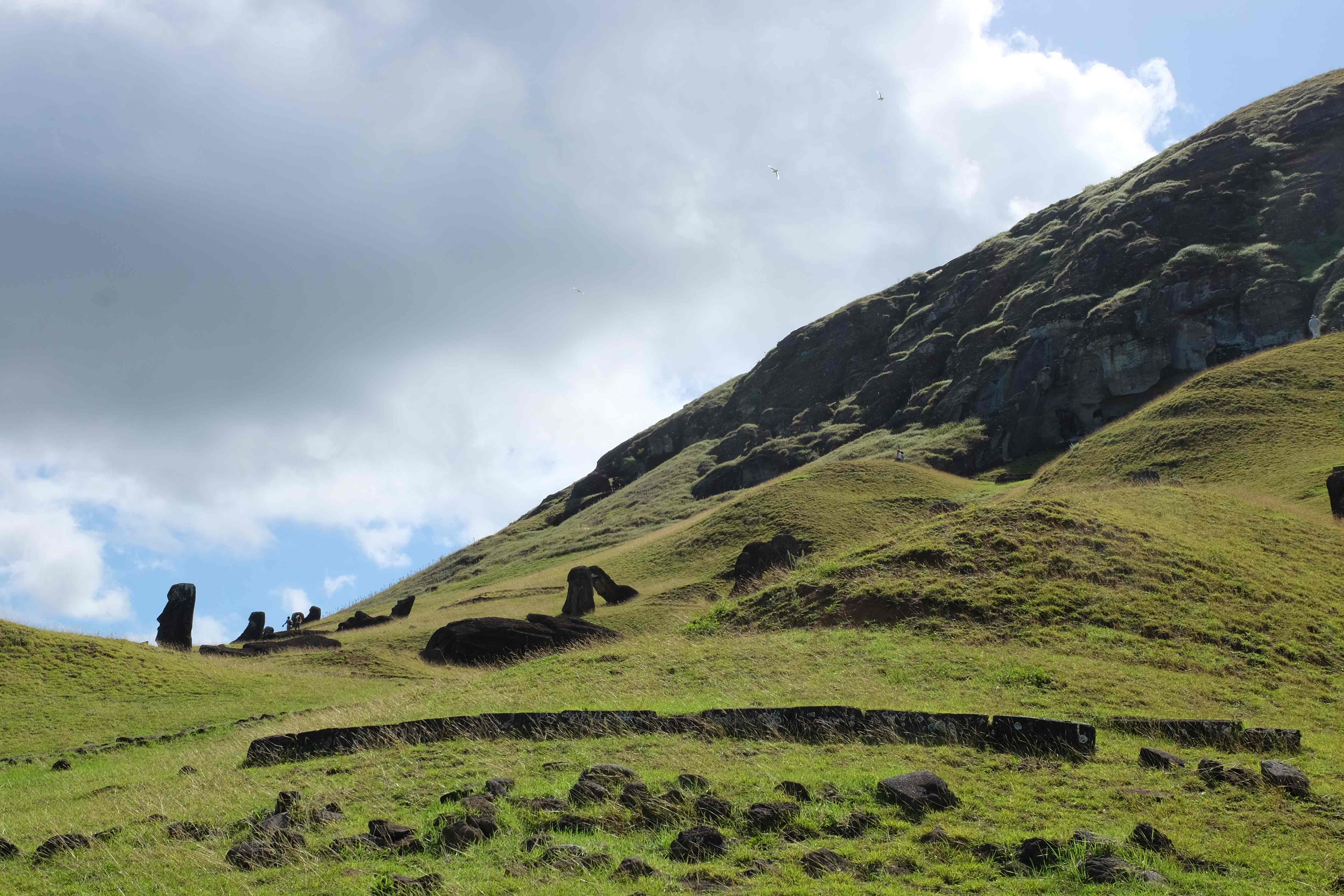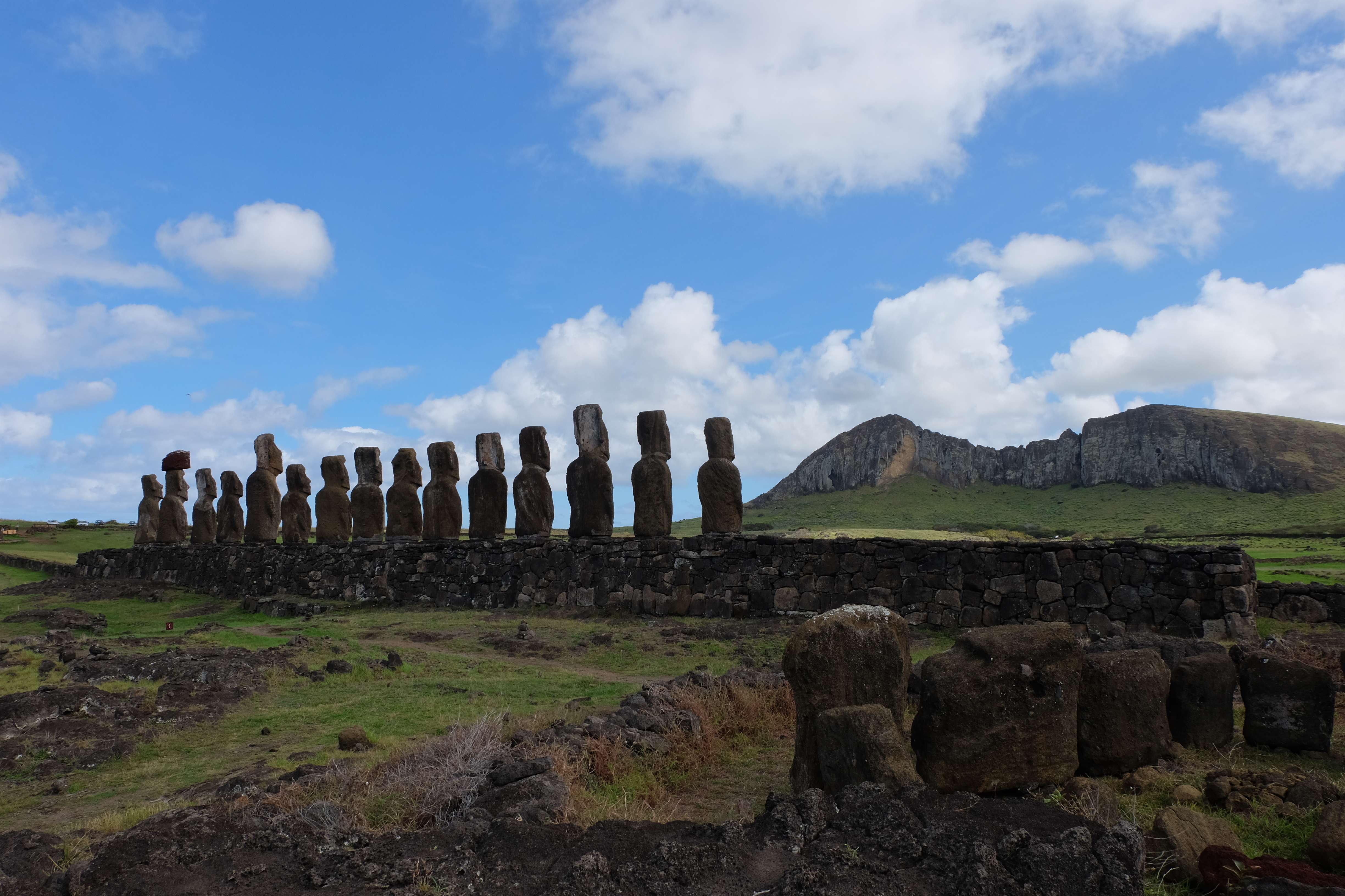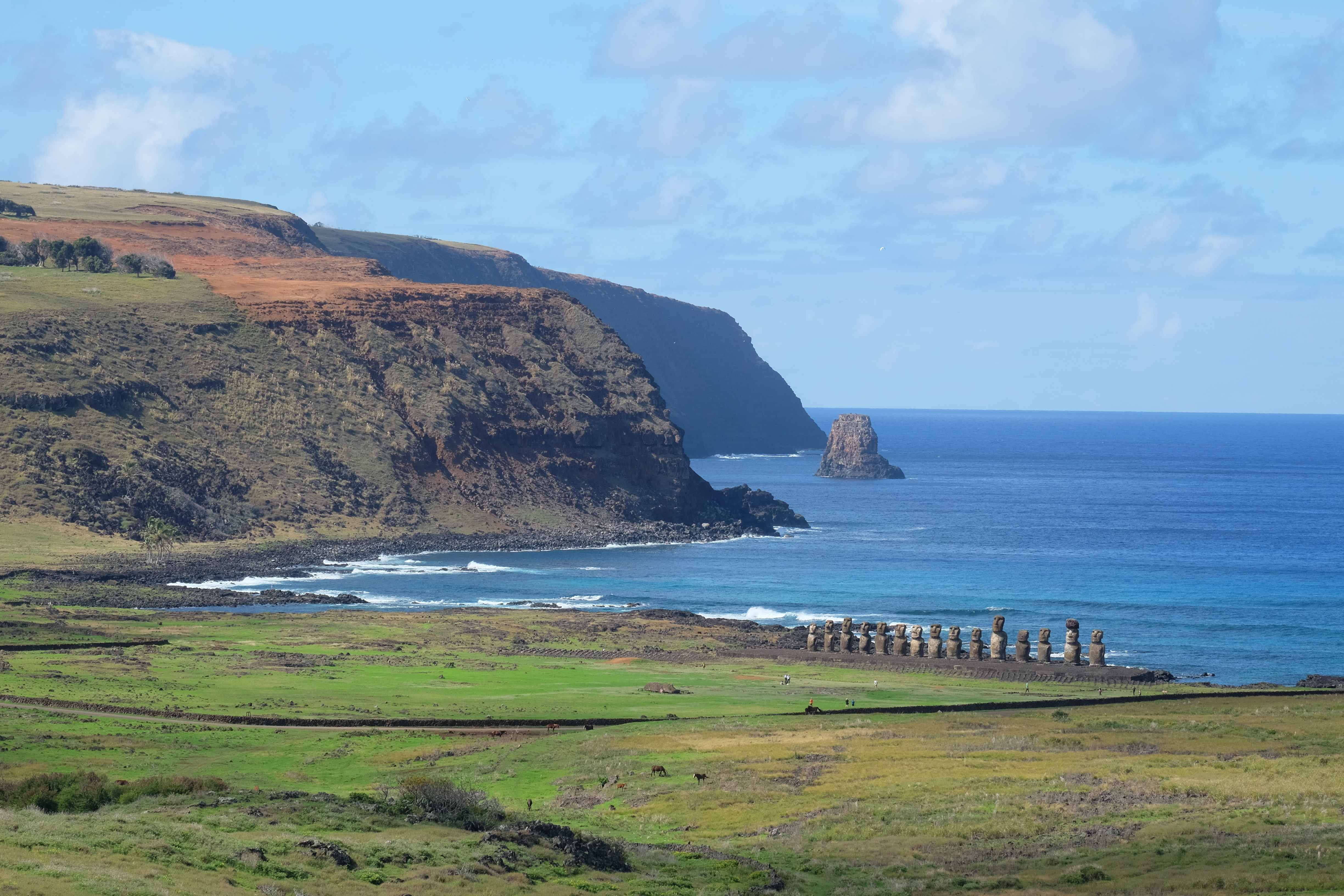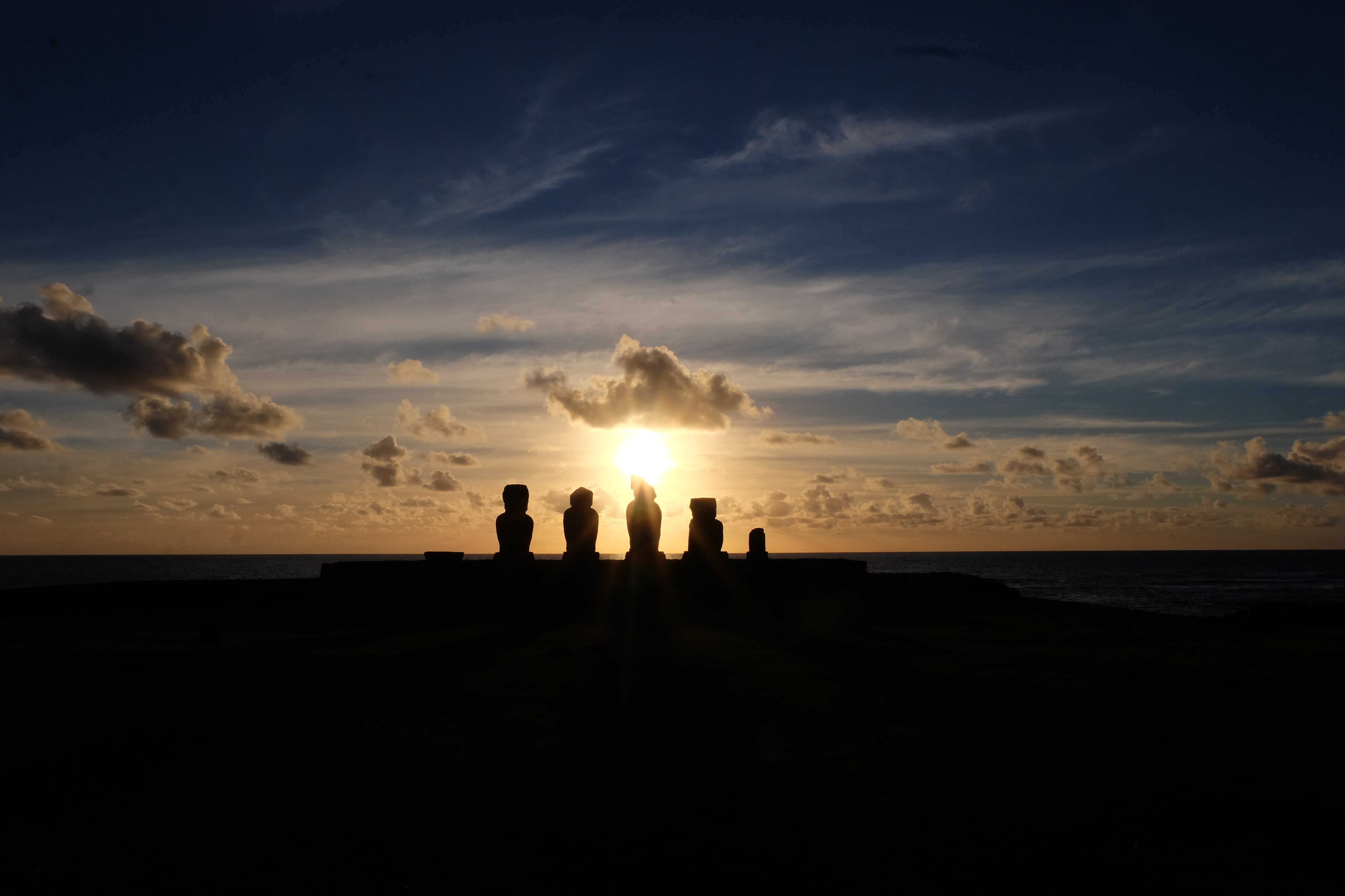 Auf der Osterinsel gibt es vieles zu erkunden sobald man die Hauptsiedlung verlässt. Spuren einer alten Kultur warten auf einen um ihm die Geschichte der ersten Segler zu erzählen, welche auf einem Boot hierhin gekommen waren und die Rapa Nui Kultur auf diesen Landfleck mitten im Ozean mit sich brachten. Riesige, imposante Steinstrukturen zu Männern, legendären Vorfahren und für die Einheimischen nicht nur interessanten, sondern auch bedeutungstragenden Gesichtern geformt weisen von einer mystischen und mythischen Zeit zugleich, welche hierzulande, weit weg vom Rest der Welt – während die Inkas, Mayas und Azteken dem südamerikanischen Kontinenten zu einer Blütezeit verhalfen – die Wiege einer eigenen Kultur schuf: die Rapa Nui. Es war ein unglaublich schönes, gewaltiges jedoch unerklärbar mystisches Gefühl diesen riesigen Steinen in menschlicher Gestalt gegenüberzustehen, ihre Präsenz lediglich als unaufgeklärte Nichtkenner wahrzunehmen und dabei trotzdem den Hauch einer gewissen zeitüberdauernden Hinterlassenschaft zu spüren. Riesige Zeremonie-Anlagen, ganze Hügel voller alten steinigen Gestalten, aus dem Nichts herausragende und geheimnisvolle „Männlein mit Hut“… und das überall, an allen Seiten einschränkende Wasser, welches einen ständig erinnerte, dass man sich lediglich auf einem Fleck Land befindet… die Kombination all dieser Gegebenheiten verwandelten die Osterinsel in einen speziellen Ort, an welchem man sich fremd und wohl zugleich fühlte.