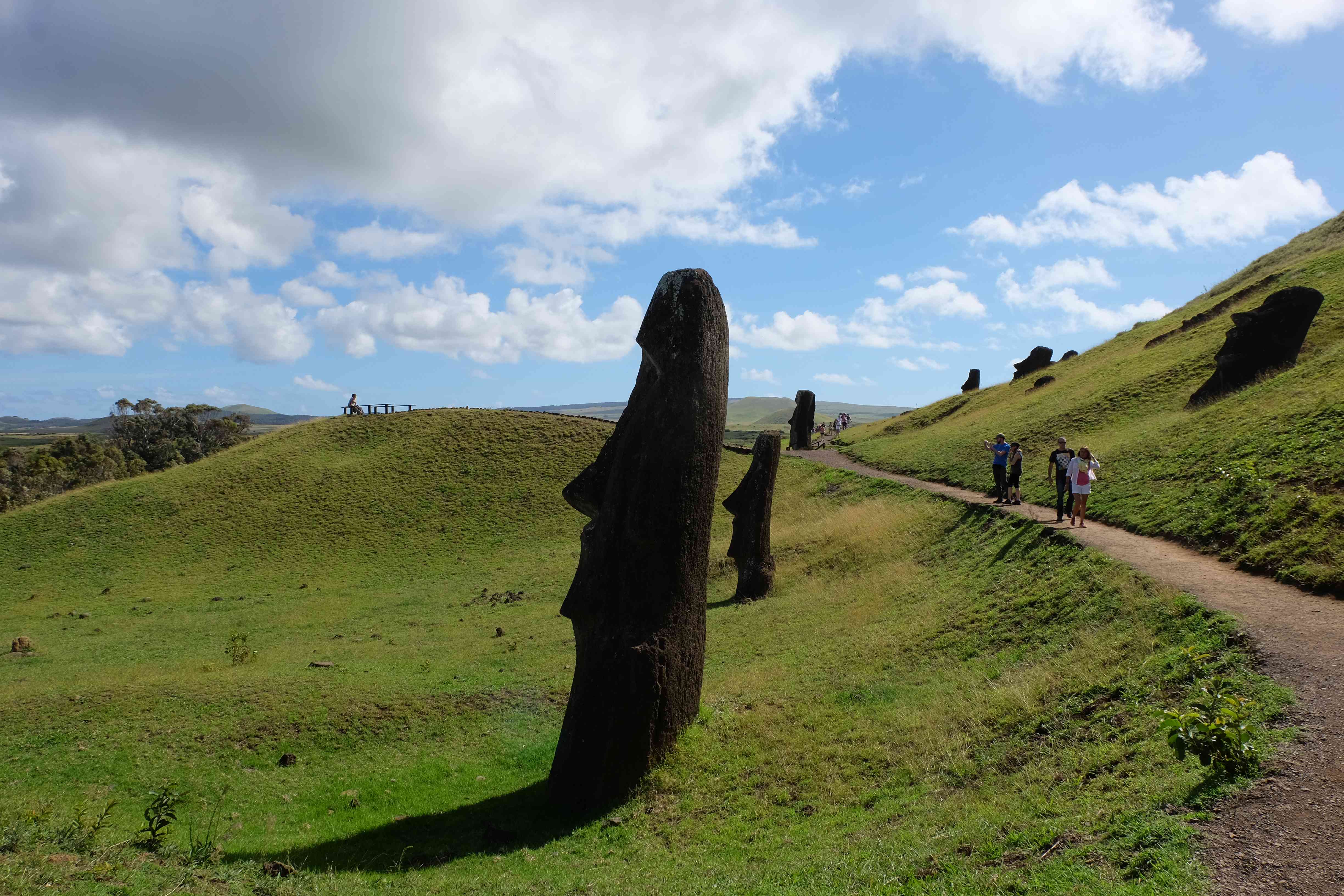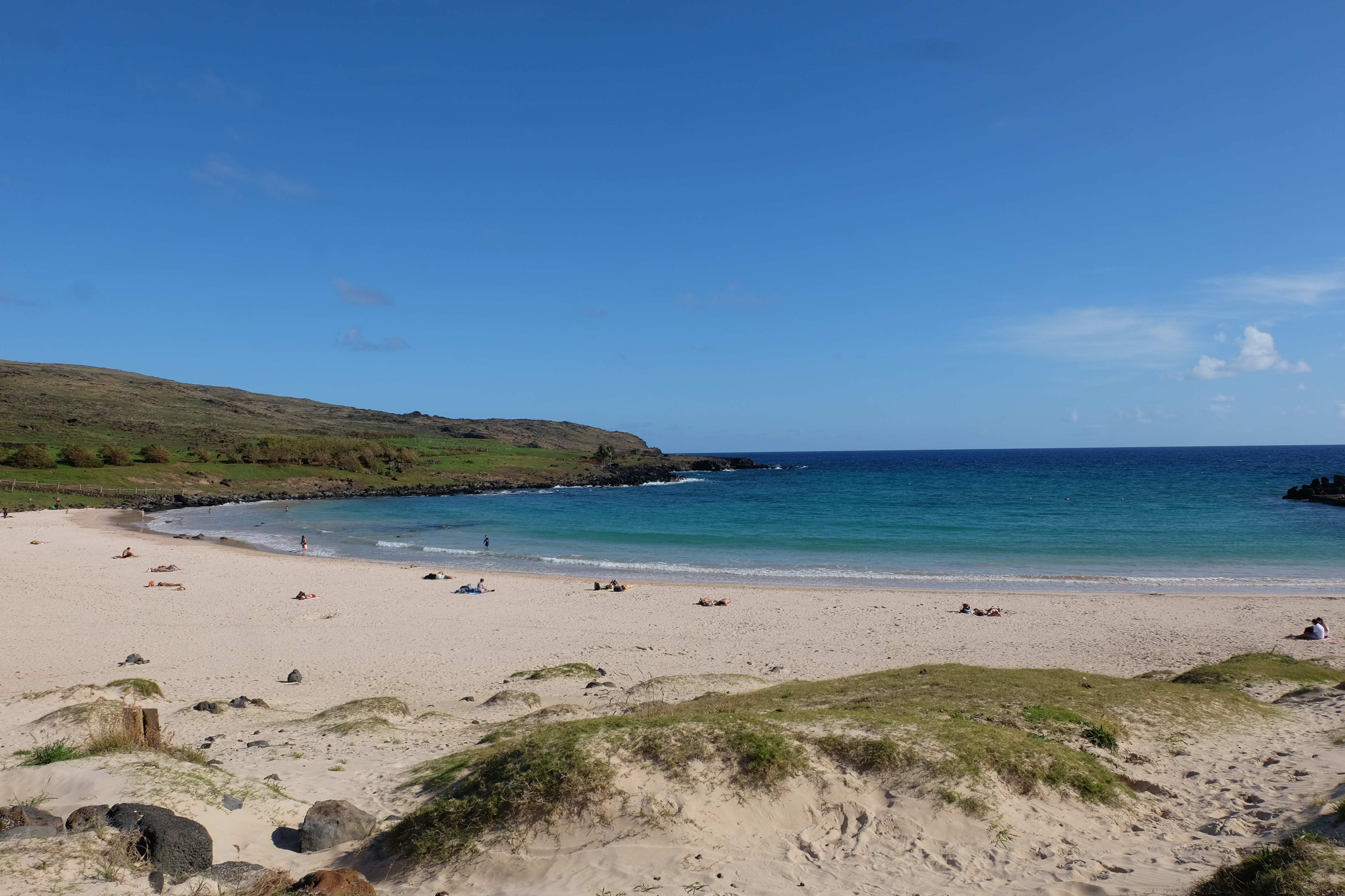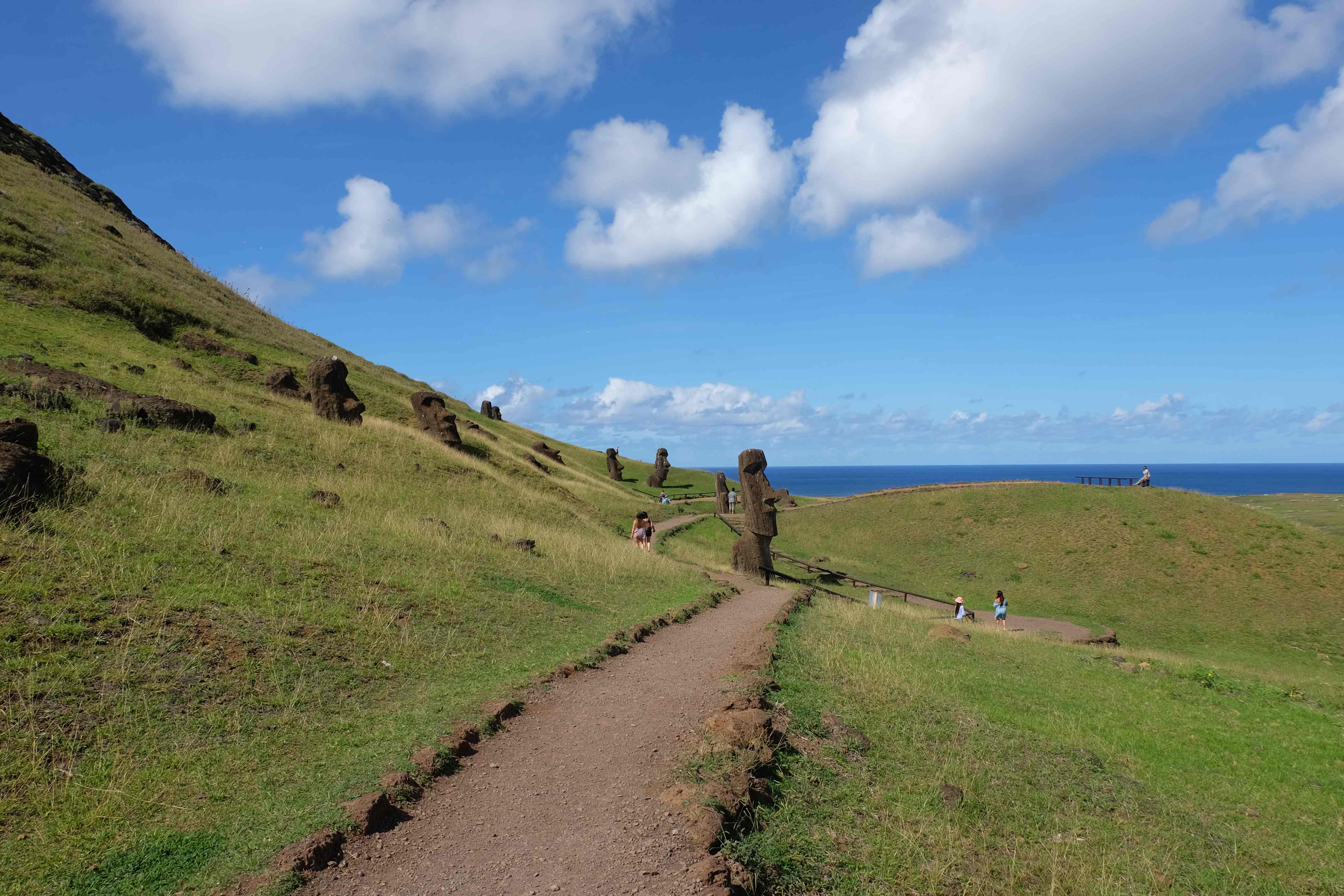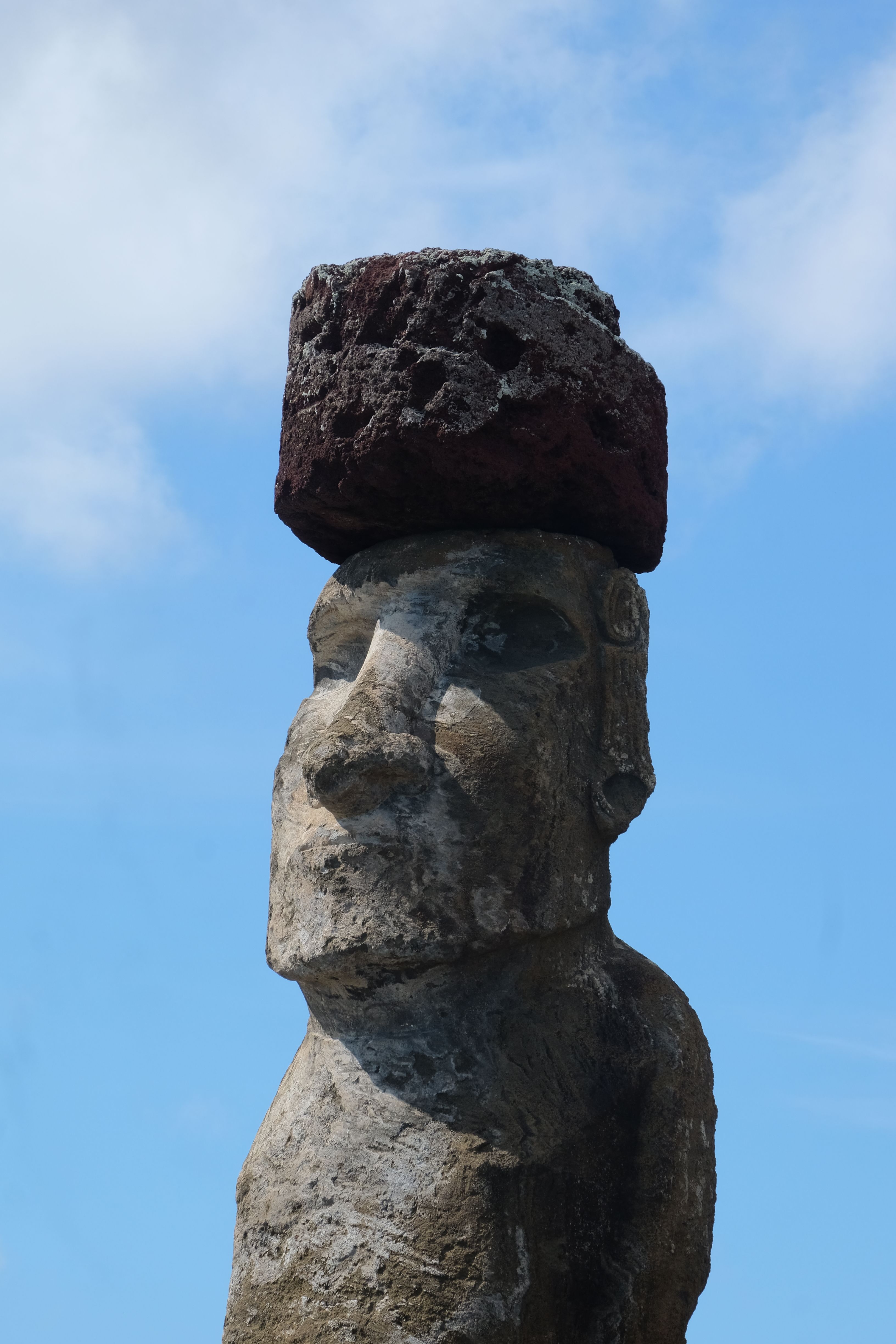 Auf der Osterinsel gibt es vieles zu erkunden sobald man die Hauptsiedlung verlässt. Spuren einer alten Kultur warten auf einen um ihm die Geschichte der ersten Segler zu erzählen, welche auf einem Boot hierhin gekommen waren und die Rapa Nui Kultur auf diesen Landfleck mitten im Ozean mit sich brachten. Riesige, imposante Steinstrukturen zu Männern, legendären Vorfahren und für die Einheimischen nicht nur interessanten, sondern auch bedeutungstragenden Gesichtern geformt weisen von einer mystischen und mythischen Zeit zugleich, welche hierzulande, weit weg vom Rest der Welt – während die Inkas, Mayas und Azteken dem südamerikanischen Kontinenten zu einer Blütezeit verhalfen – die Wiege einer eigenen Kultur schuf: die Rapa Nui. Es war ein unglaublich schönes, gewaltiges jedoch unerklärbar mystisches Gefühl diesen riesigen Steinen in menschlicher Gestalt gegenüberzustehen, ihre Präsenz lediglich als unaufgeklärte Nichtkenner wahrzunehmen und dabei trotzdem den Hauch einer gewissen zeitüberdauernden Hinterlassenschaft zu spüren. Riesige Zeremonie-Anlagen, ganze Hügel voller alten steinigen Gestalten, aus dem Nichts herausragende und geheimnisvolle „Männlein mit Hut“… und das überall, an allen Seiten einschränkende Wasser, welches einen ständig erinnerte, dass man sich lediglich auf einem Fleck Land befindet… die Kombination all dieser Gegebenheiten verwandelten die Osterinsel in einen speziellen Ort, an welchem man sich fremd und wohl zugleich fühlte.