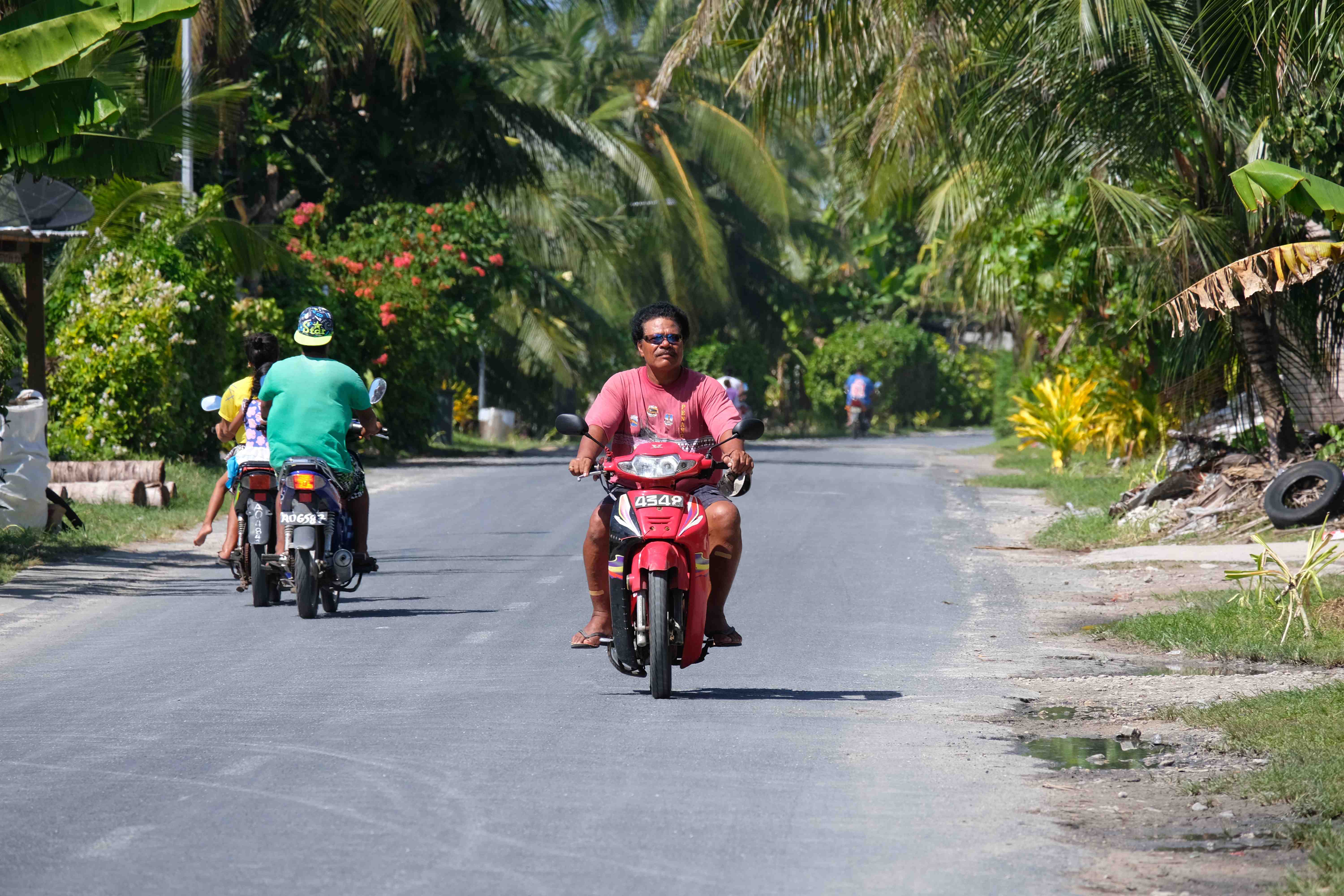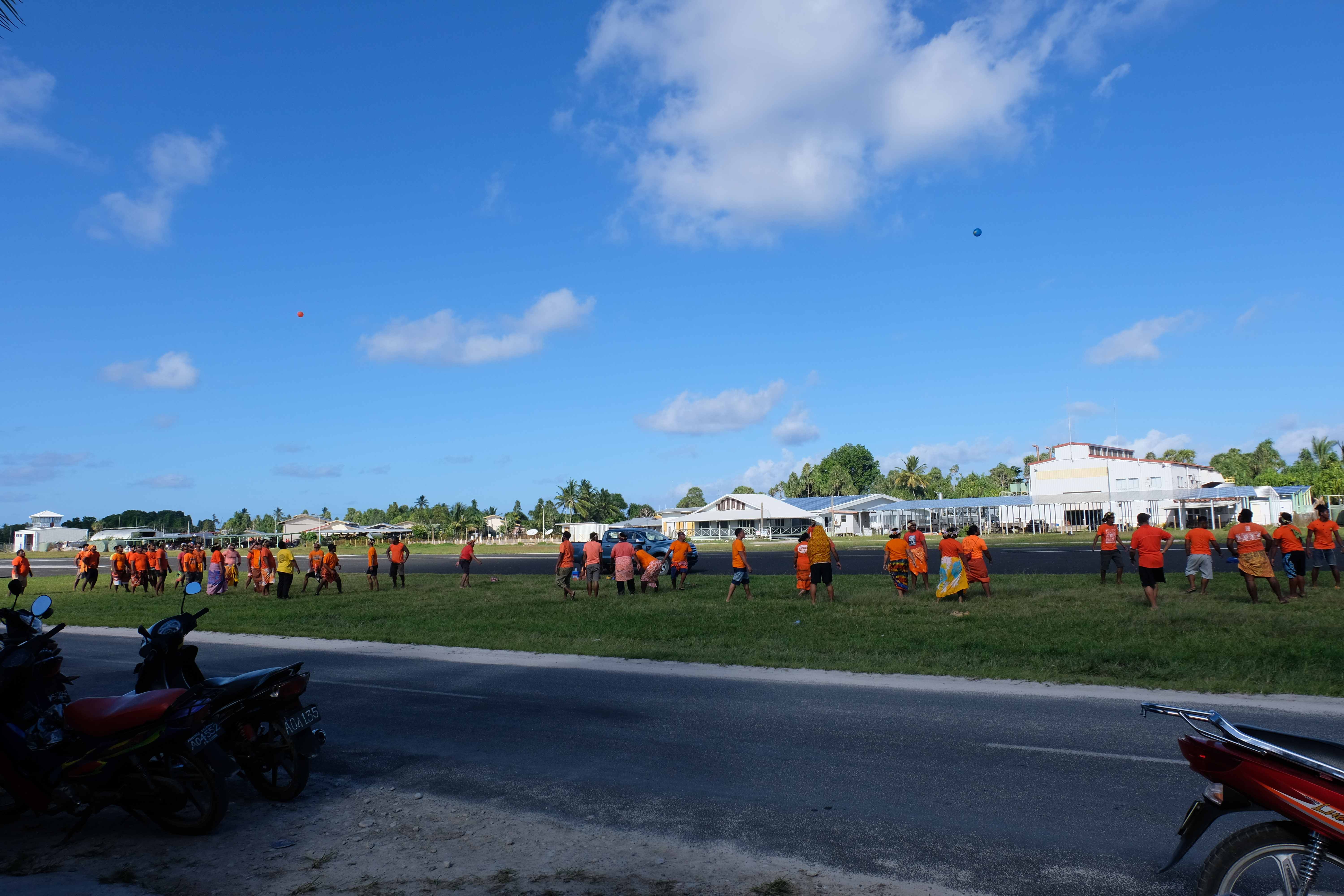 Der Versuch abzukühlen führte uns am Tag darauf ins Zentrum und den Rafi eigentlich auf konkrete Suche nach seiner neuen Liebe (ich wurde mittlerweile zu seiner alten deklassiert! :-)), nämlich frischem Kokosnusswasser. Dass wir dabei von einem einheimischen Journalisten aufgehalten wurden, welche uns interviewte und dies sogar mit einem Foto belegen wollte wird erst dann lustig zu erzählen, wenn wir in der tuvaluischen Lokalzeitung (welche er versprach uns via Email zuzusenden) verewigt werden! 🙂 Aber zurück zu unserer Alltagsbeschäftigung, der Kokosnusswasserjagd. Man stelle sich einen gierigen Rafi vor, welcher um sich herum lediglich kokosnussbeladene Palmen erblickte und bei mehreren Verkaufsständen und Lokalen solange danach fragte, bis ihm die beste Antwort aller Zeiten geliefert wurde: „Kokosnüsse werden hier nicht verkauft, Sie müssen jemanden bitten schnell rauf zu klettern und ihnen welche zu holen.“ 🙂 Spätestens wenn einem dies gesagt wird, realisiert man, wo man sich befindet! Wo sich jedoch die anderen – und damit ist die Mehrheit der sonst trotz der Hitze täglich fleissig arbeitenden Inselbevölkerung – nach 16 Uhr befanden, dies wussten wir nicht, bis wir der kühlen Brise und dem angenehmen Wind folgten und entlang der Landepiste/Autobahn/grösstem offenen Platz der Insel 90% der Bevölkerung antrafen. Während die jüngere Generation sich in zahlreichen Gruppen aufteilte und den Ballspielen widmete: Volleyball, Rugby, Fussball und weitere sportliche Betätigungen bildete die ältere Generation eher die – meistens auf den Motorrädern sitzende – Fankurve. Es war ein einmaliger Anblick und eine unglaubliche Entdeckung: man bog nur von der Strasse ab und man fand das ganze Dorf am Leben! Während es in den Metropolen der Welt an Zeit, Lust oder schlichtweg Lebensfreude fehlt sich zu versammeln, schaffte es die Bevölkerung einer knapp 12 km langen und an ihrer breitesten Stelle vermutlich höchstens 400 m breiten Insel das Leben viel stärker und krasser zu zelebrieren als manch andere hochentwickelte Gesellschaften! Wow ist vermutlich der beste Ausdruck dafür!