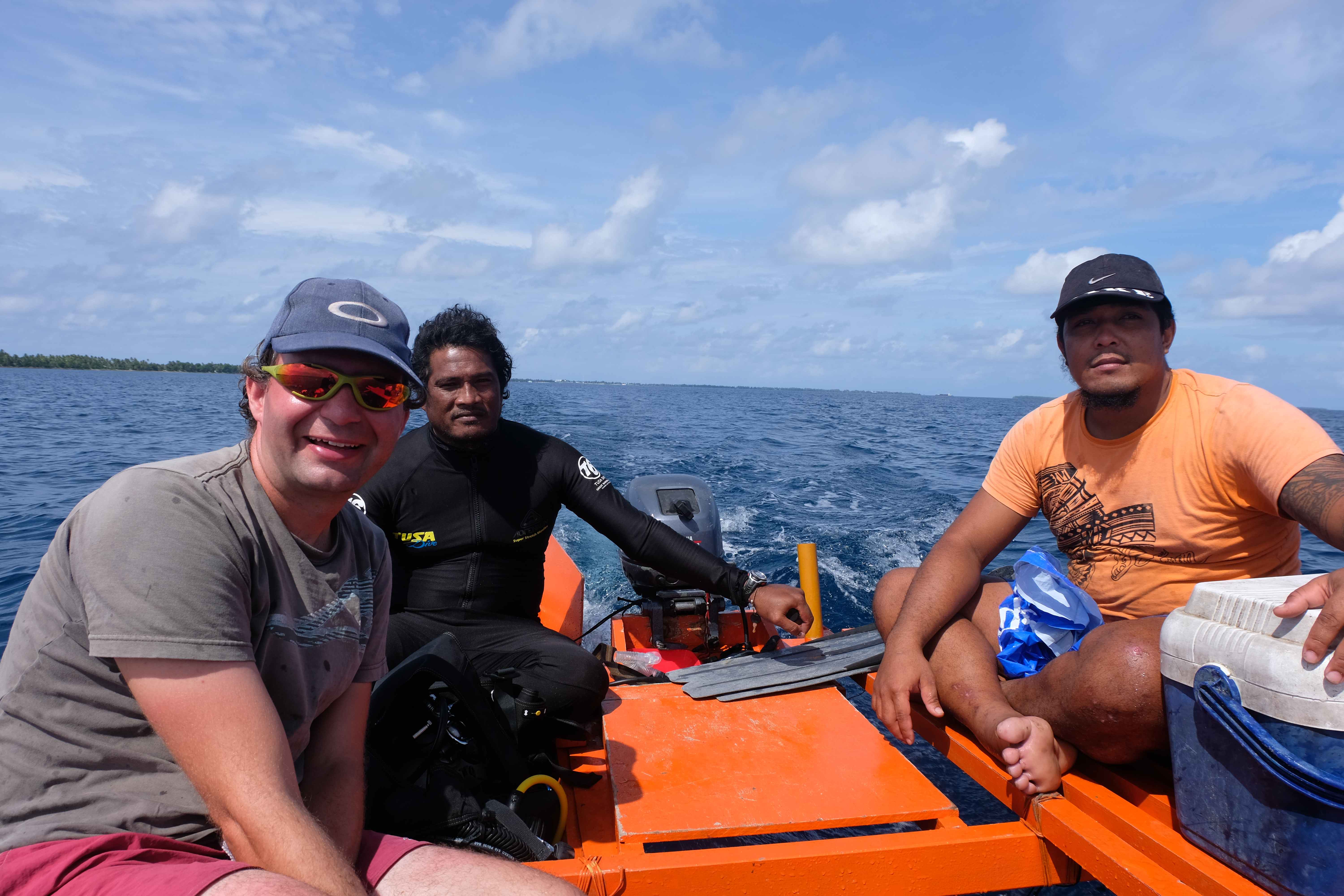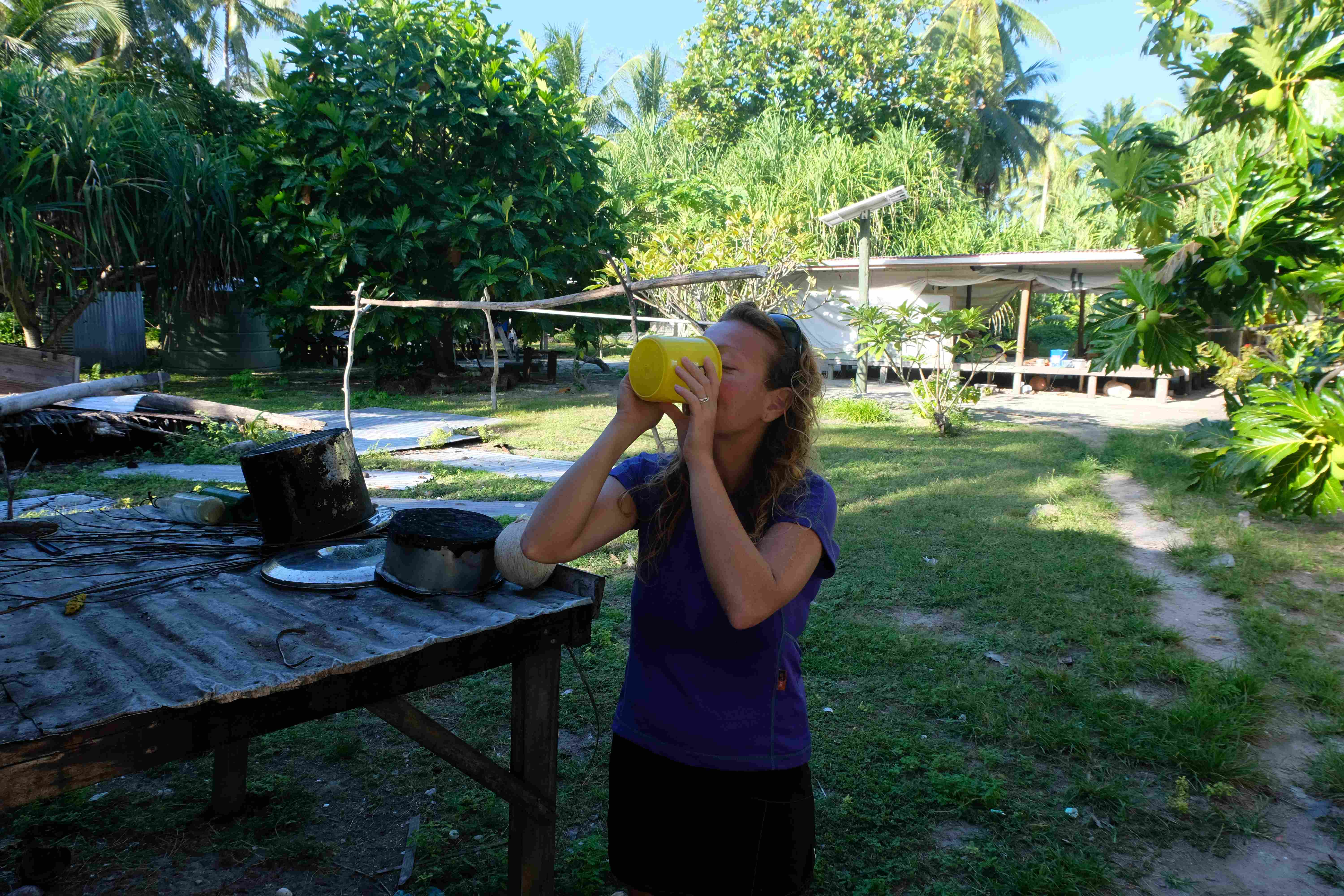 Nicht nur unglaubliche Taucherfahrungen und gratis Kokosnuss-Lieferdienst erhielten wir von unseren zwei Tour Leitern, sondern auch nützliche Ratschläge bezüglich ihrer Nachbarn: während wir uns vor den „Fijians“ und den „Kirbats“ in Acht nehmen sollten, da sie keine guten Menschen waren, sollten Staaten wie Samoa oder Tonga kein Problem darstellen. Ihre Beschützer-Rolle verwandelte sich langsam in ein Freundschaftsangebot, welches sie unbedingt mit einem Geschenk markieren wollten. Erinnert ihr euch an den Red Toddy, den gekochten Palmensaft? Nun ja, wir sollten eine Flasche davon von ihnen erhalten. Allerdings teilten sie uns sehr seriös mit, dass wir ein offizielles Papier bräuchten, um diese bis in die Schweiz zu transportieren – nämlich eine Bestätigung von dem Landwirtschaftsministeriums Tuvalus für allfällige Zollkontrollen, dass wir berechtigt sind, dies mitzuführen. 🙂