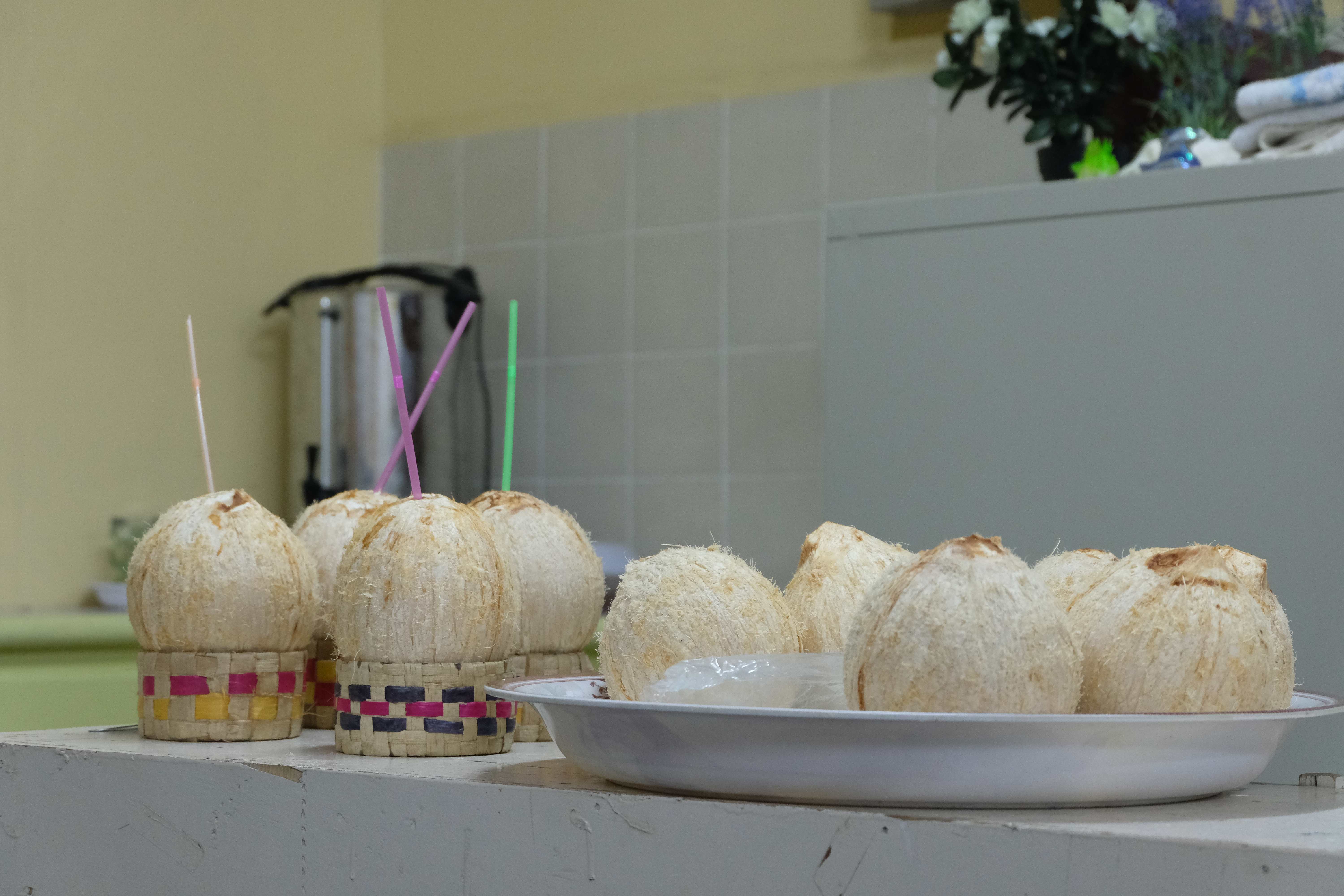 Dem Beispiel der Einheimischen folgend beabsichtigten wir ebenfalls das Meiste aus den zwei letzten Tagen herauszuholen, also ging es noch einmal aufs Boot – ab ins Wasser zum Tauchen und in eine Marine-Schule auf einer anderen Insel. Wenn man für den Besuch dieser eine telefonische Erlaubnis des Kapitäns höchstpersönlich einholen musste und wenn einem während des Besuches nicht nur tonnenweise frisches Kokosnusswasser angeboten, sondern auch die Fliegen vom diensthabenden Offizier persönlich mit einem Ast weggefächert wurden, dann wusste man, man befand sich in Tuvalu, in einer Welt, welche nicht unbedingt den Koordinaten der uns Bekannten entspricht. Spätestens wenn man nach dem letzten Tauchgang mit einem Menschen, der seinen Lebensunterhalt mehrere Jahre lang sicherte, indem er in unglaublichen Tiefen von über 150 m sein Leben riskierte um Seegurken einzusammeln, behaupten konnte, dass wenn Schneewittchen oder Dornröschen unter Wasser gelebt hätten, hier ihr magischer Wald gewesen wäre, wusste man ganz genau, dass man glücklich und privilegiert ist. Und wenn man – wie Rafi – noch vom einheimischen Bootsfahrer-Assistenten täglich danach mit einer persönlichen Lieferung von frischen Kokosnüssen beschenkt wurde, kann man noch laut dazu schreien: Das ist ja cool! 🙂